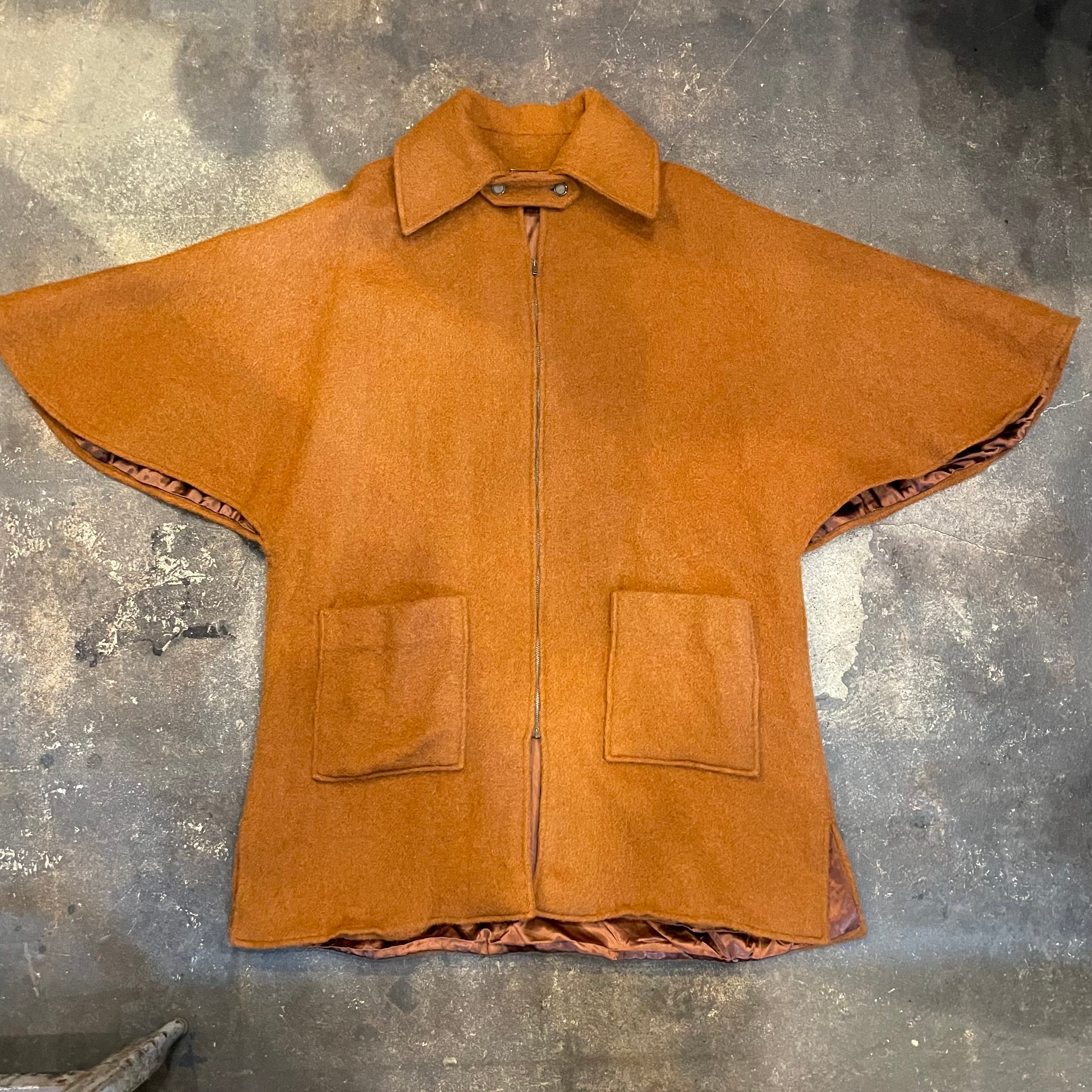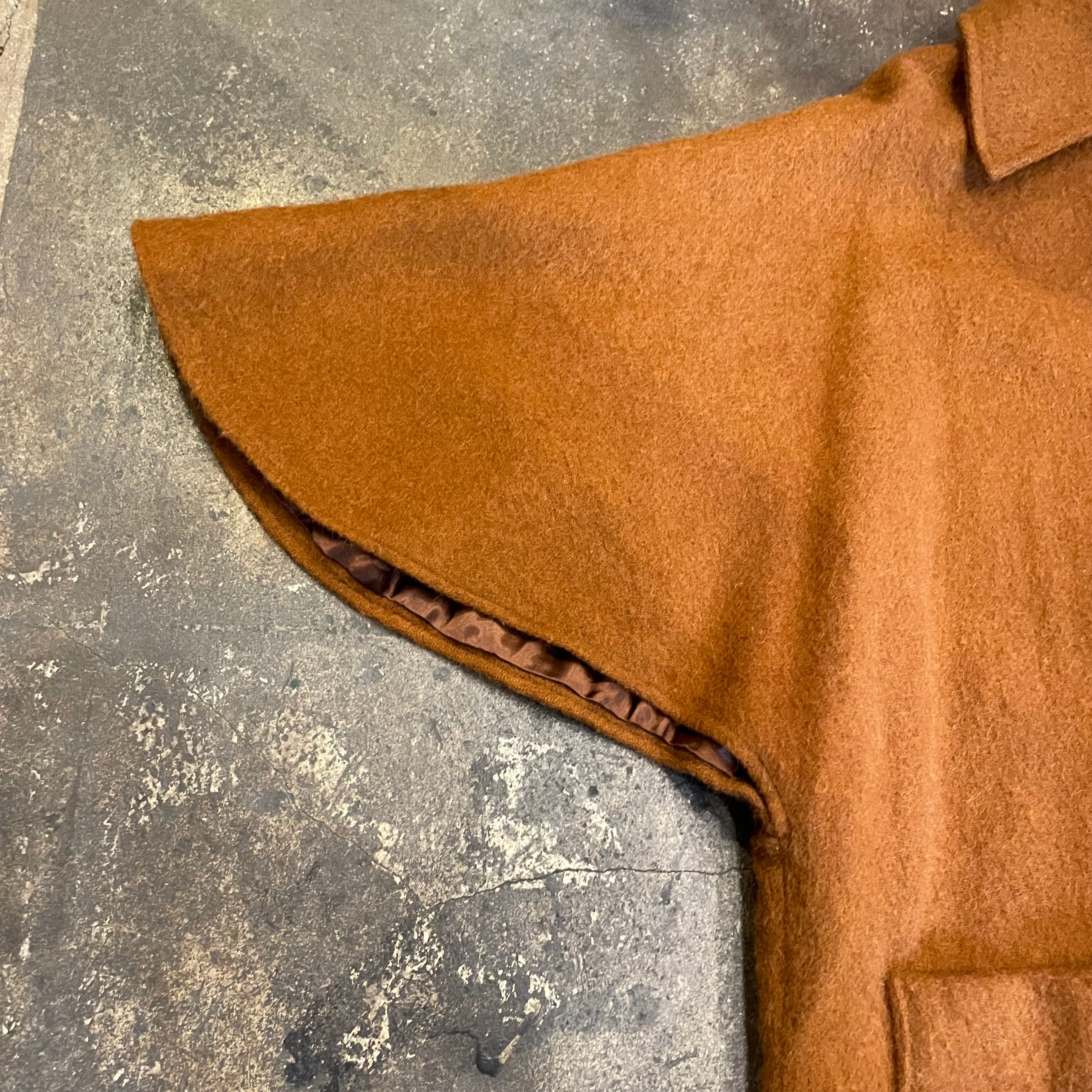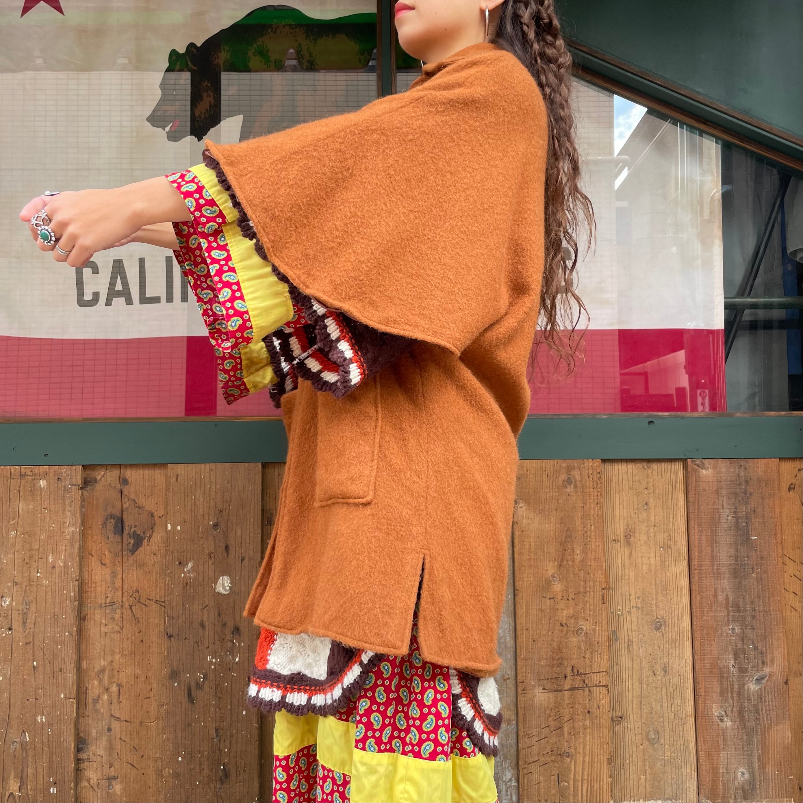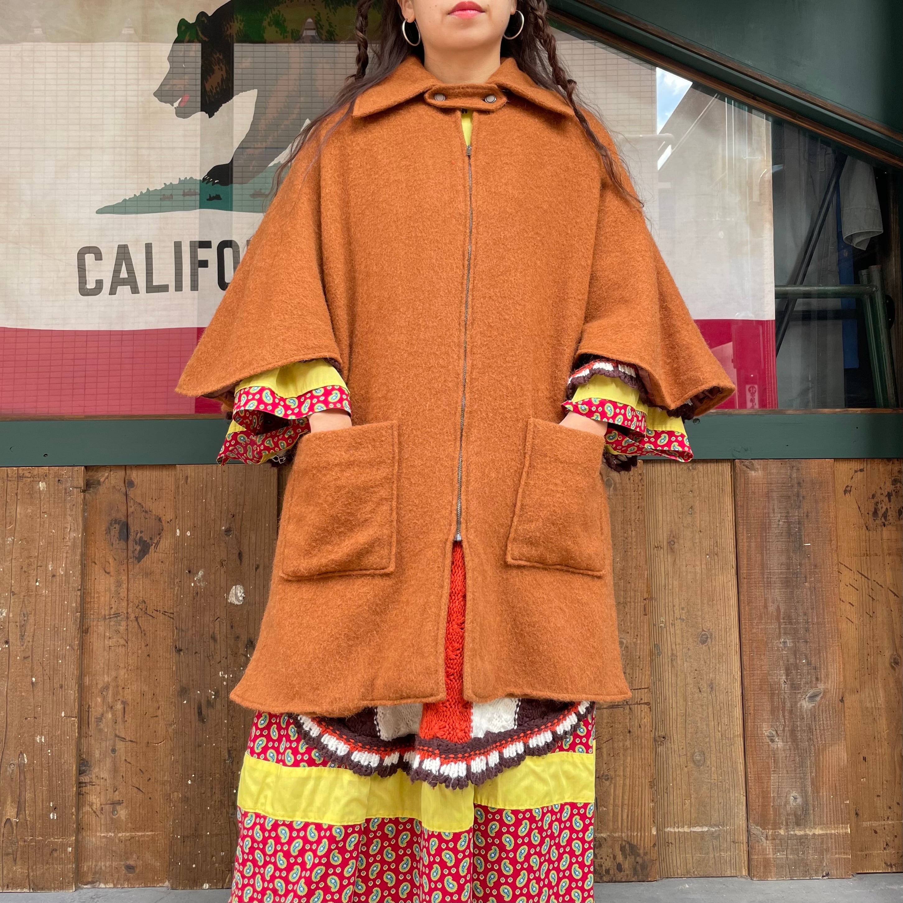 ポンチョのようなシルエットがかわいいおそらくウール素材のコートです。