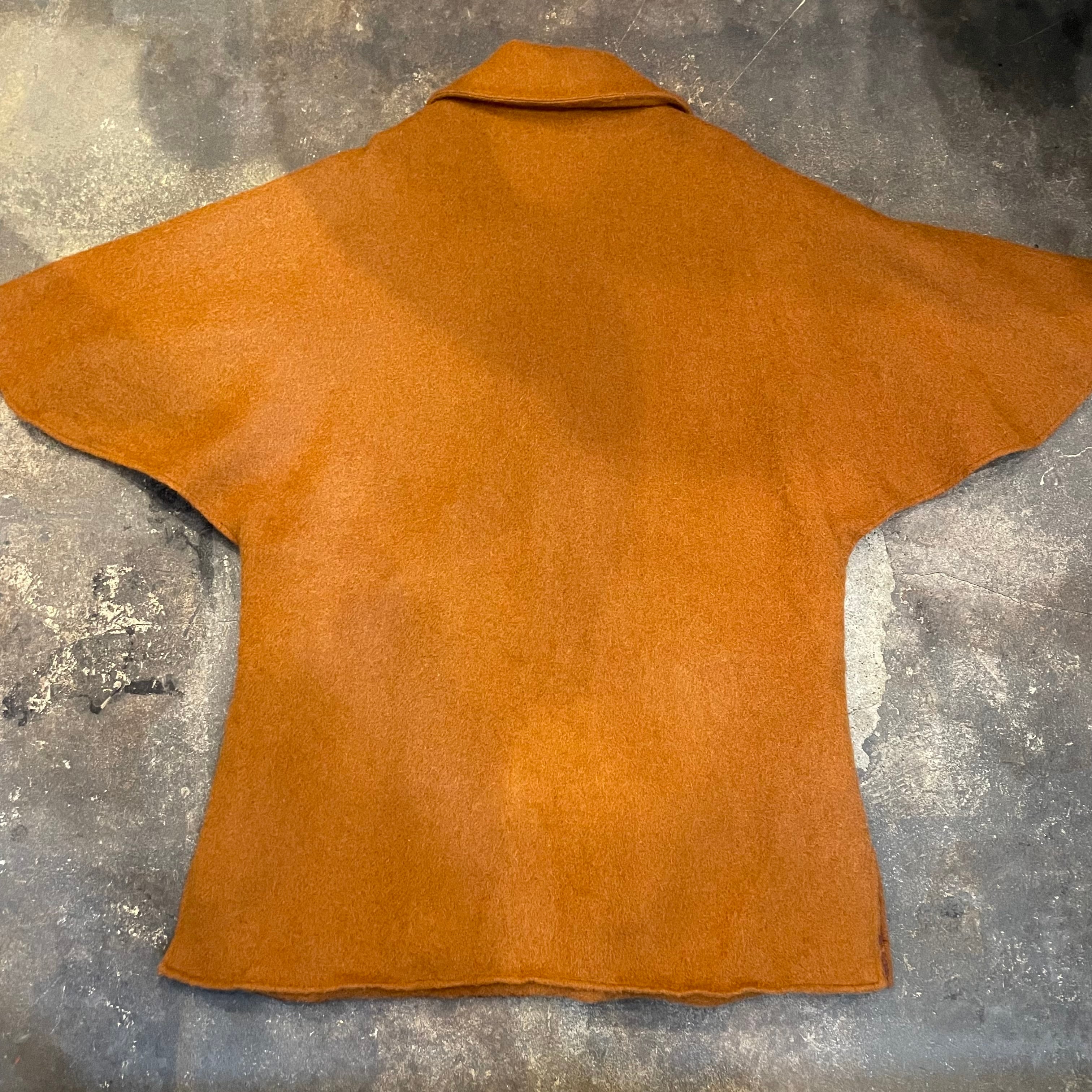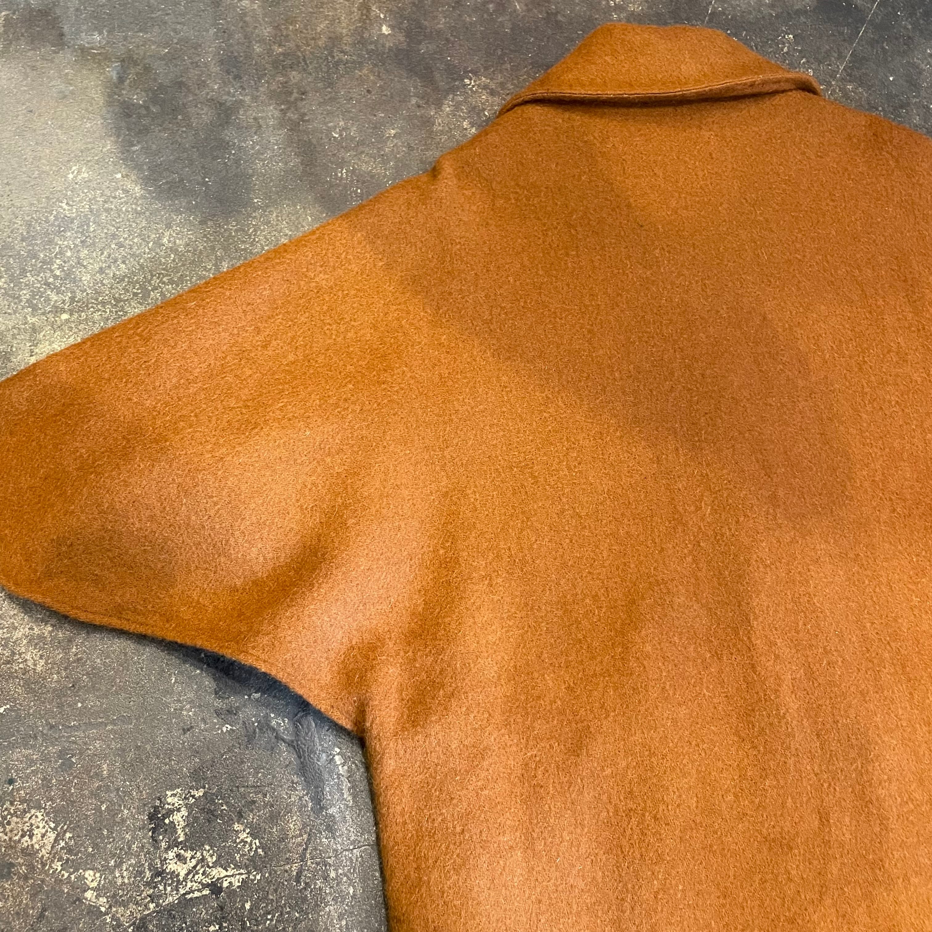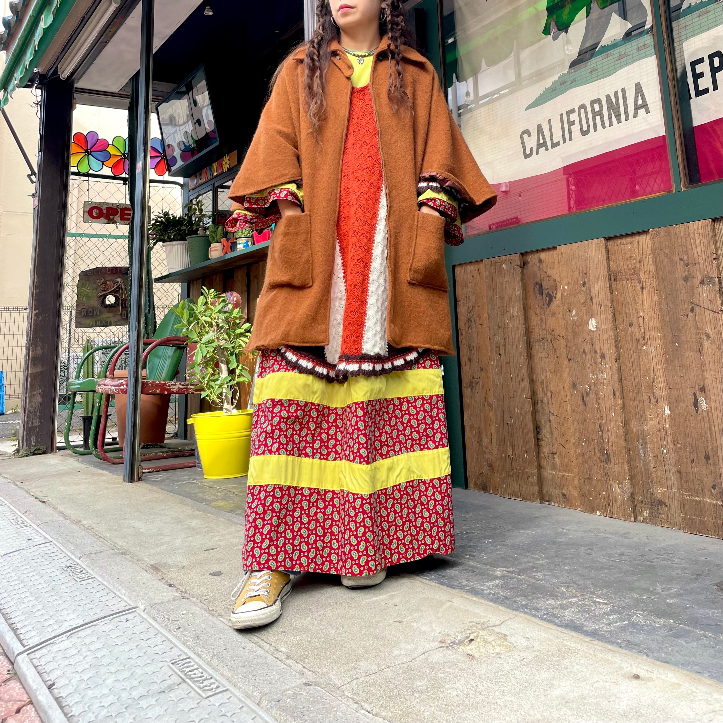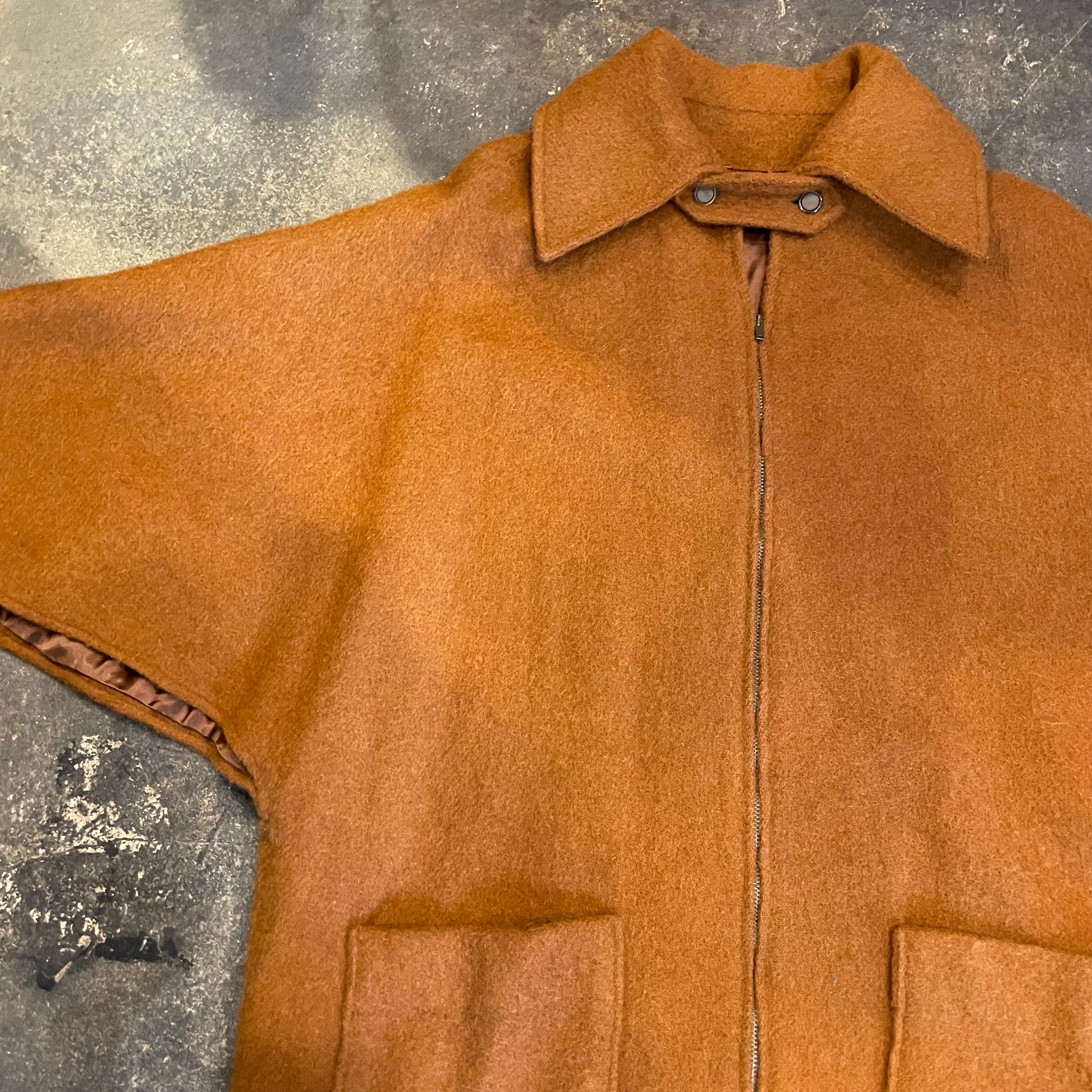 ポンチョのようなシルエットがかわいいおそらくウール素材のコートです。