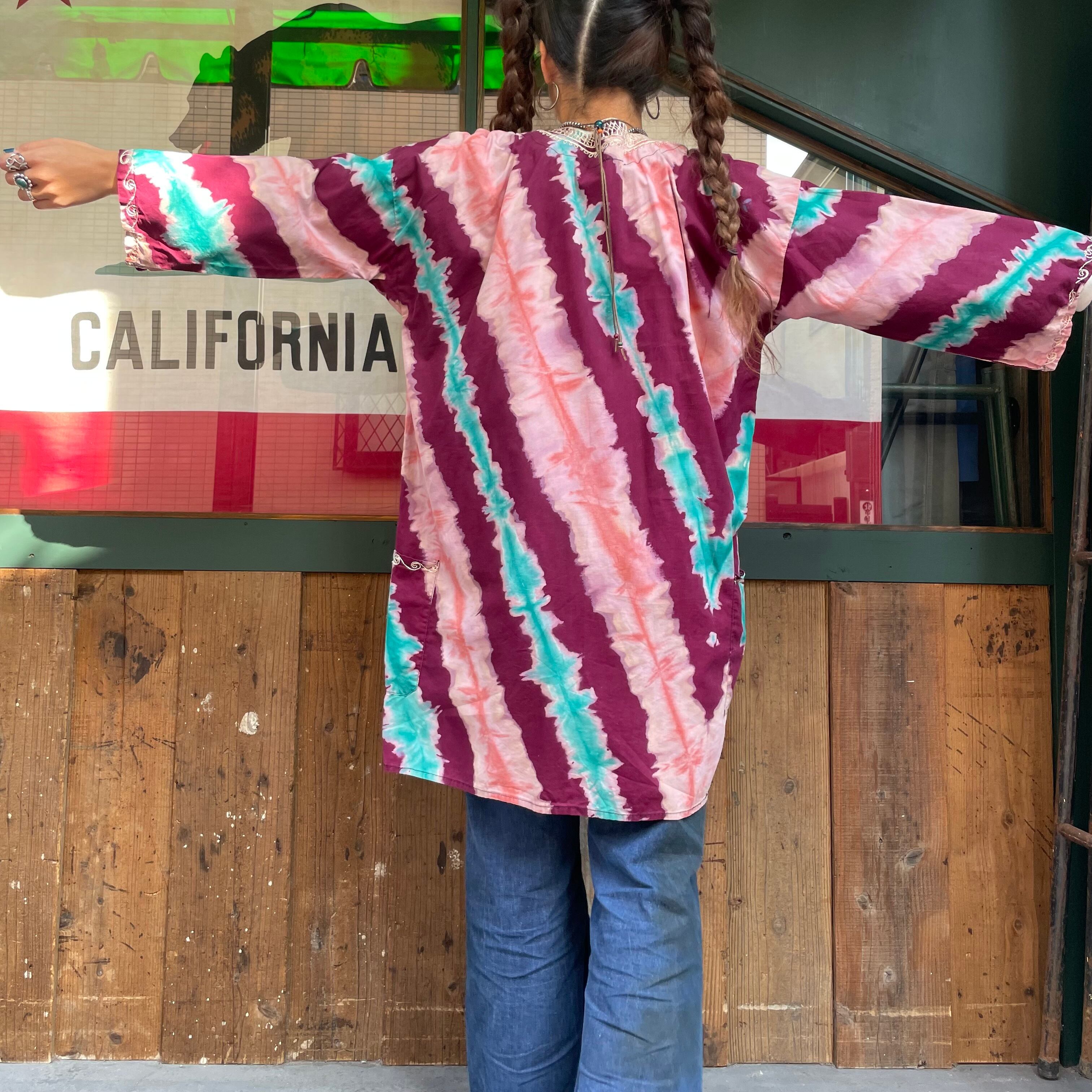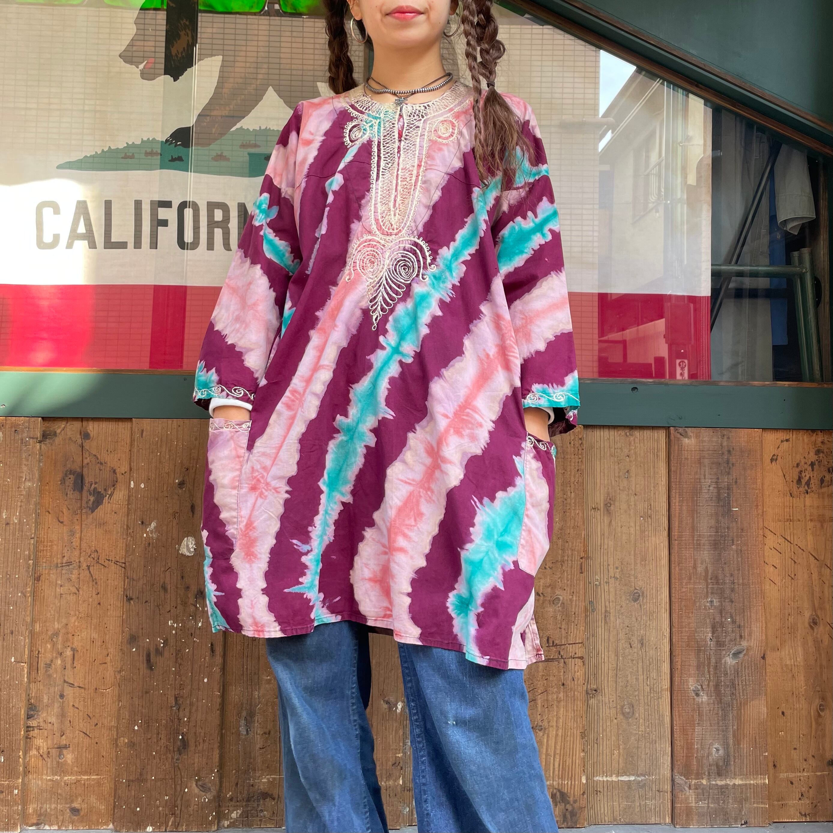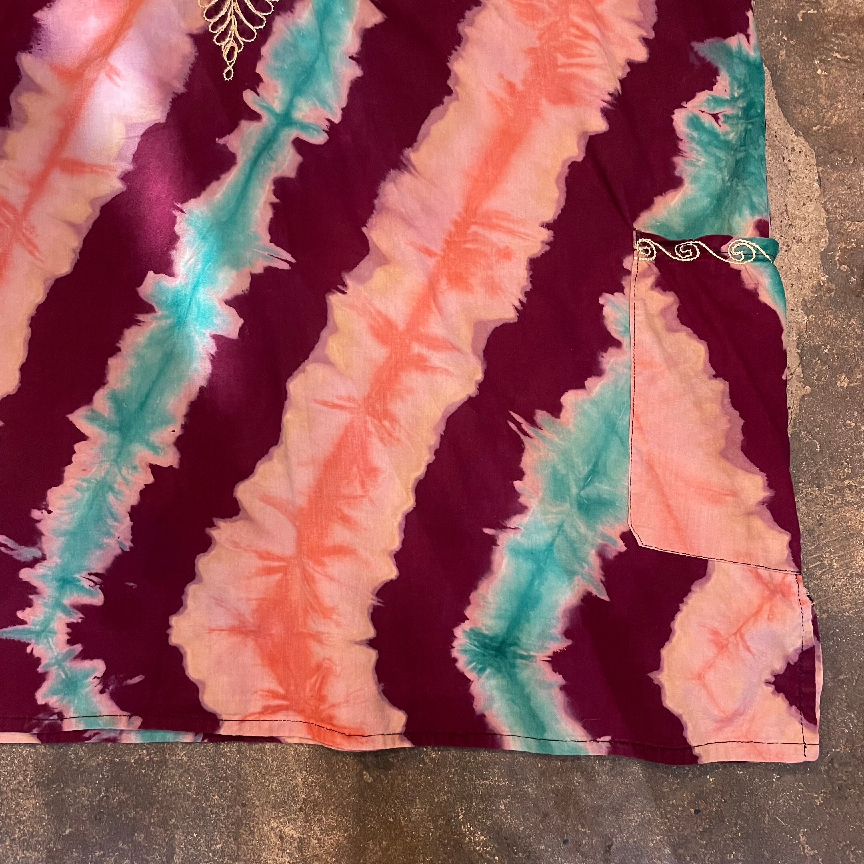 タイダイのようなシマシマの染めに刺繍がかわいいワンピースです。