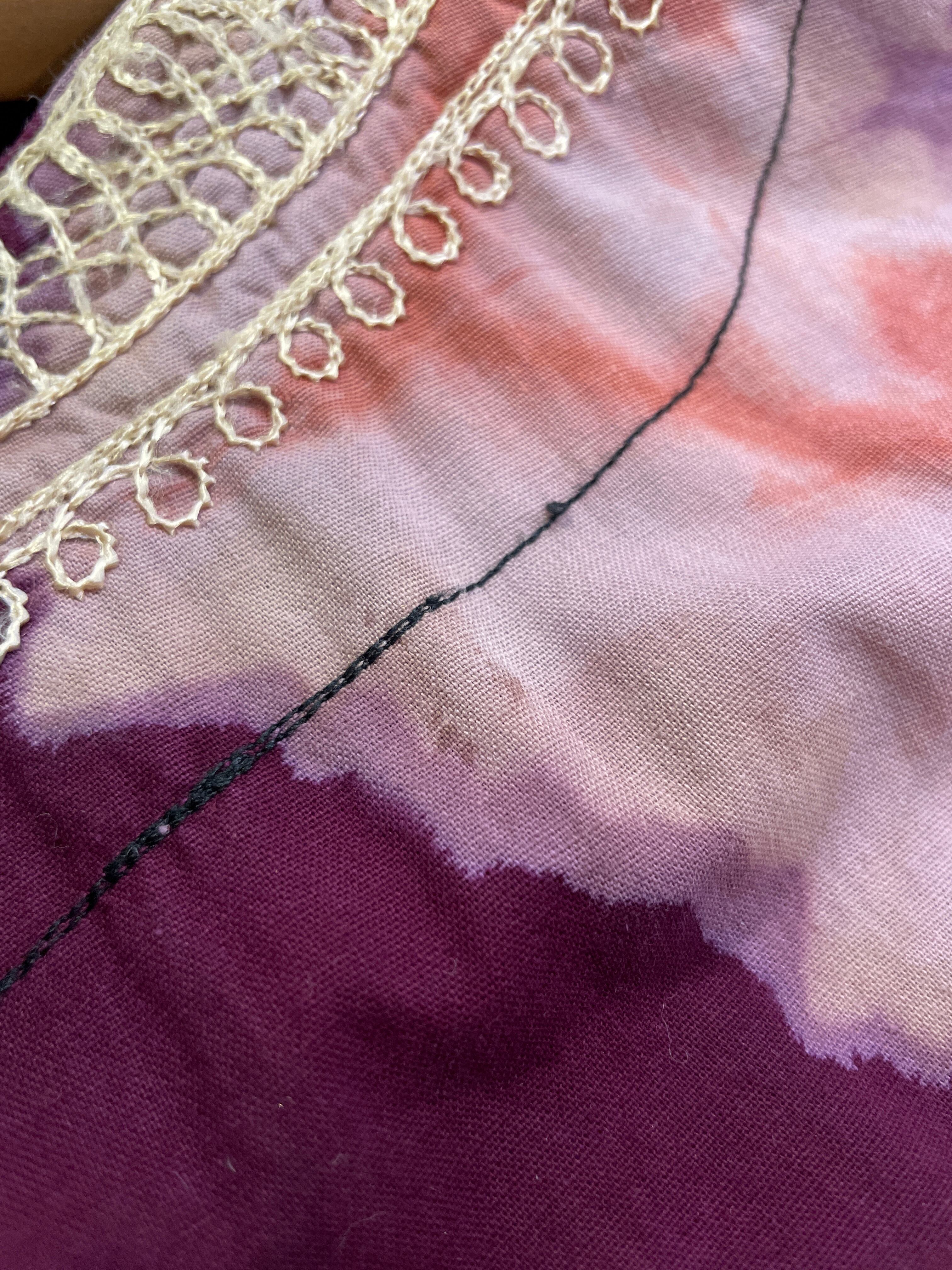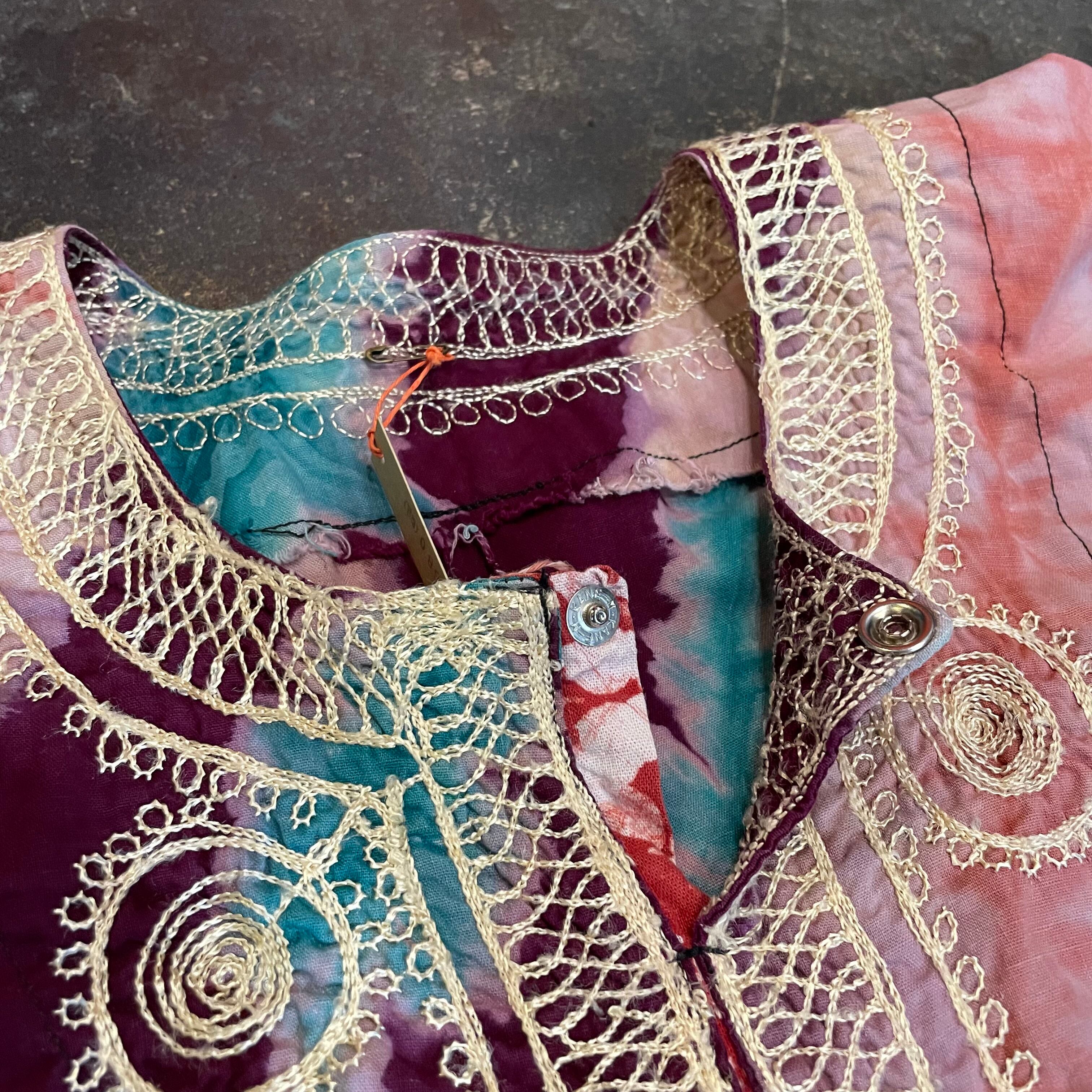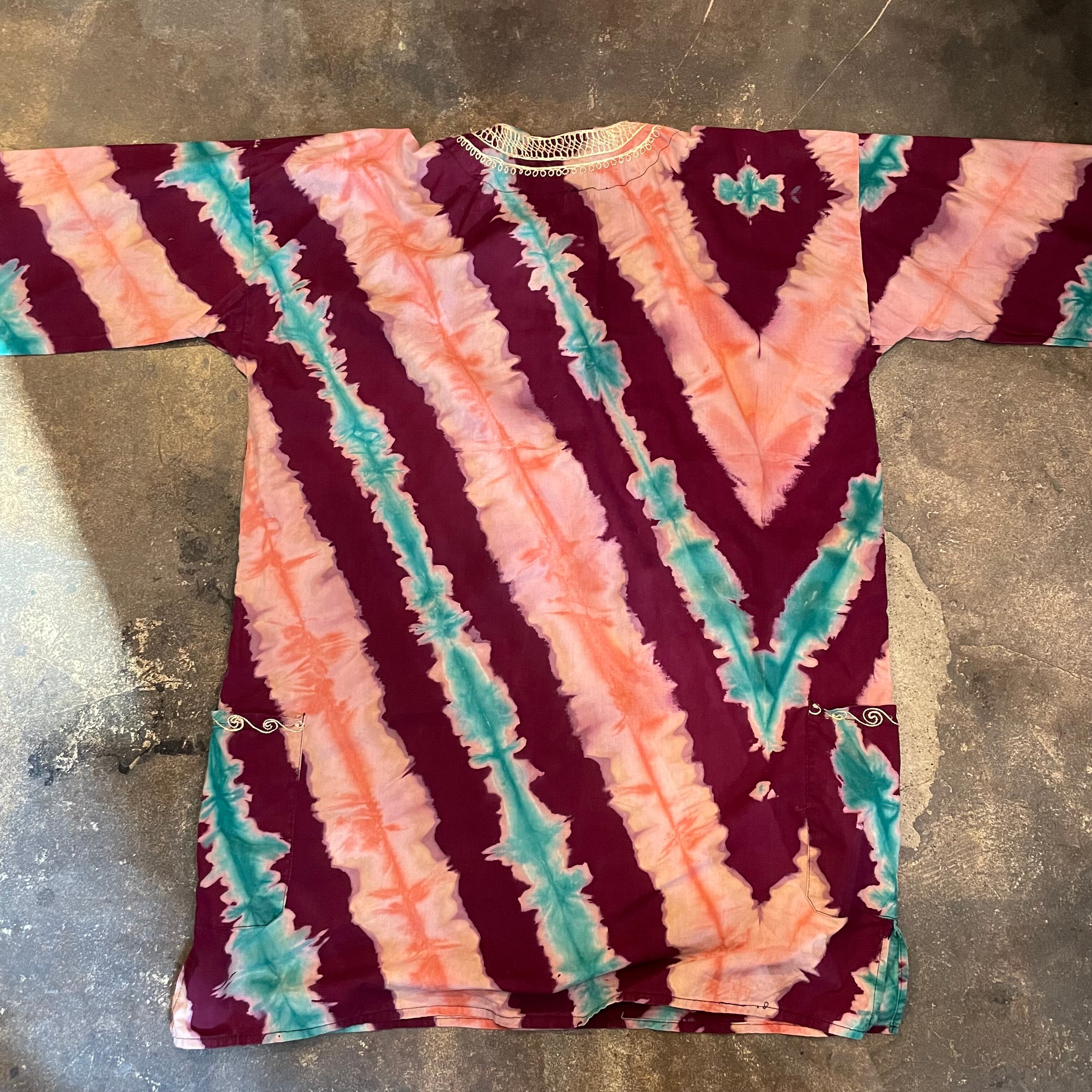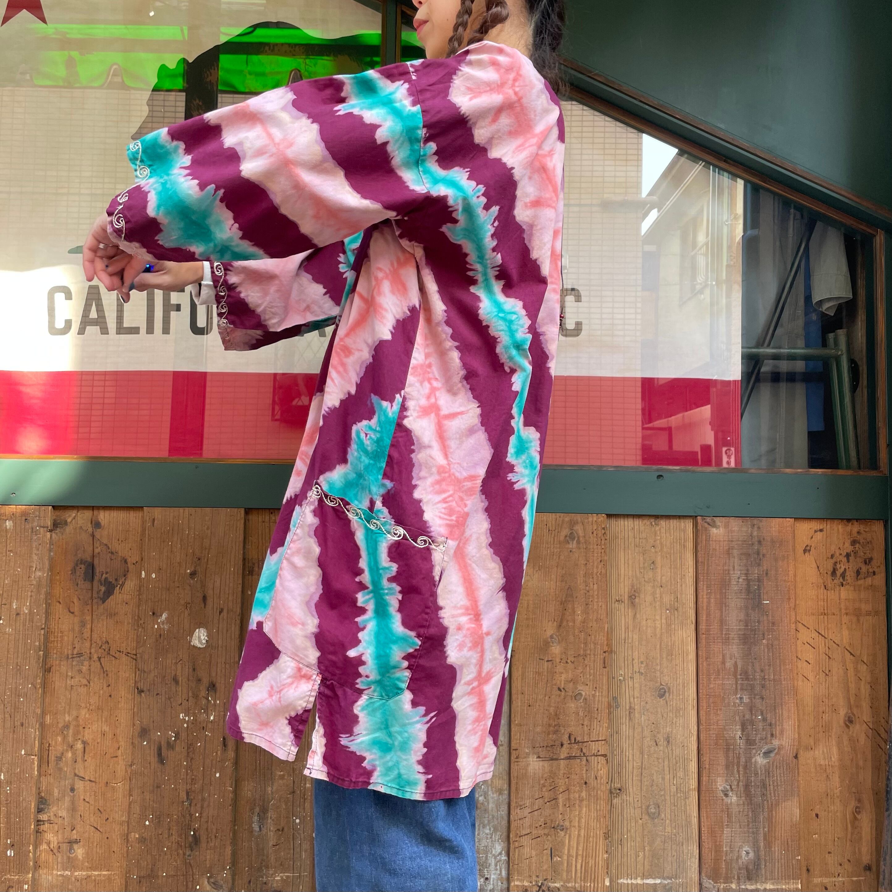 タイダイのようなシマシマの染めに刺繍がかわいいワンピースです。