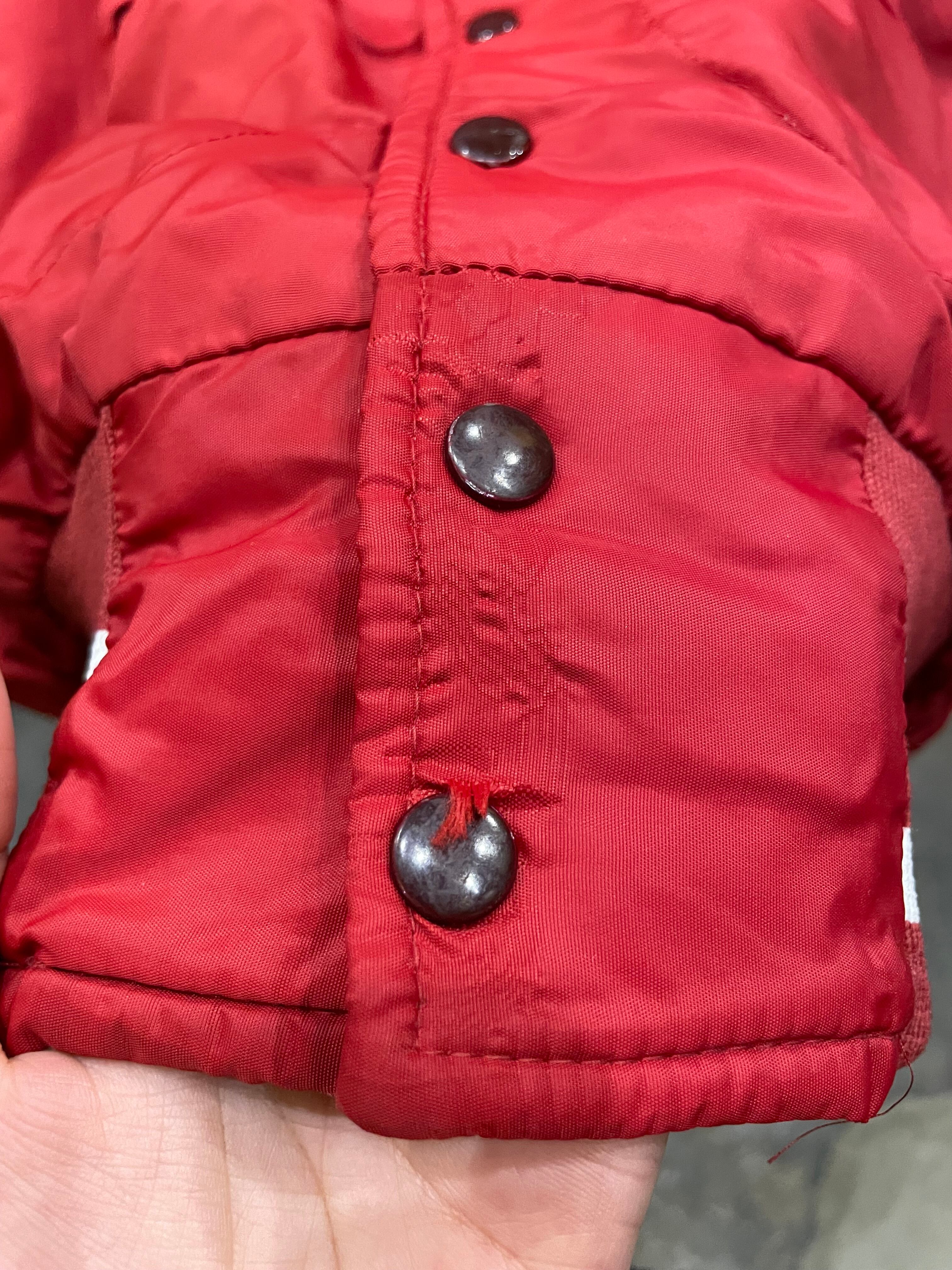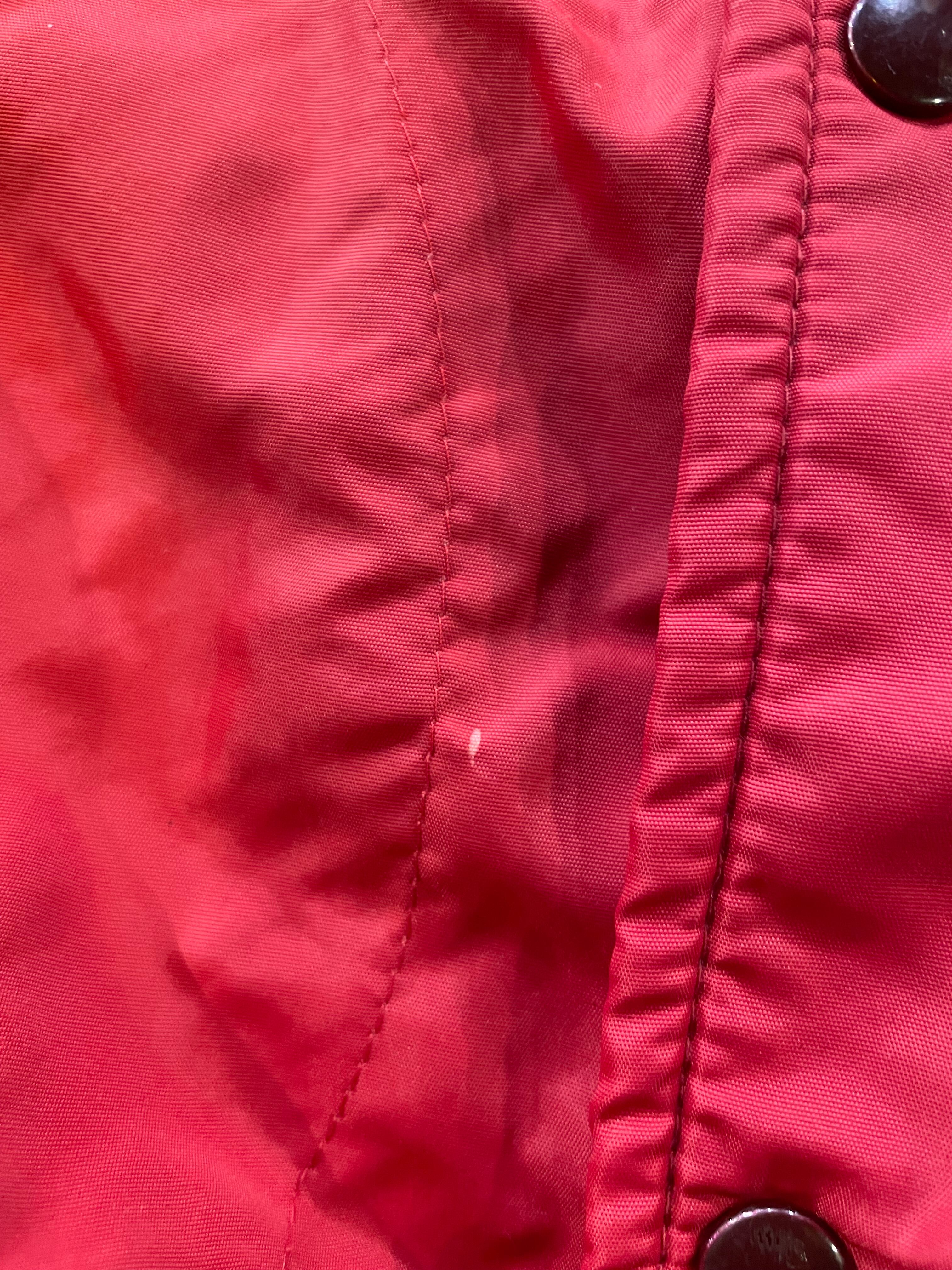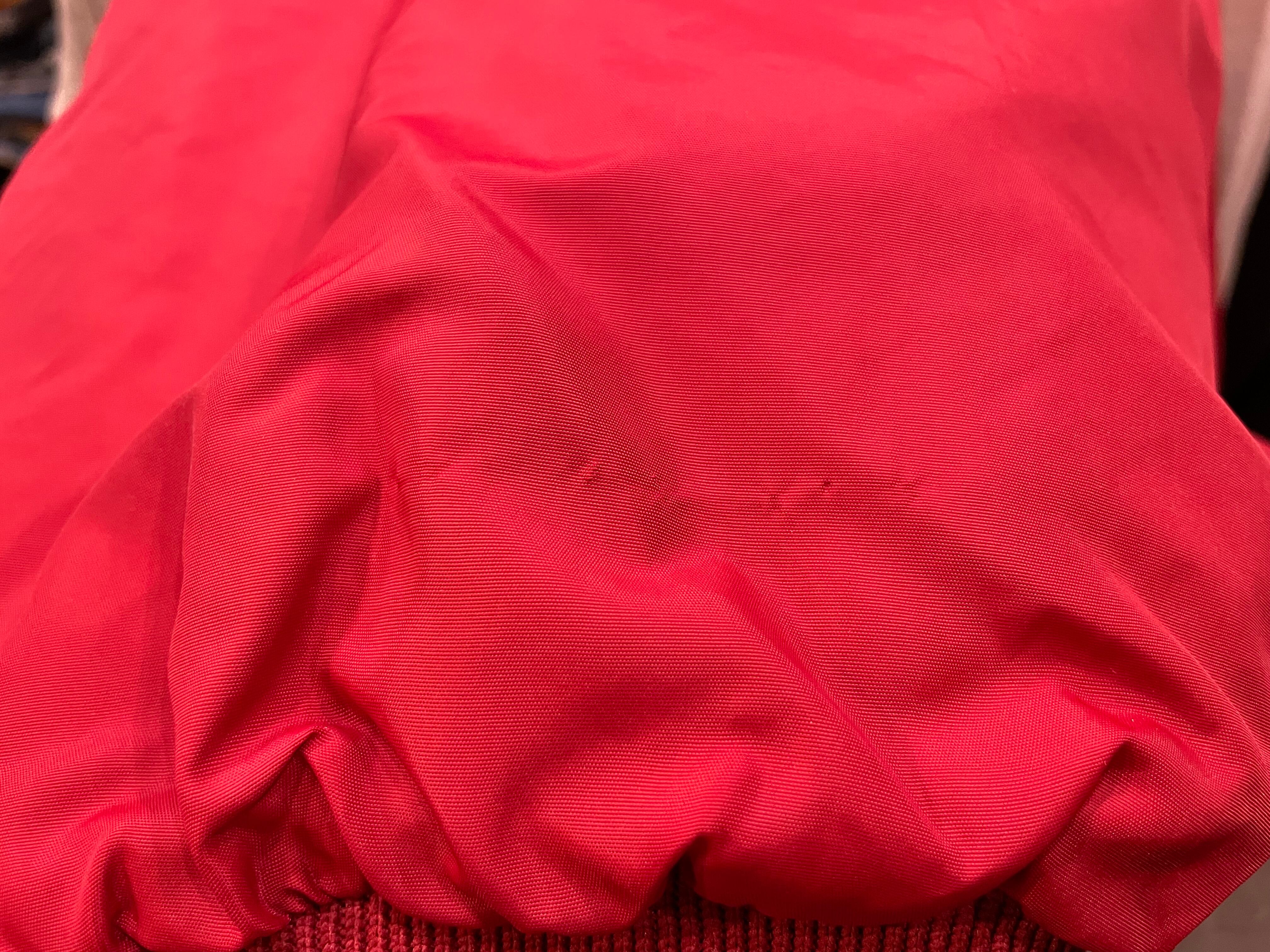 リブが襟になっていたり、少しくすんだような赤がかわいいですね。軽くて風を通さず動きやすいので実用的ですし、この上にコートを羽織っても良さそうな嵩張らなさで良いですね。