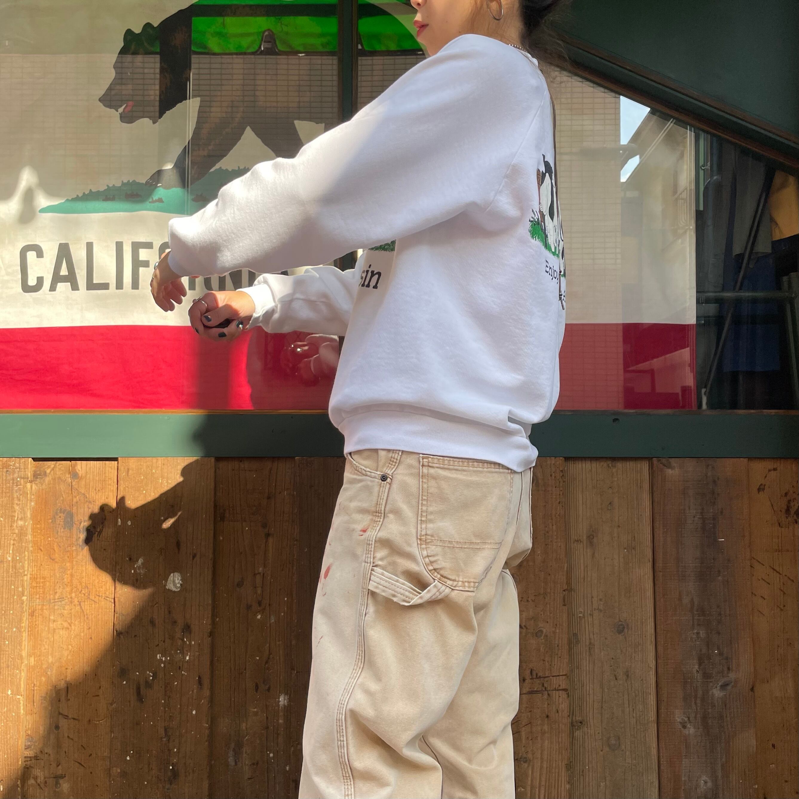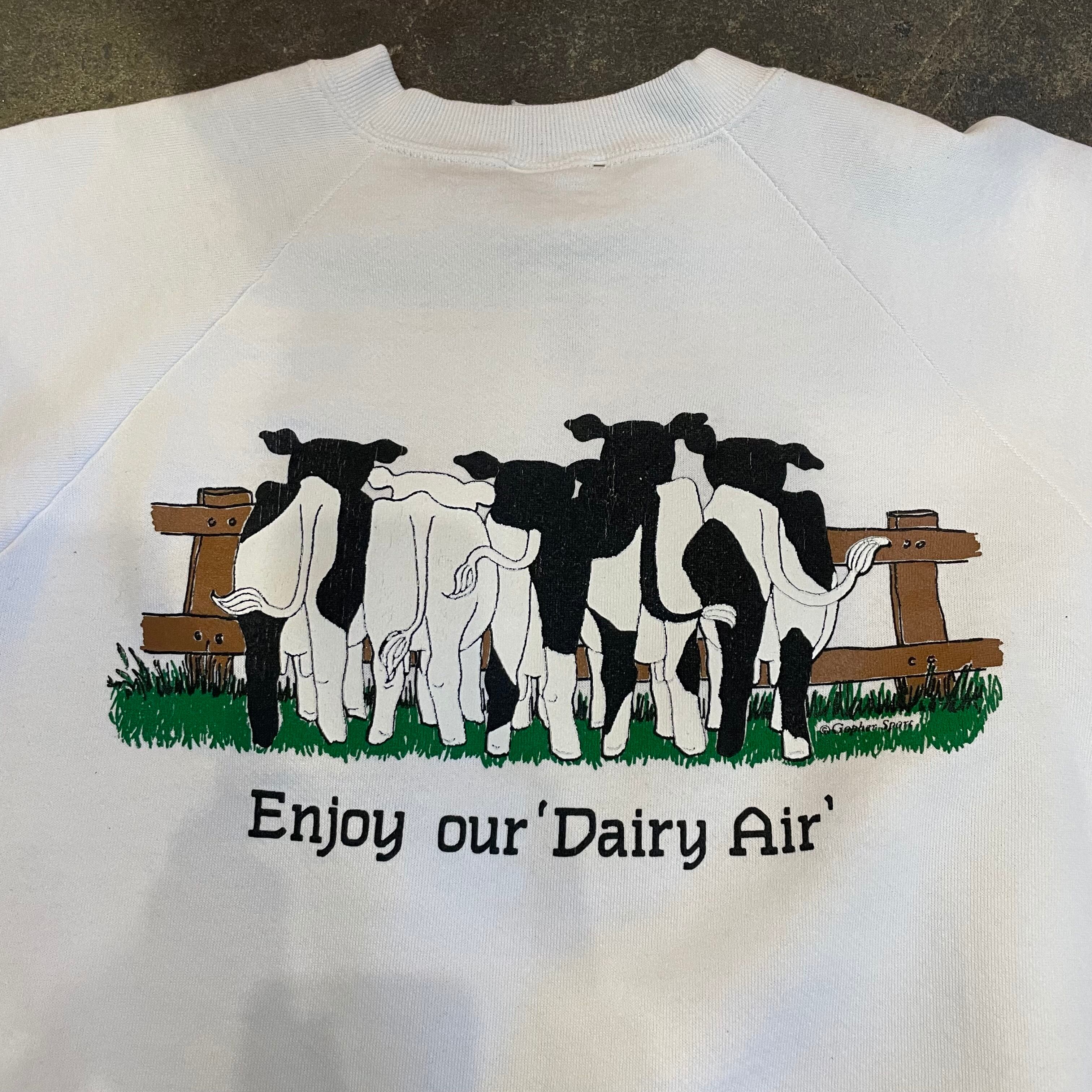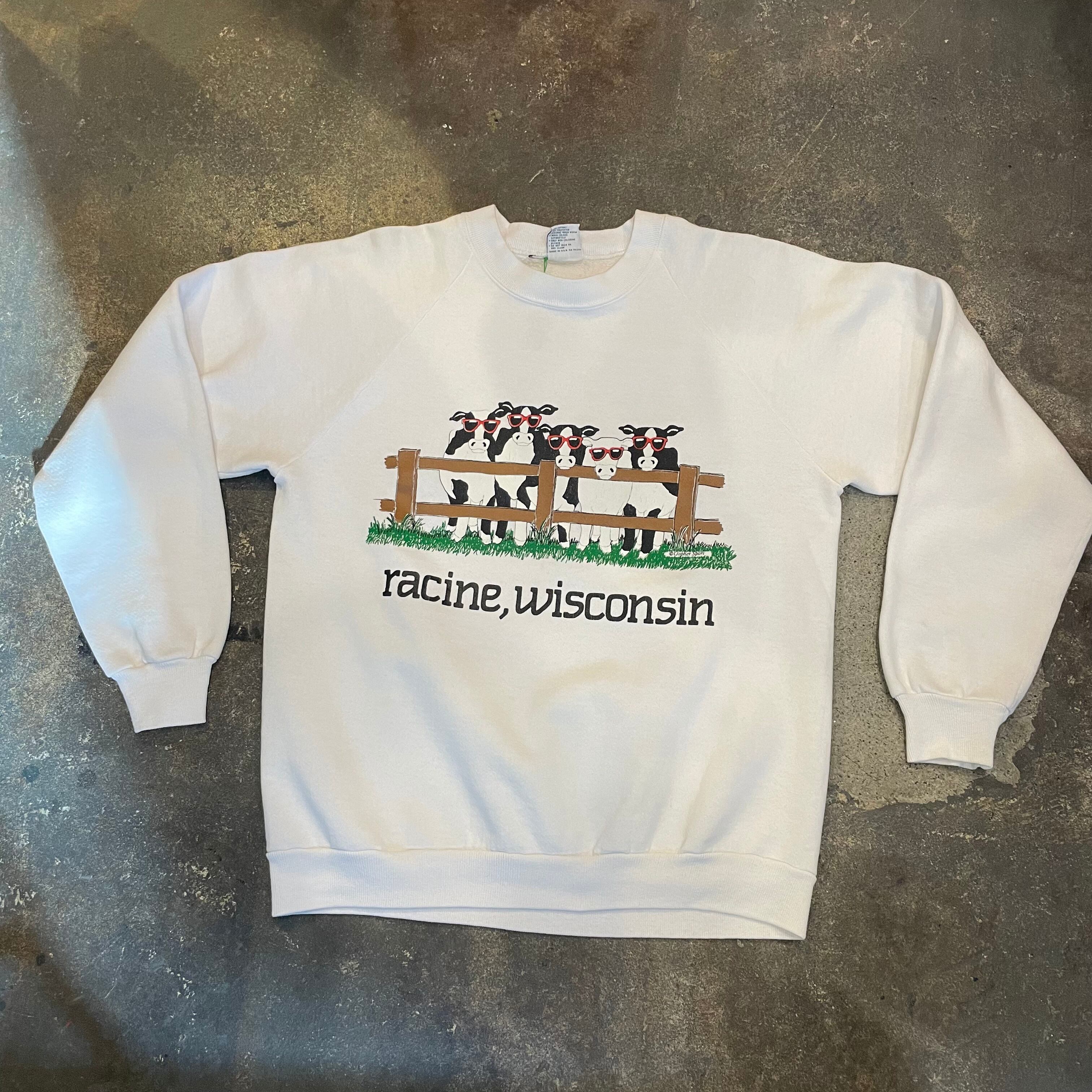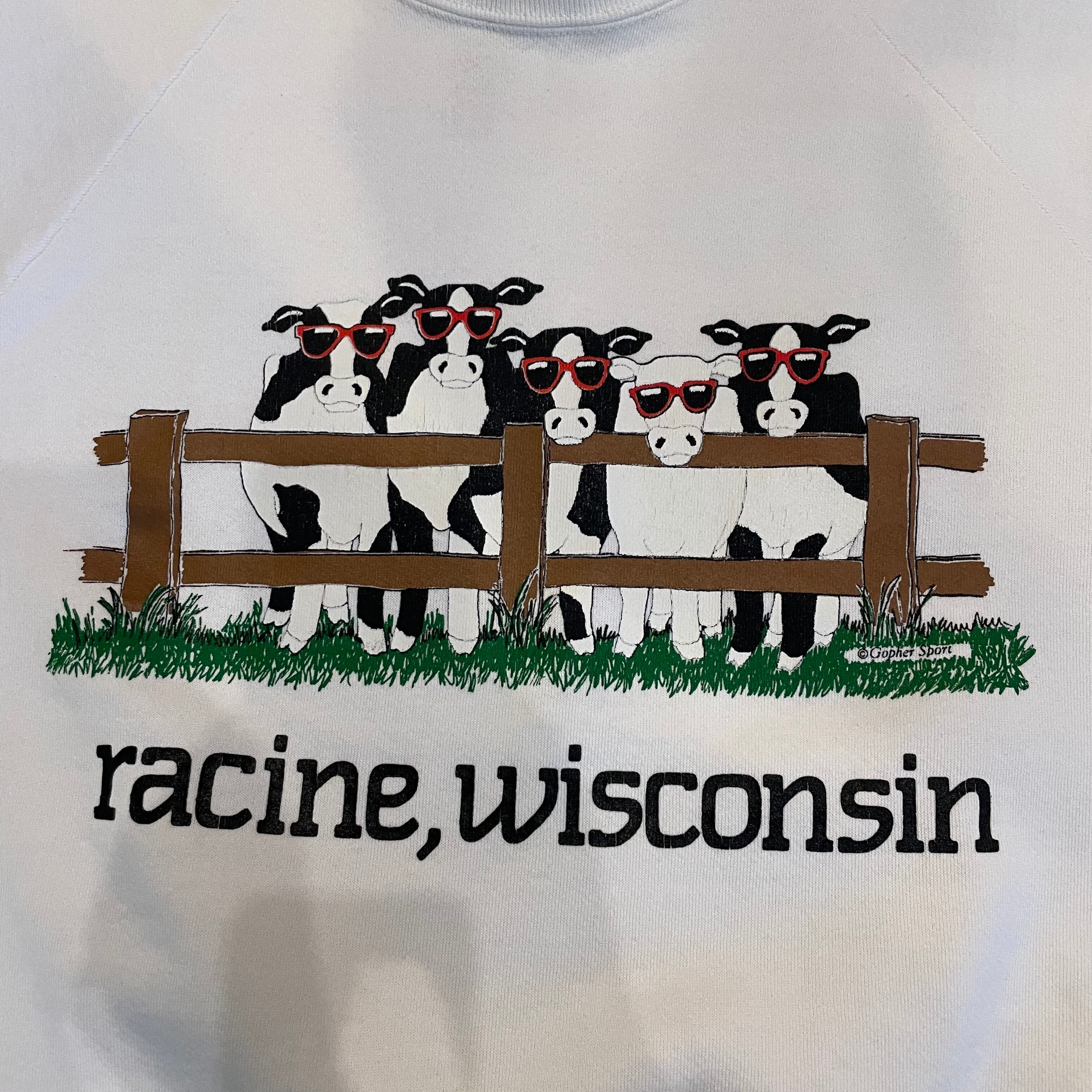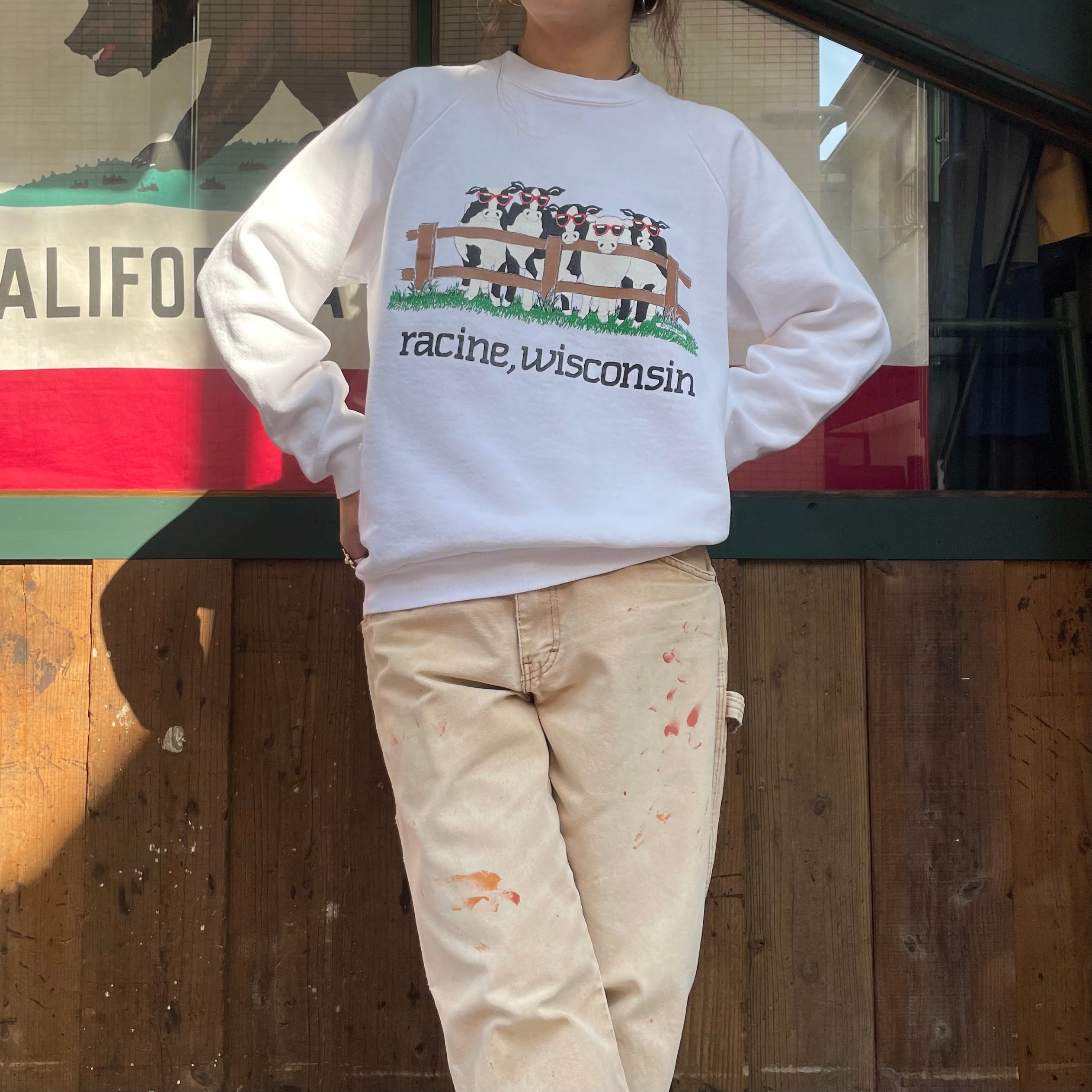 白地にサングラスの牛たちがかわいいスウェットです。背中には後ろ姿のあるバージョンで、背中から見てもかわいいお得な一枚です。