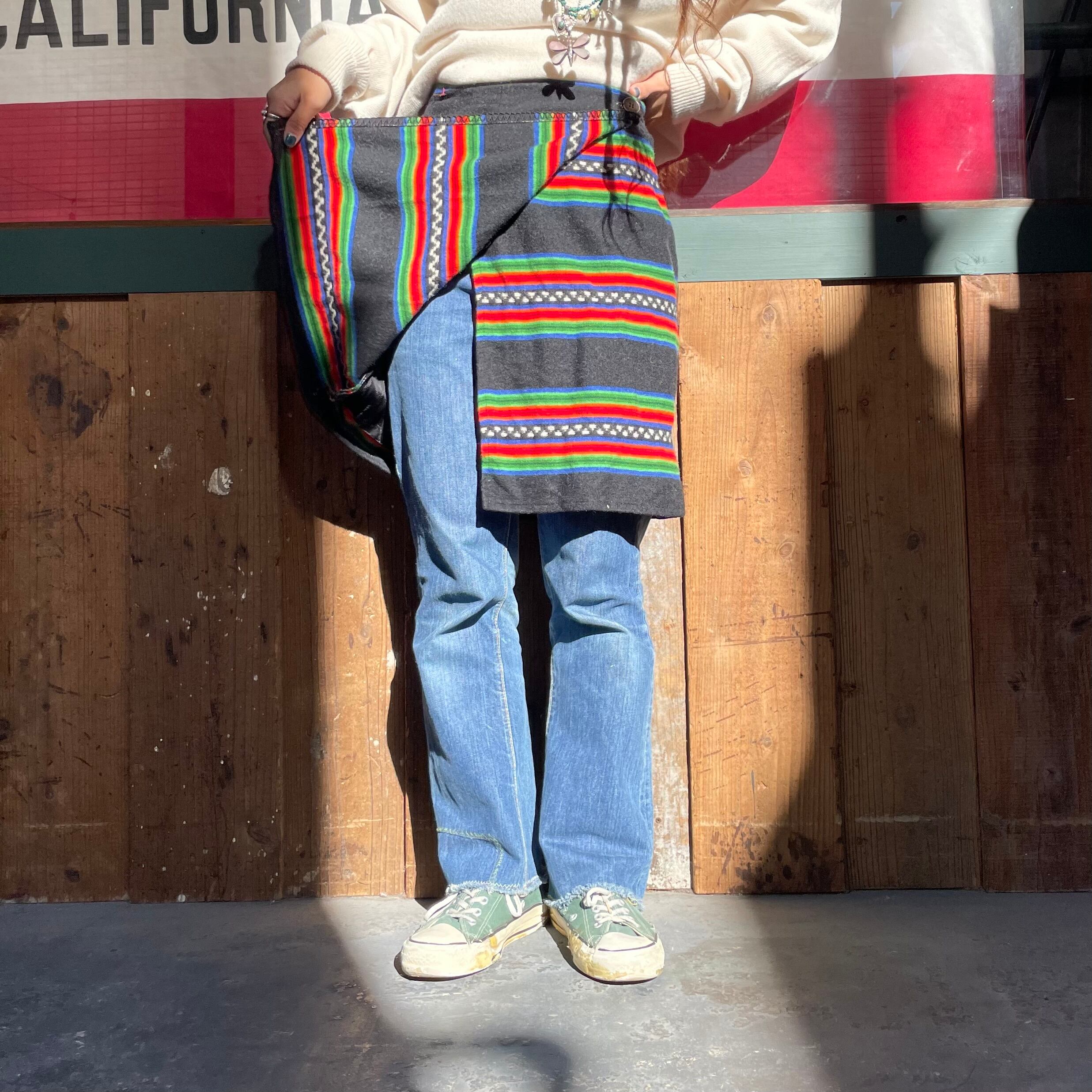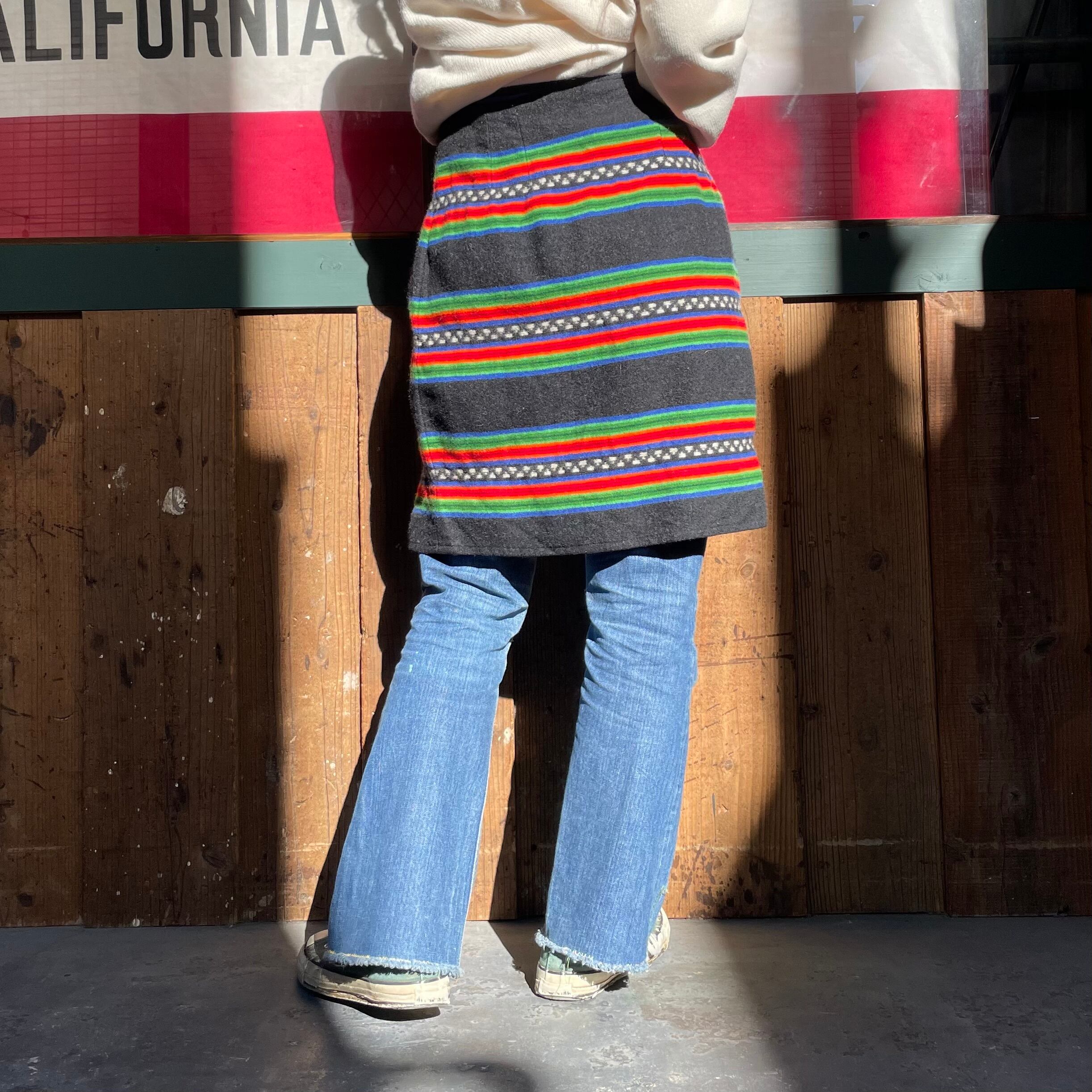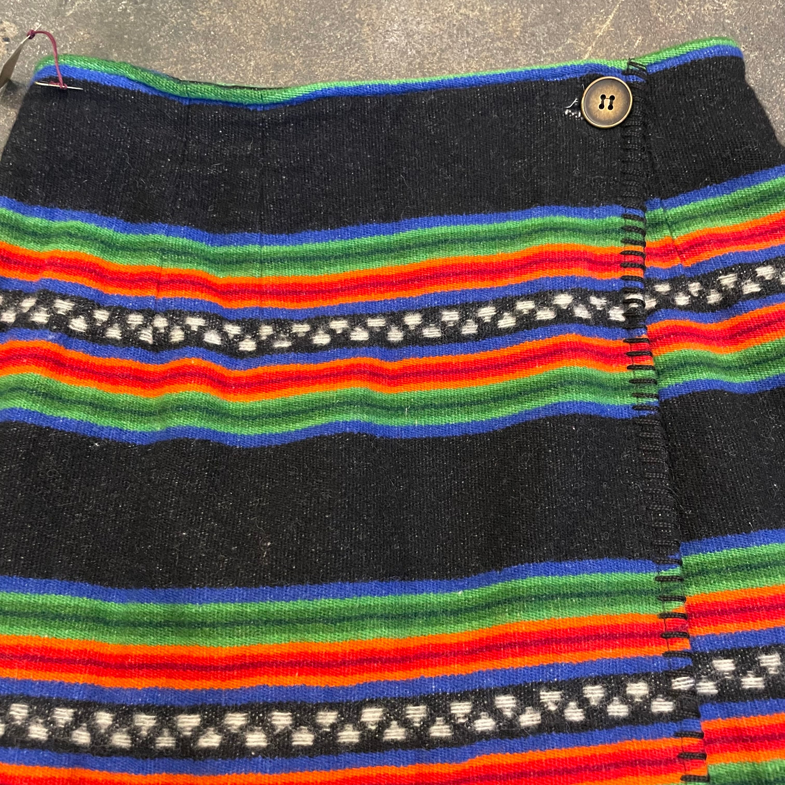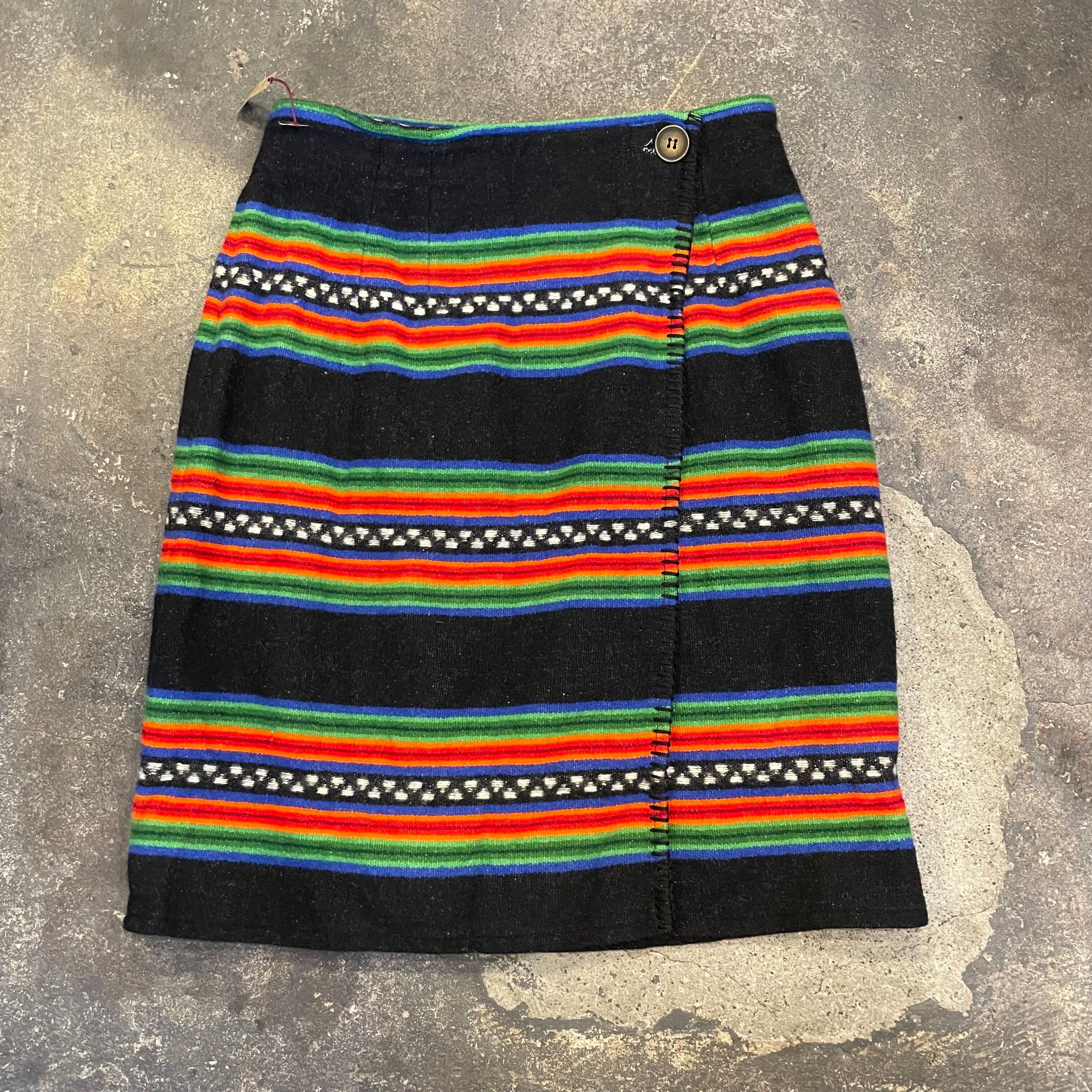 黒地にメキシカンラグのような、ネイティブ柄のような雰囲気の模様がかわいいウール素材の巻きスカートです。