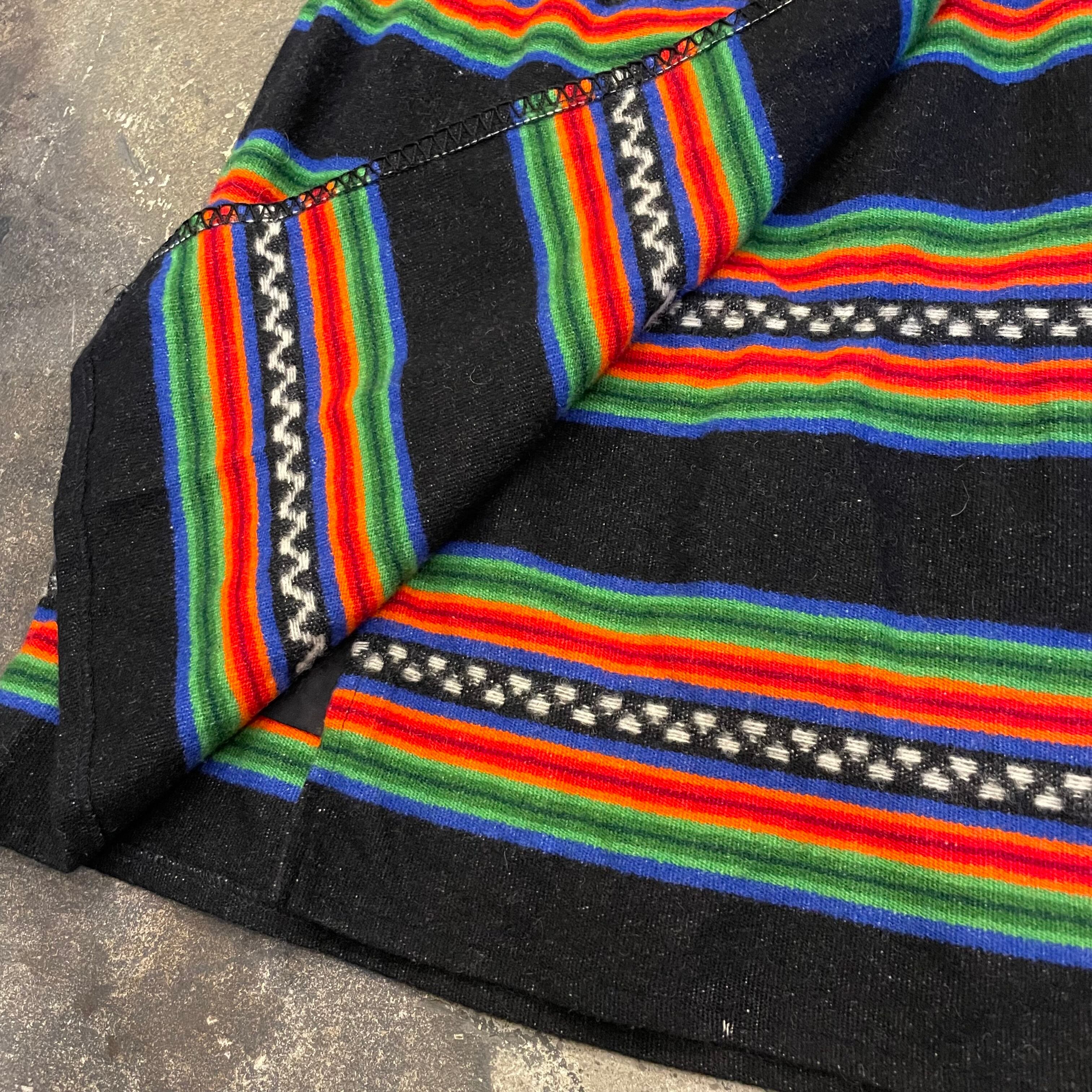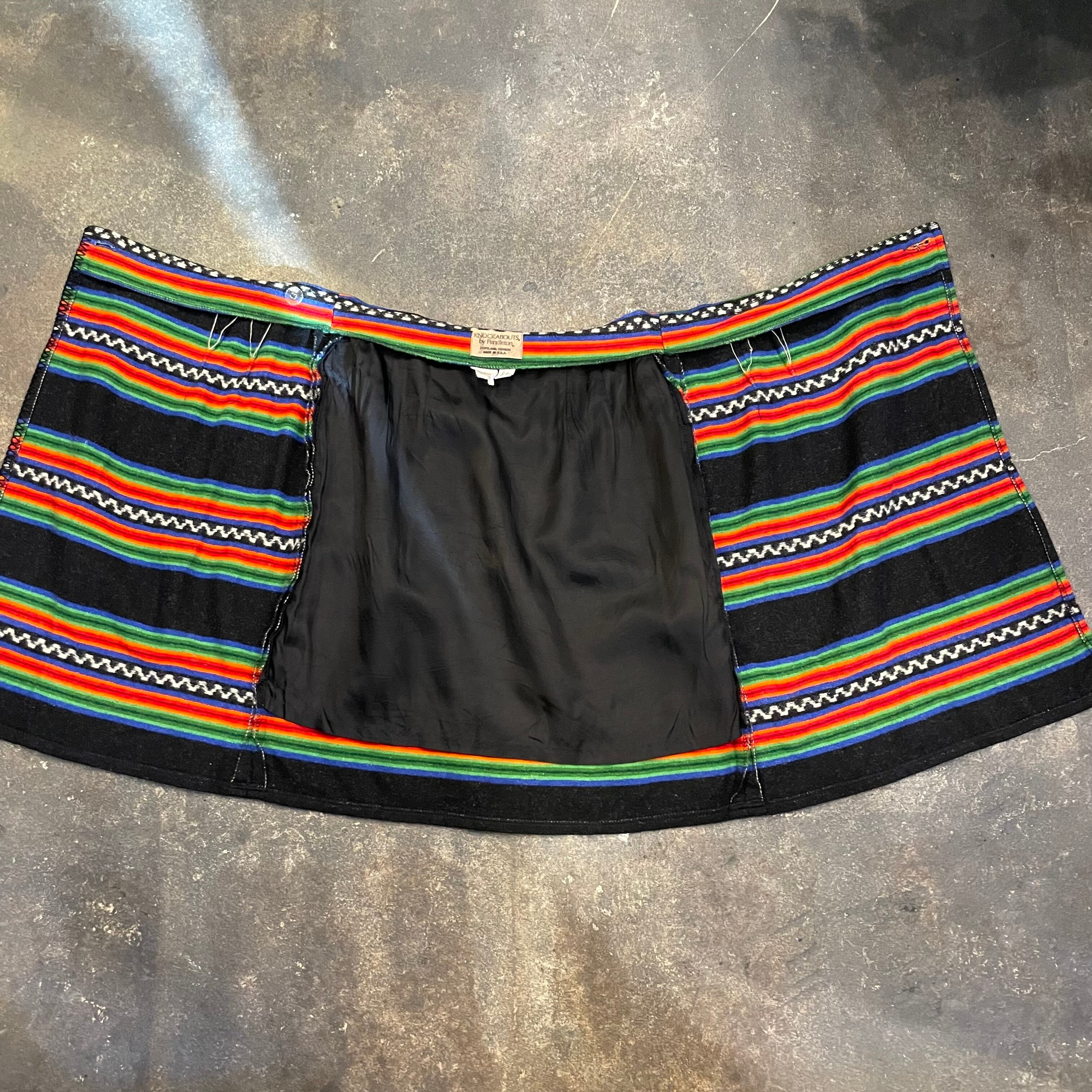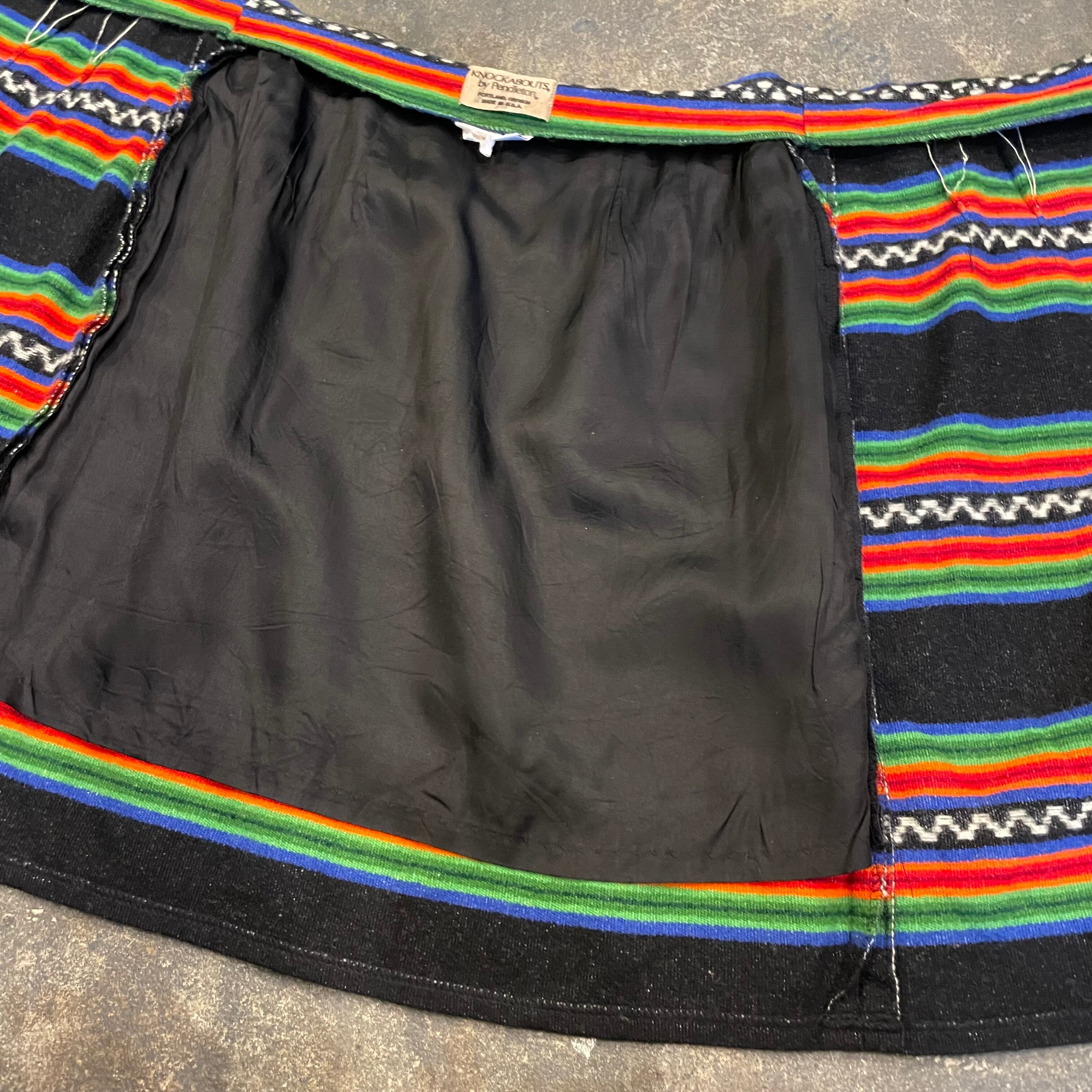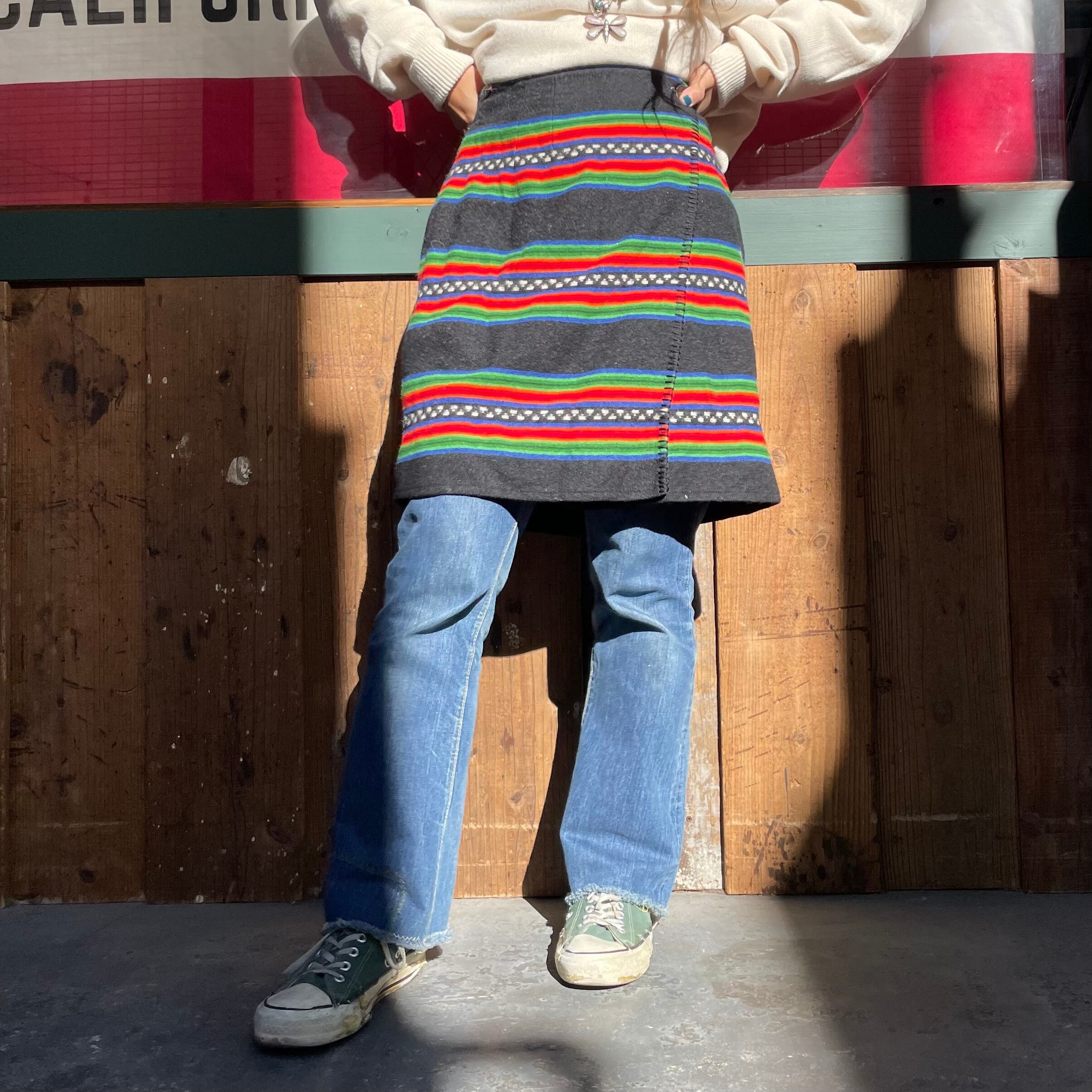 黒地にメキシカンラグのような、ネイティブ柄のような雰囲気の模様がかわいいウール素材の巻きスカートです。
