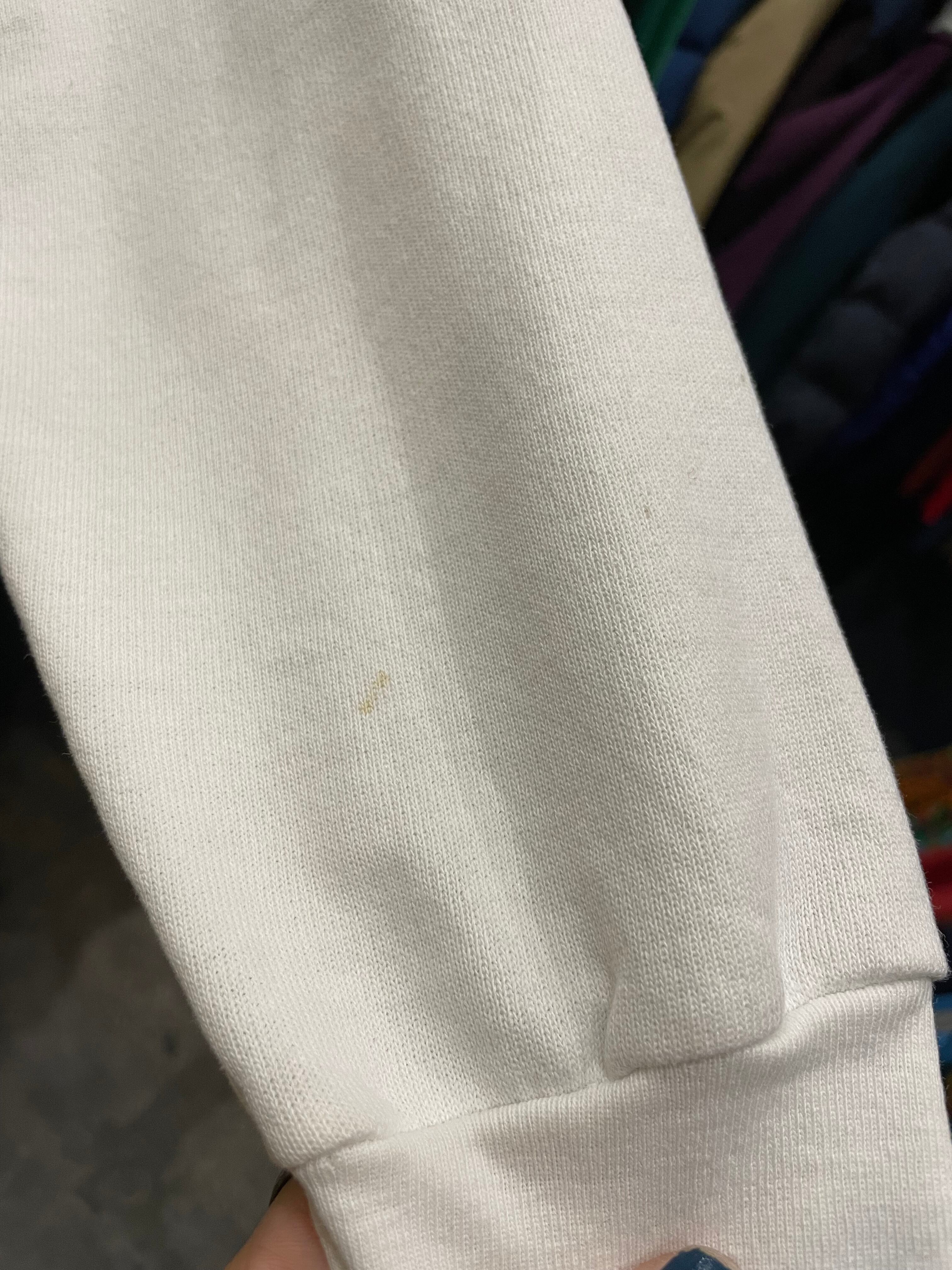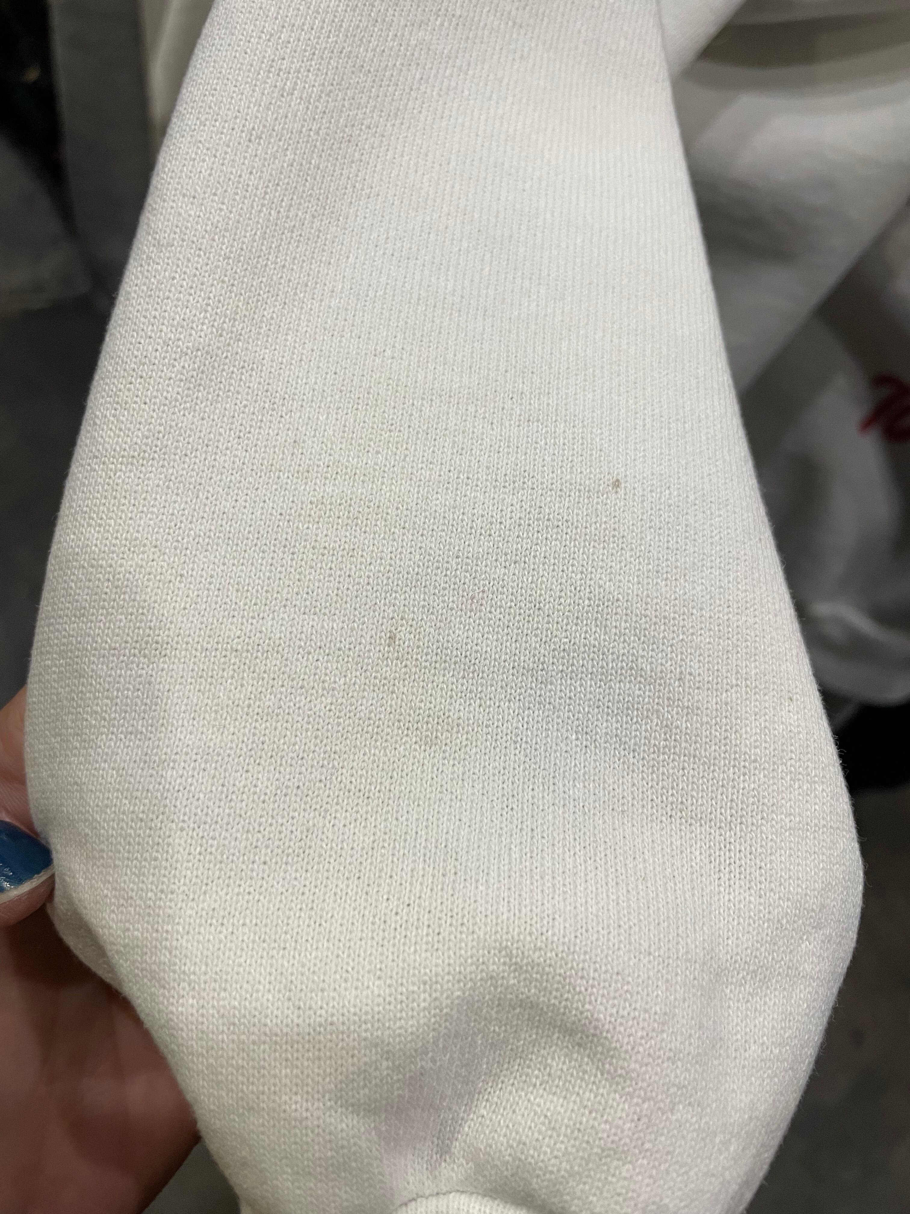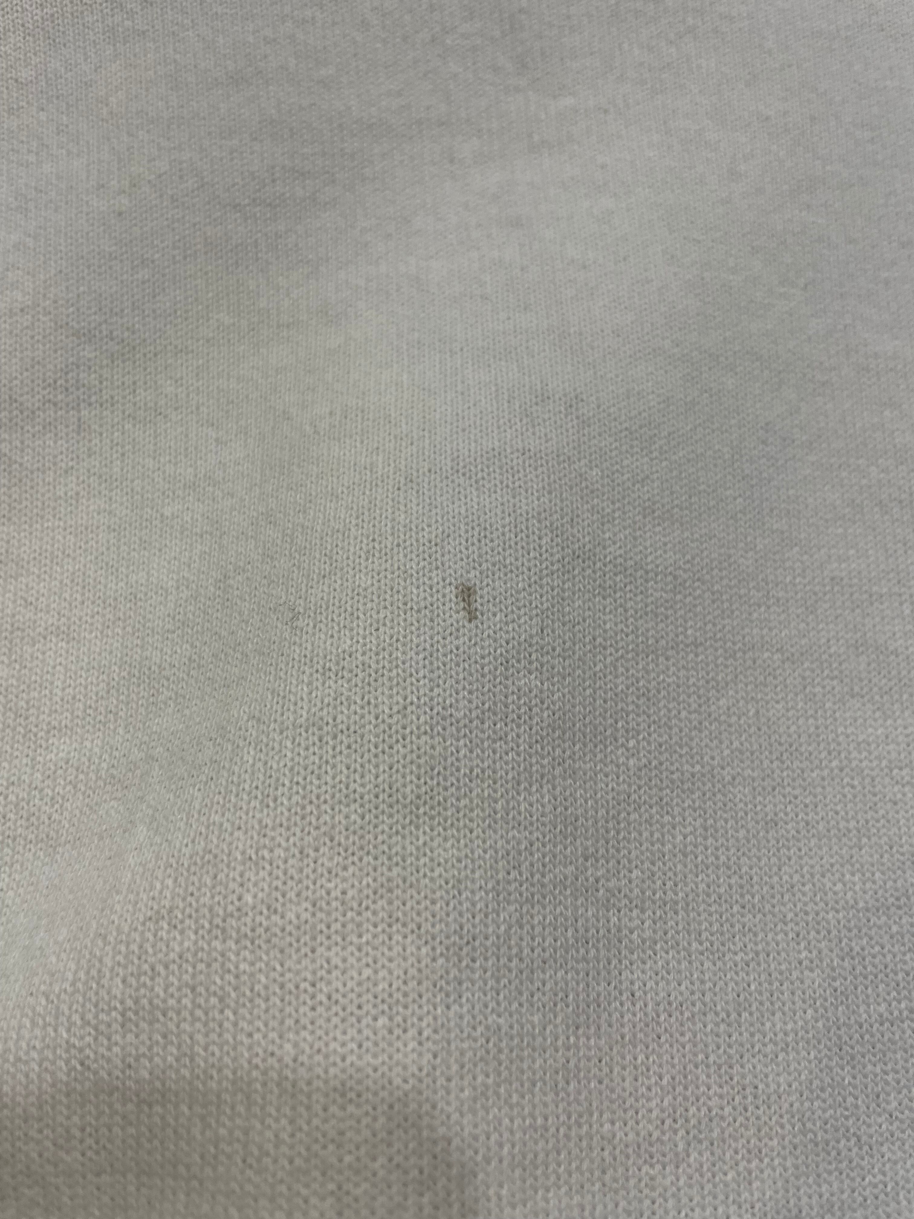小さいシミや傷、背中心にまっすぐ折り目のような裏起毛の薄くなっている箇所がございます。