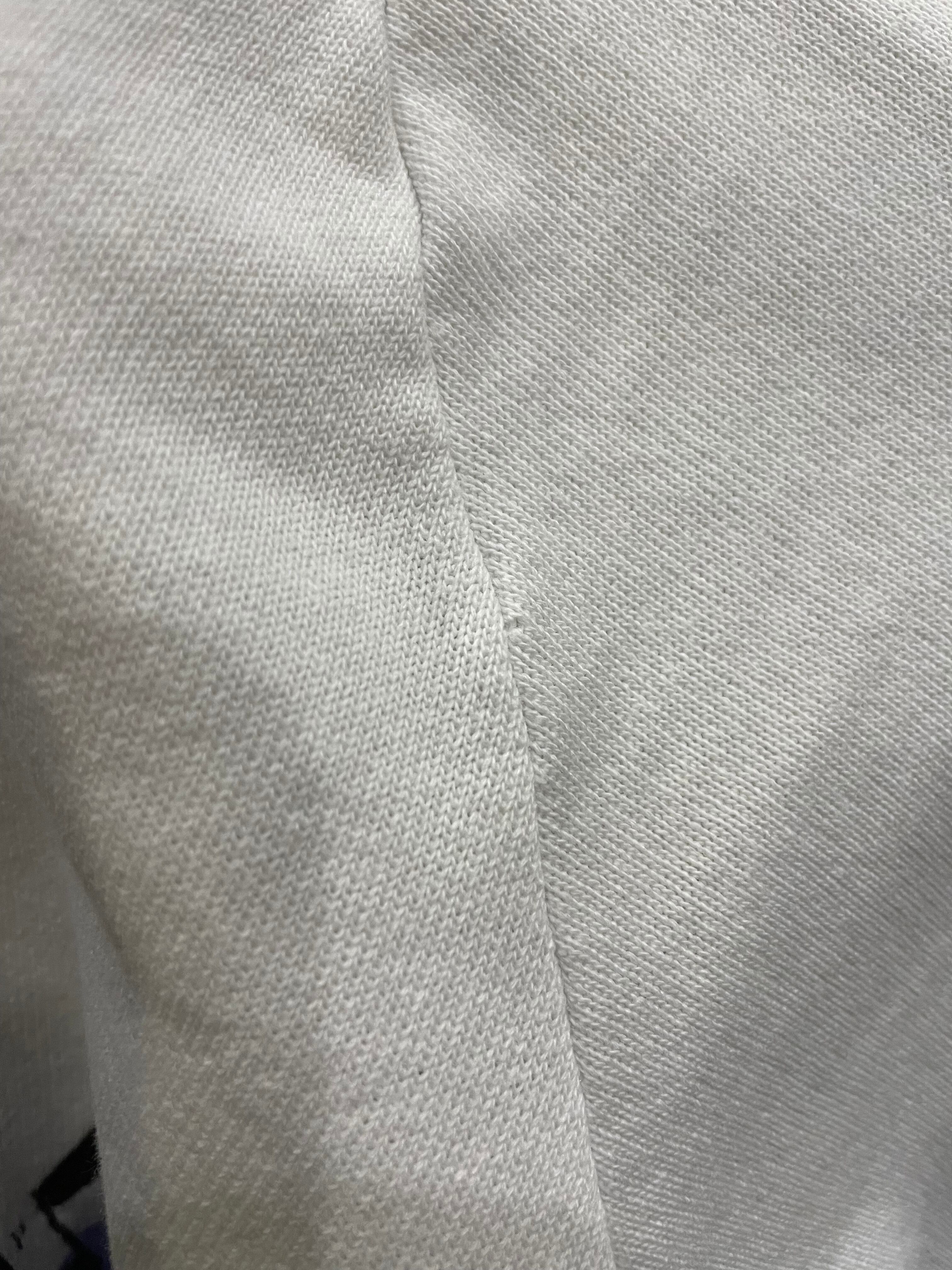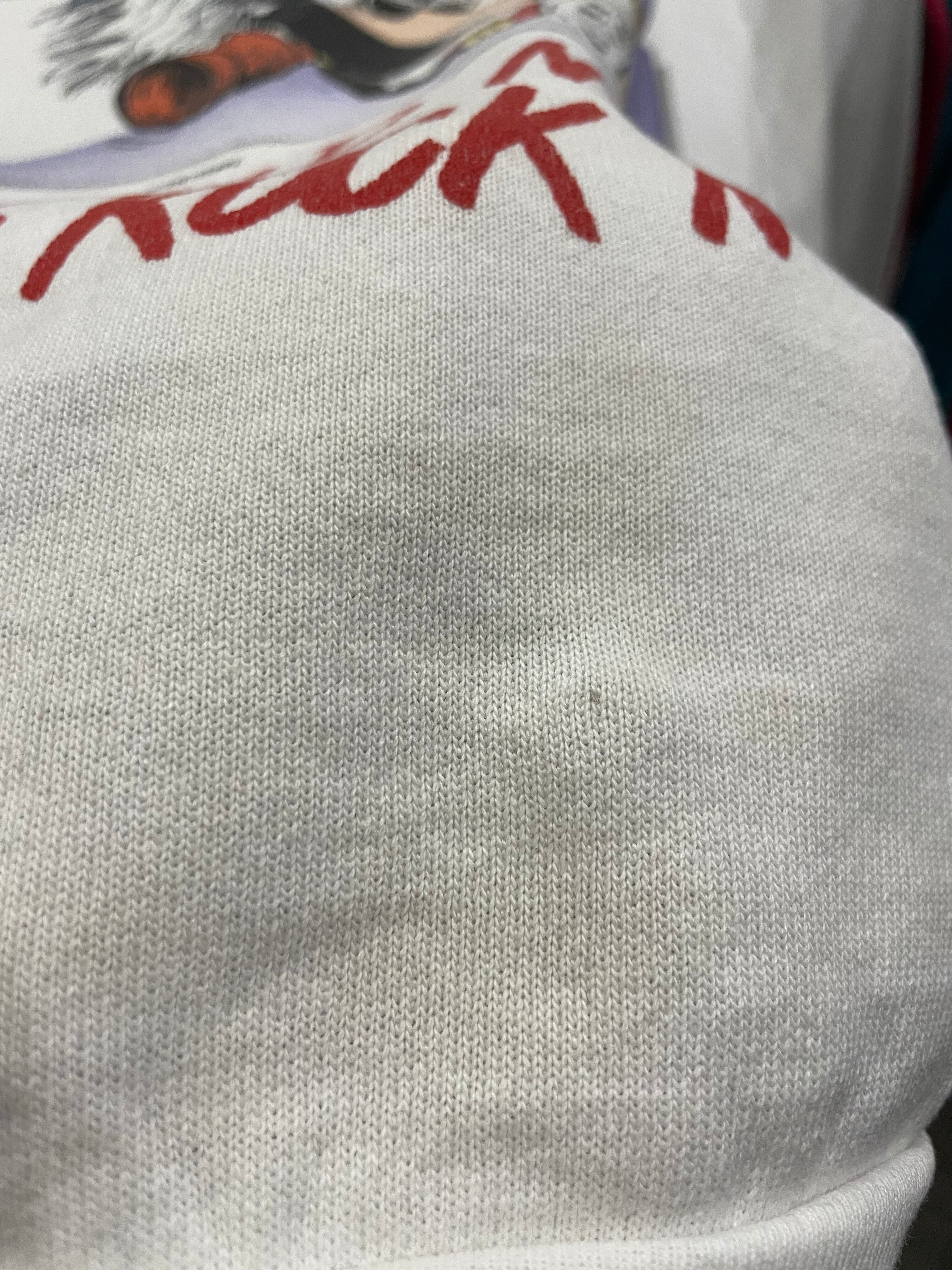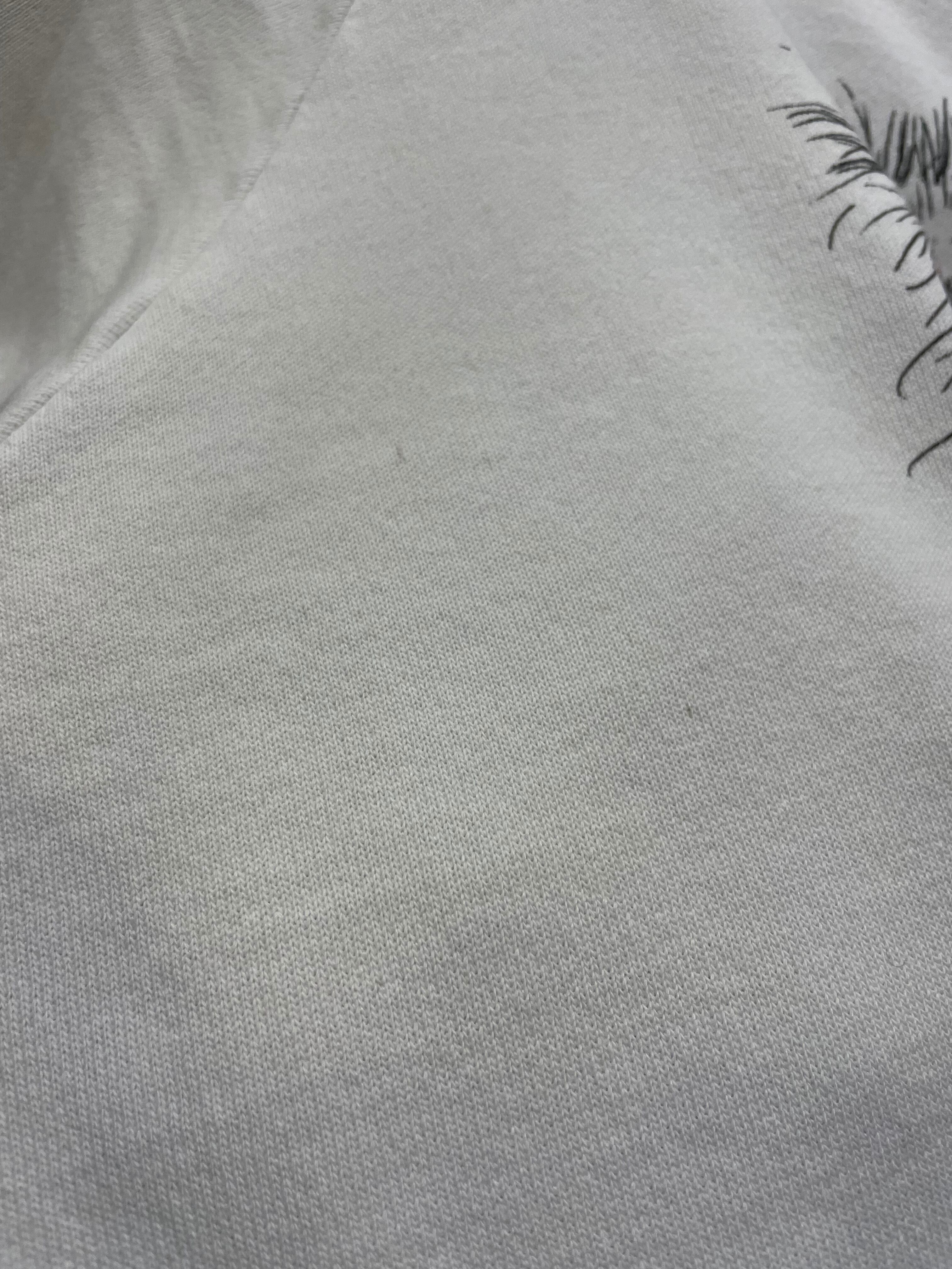 小さいシミや傷、背中心にまっすぐ折り目のような裏起毛の薄くなっている箇所がございます。