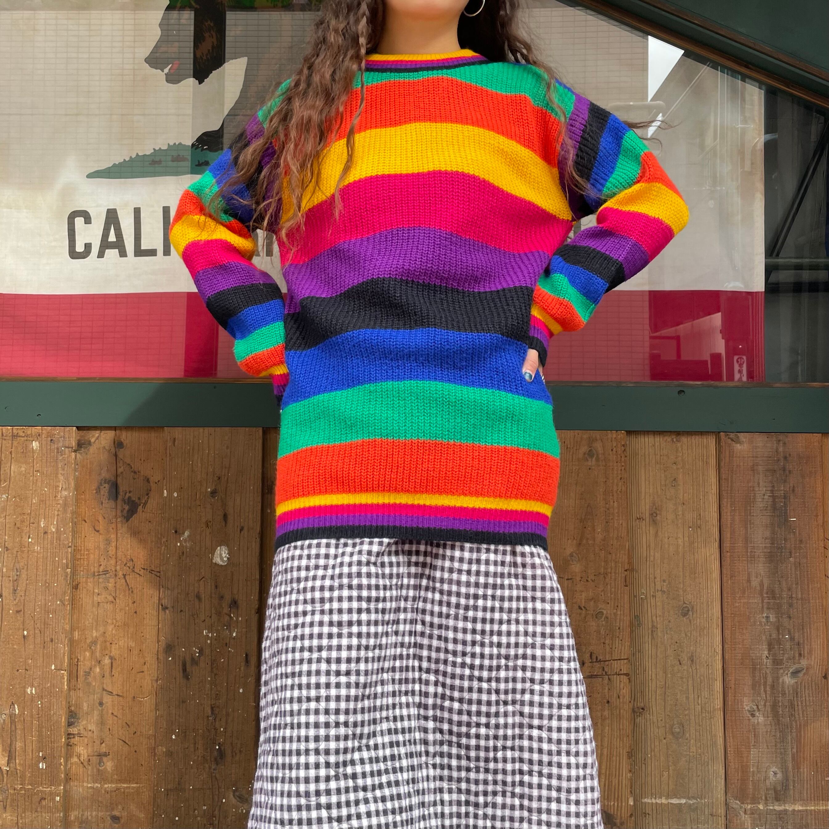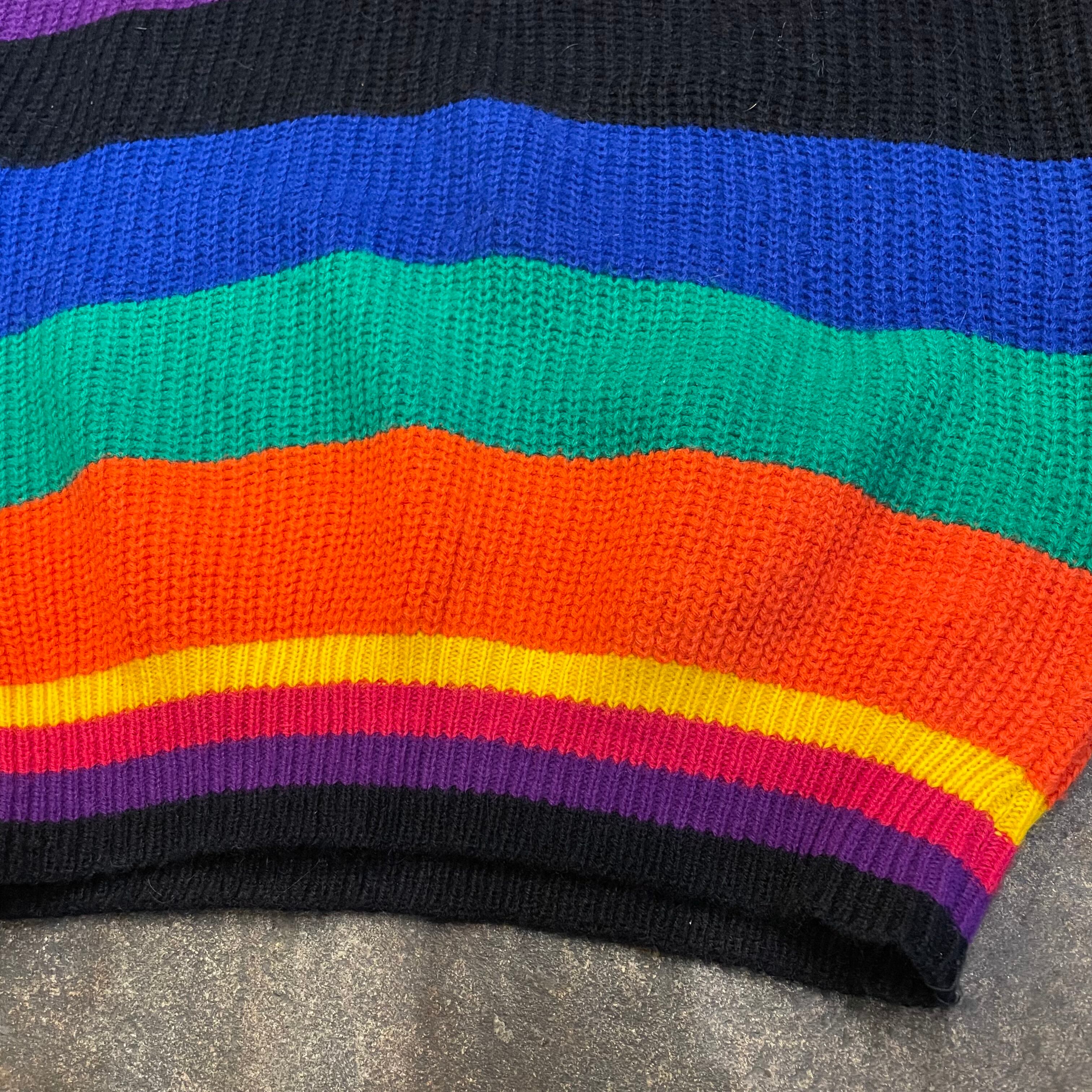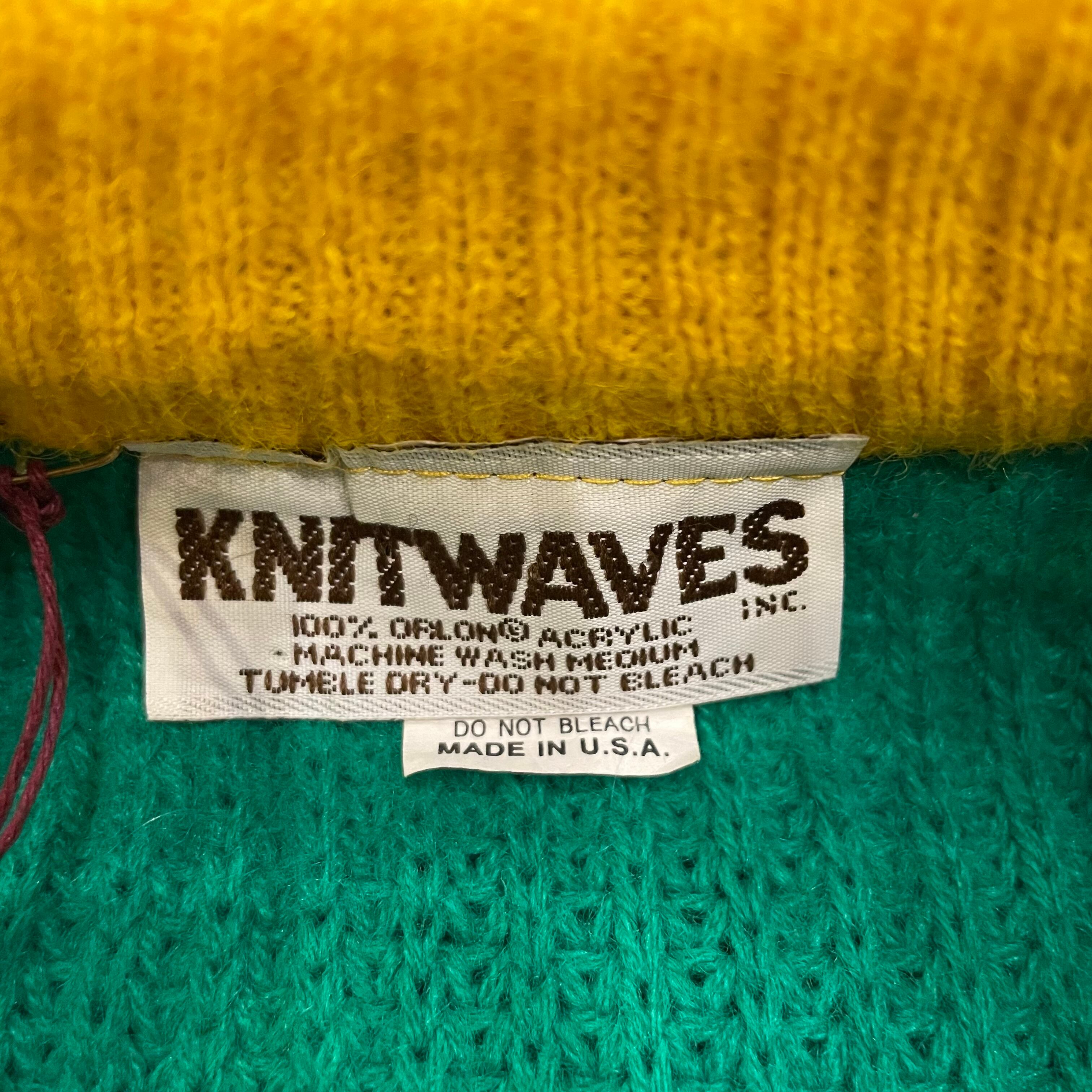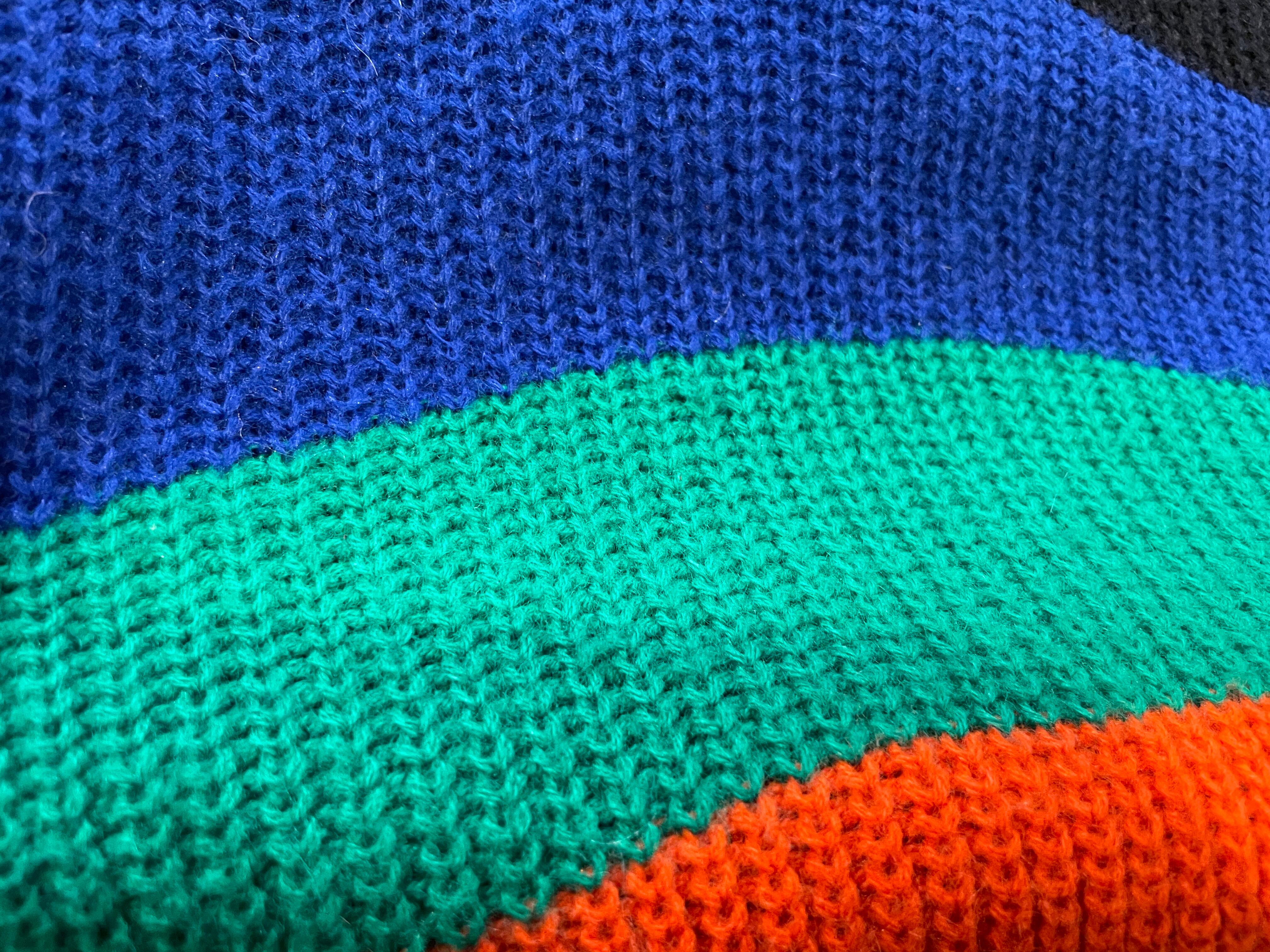アクリル素材で割と薄手なので気軽に着て頂けそうな一枚です。着丈がお尻が隠れるほど長いので伸ばして着るのも良いですし、リブがしっかりしているので折り曲げて着てもしっかり留まってくれて嵩張らないのでいろんな着方が楽しめると思います。