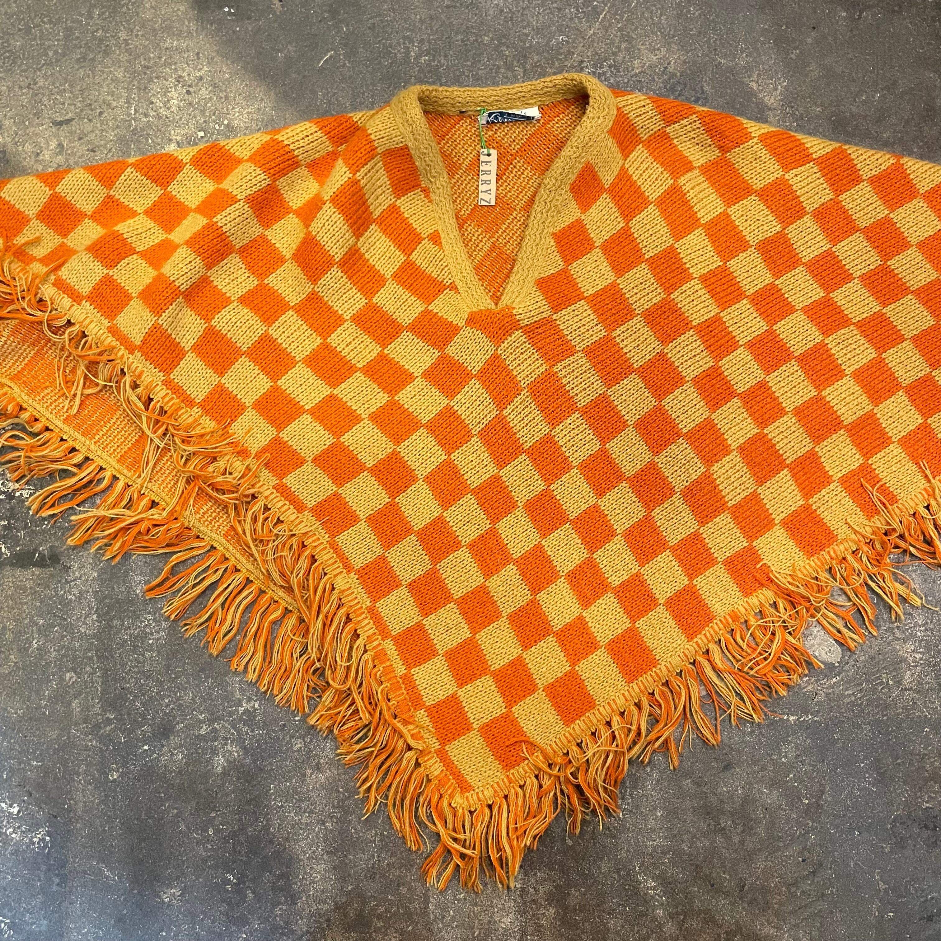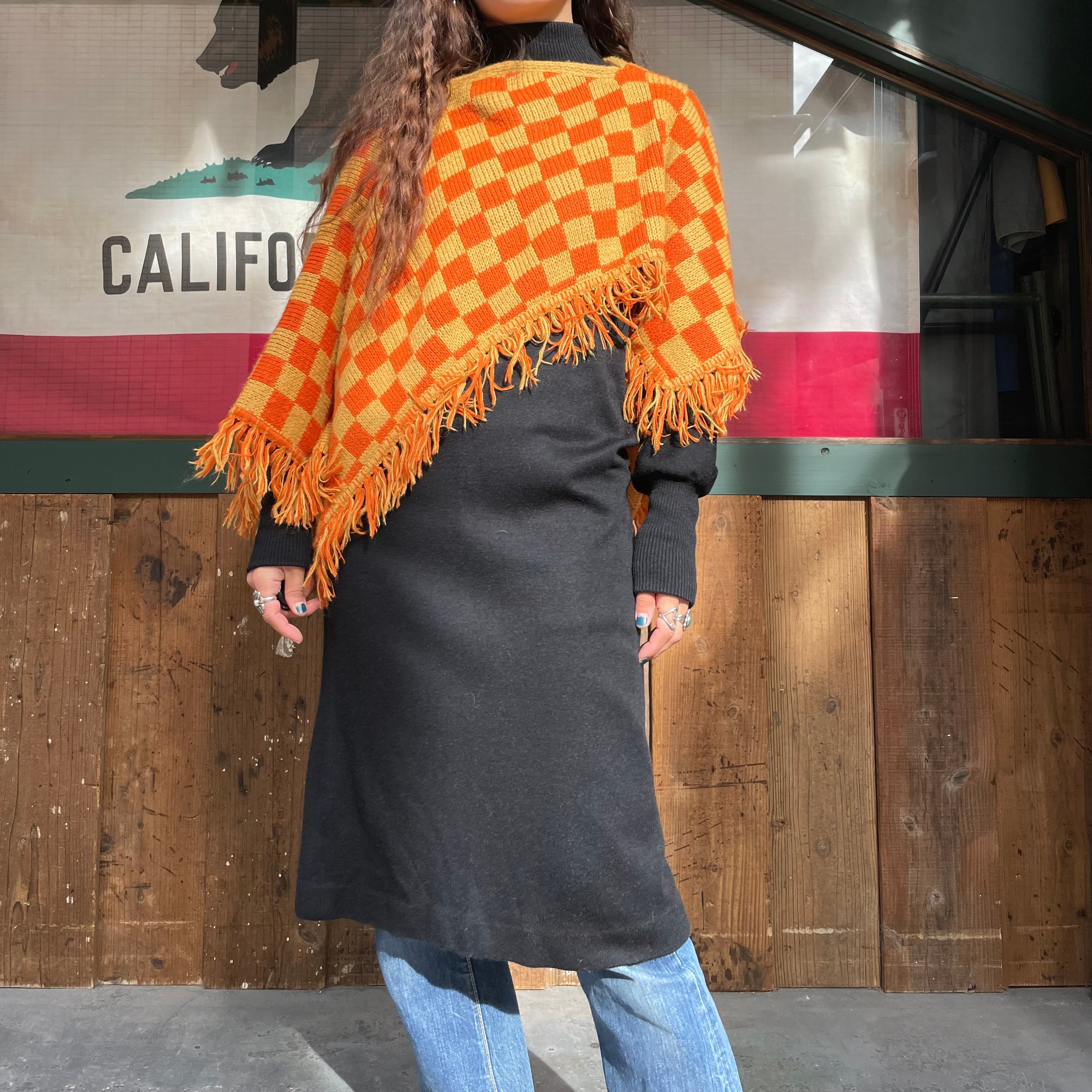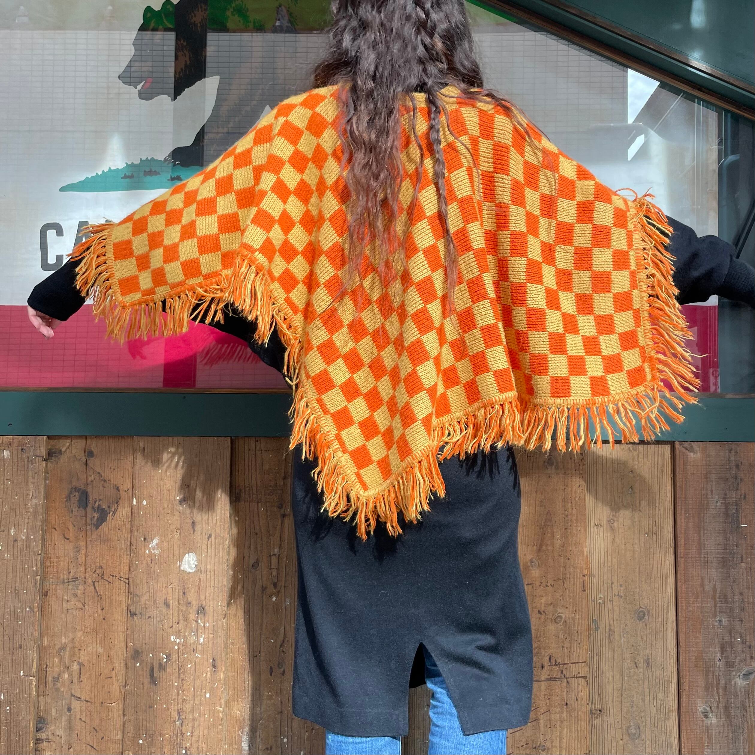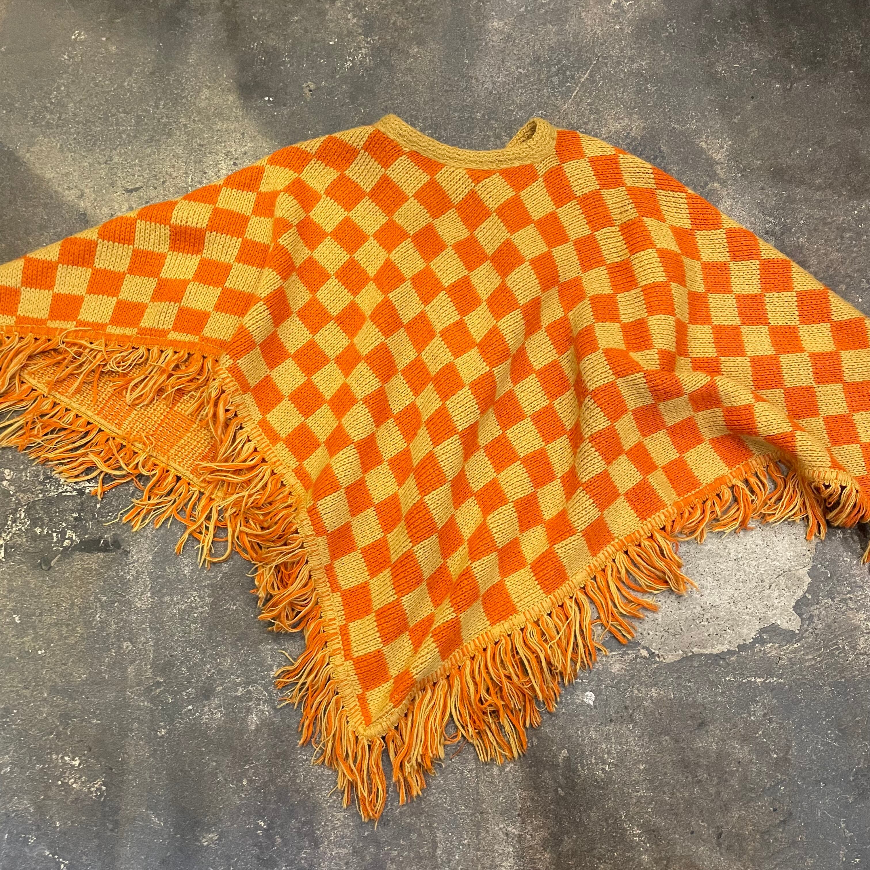 オレンジ×マスタードのハッピーなブロックチェック柄がかわいいニットポンチョです。