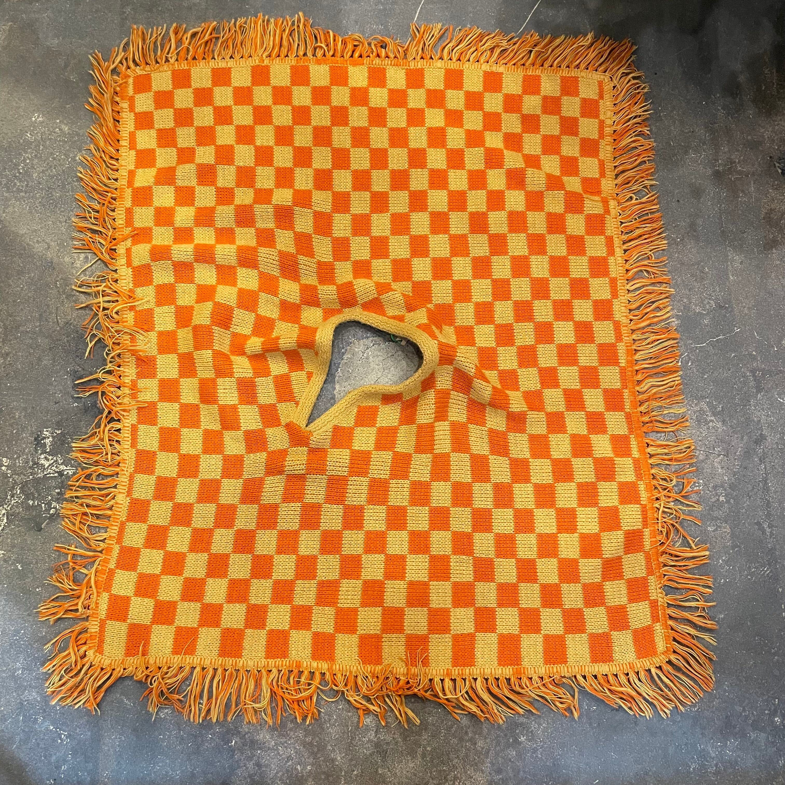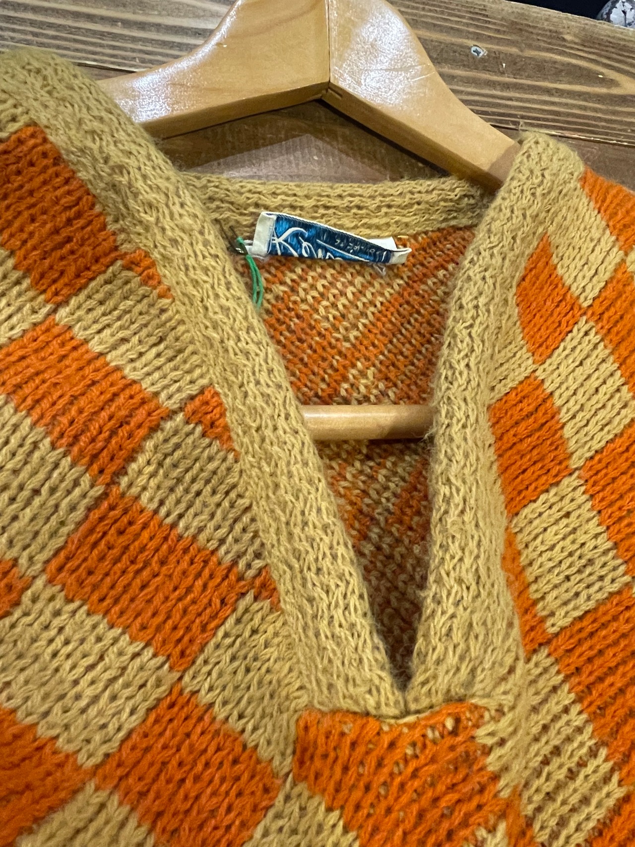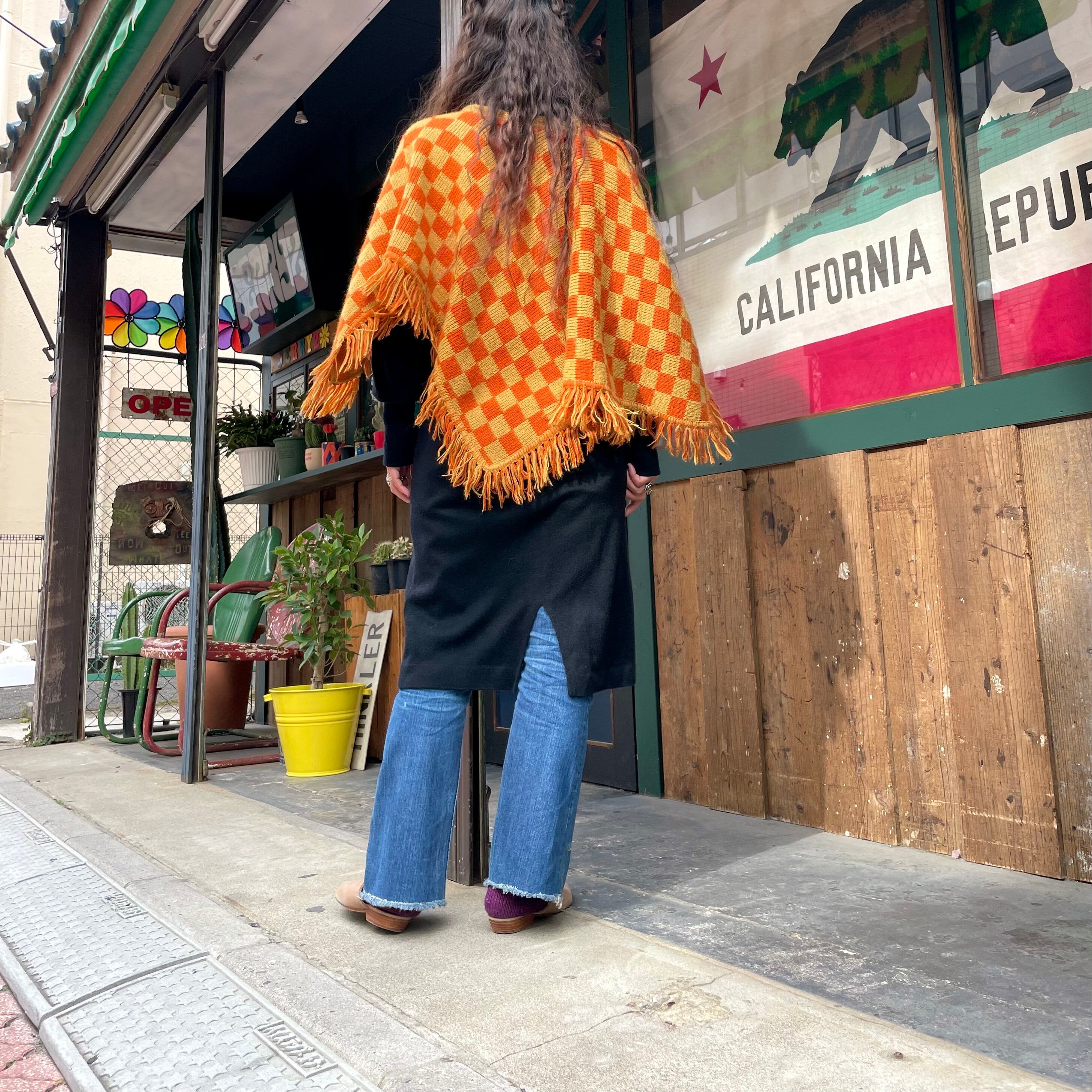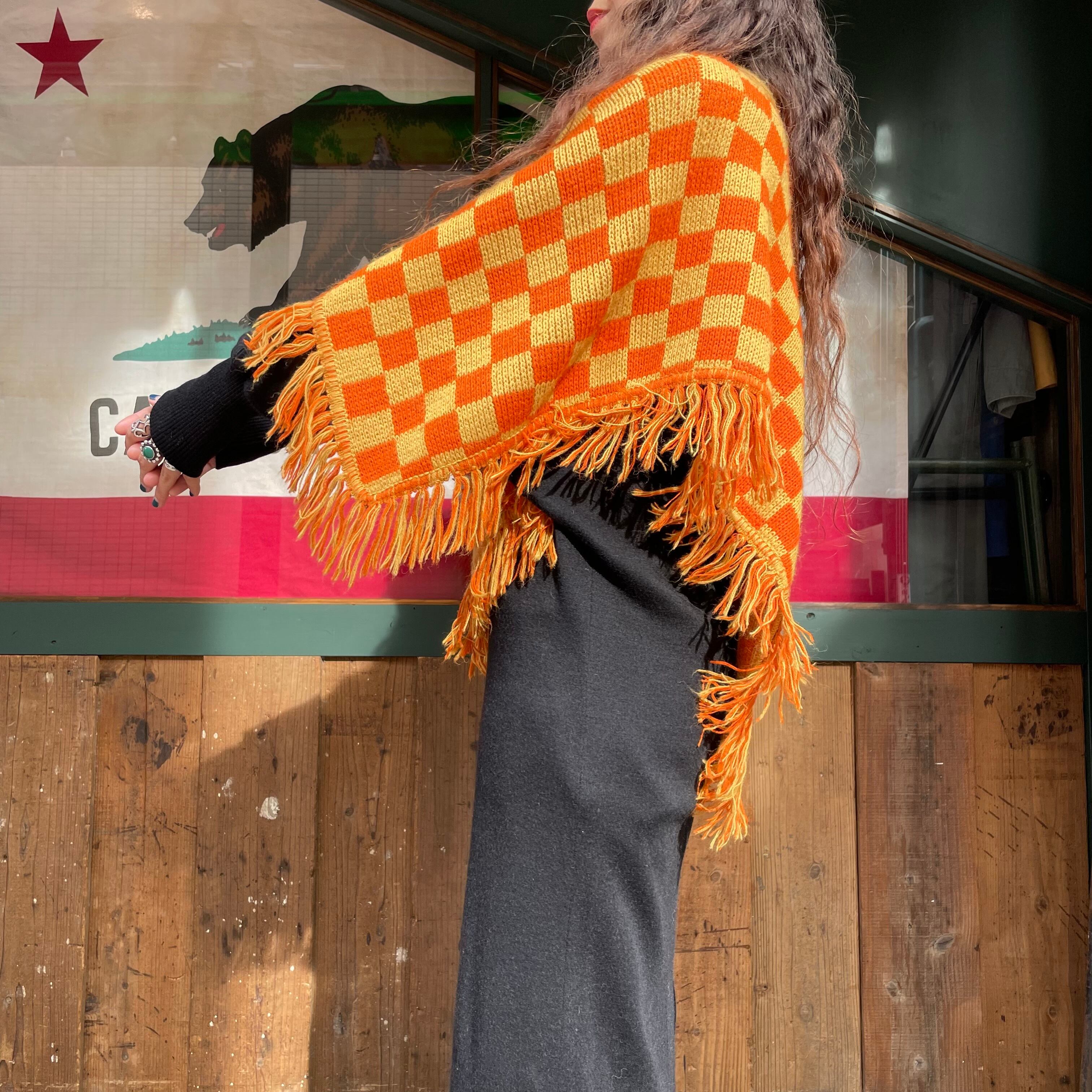 オレンジ×マスタードのハッピーなブロックチェック柄がかわいいニットポンチョです。