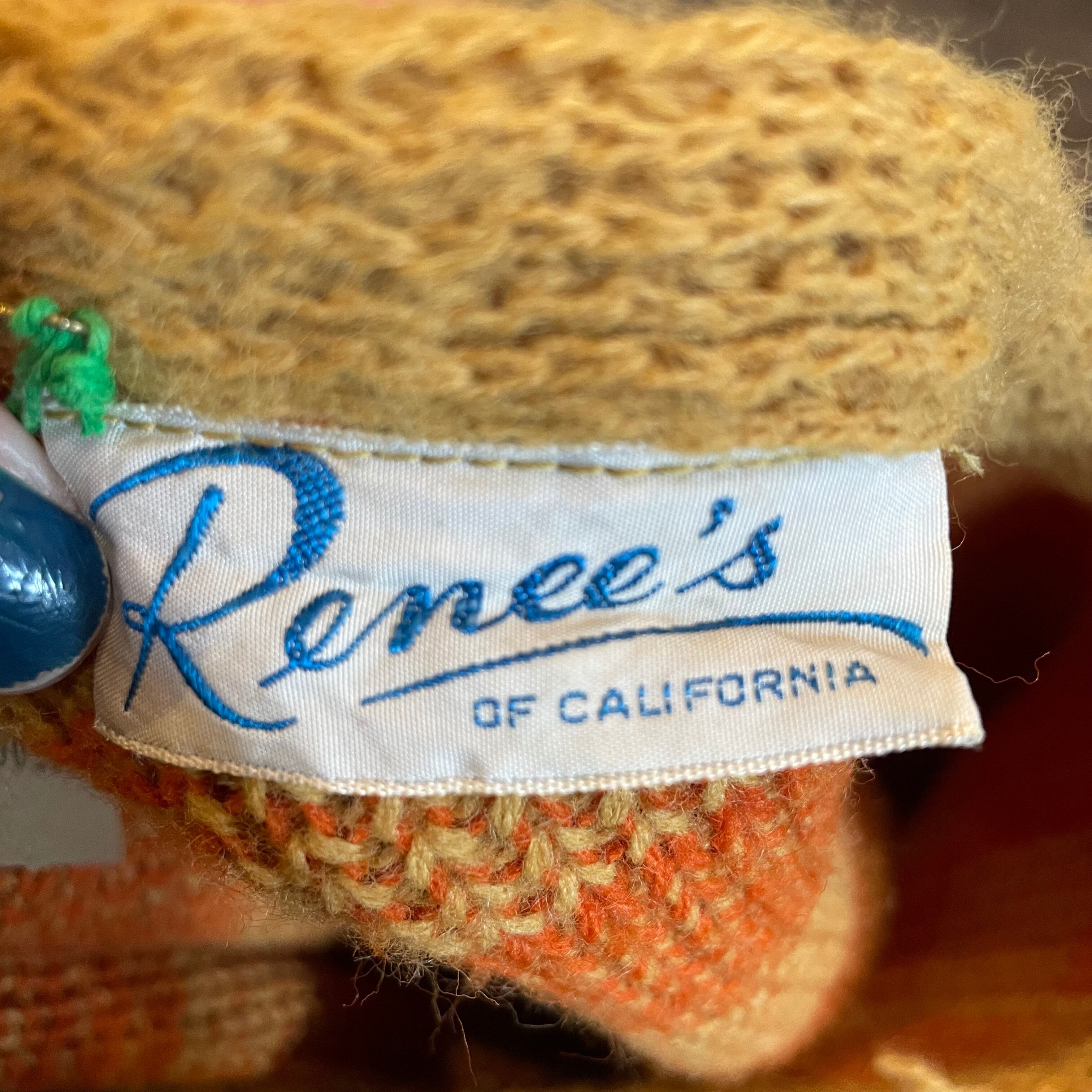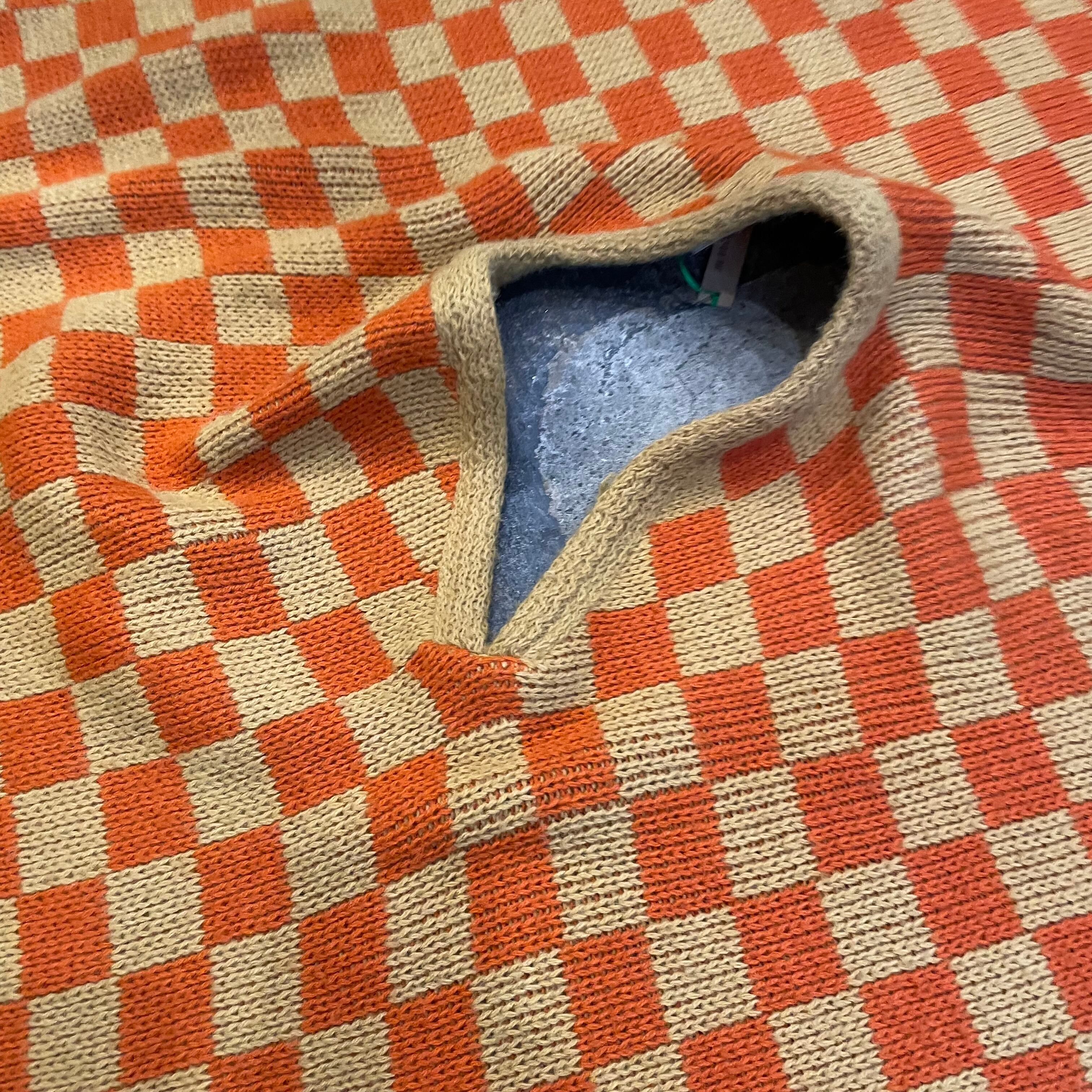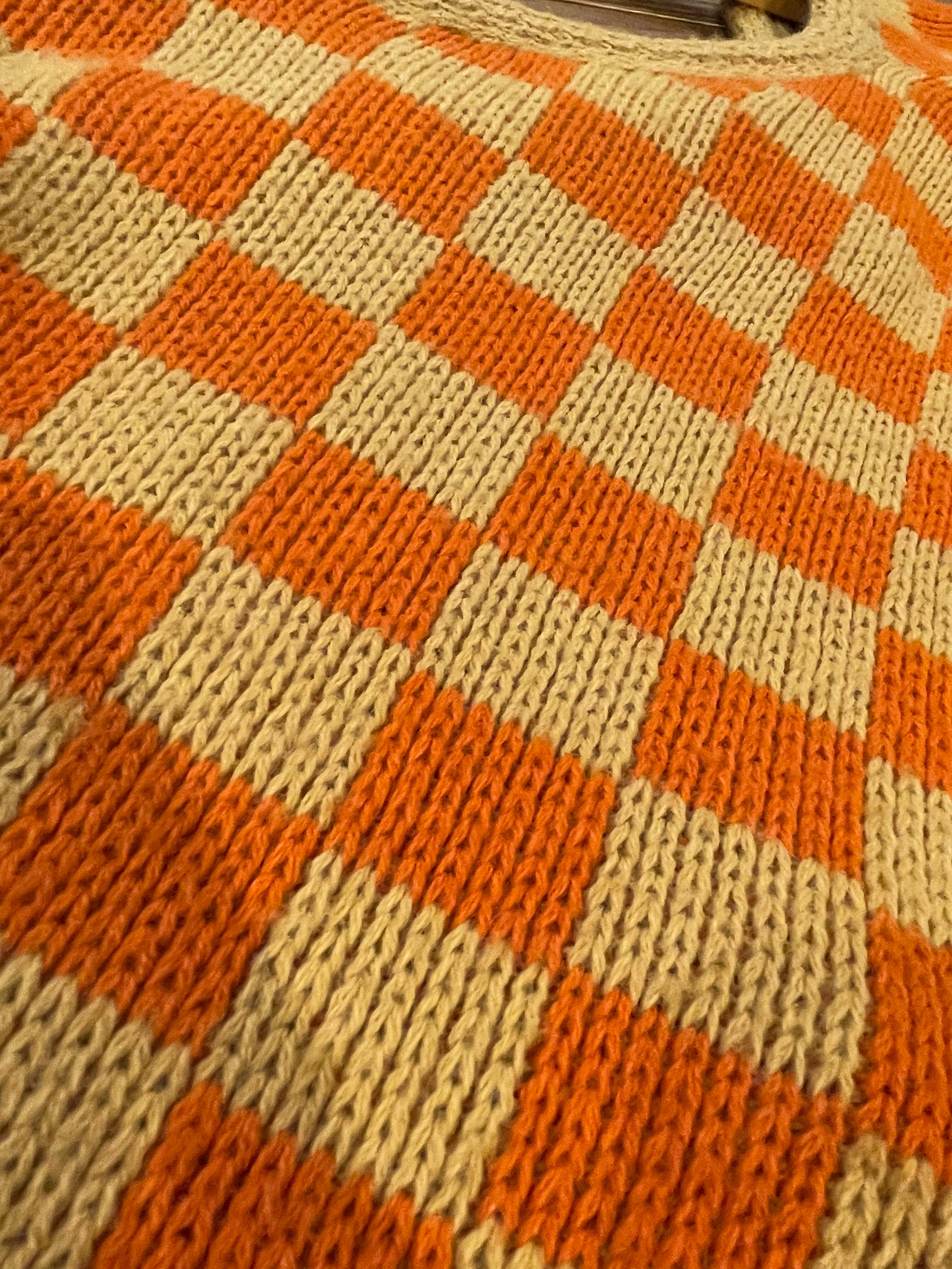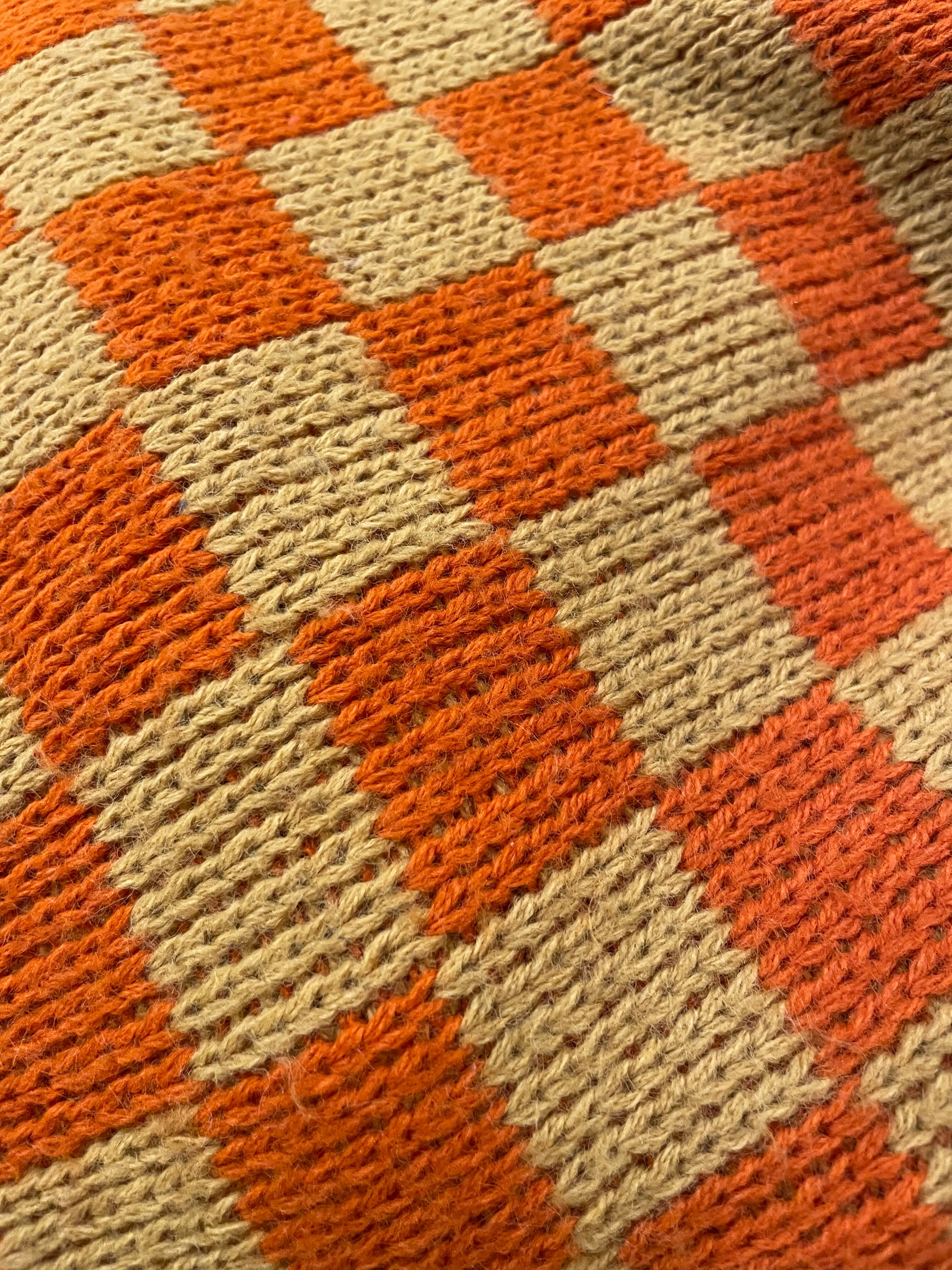 オレンジ×マスタードのハッピーなブロックチェック柄がかわいいニットポンチョです。