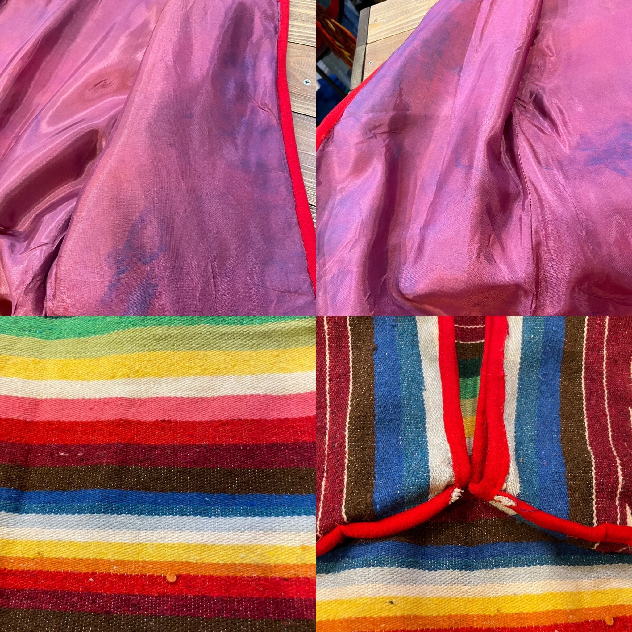 裏地の色褪せがあります。全体的に毛羽立ちというか擦れのようなダメージ等ございます。縫い目が雑な箇所等、かなり使用感のある商品ですので古着にご理解のある方のご購入をお願い致します。