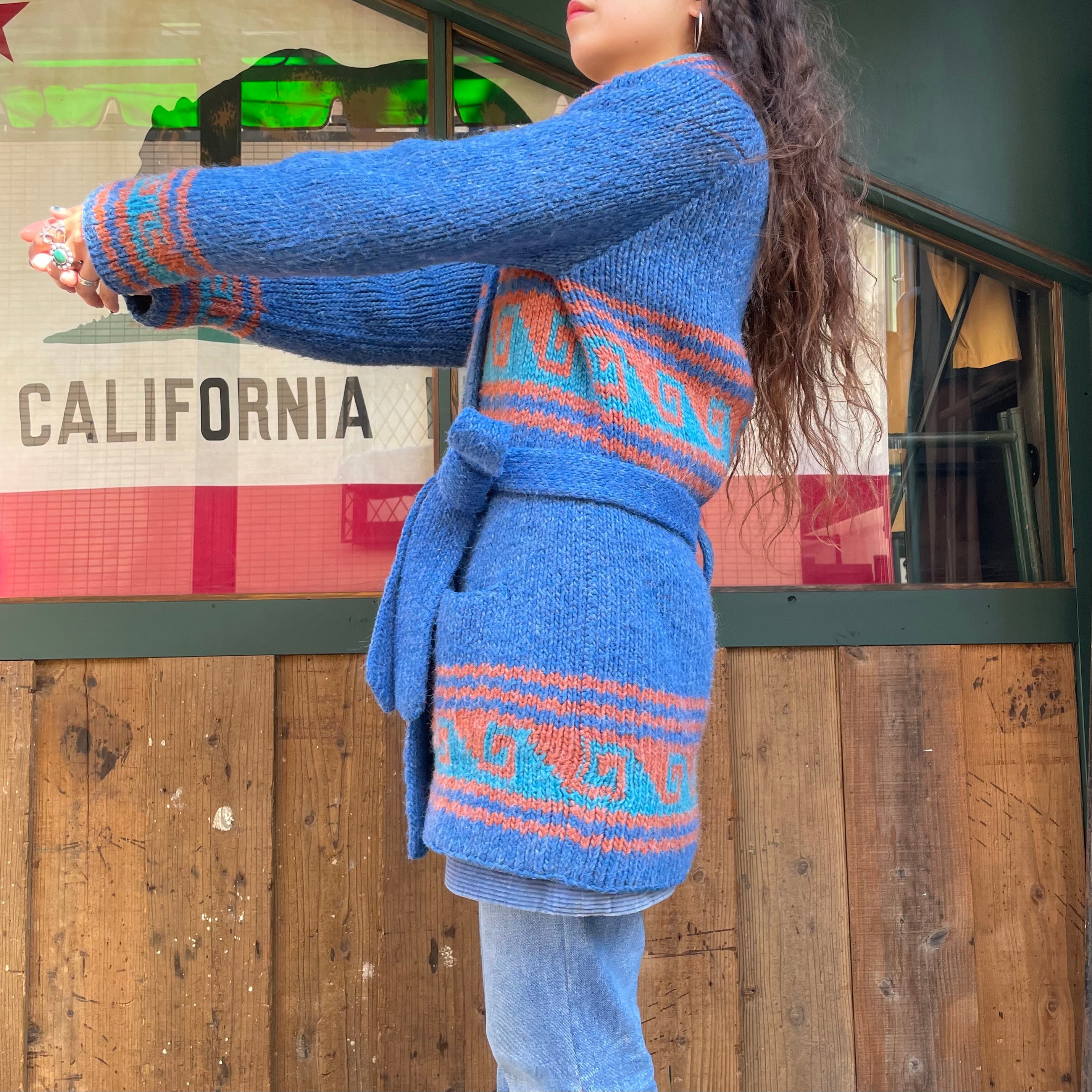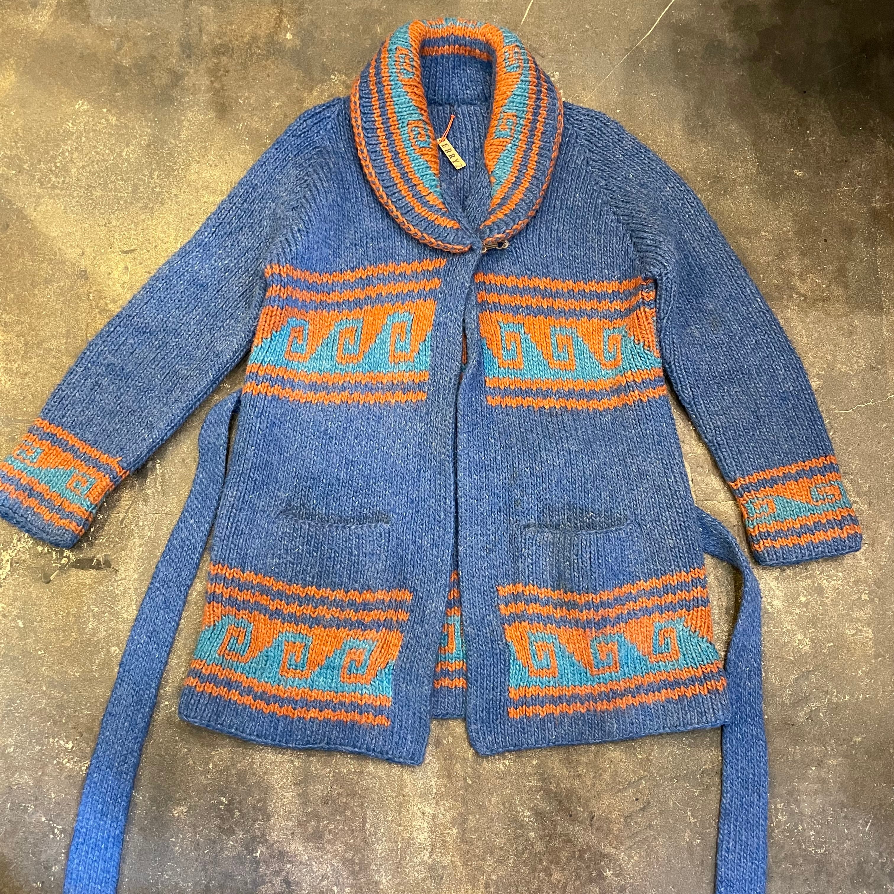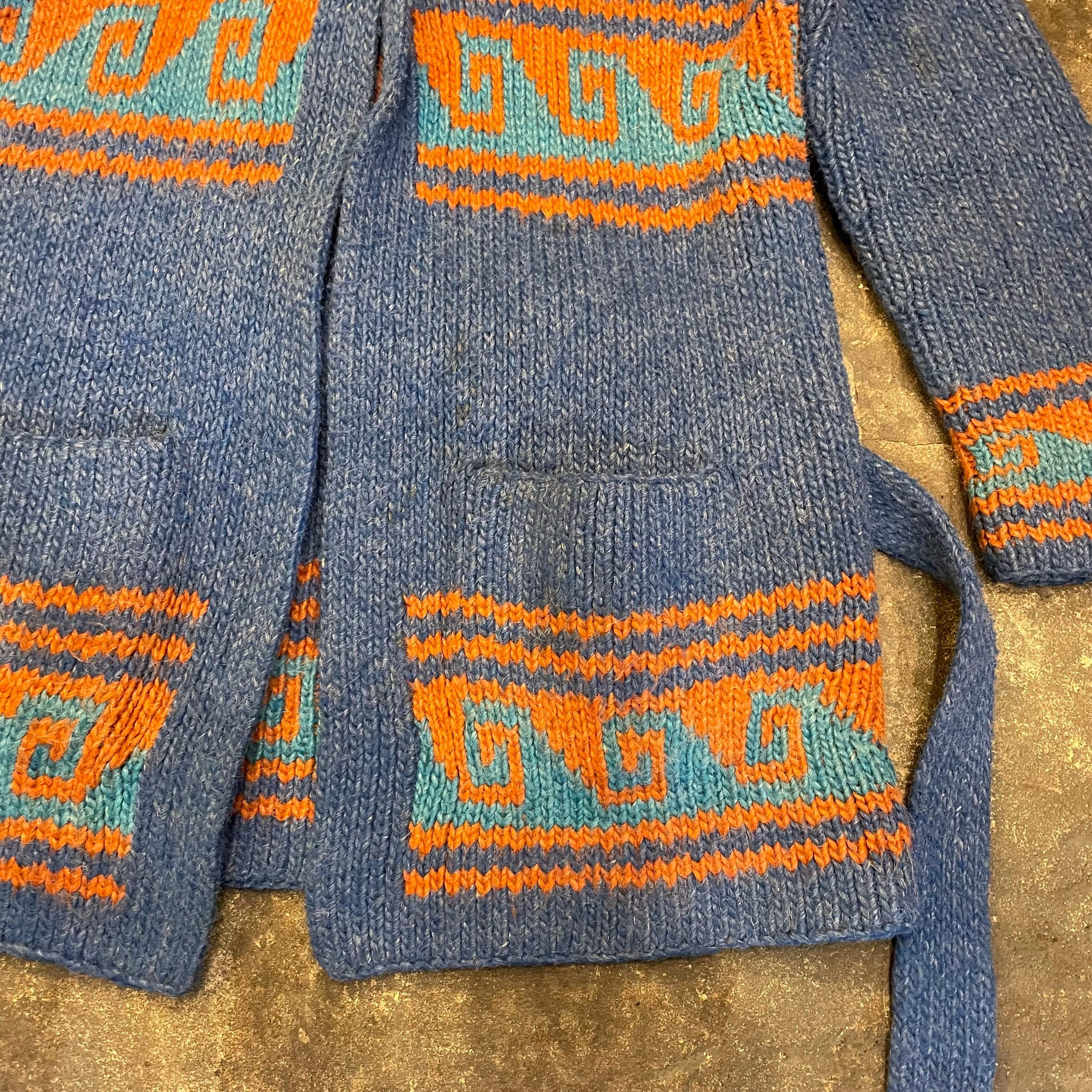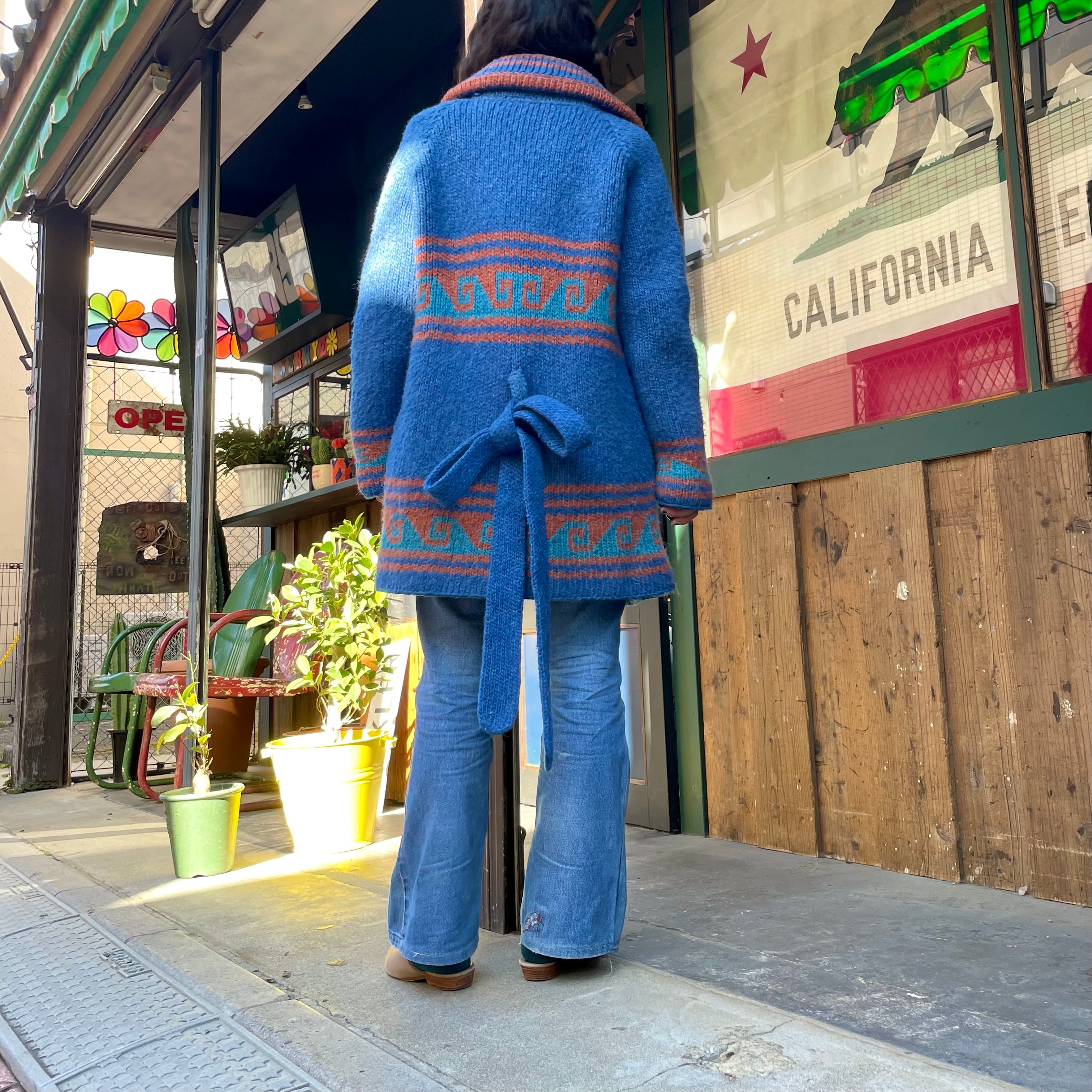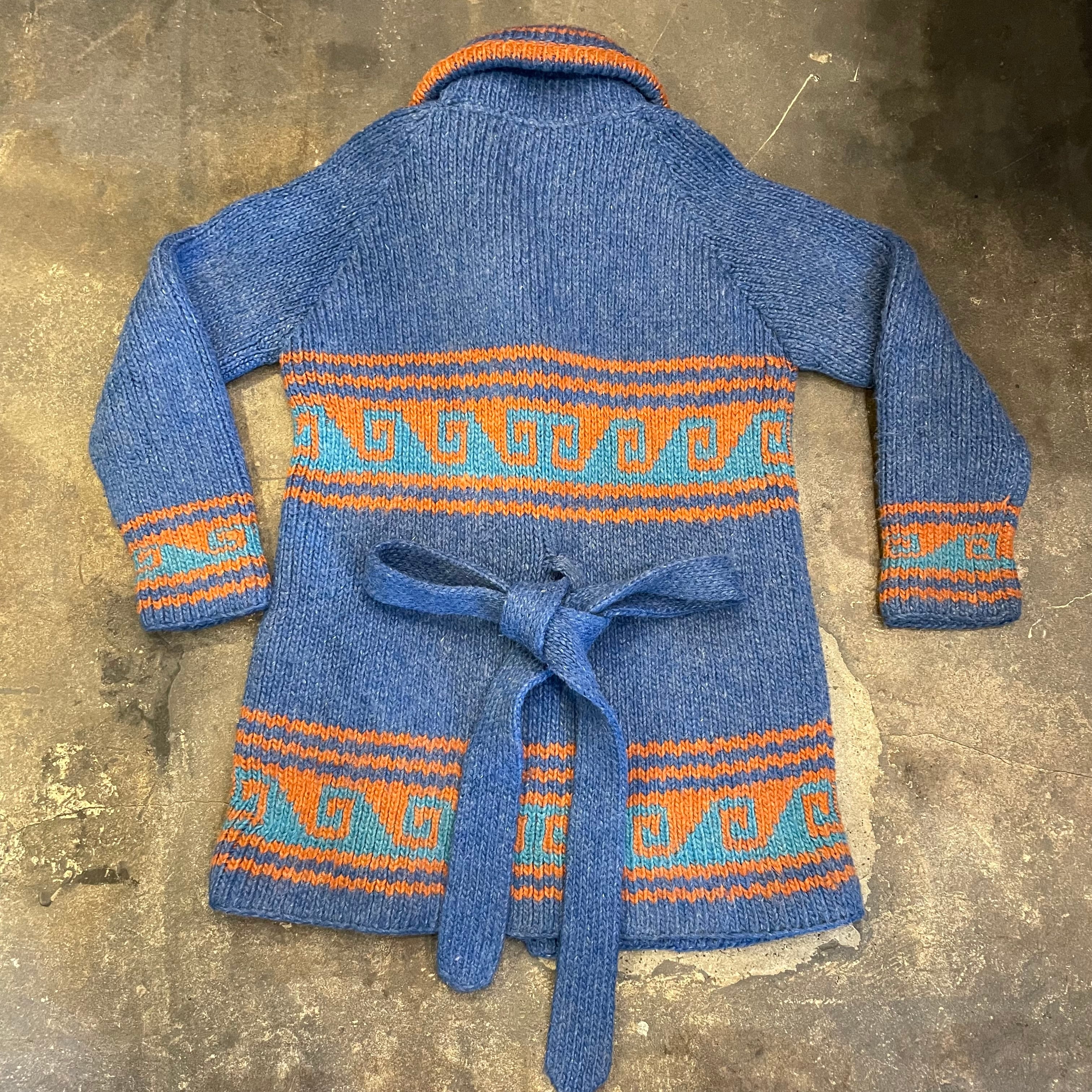 生産国は不明ですが、エクアドルニットによくある波のような模様がかわいいですね。海辺を連想させるような雰囲気を持っていて、早朝にこのガウンを羽織ってホットコーヒーを片手に砂浜を散歩したいような一着です。
