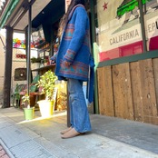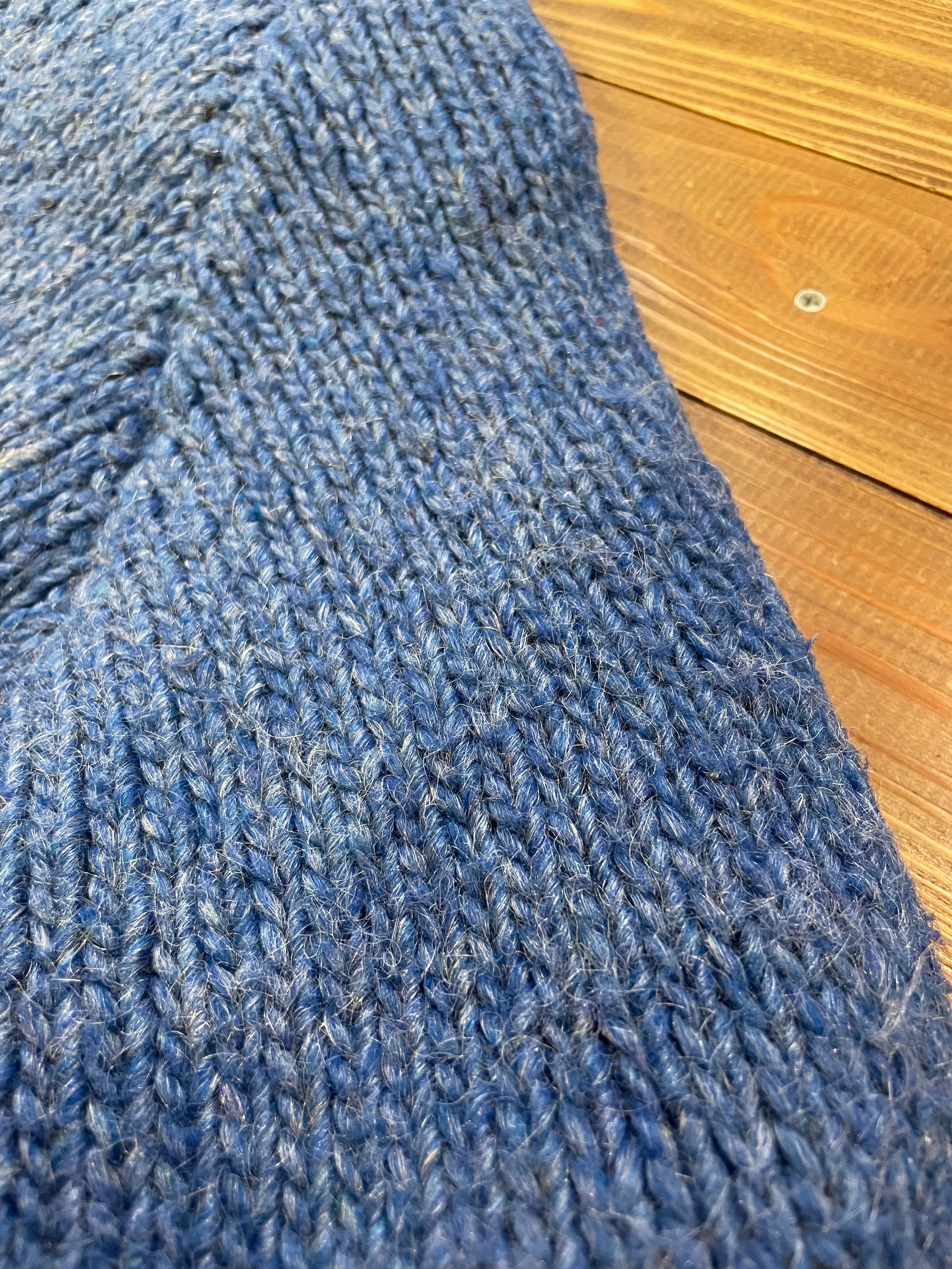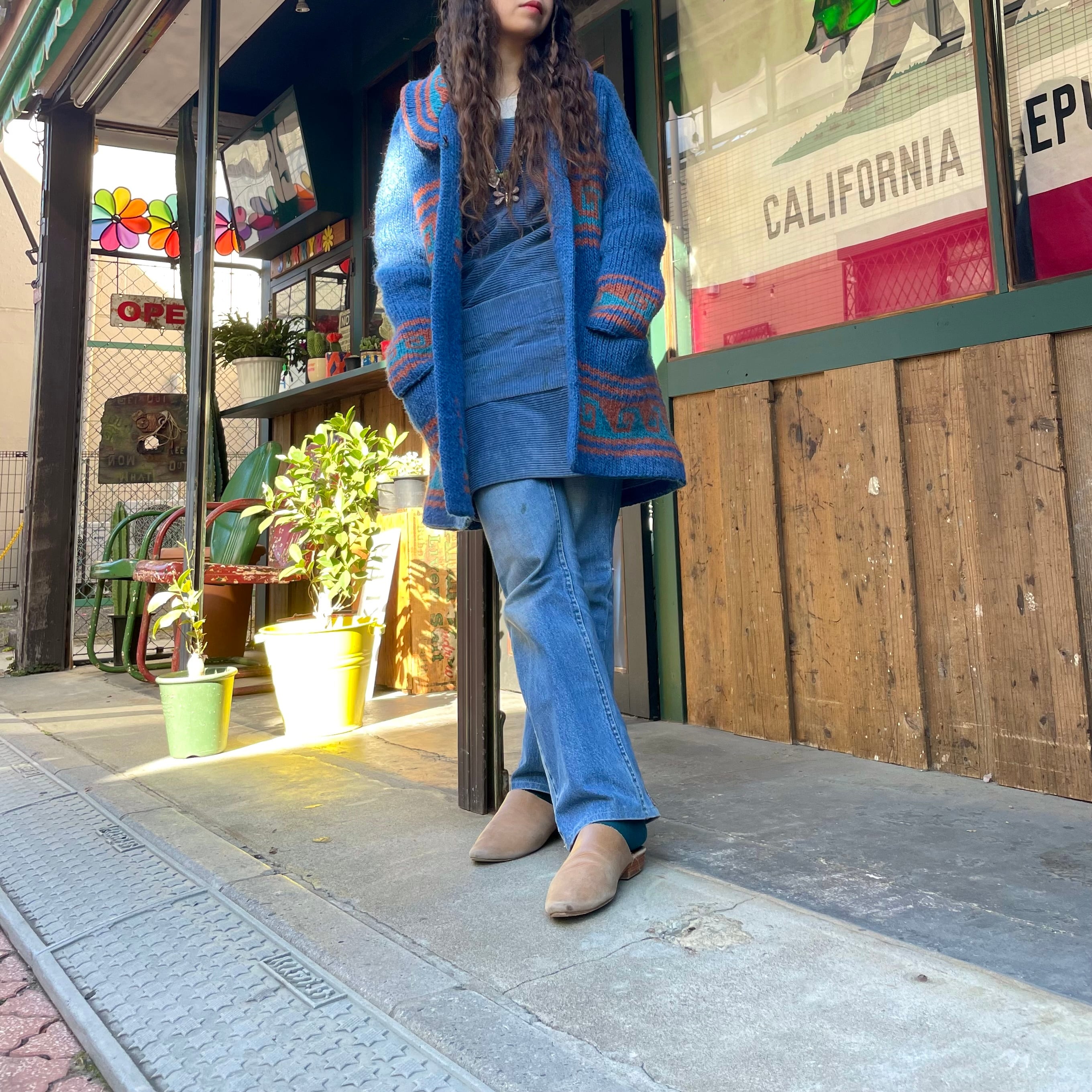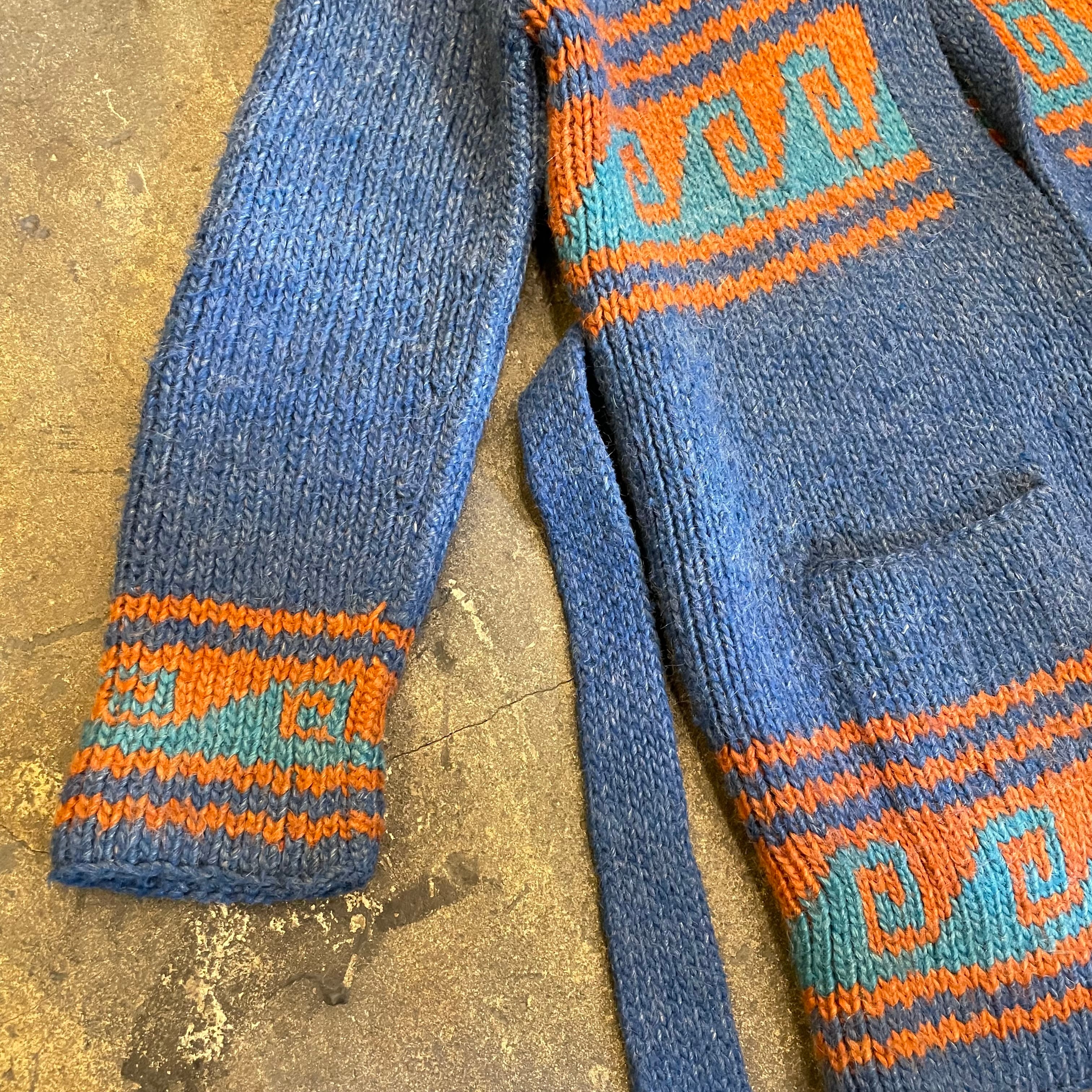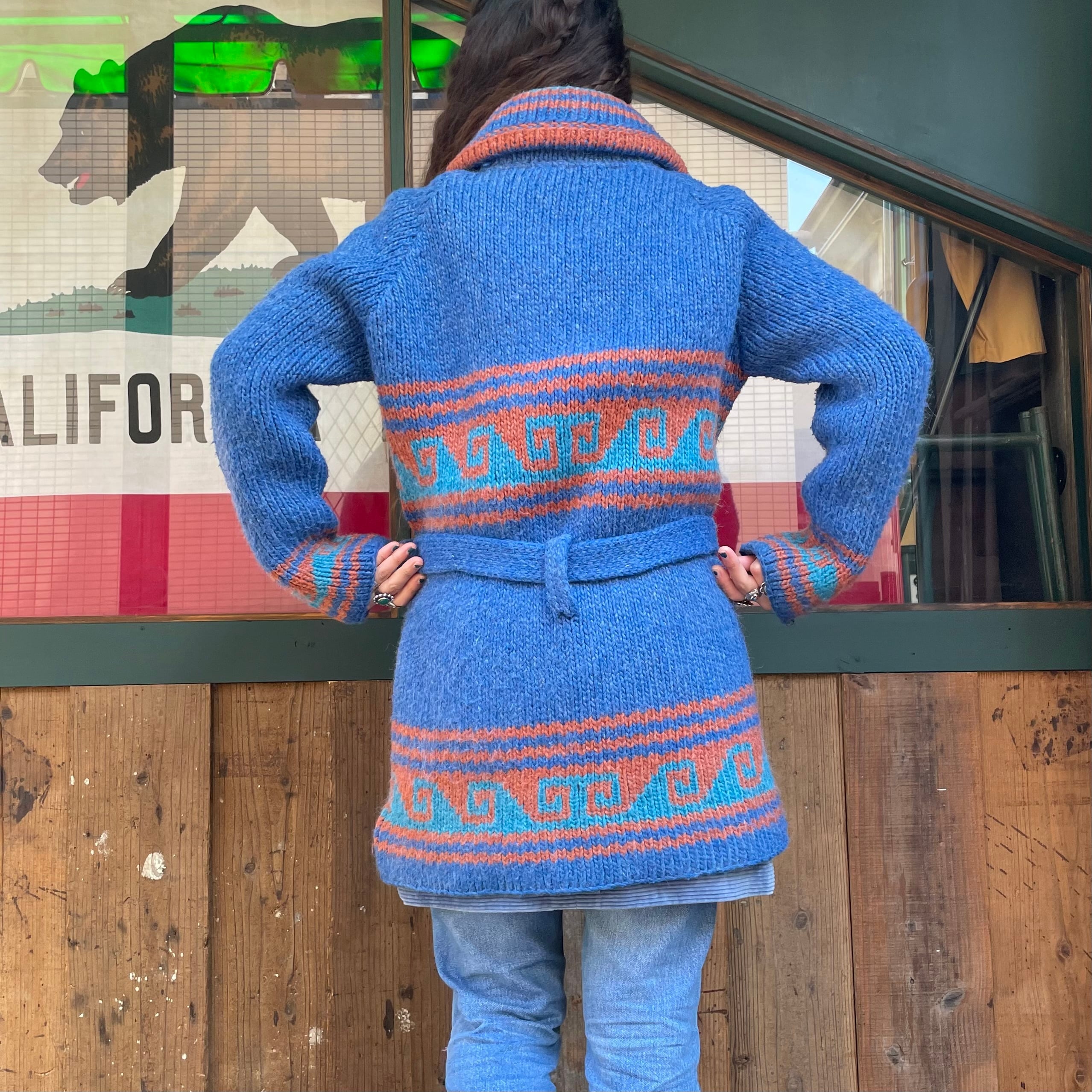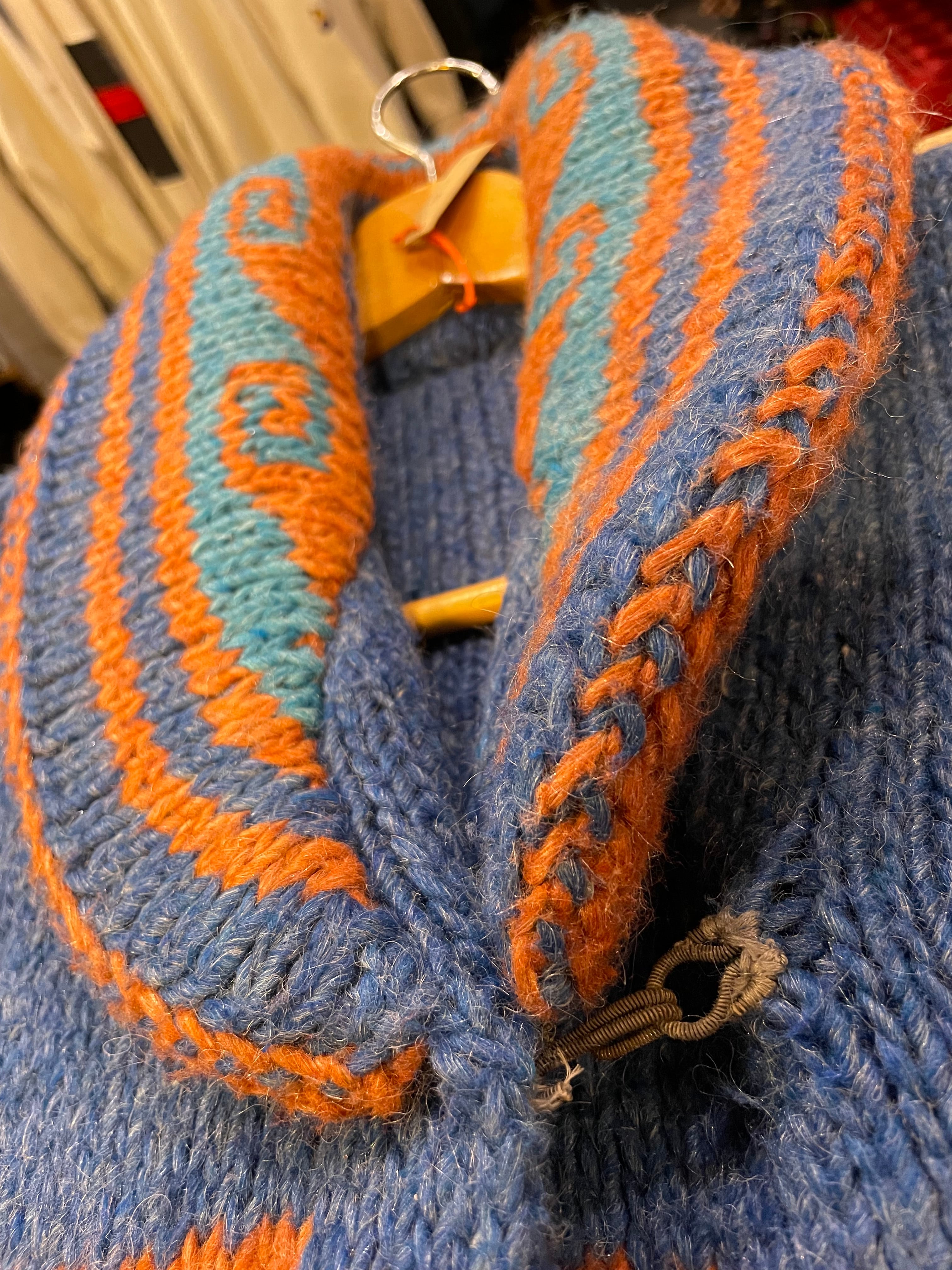 生産国は不明ですが、エクアドルニットによくある波のような模様がかわいいですね。海辺を連想させるような雰囲気を持っていて、早朝にこのガウンを羽織ってホットコーヒーを片手に砂浜を散歩したいような一着です。