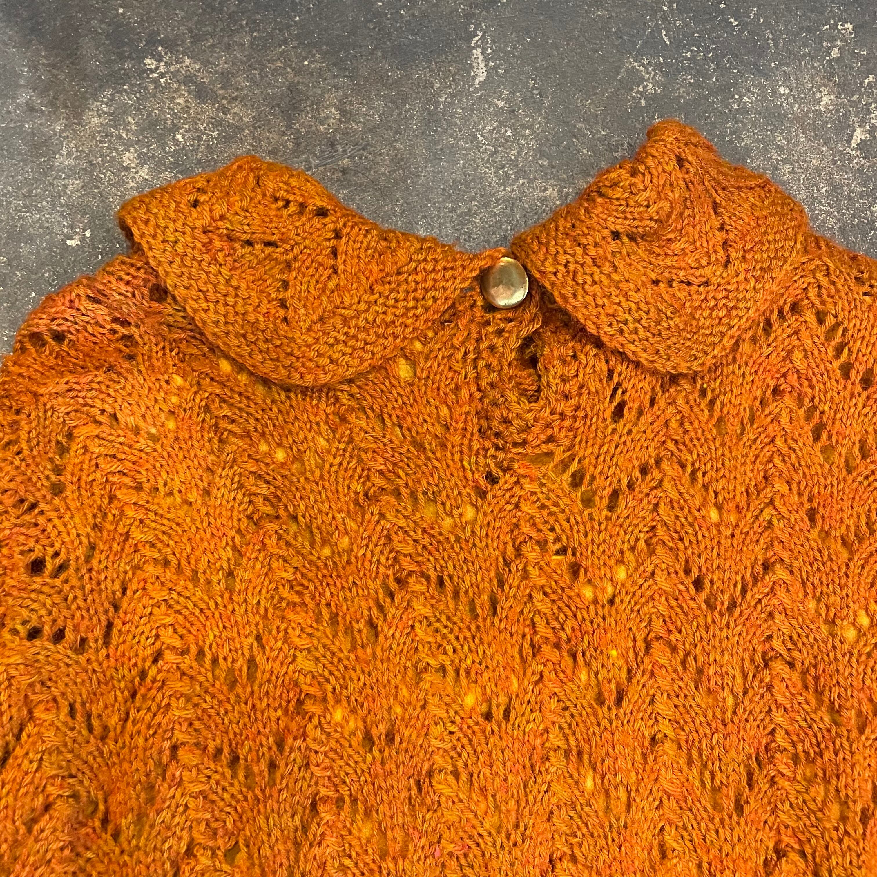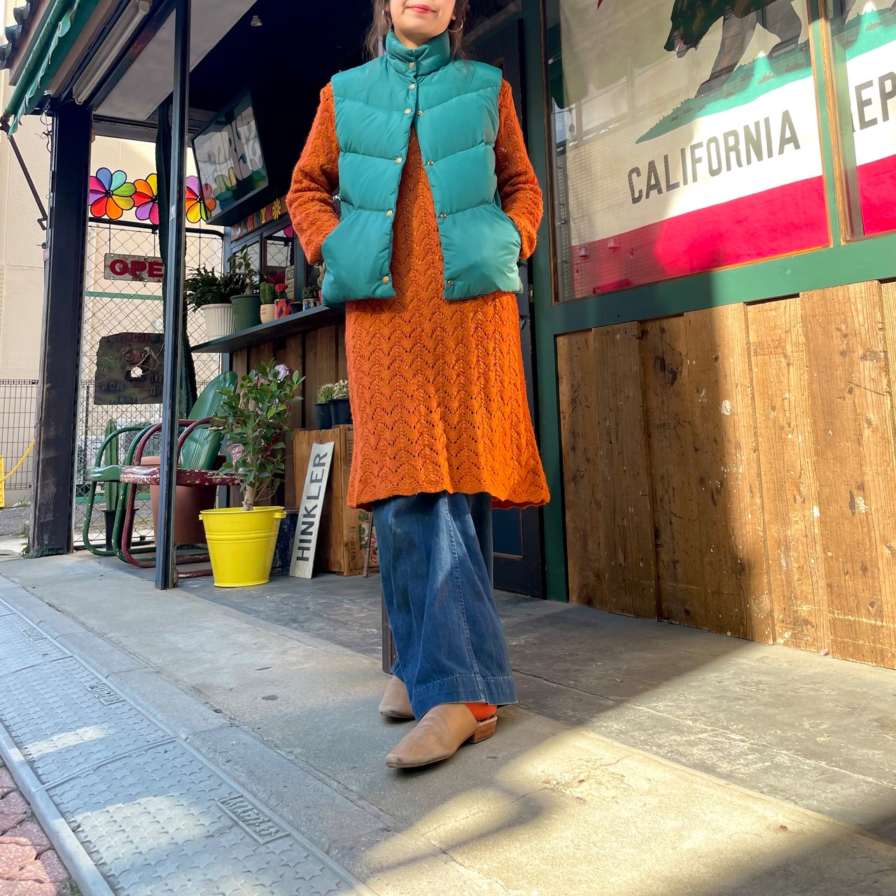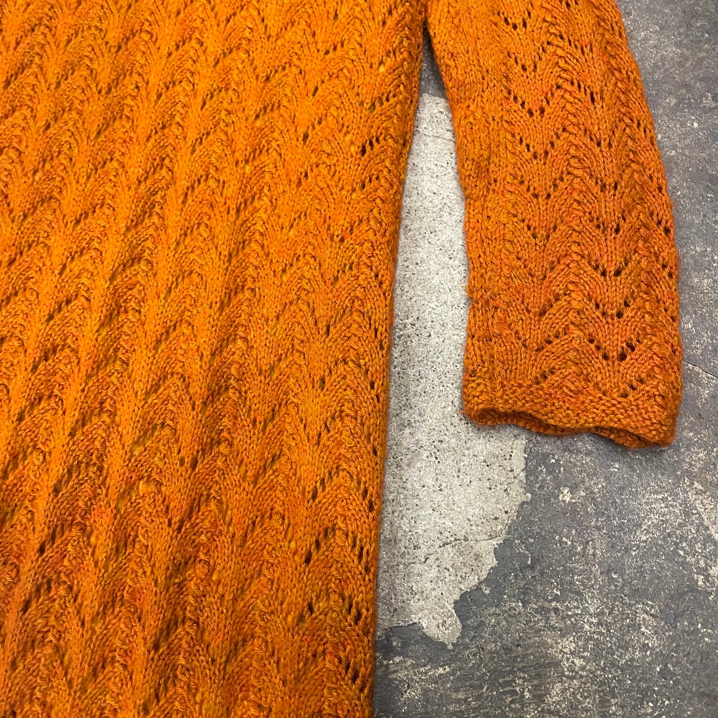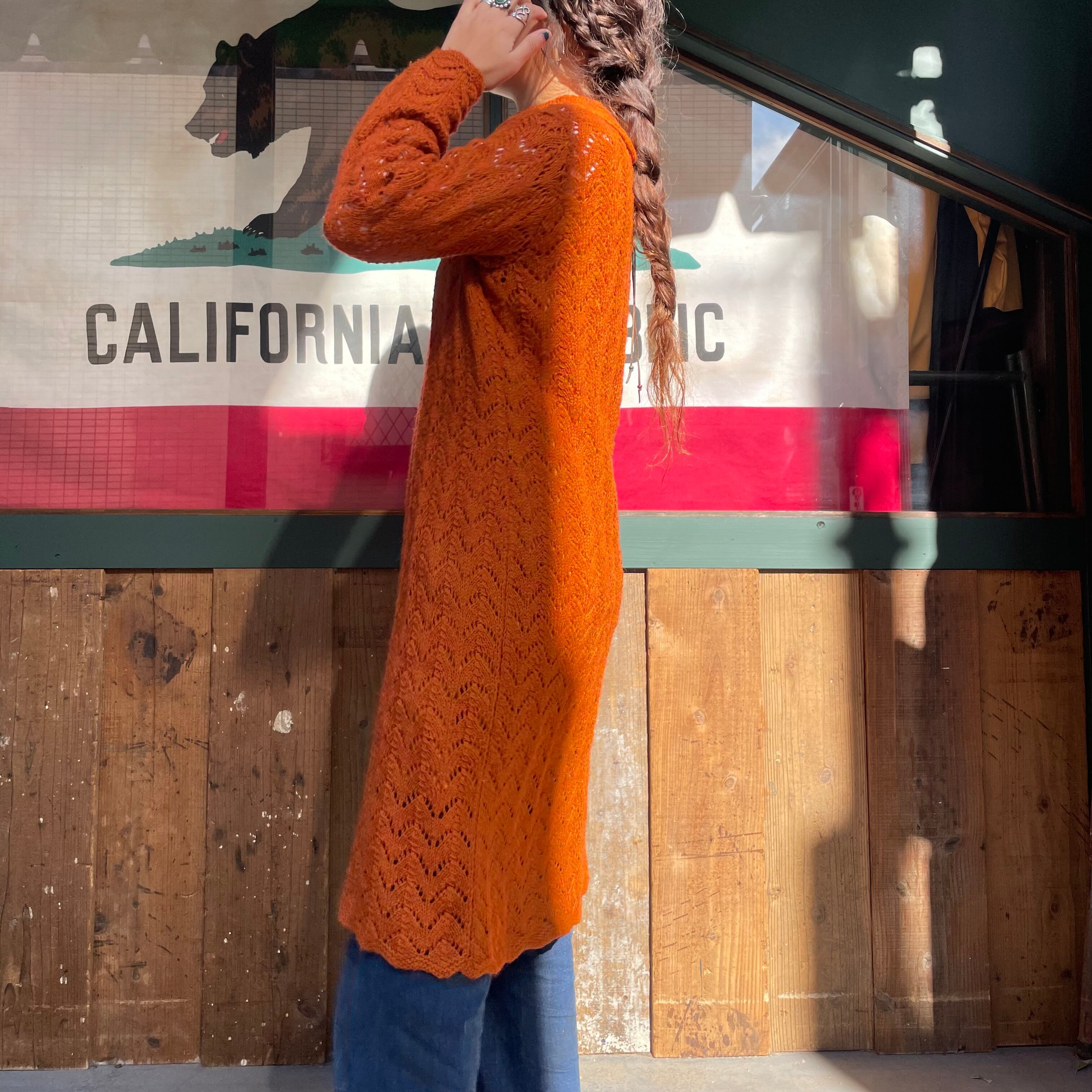 オレンジみのある茶色の透かし編みがかわいいワンピースです。