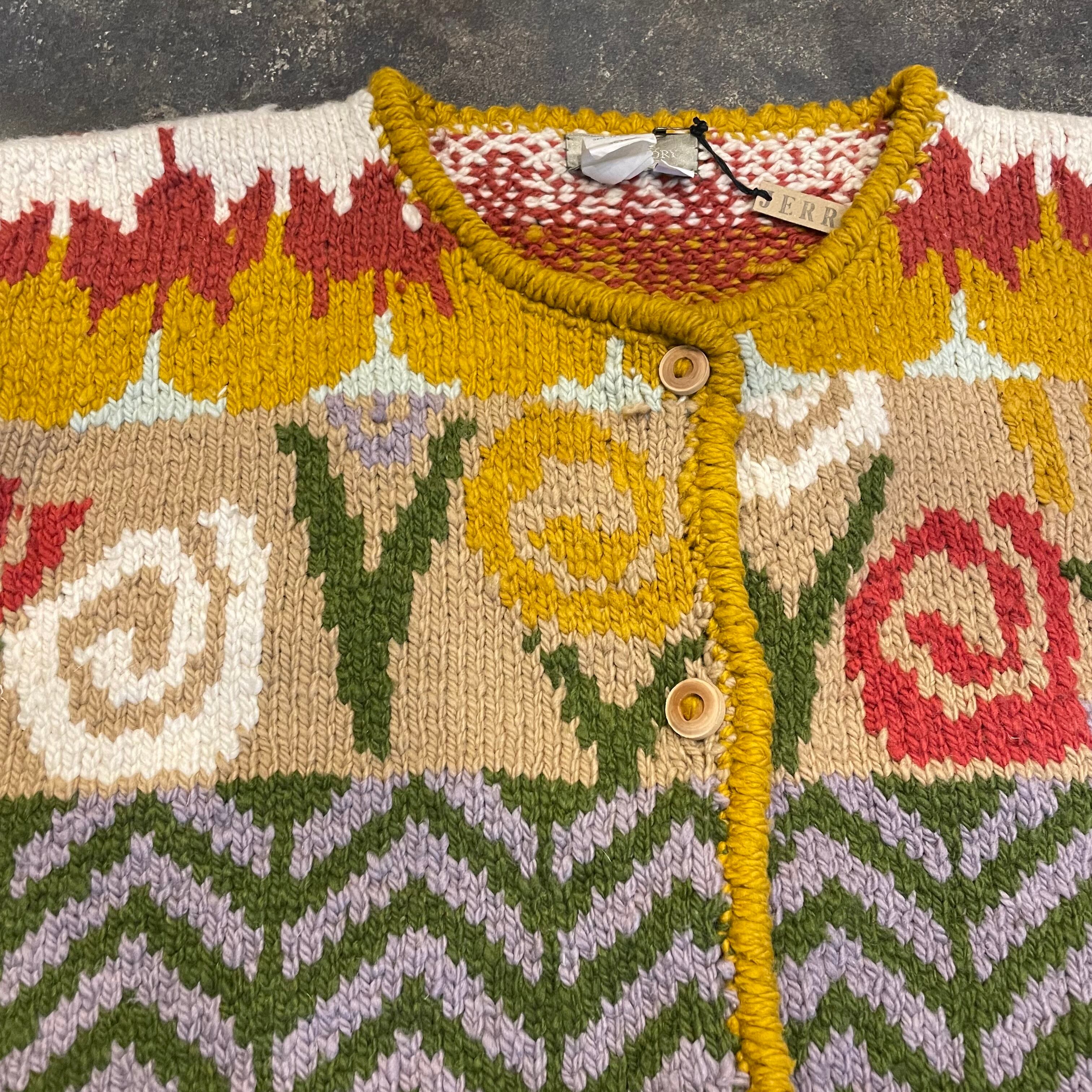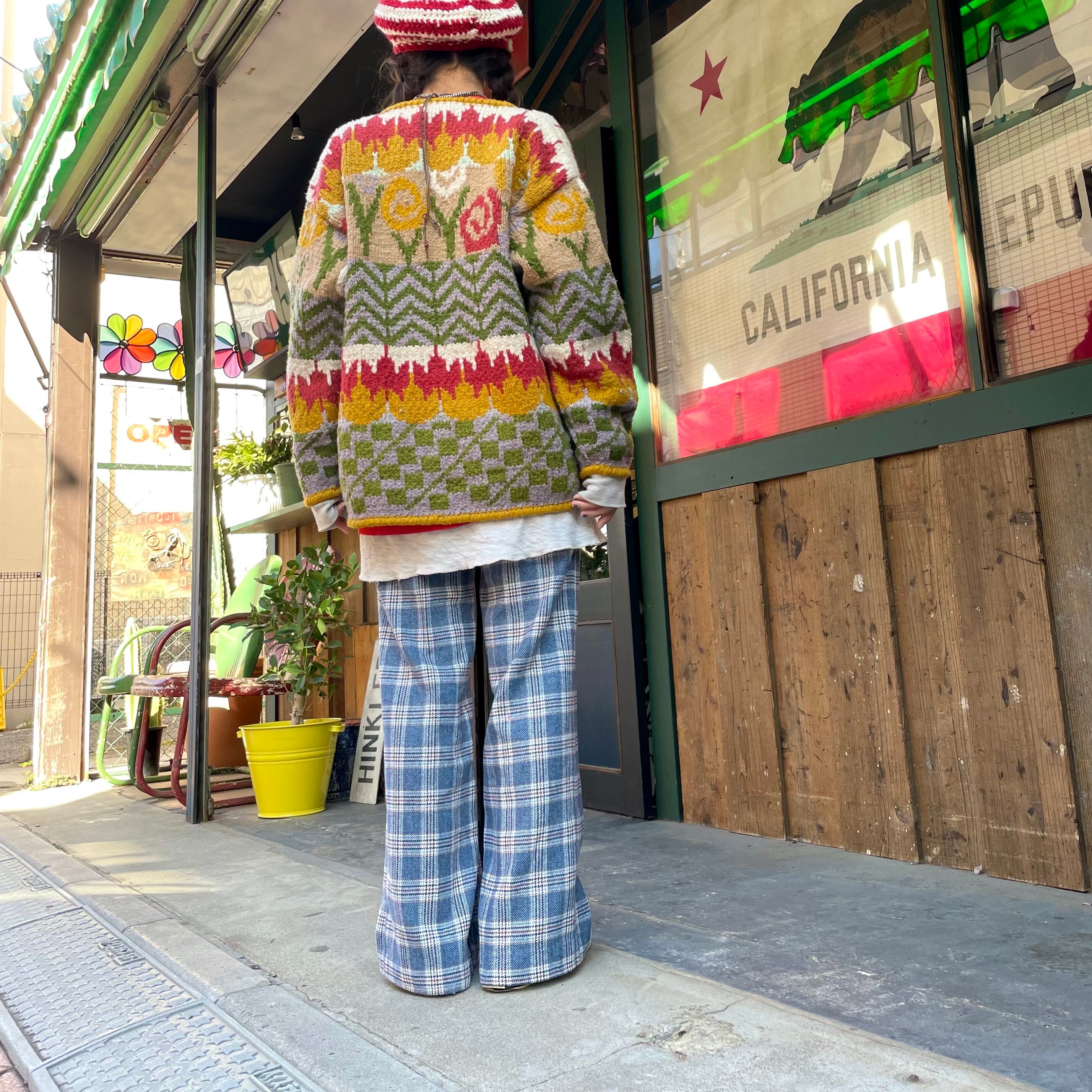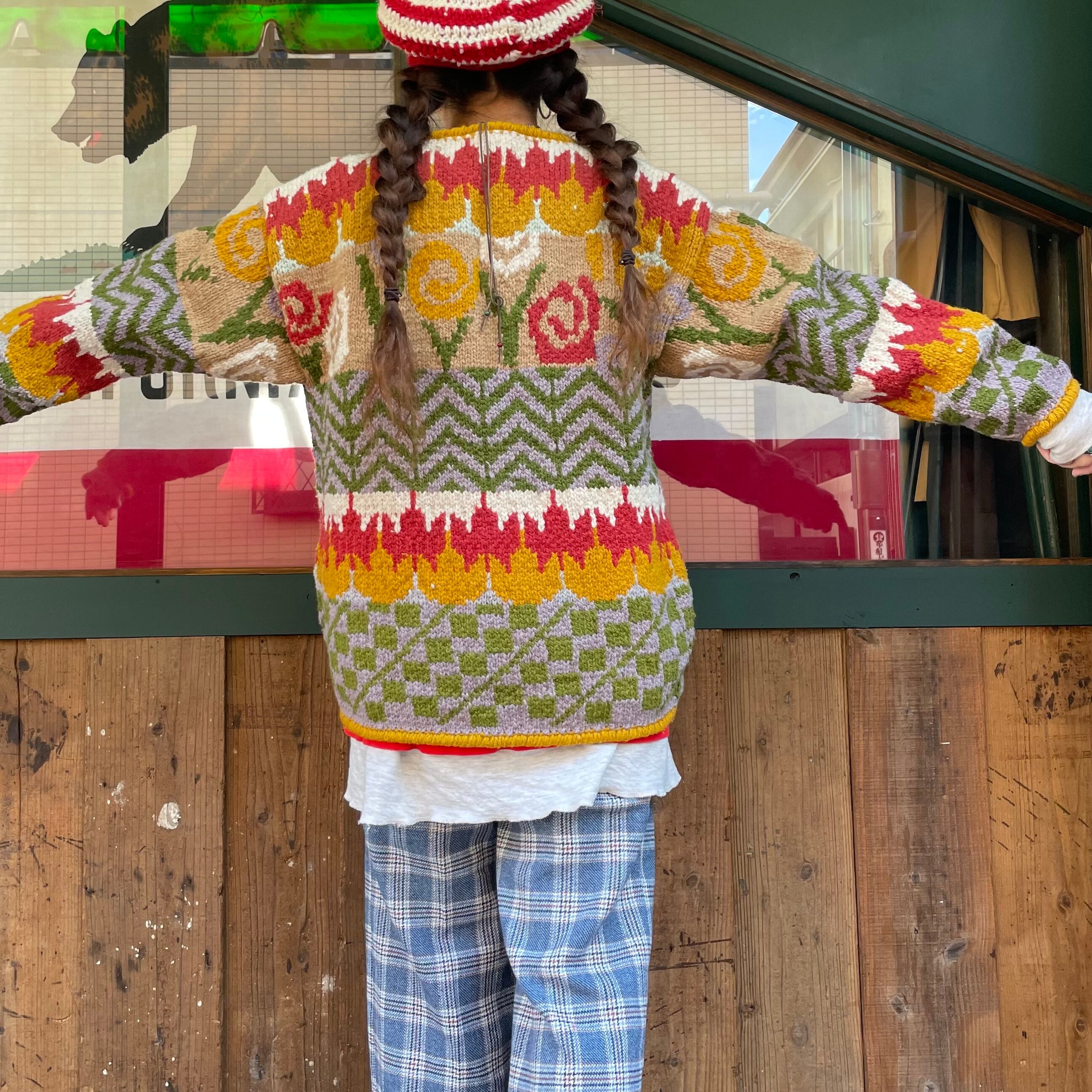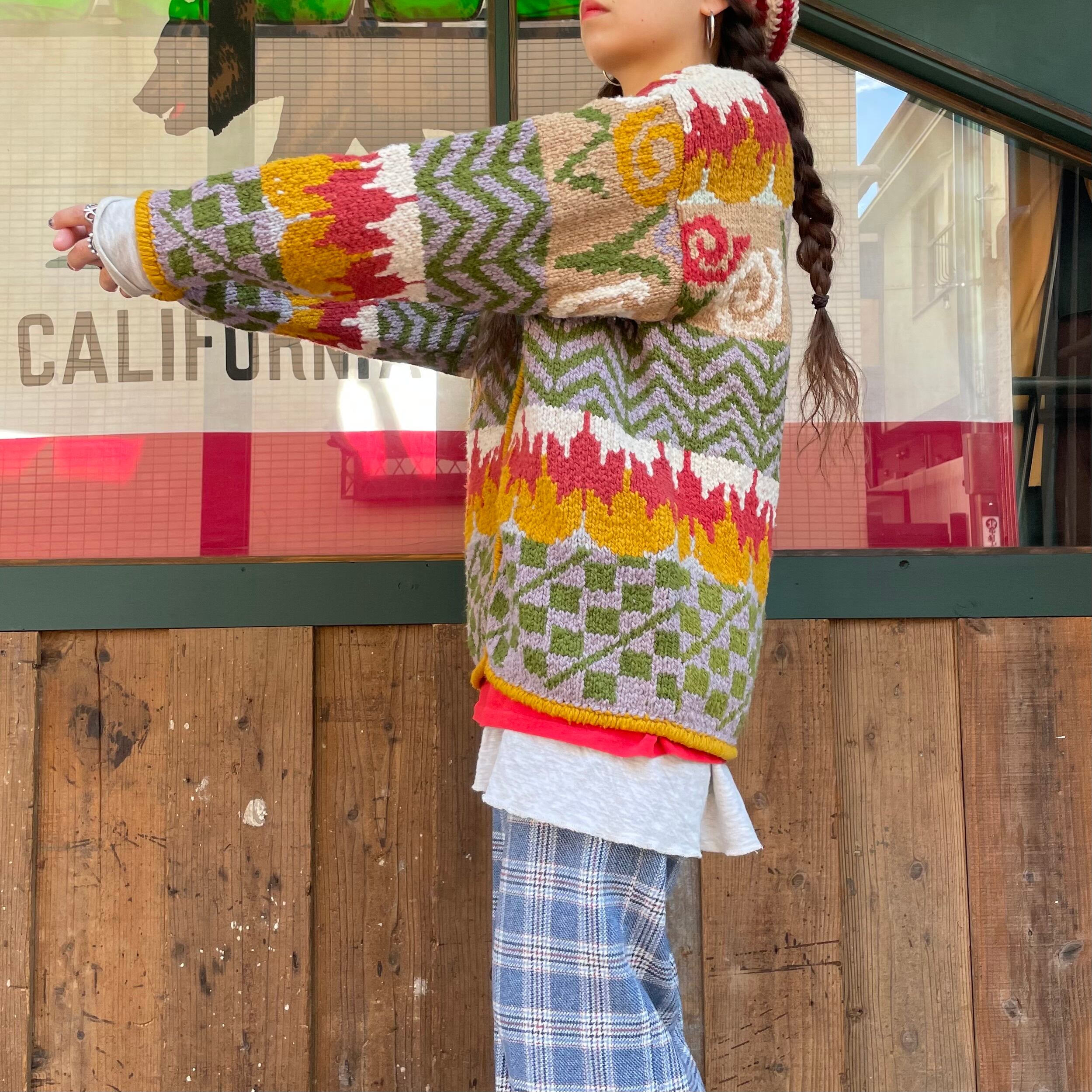 落ち着いた色のトーンですが柄は激しめでかわいいカーディガンです。