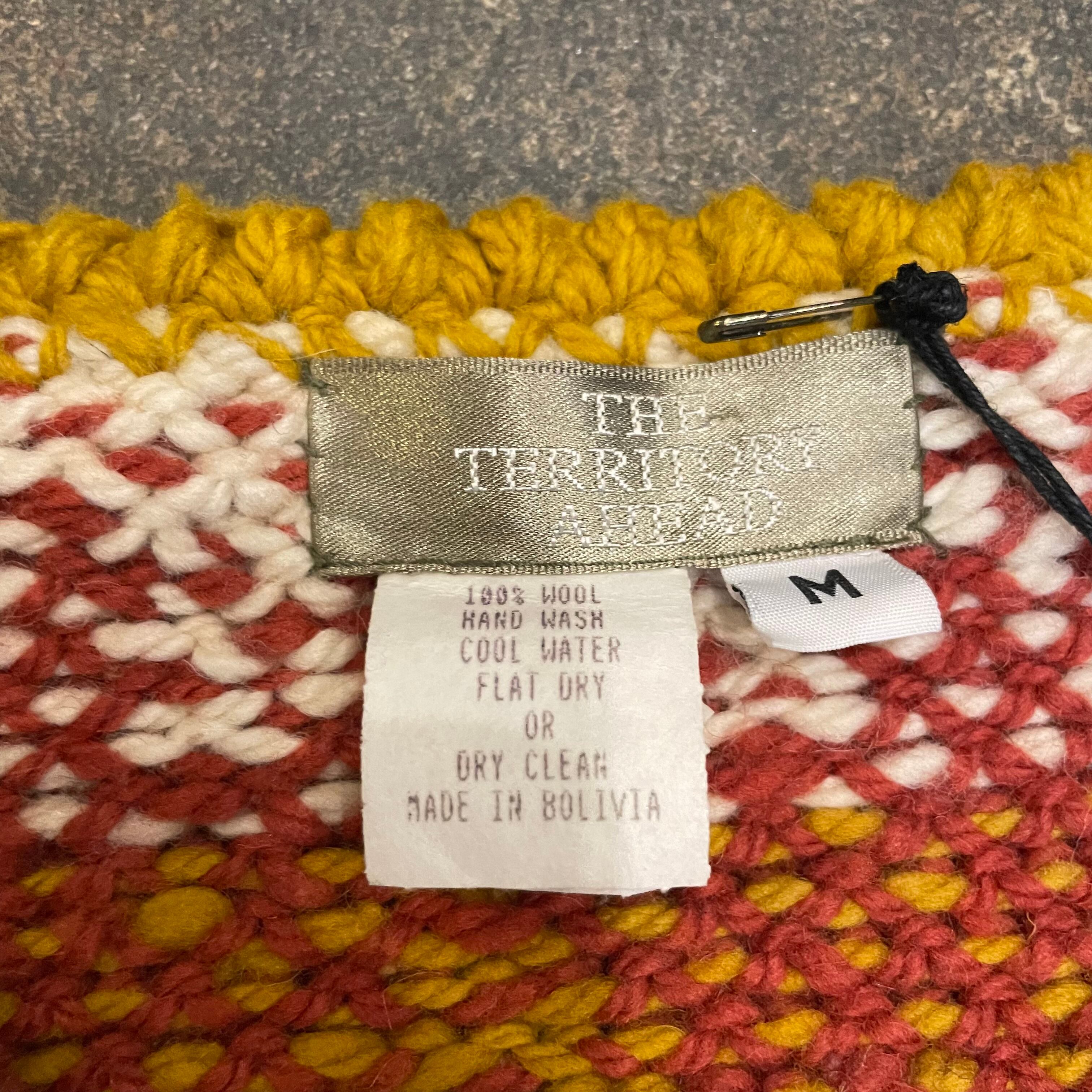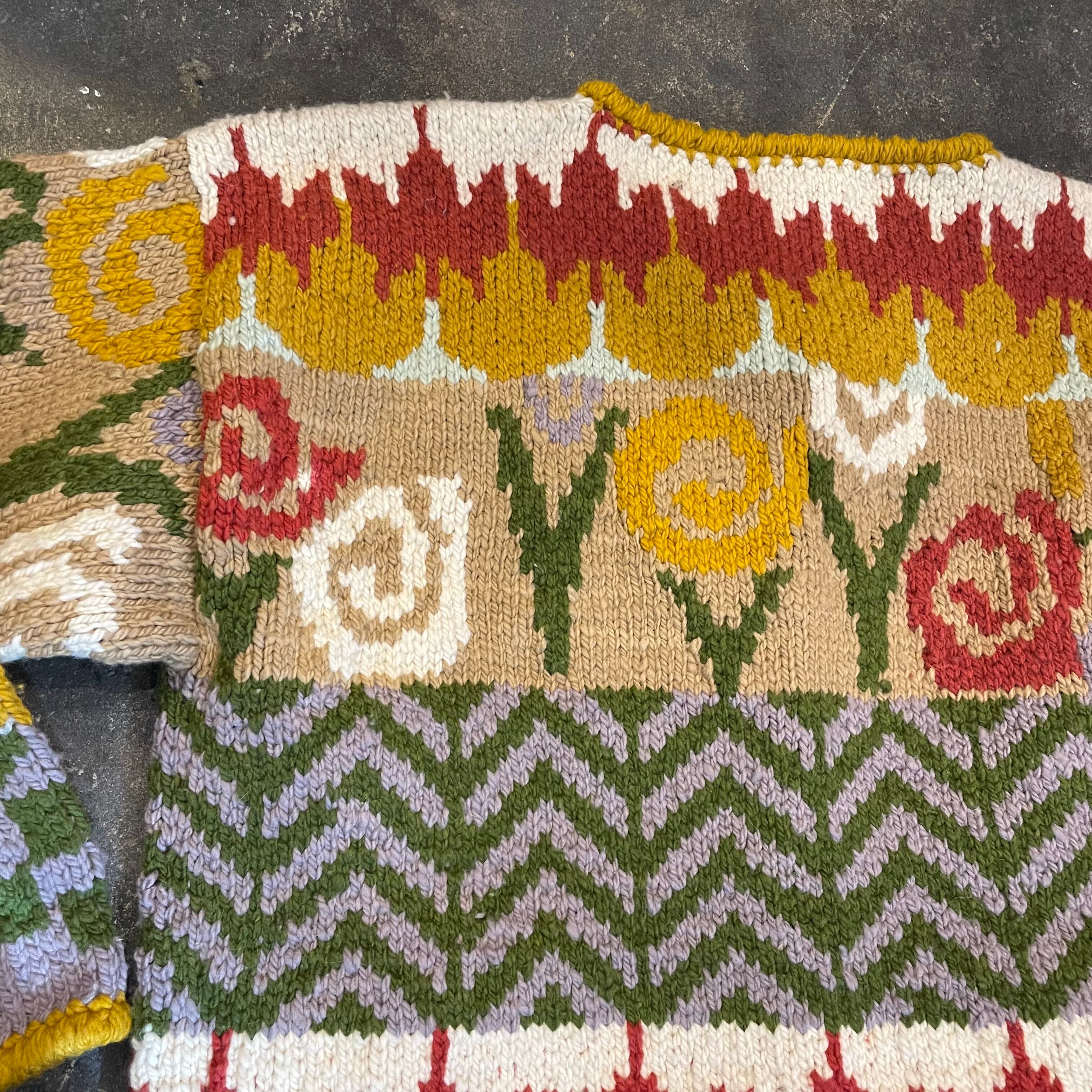 お花や葉っぱのようにも見えますが、何柄なのかはっきりしない感じも魅力的な一枚です。しっかり肉厚な編み地で冬でも昼間ならアウター代わりになるくらい暖かいです。