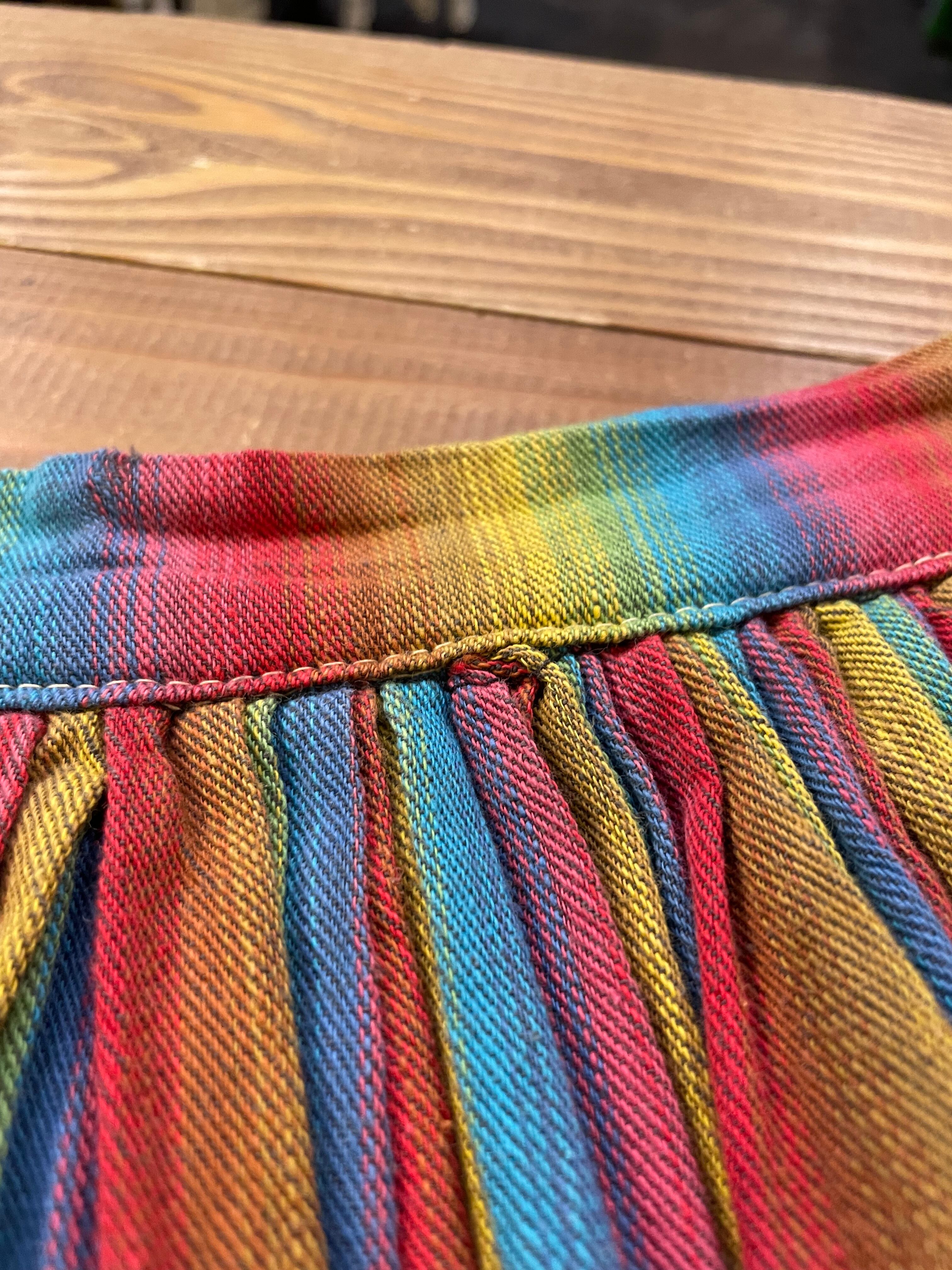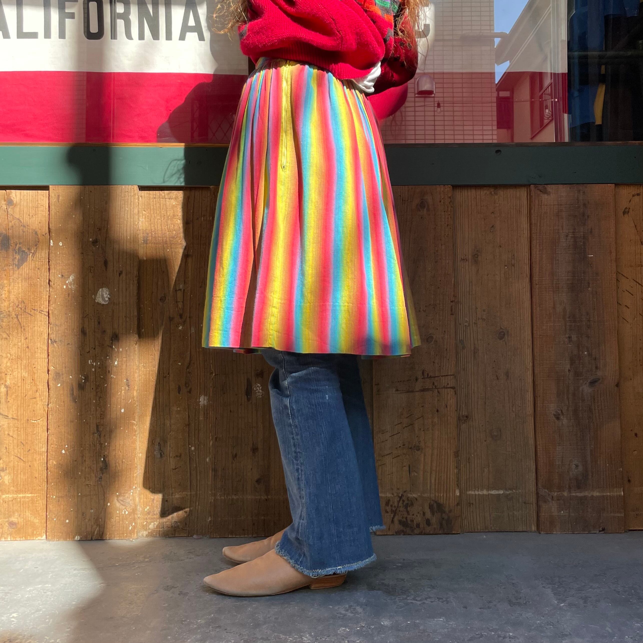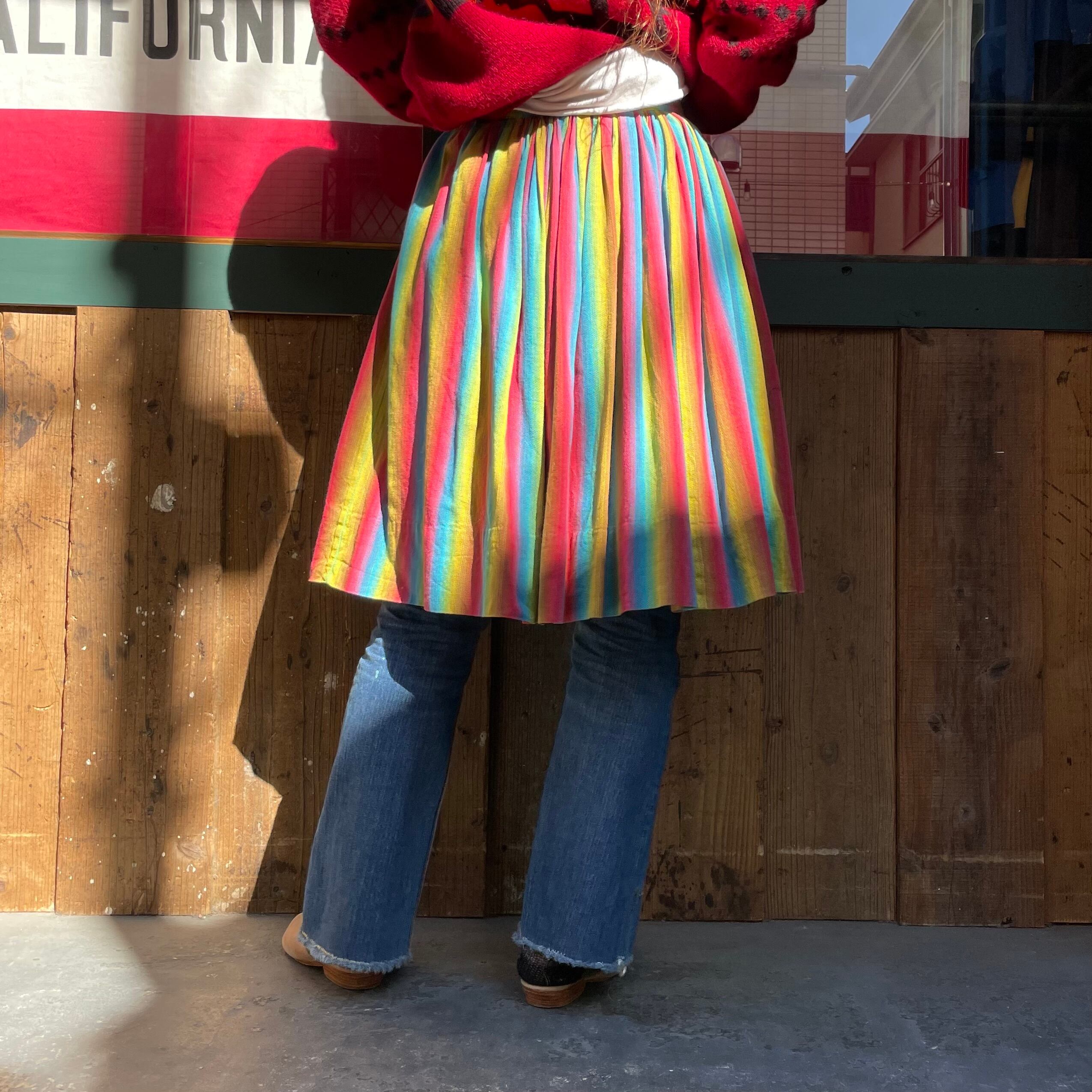 明るい色味のレインボーカラーがかわいいスカートです。程よく広がるギャザーフレアのシルエットも良い感じですね。