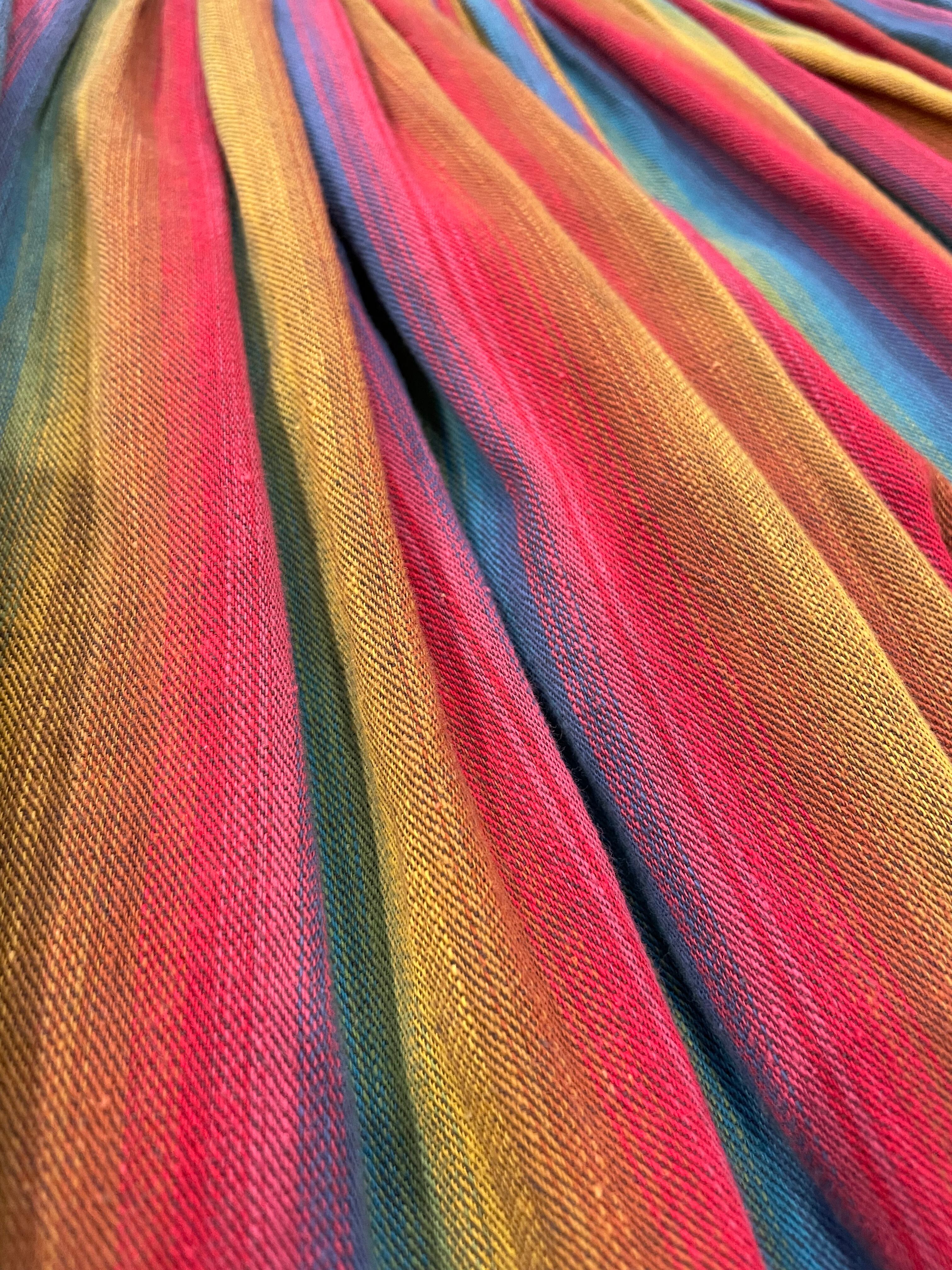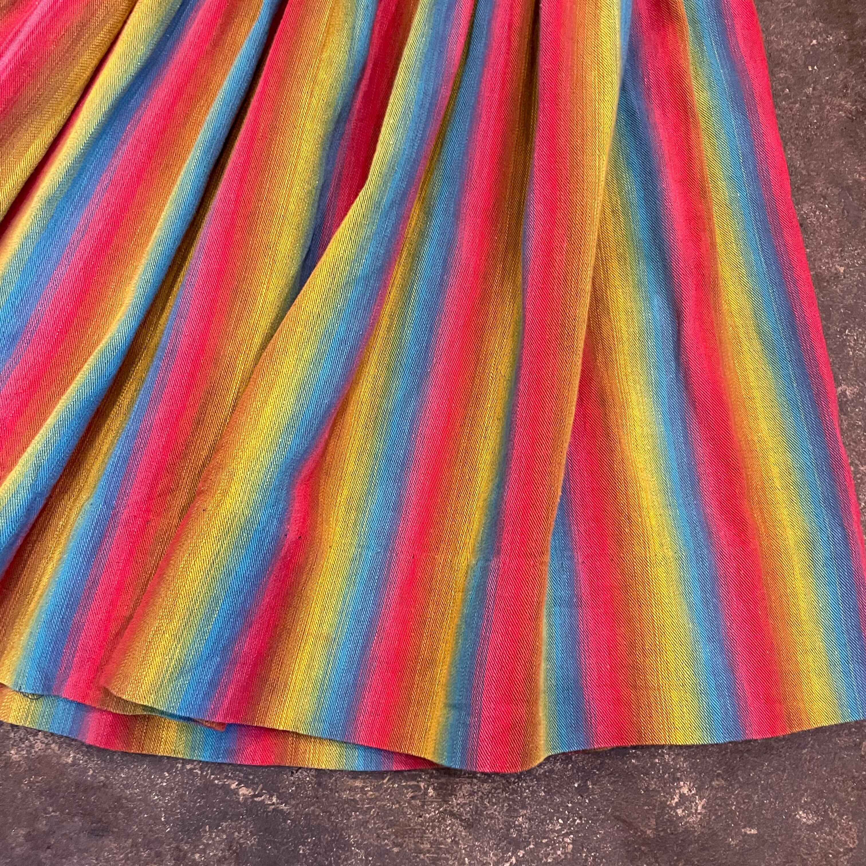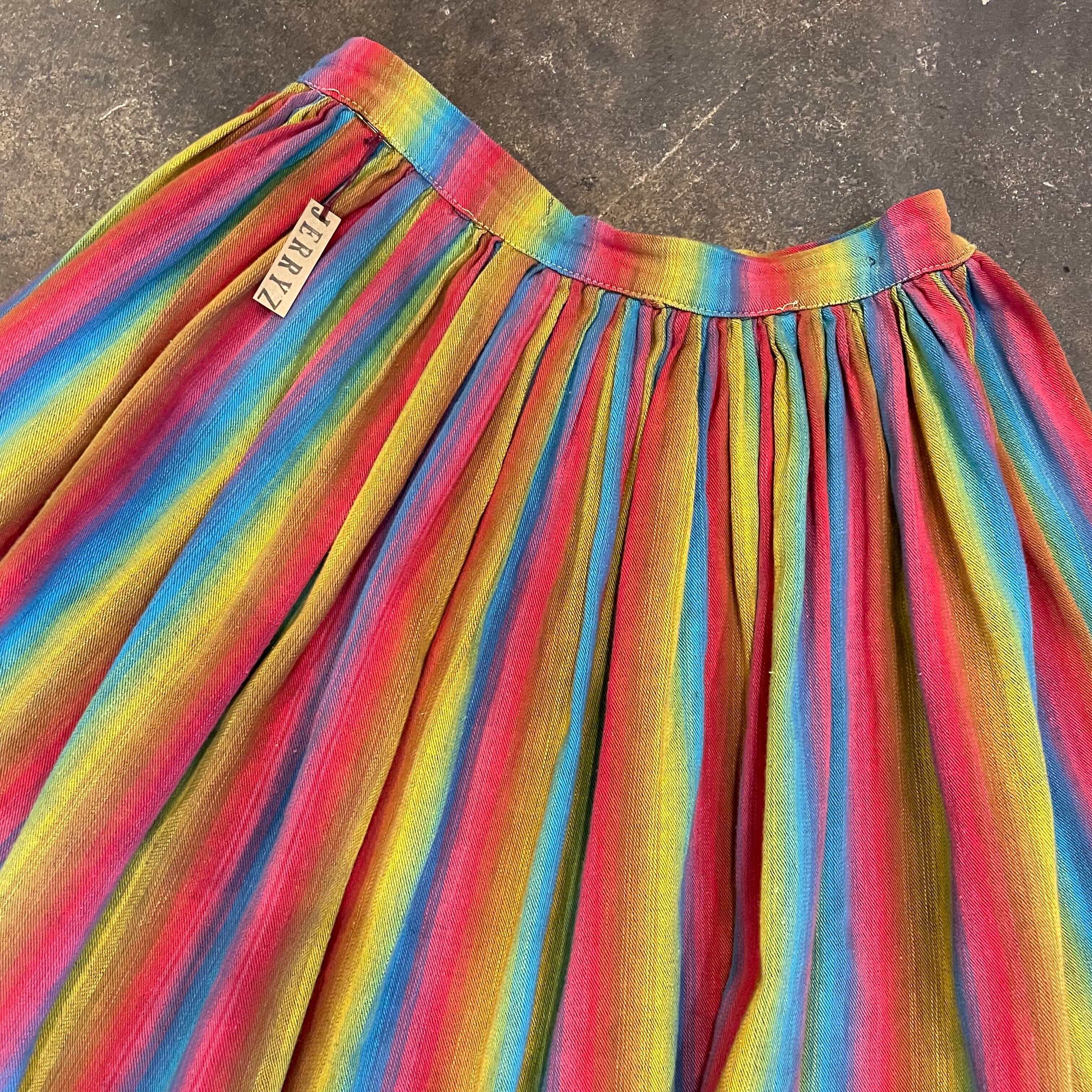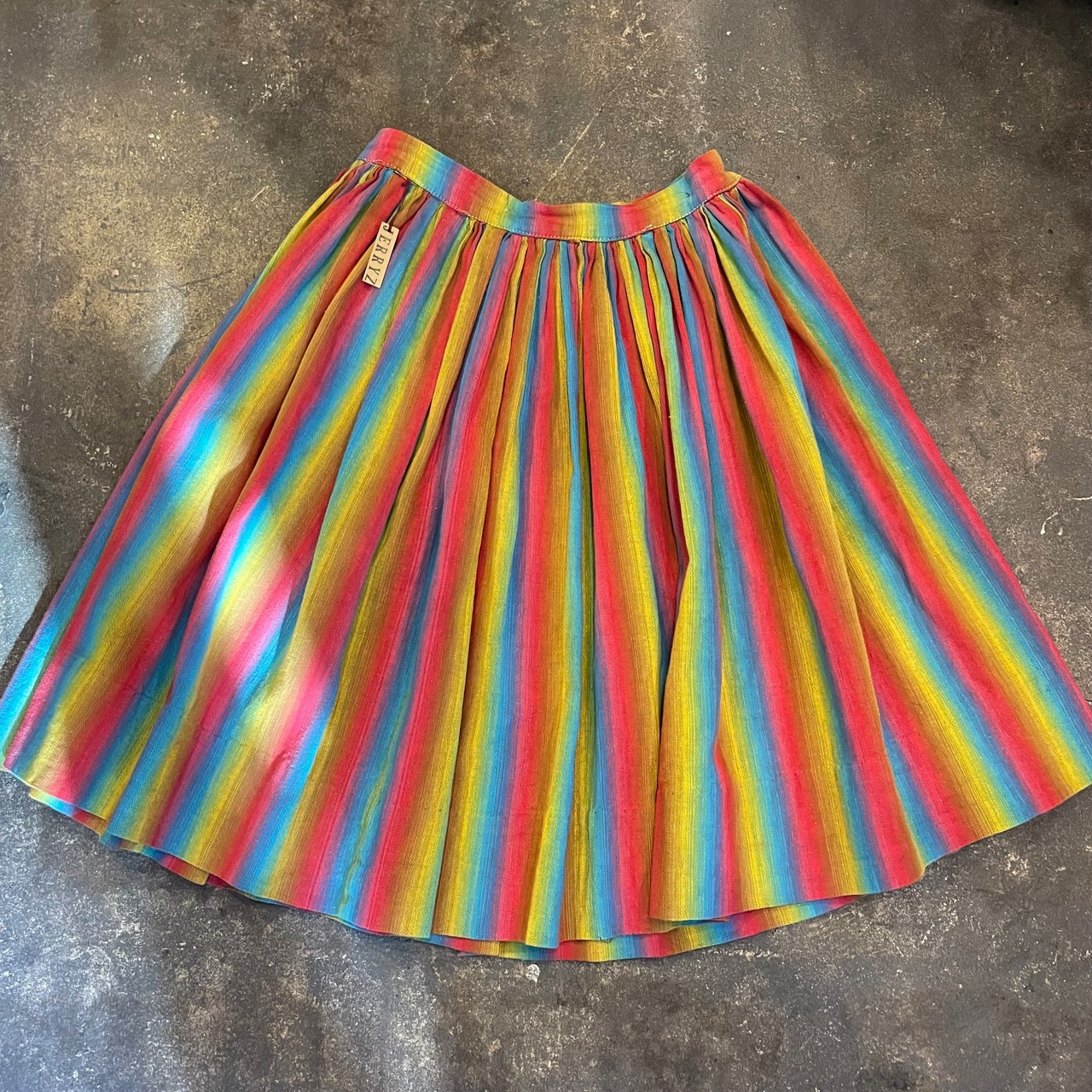 明るい色味のレインボーカラーがかわいいスカートです。程よく広がるギャザーフレアのシルエットも良い感じですね。