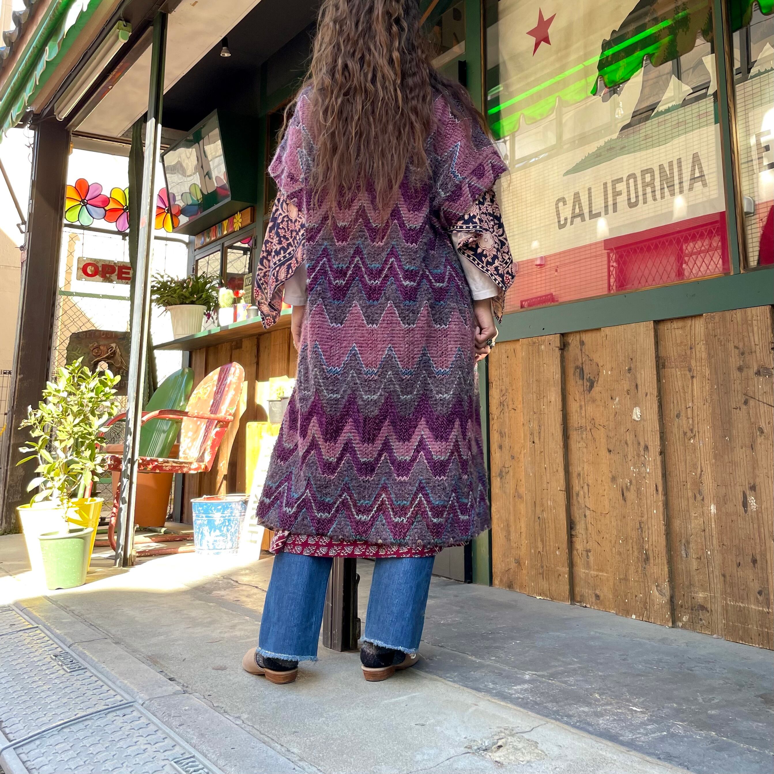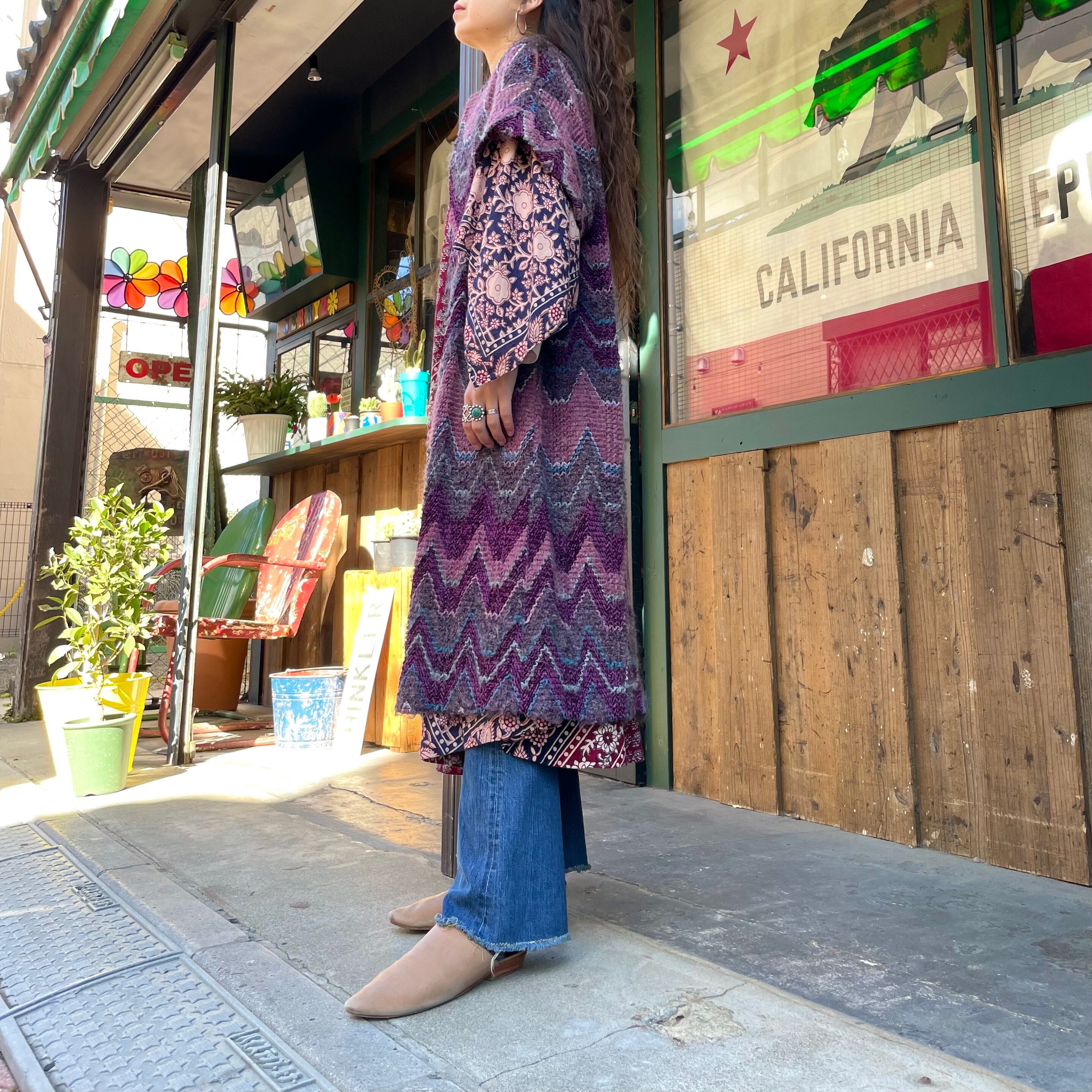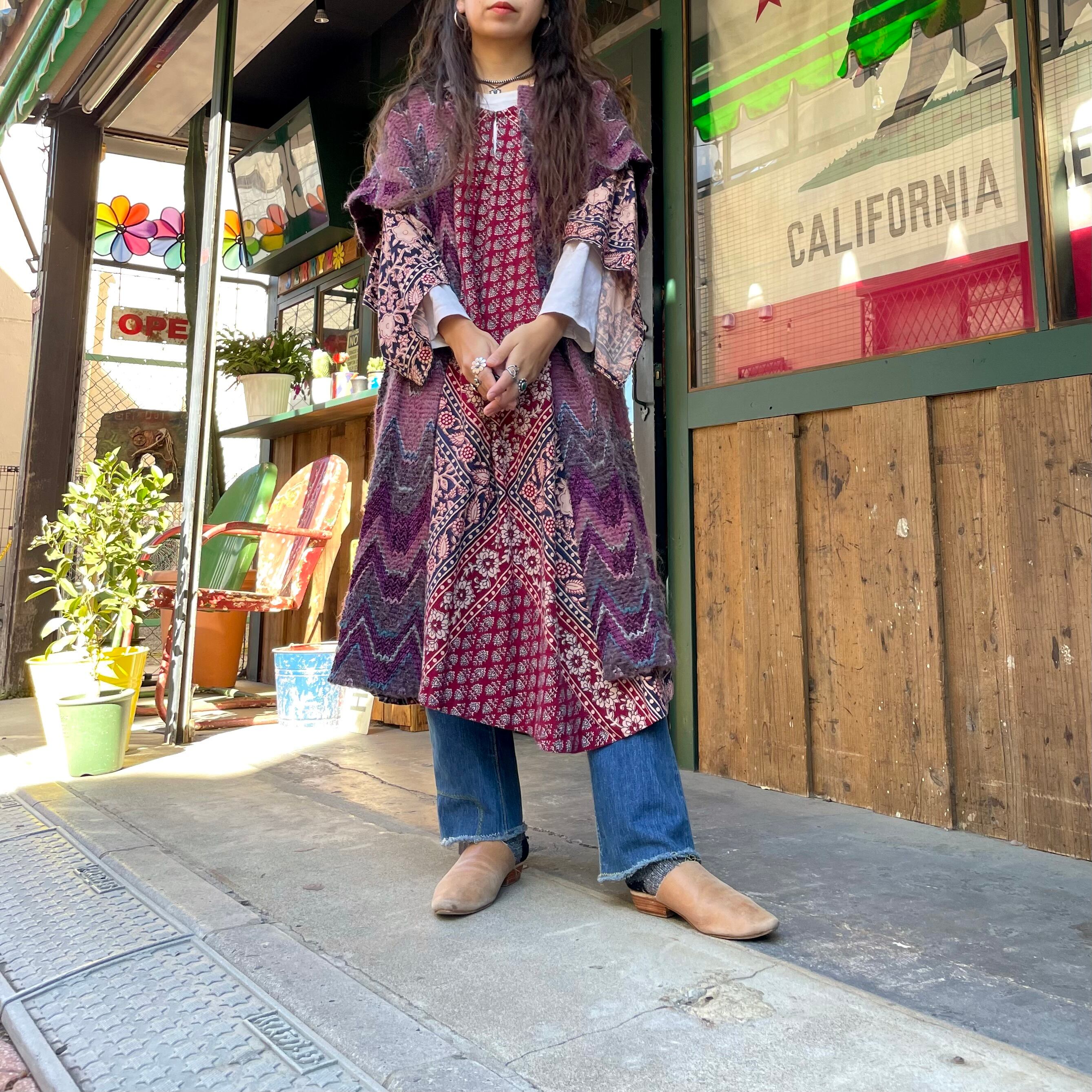 いろんな毛糸が使われていていろんな表情があり素敵な一枚です。長袖のワンピースと合わせるのはもちろん、ロンTやパーカーにジーパンなどラフなスタイルと合わせてもコーディネートをガラッと変えてくれそうですし、オーバーオールなどに合わせてもかわいいと思います。編んであるわけではなく、織り?のような感じですので伸縮性は無く、軽いです。