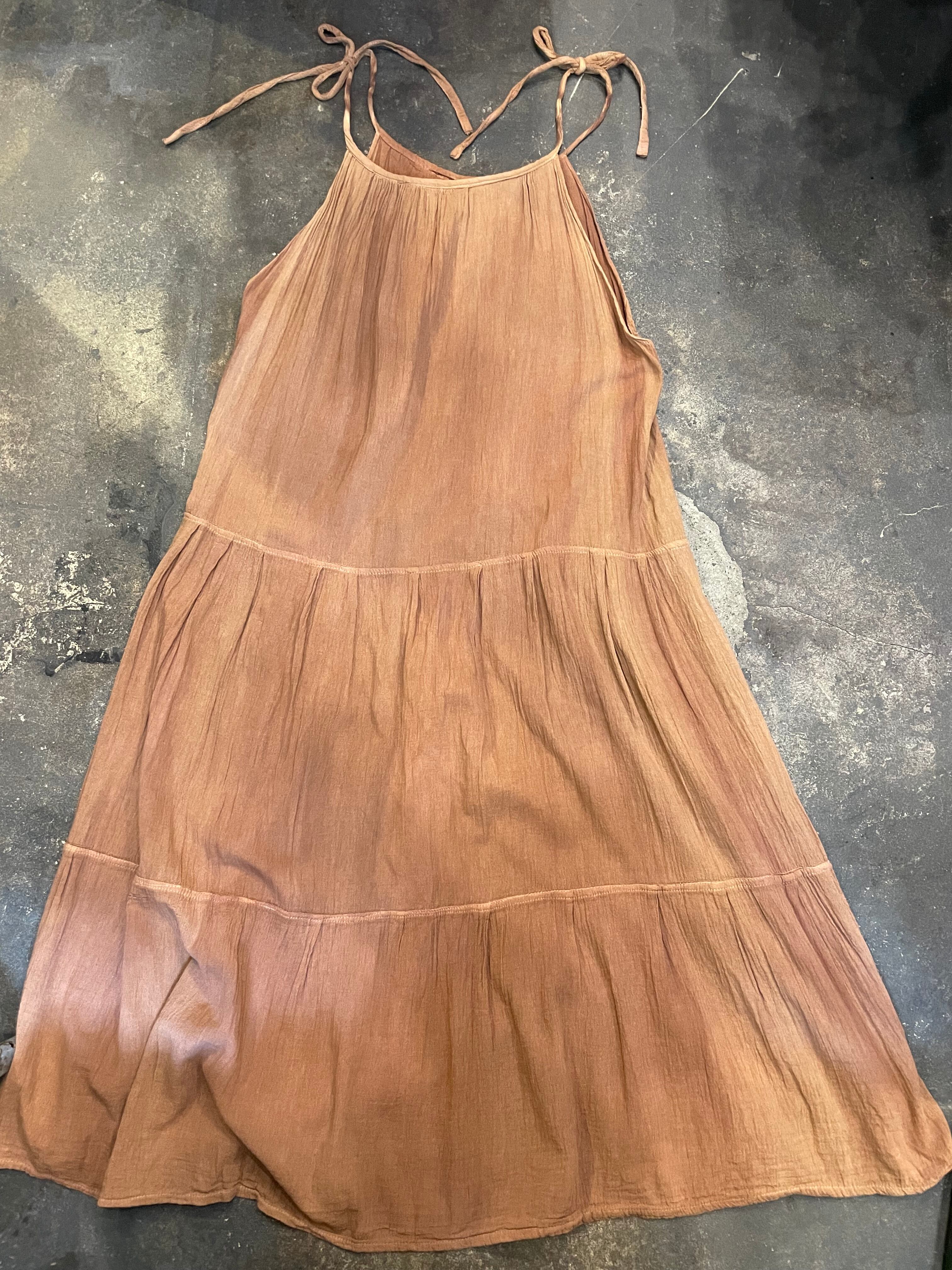 コットンガーゼのような少しざらっとした肌触りが気持ち良い素材で、茶色のむら染めのようになっていてナチュラルな雰囲気がとても良い感じです。