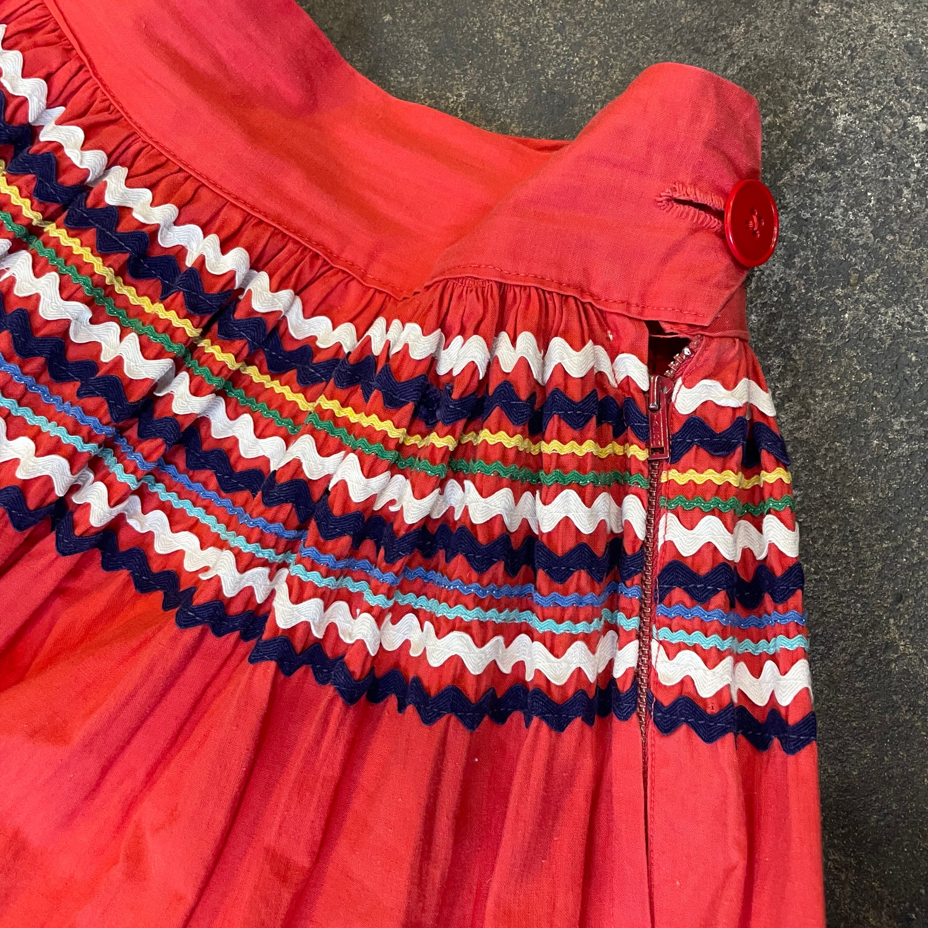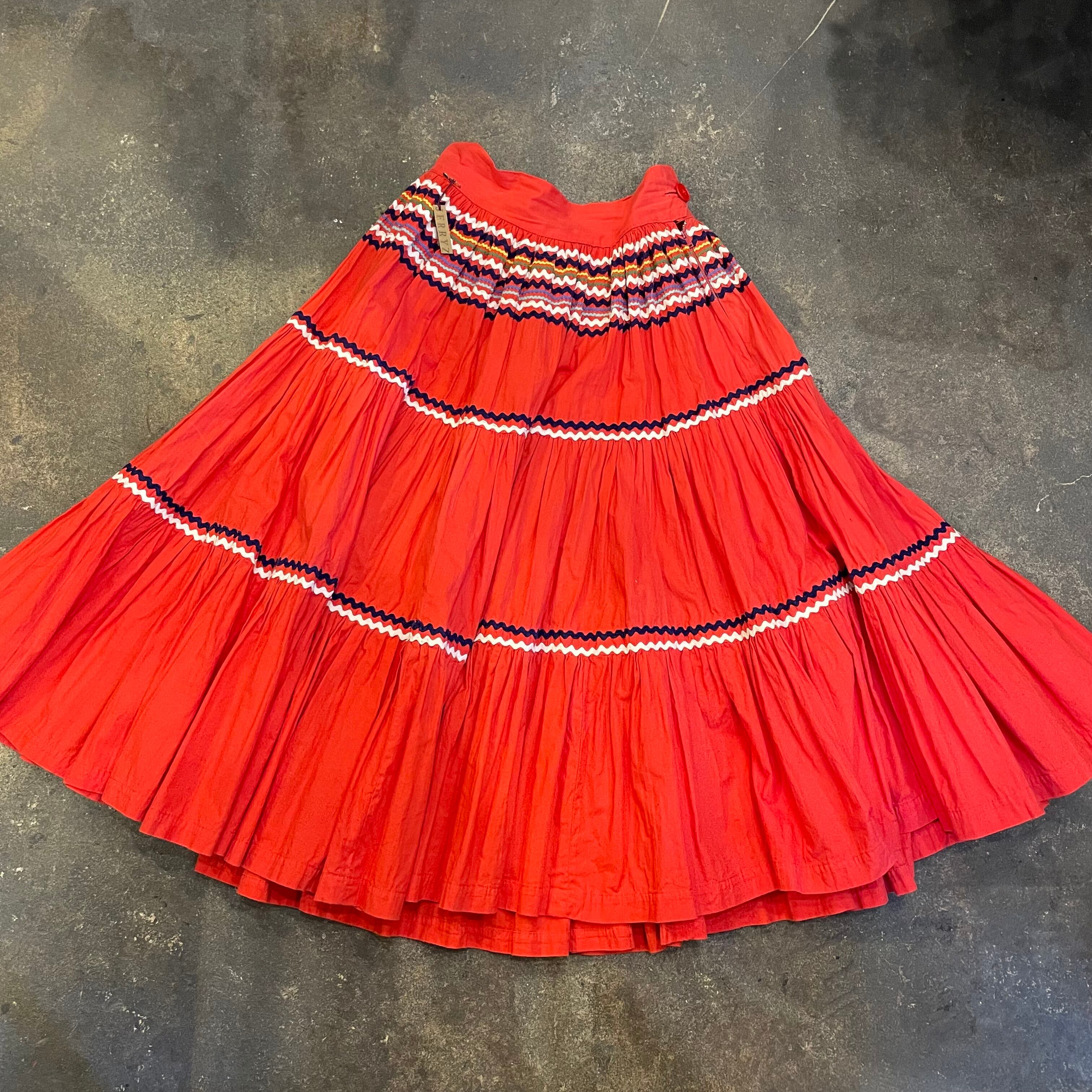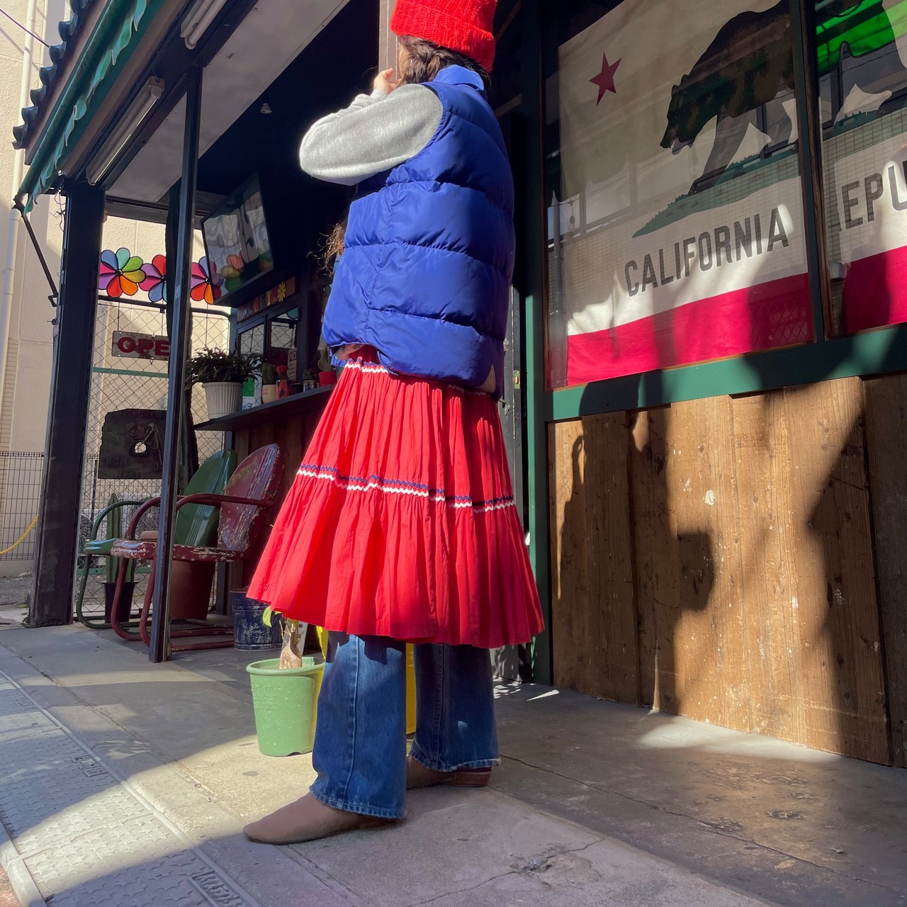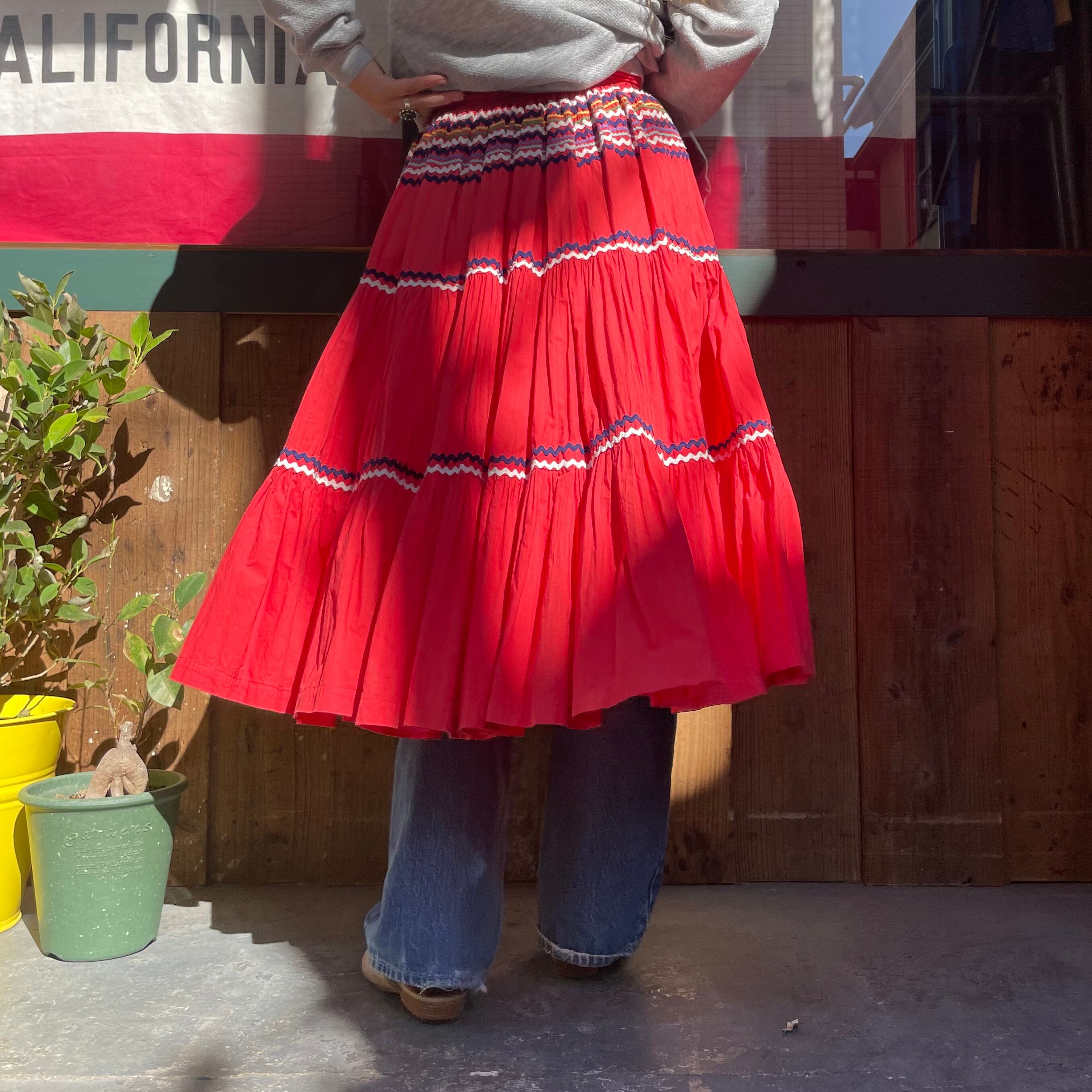 たっぷりなボリュームのティアードとたくさんの山道テープがかわいいサーキュラースカートです。