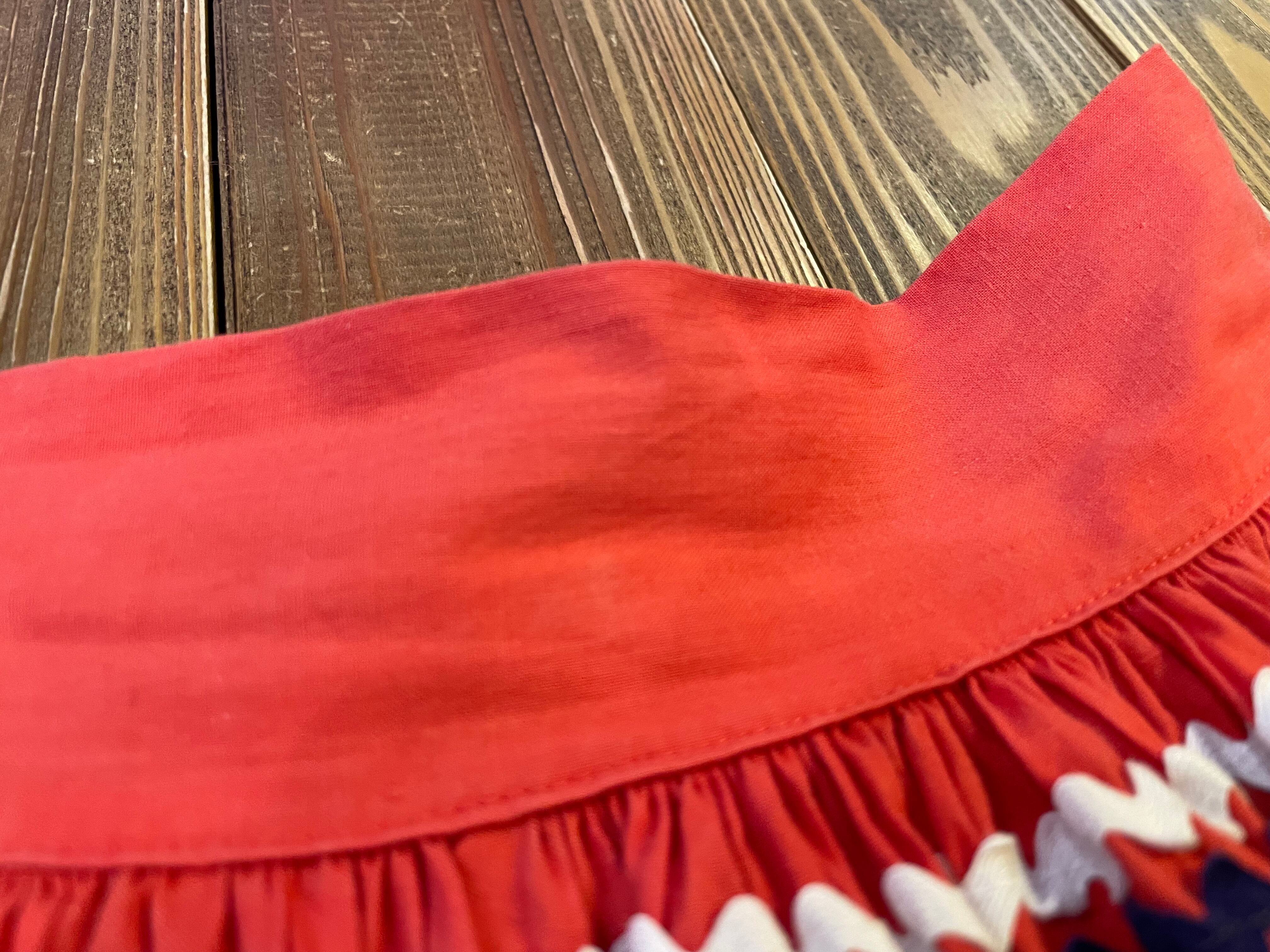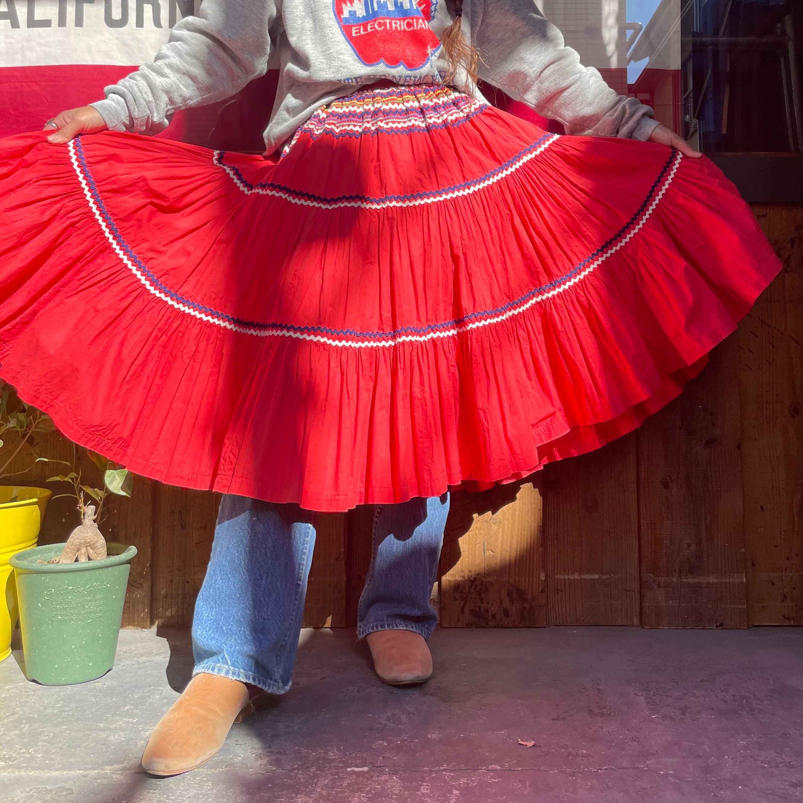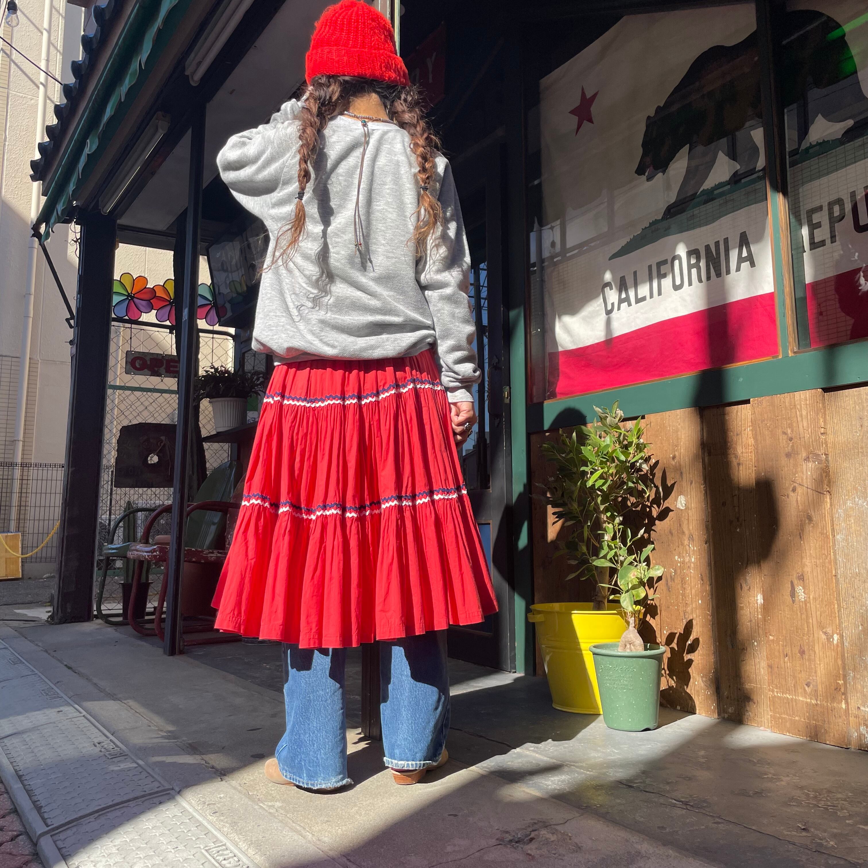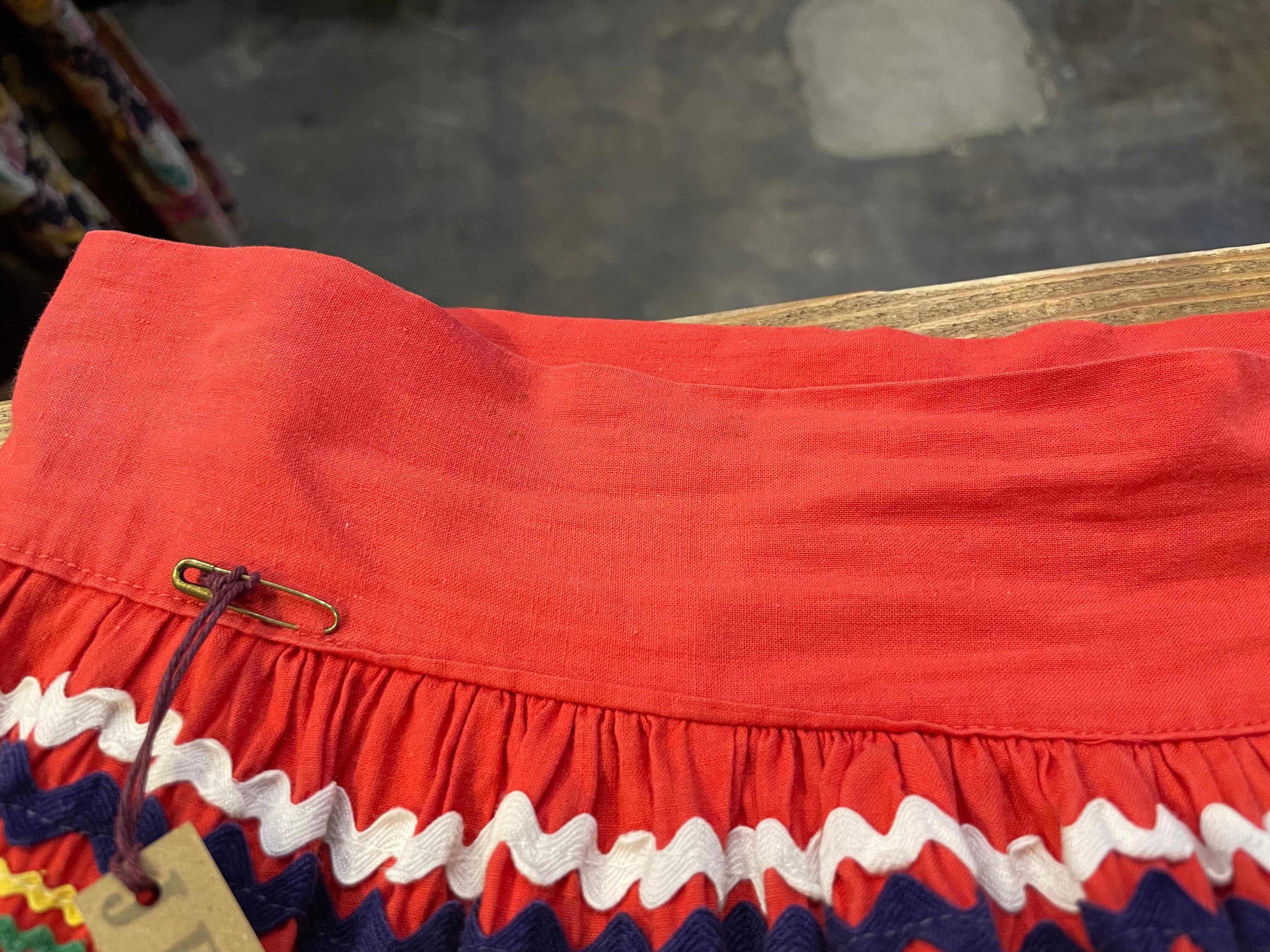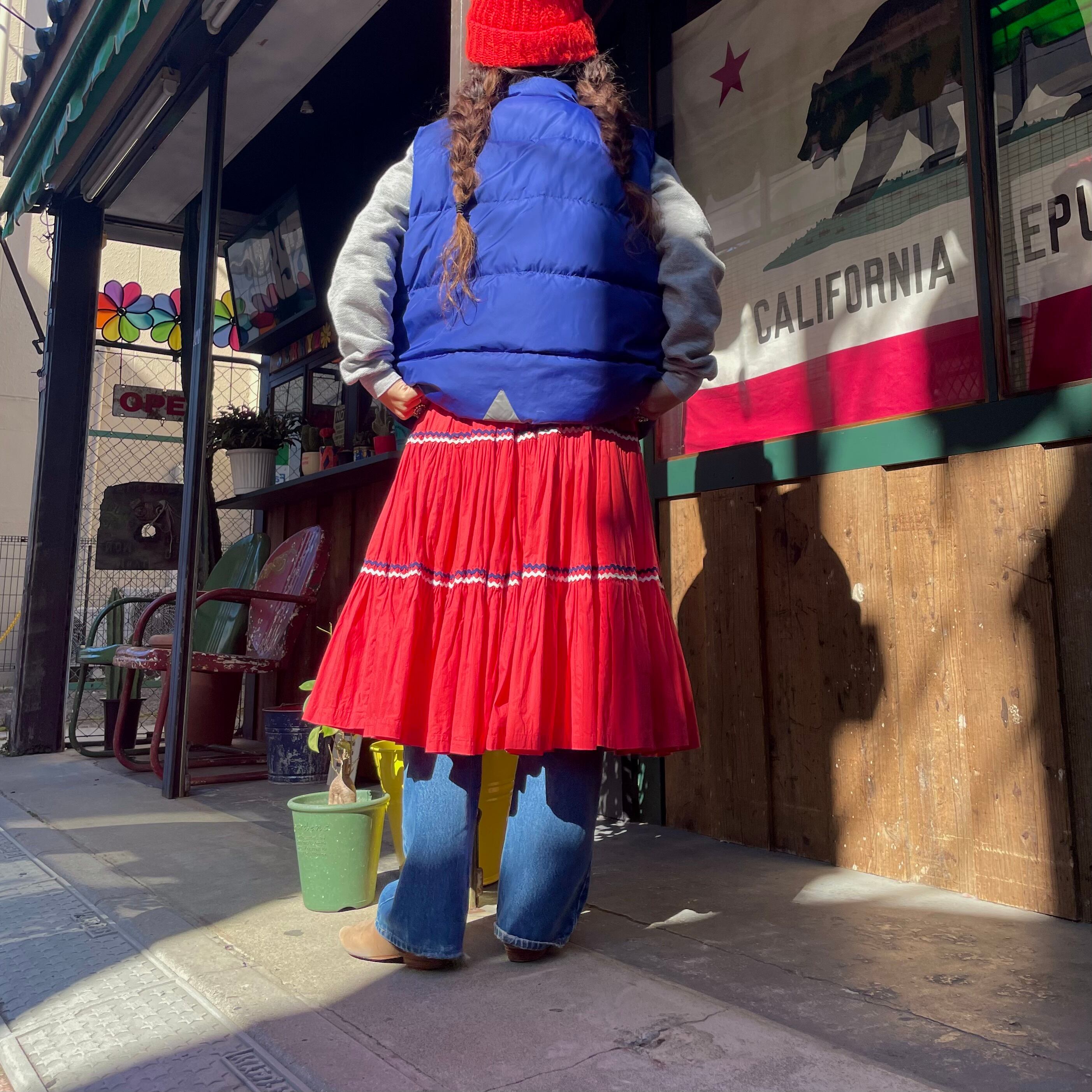 たっぷりなボリュームのティアードとたくさんの山道テープがかわいいサーキュラースカートです。