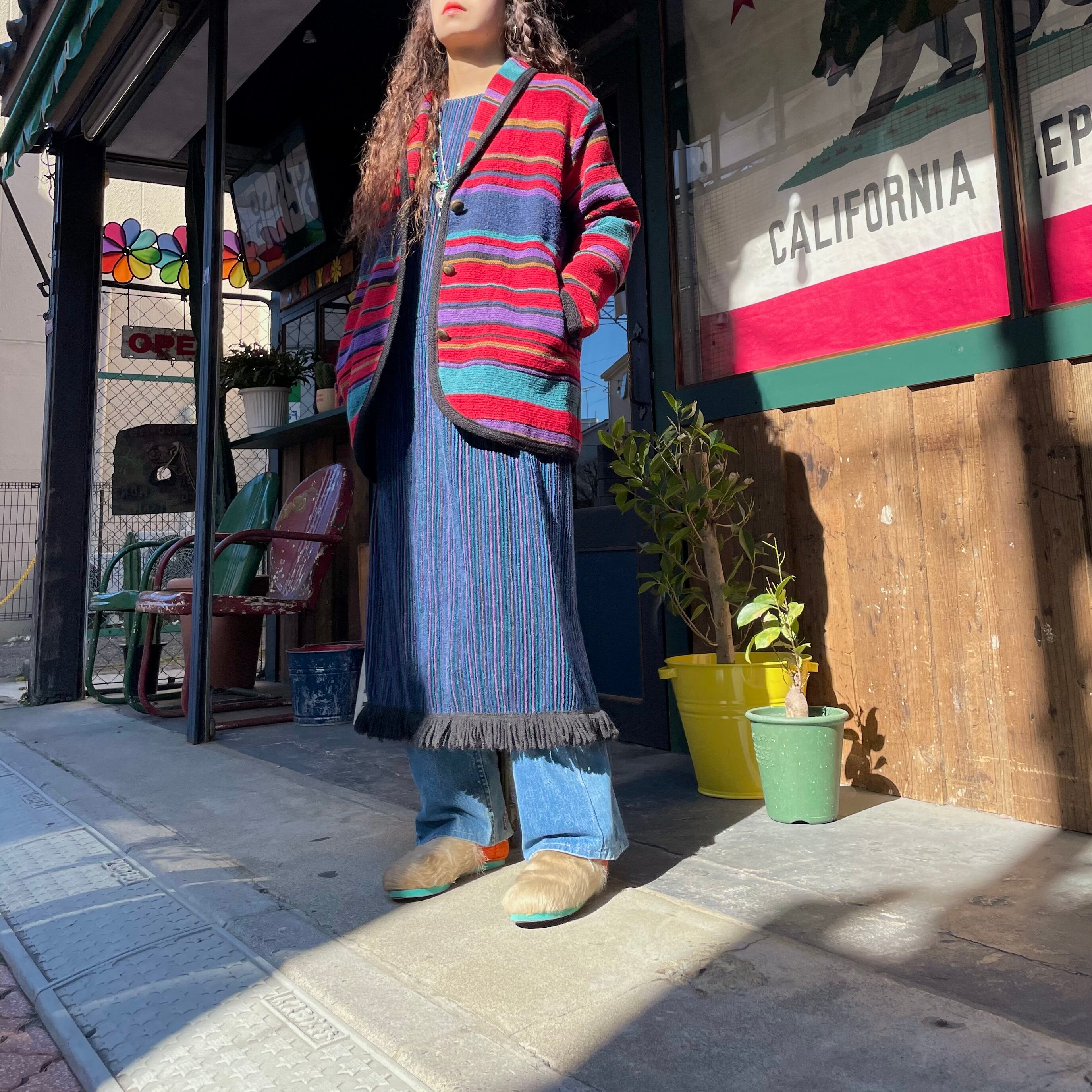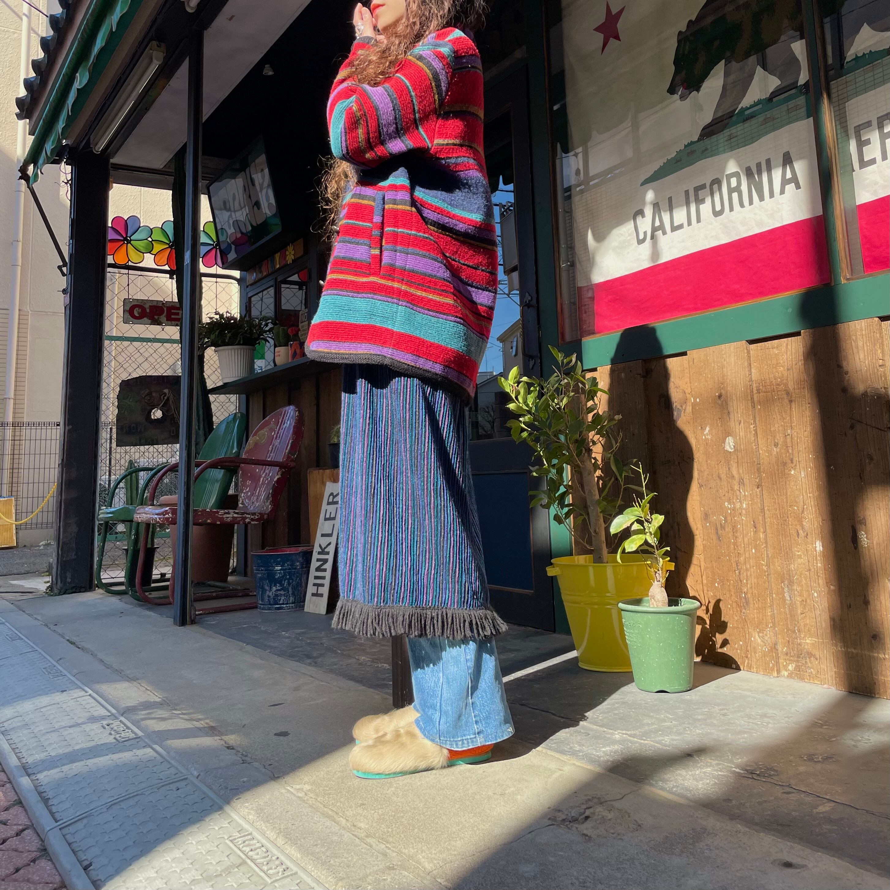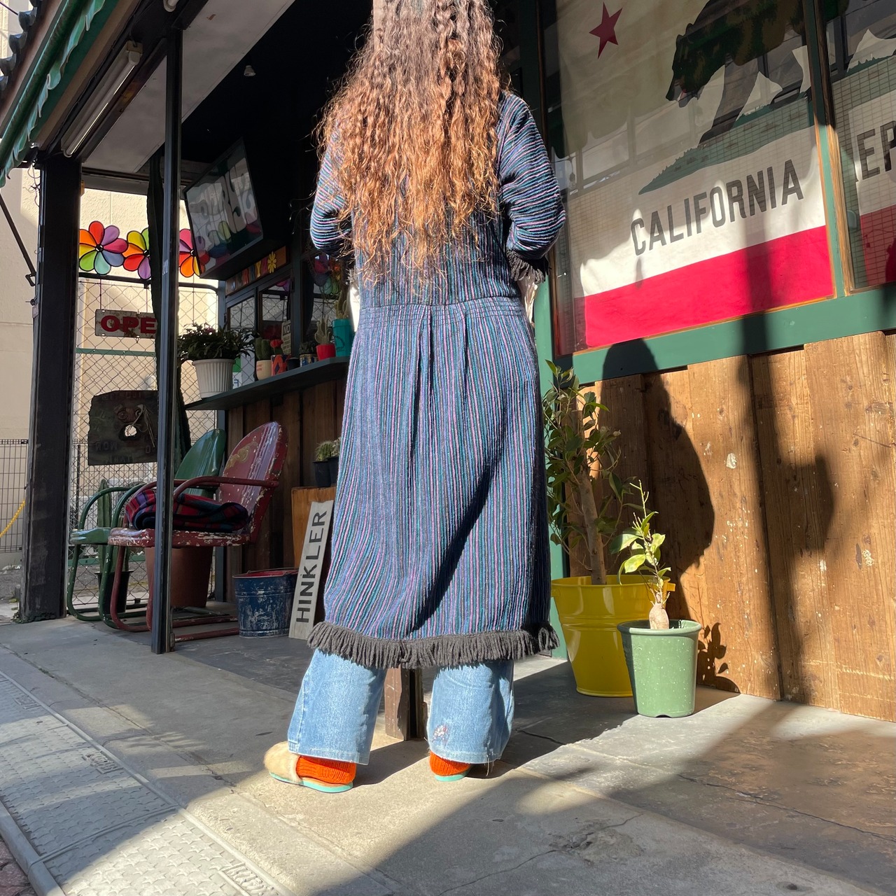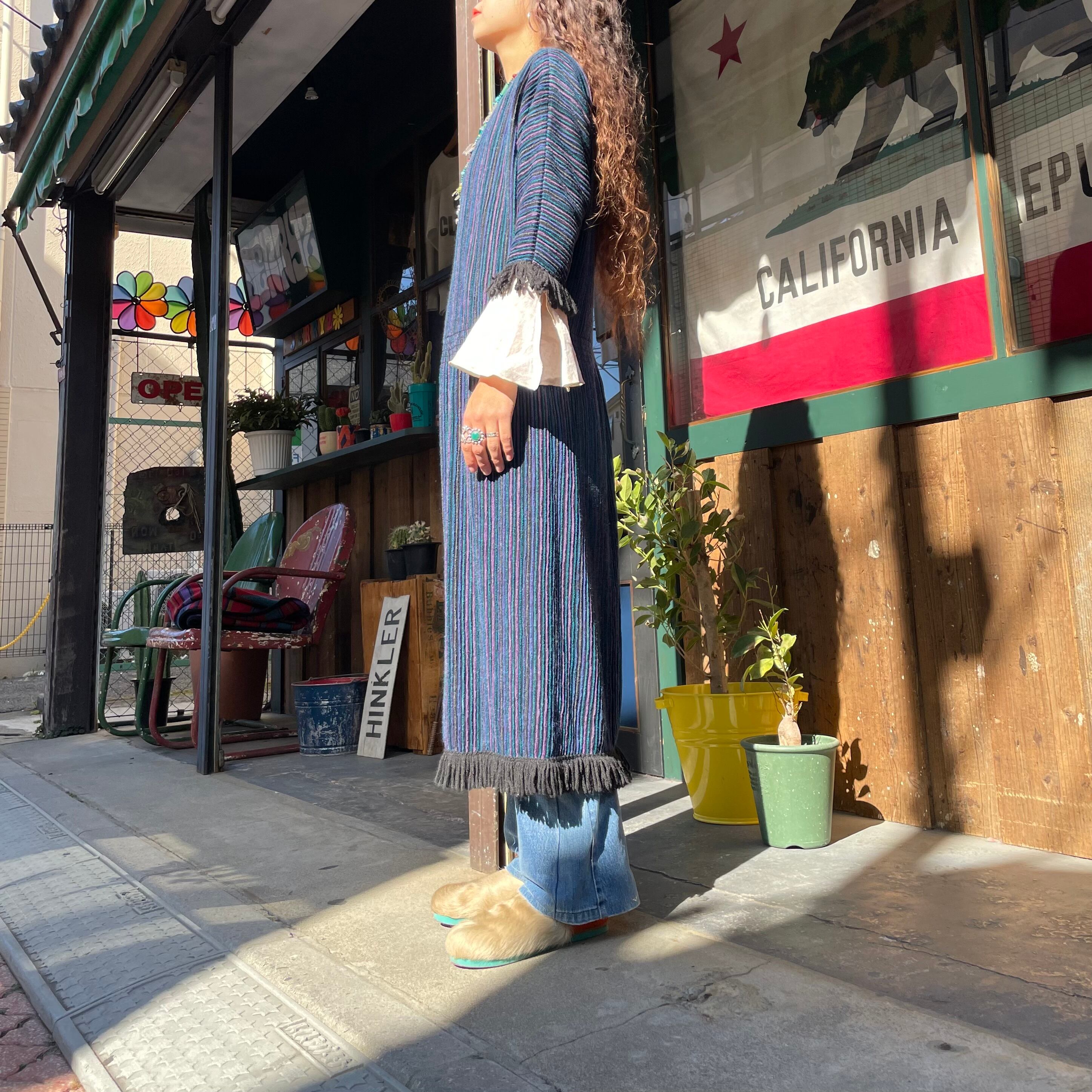 七部丈の袖口と裾にボリュームのあるモップのようなフリンジがかわいい一枚です。青や紫系の色味も雰囲気があって素敵ですし、厚手そうに見えて意外と透けるほと薄い繊細な感じも良いですね。