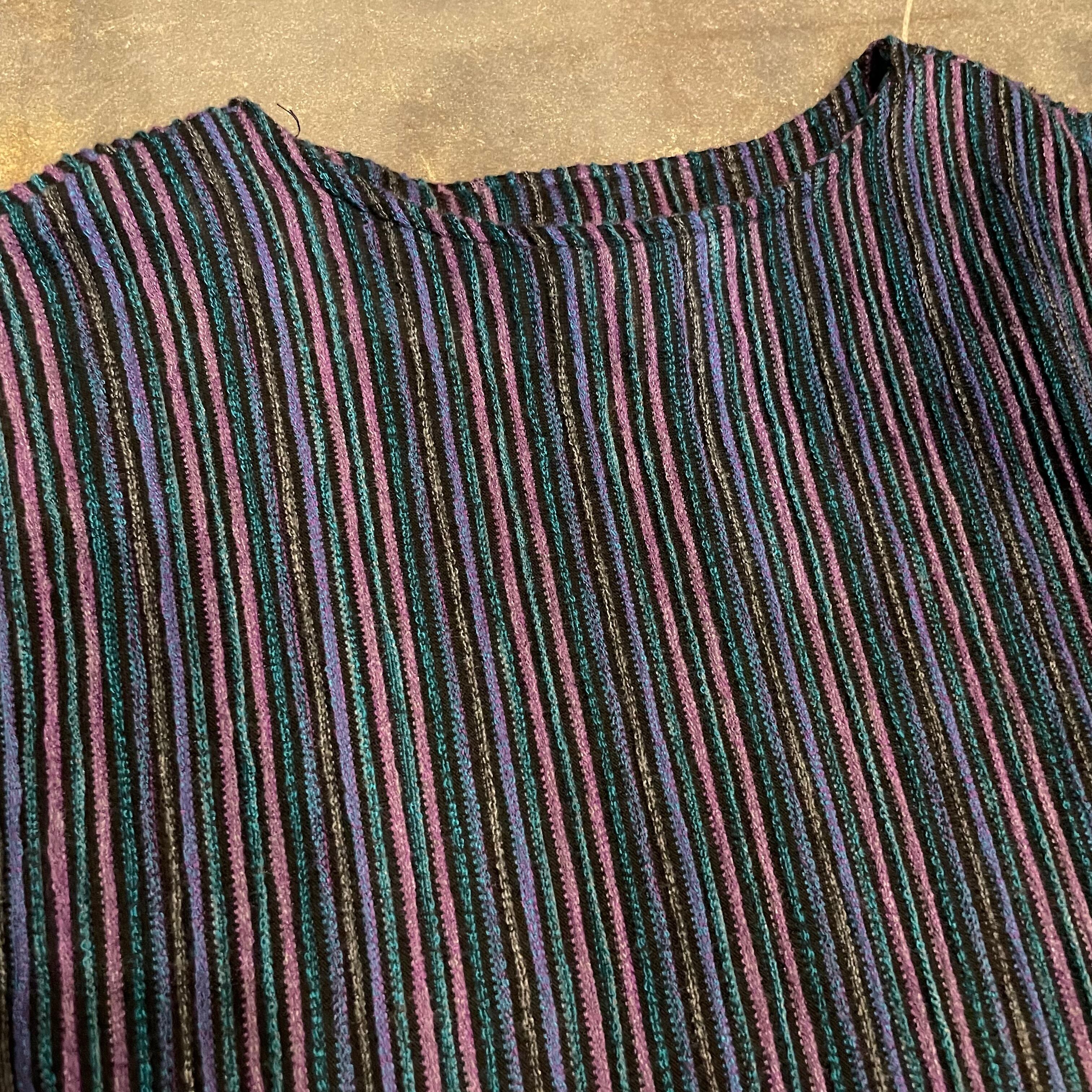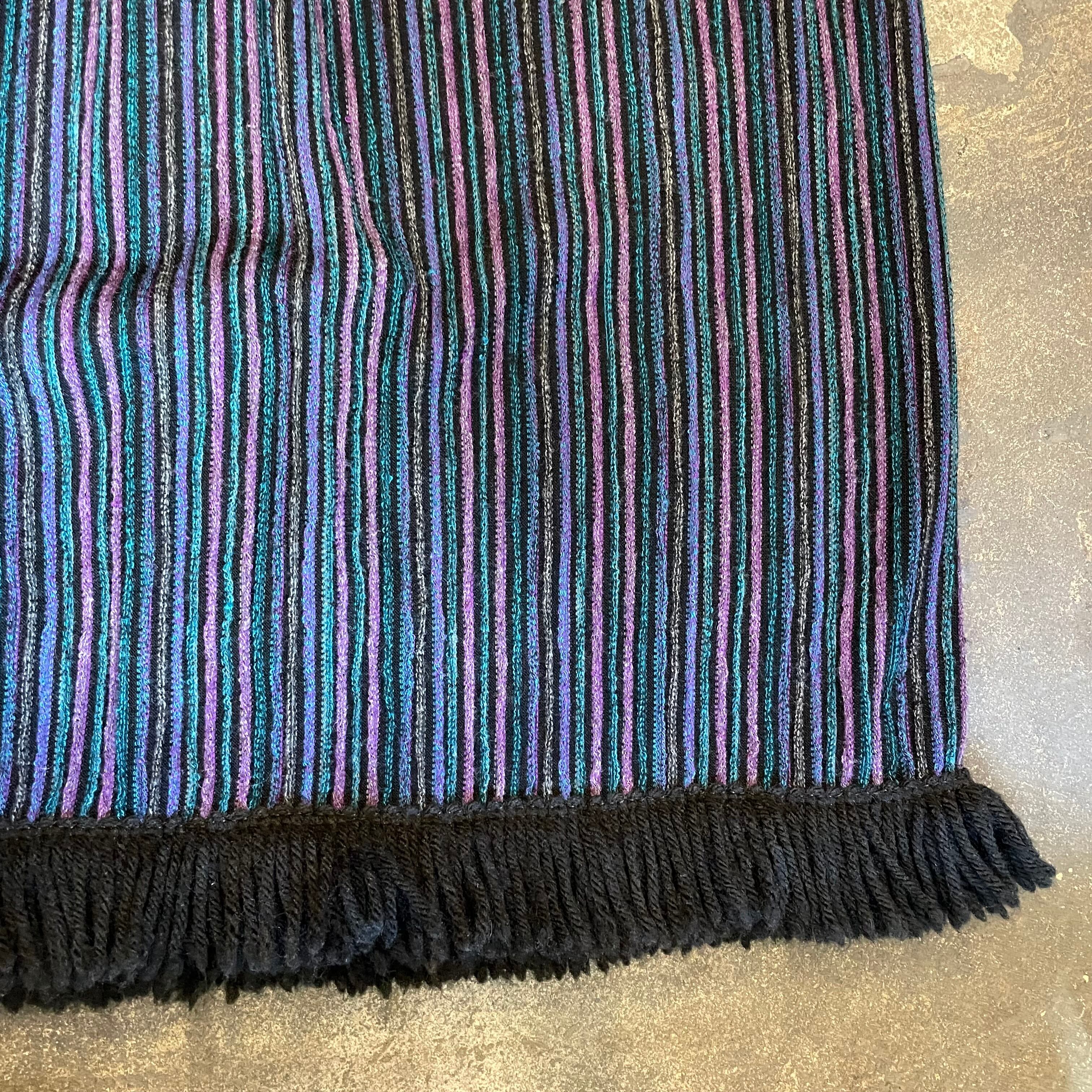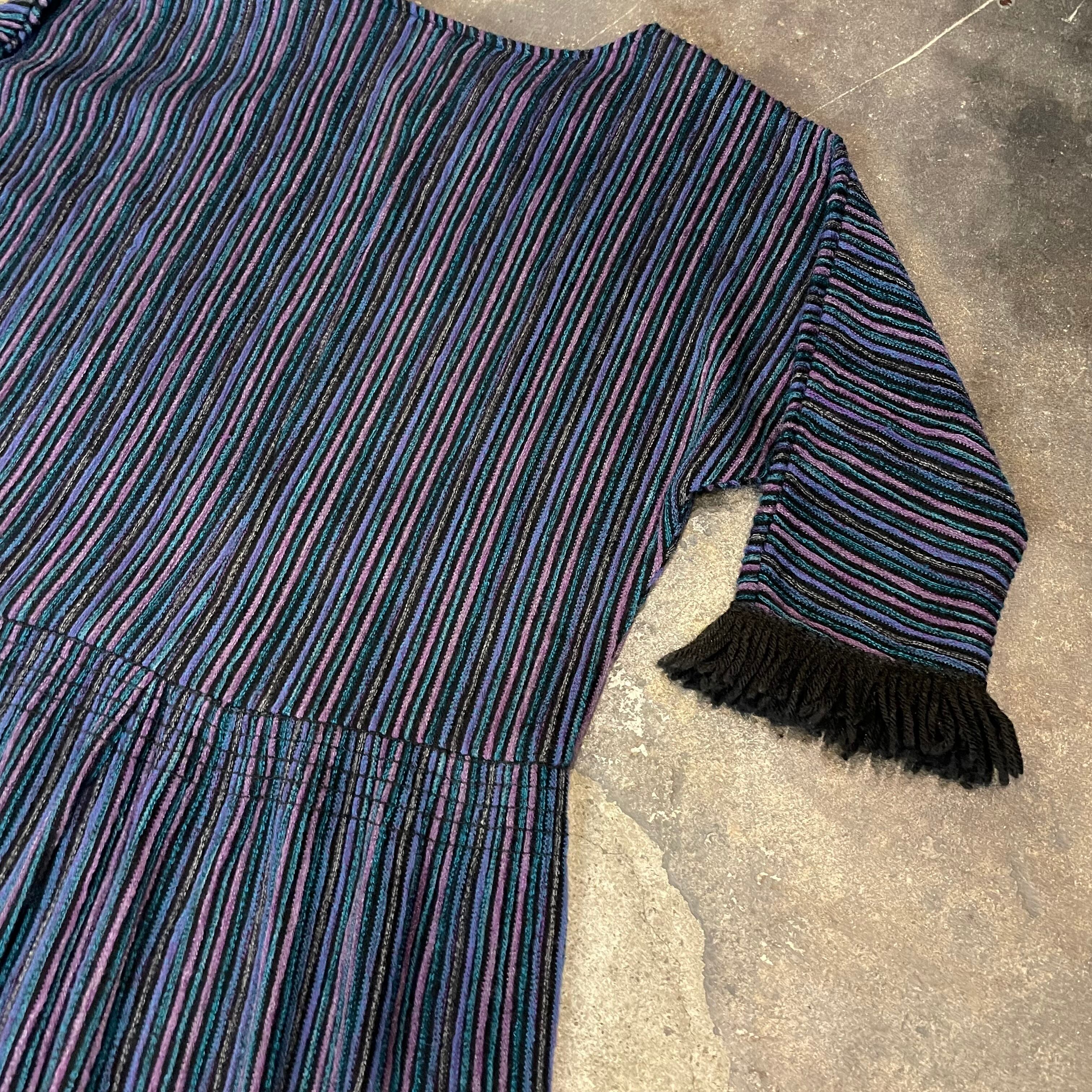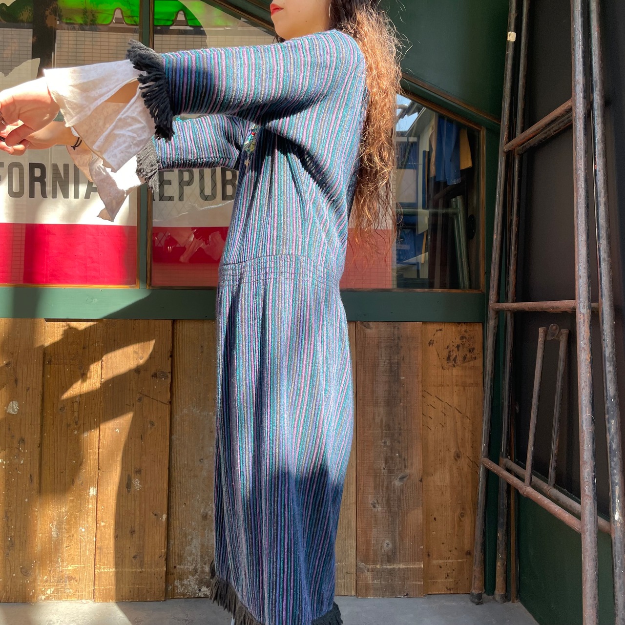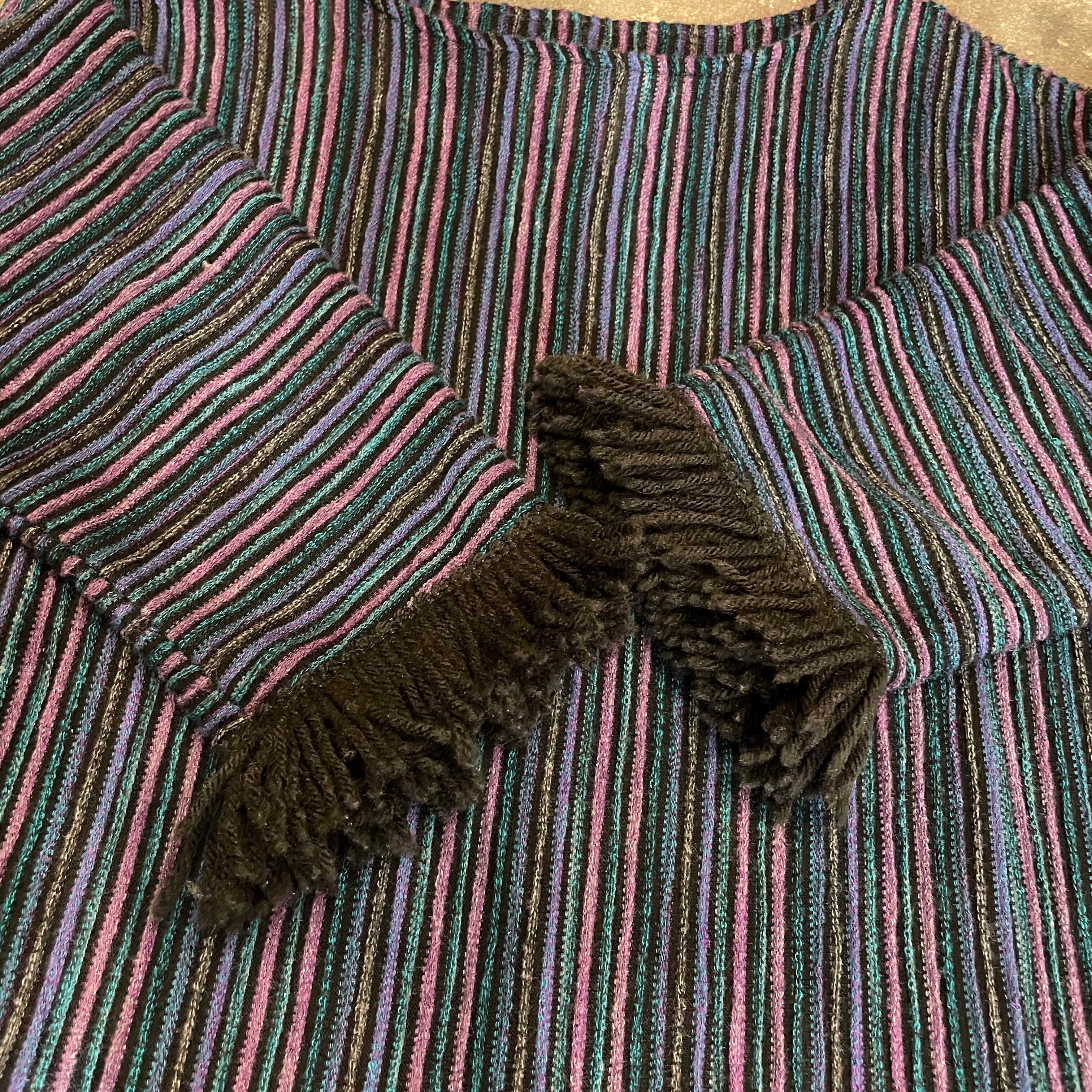 七部丈の袖口と裾にボリュームのあるモップのようなフリンジがかわいい一枚です。青や紫系の色味も雰囲気があって素敵ですし、厚手そうに見えて意外と透けるほと薄い繊細な感じも良いですね。