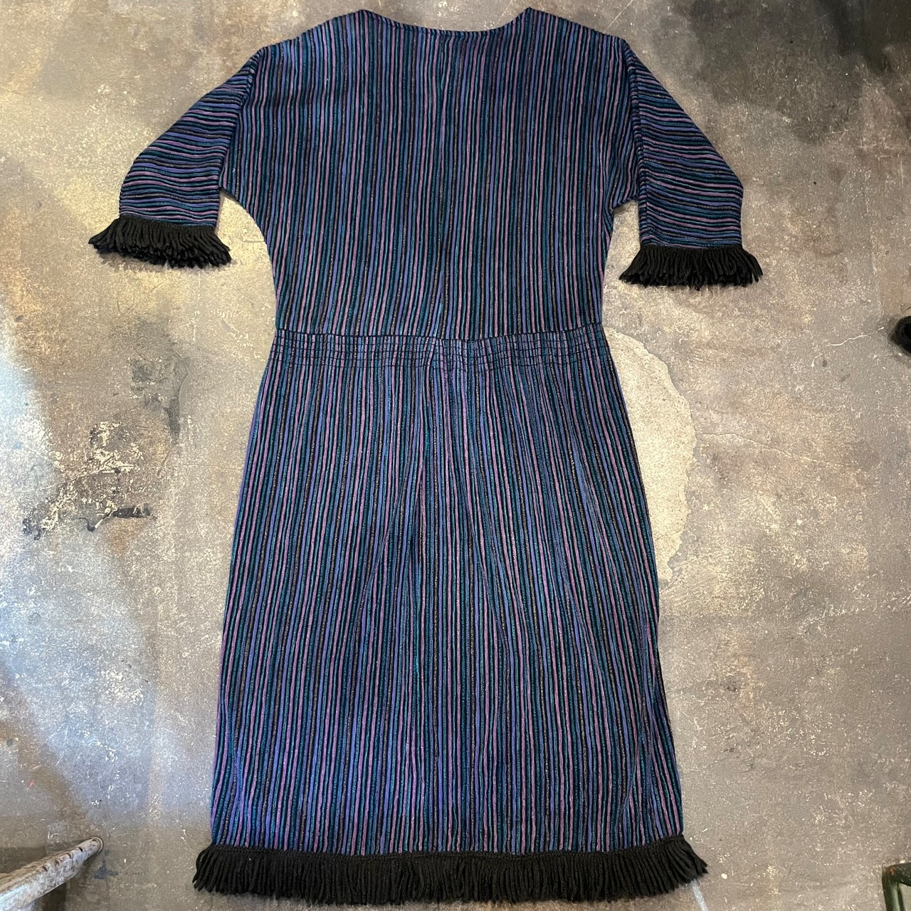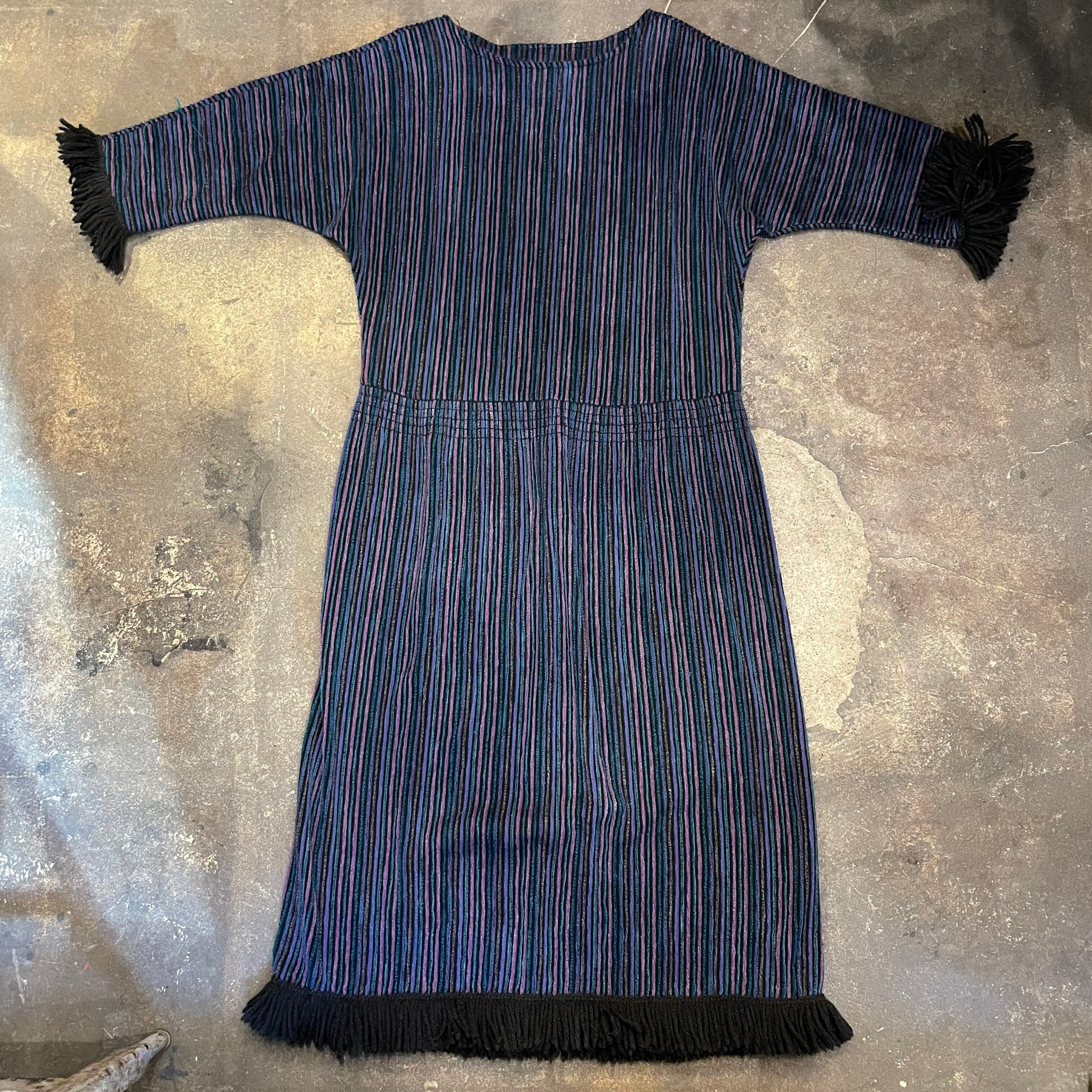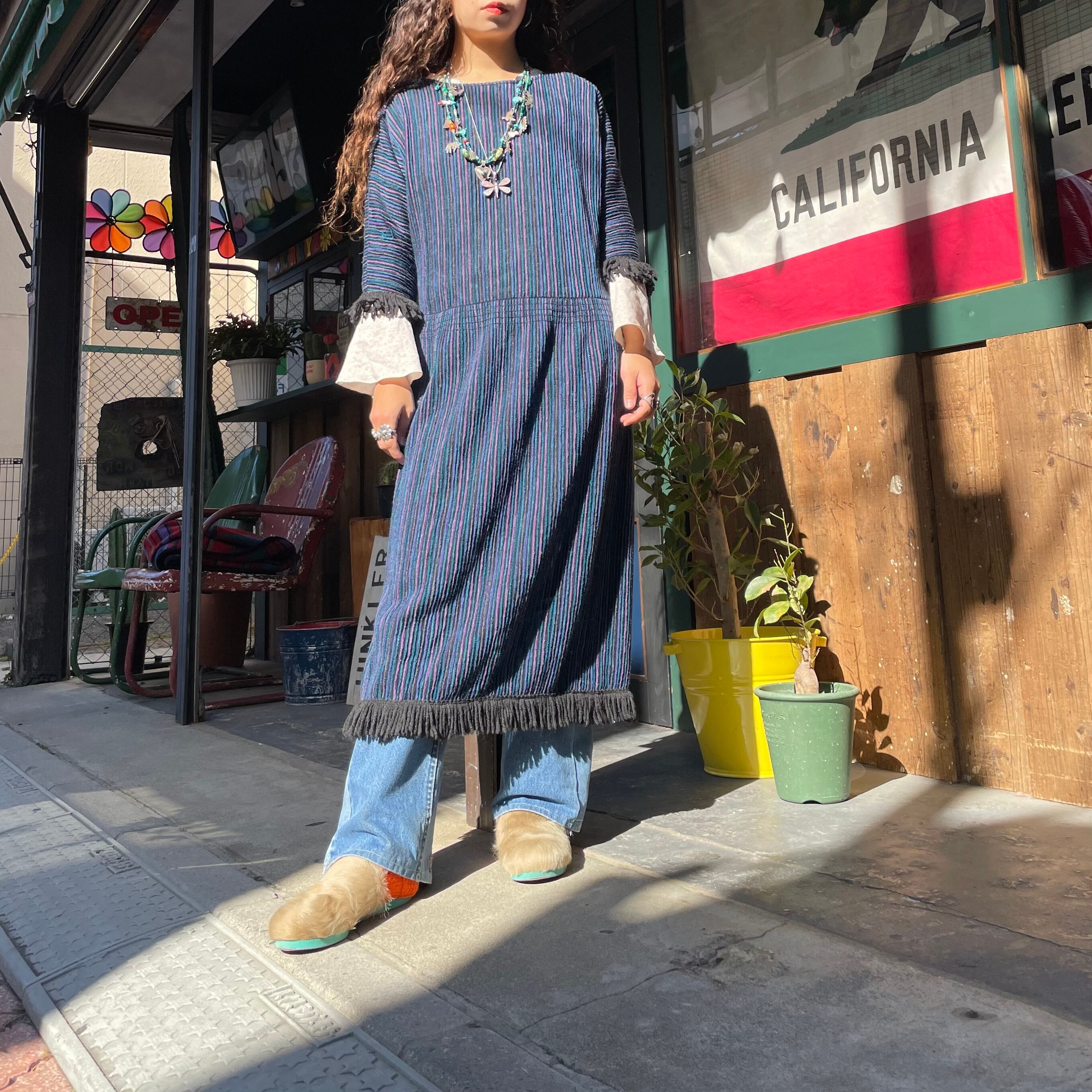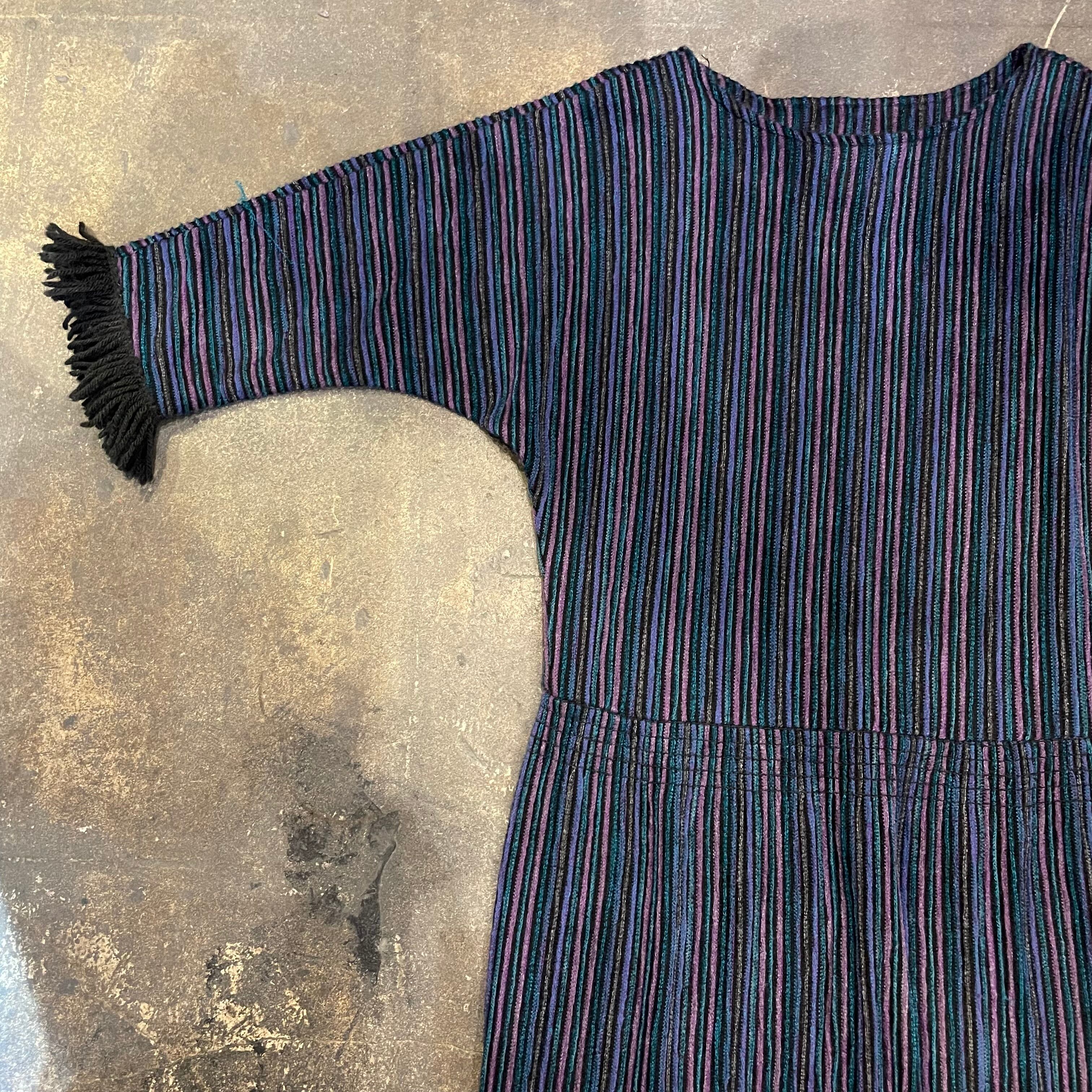 七部丈の袖口と裾にボリュームのあるモップのようなフリンジがかわいい一枚です。青や紫系の色味も雰囲気があって素敵ですし、厚手そうに見えて意外と透けるほと薄い繊細な感じも良いですね。