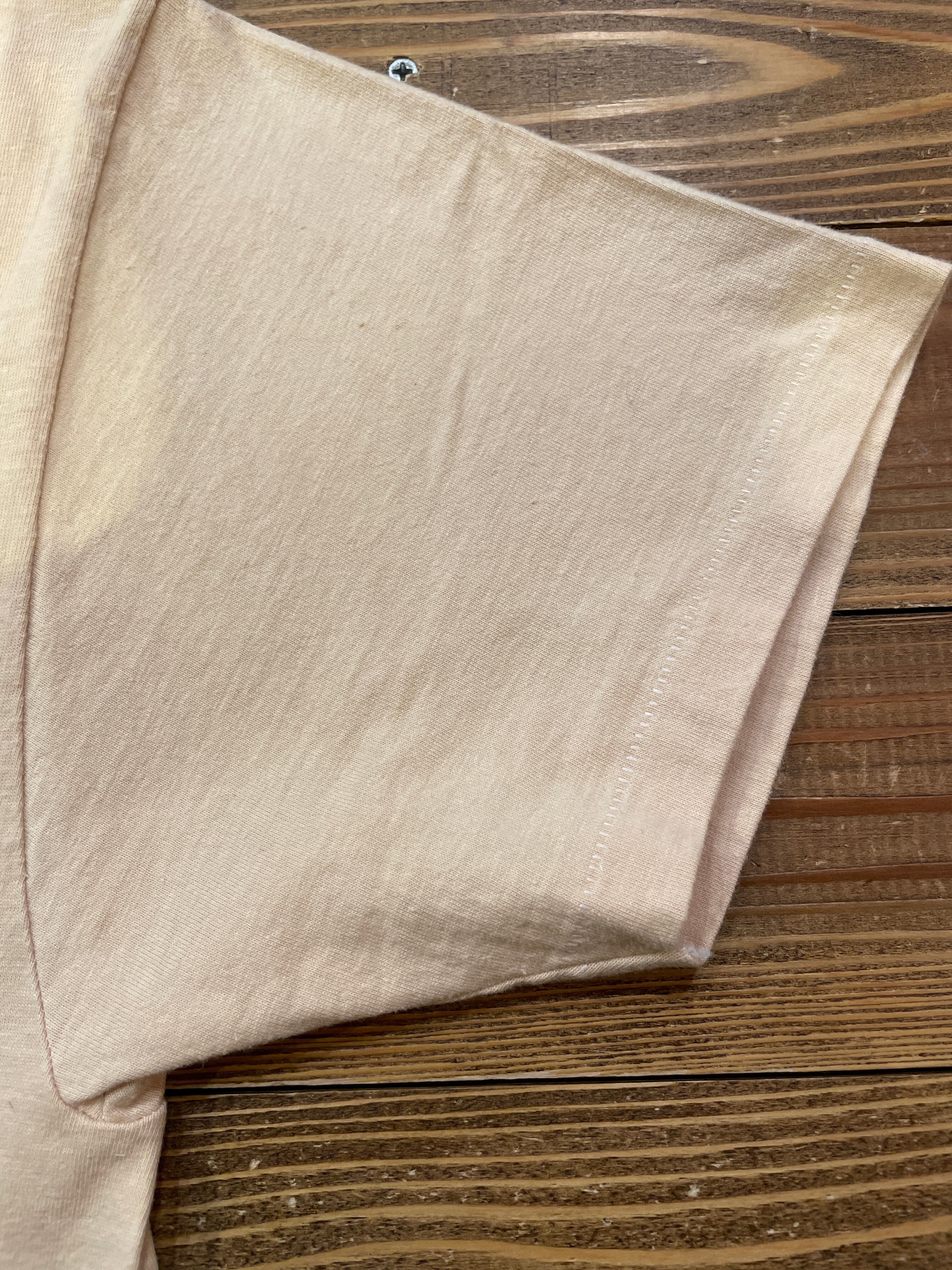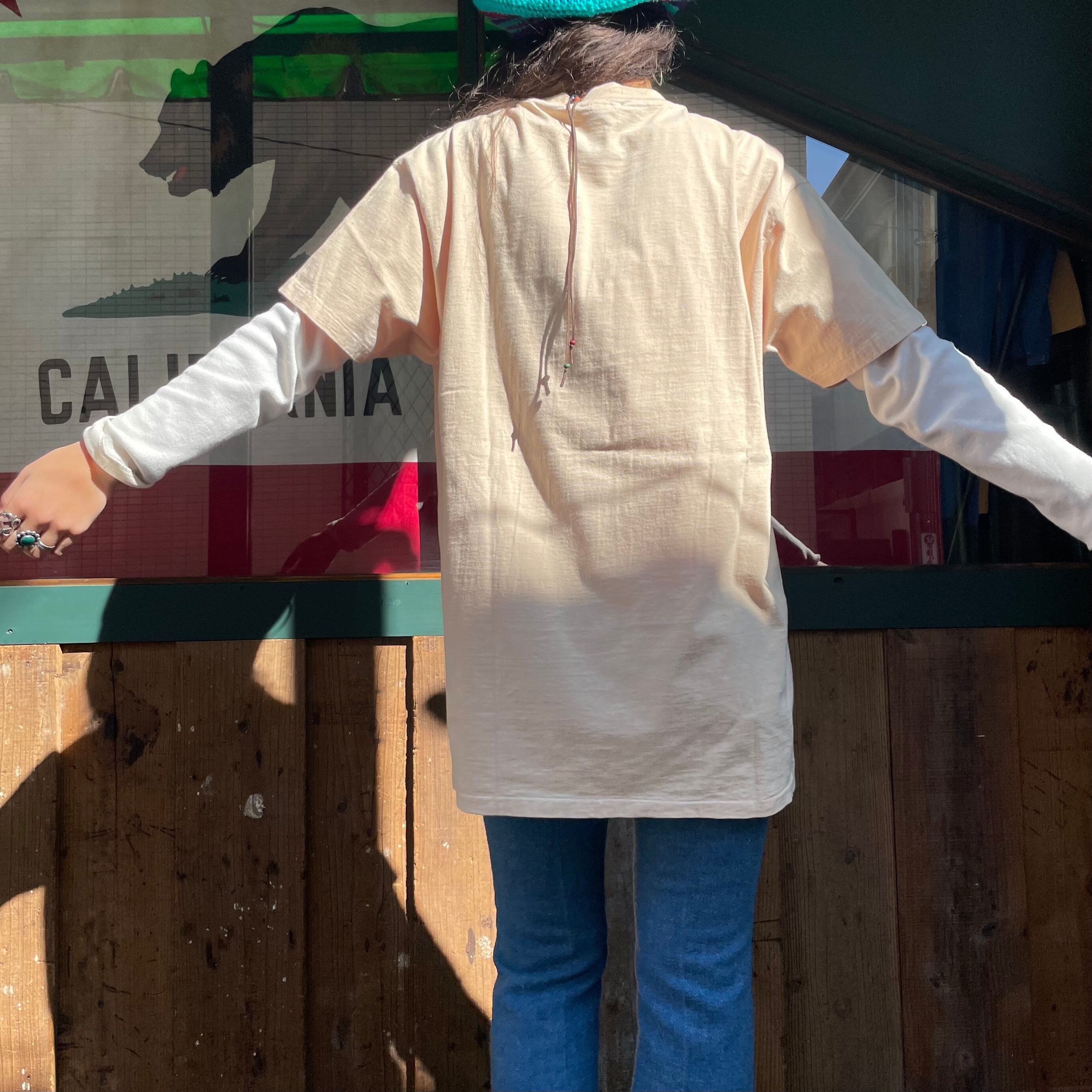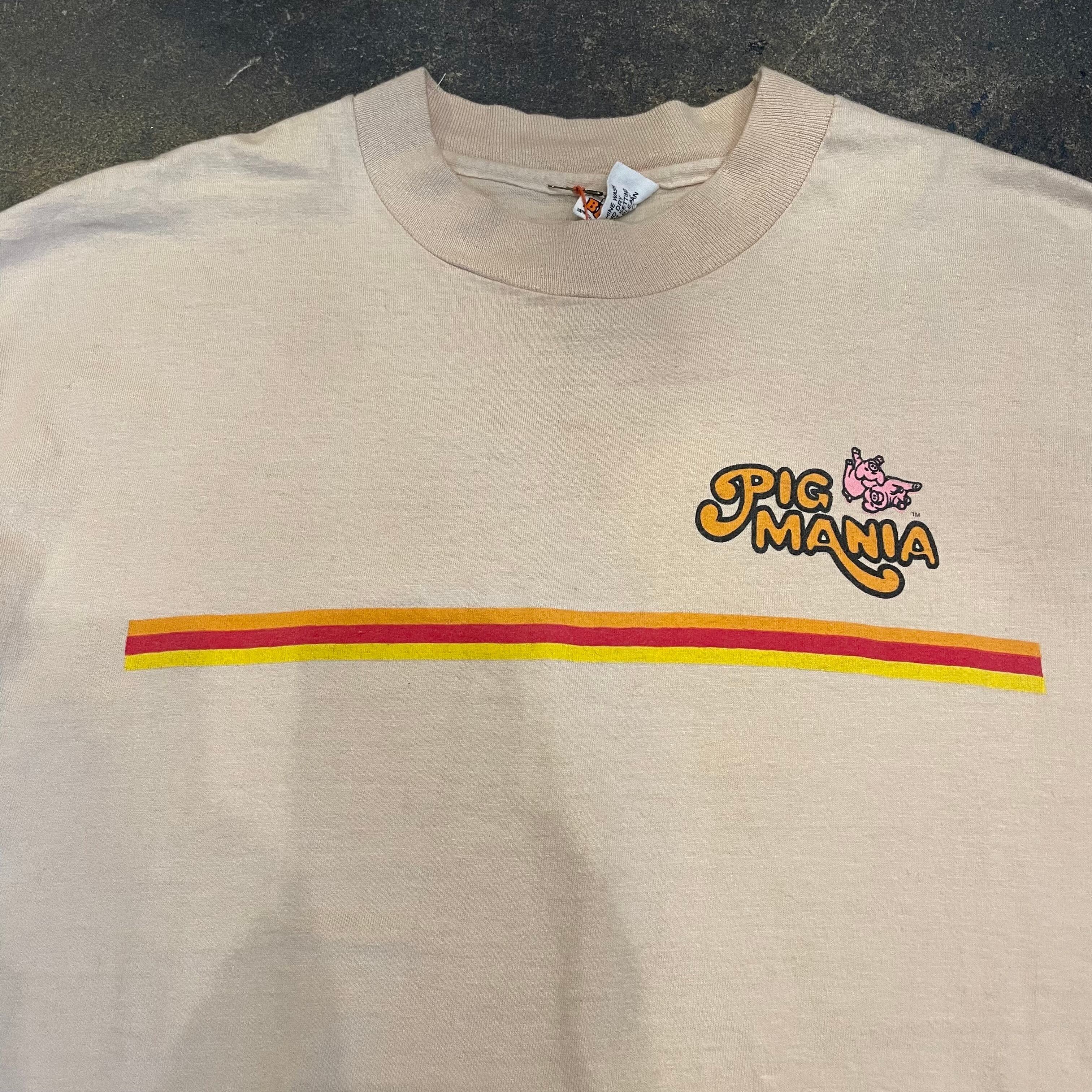 ベージュボディにオレンジのロゴや、ハッピーな色味のライン、さりげないブタのイラストがとてもかわいいTシャツです。
