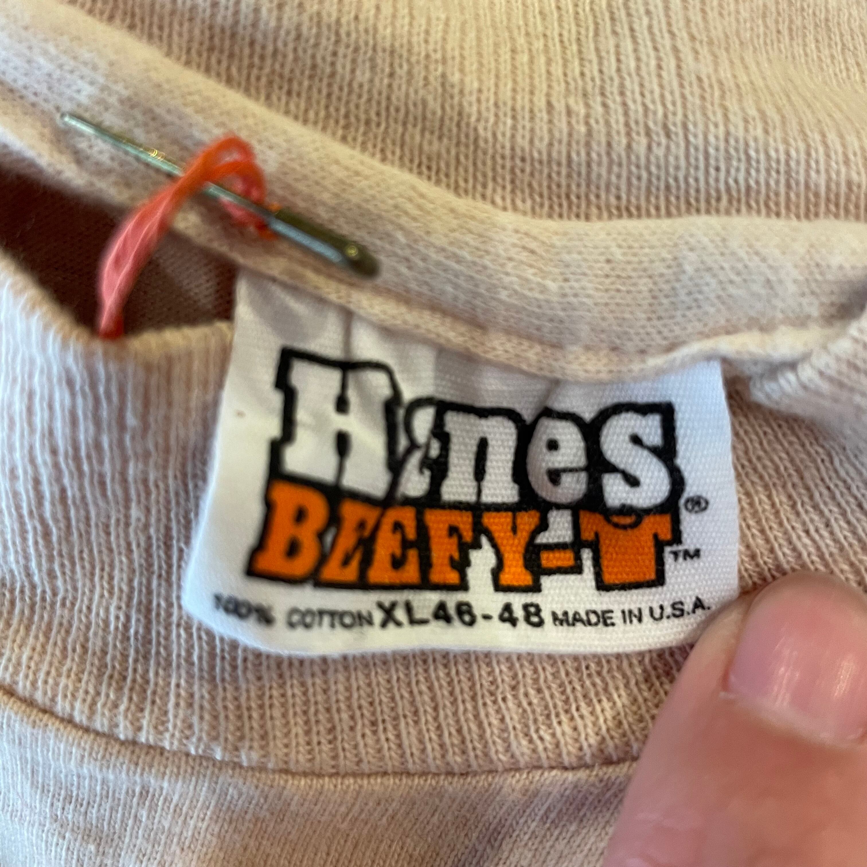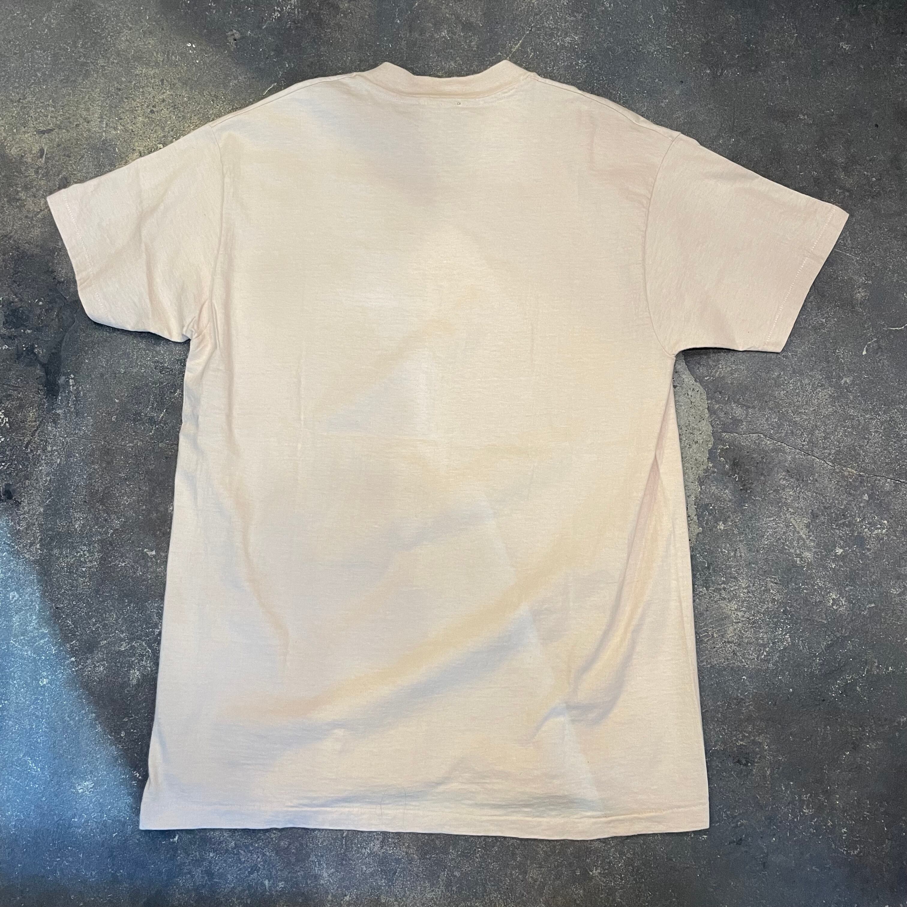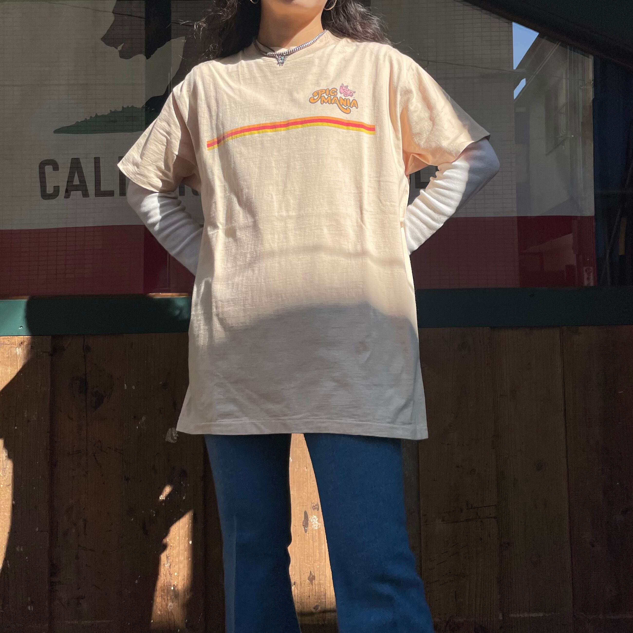 ベージュボディにオレンジのロゴや、ハッピーな色味のライン、さりげないブタのイラストがとてもかわいいTシャツです。