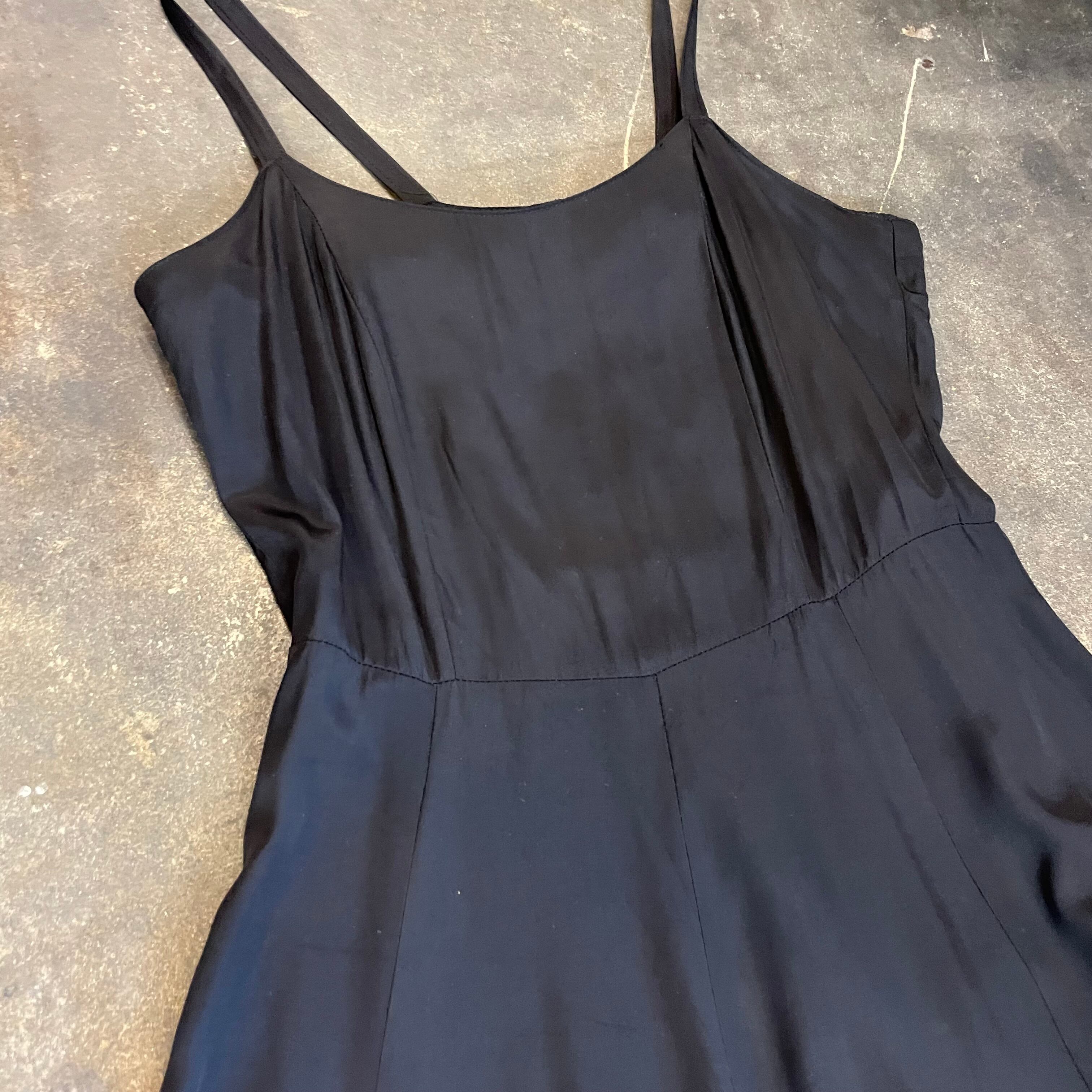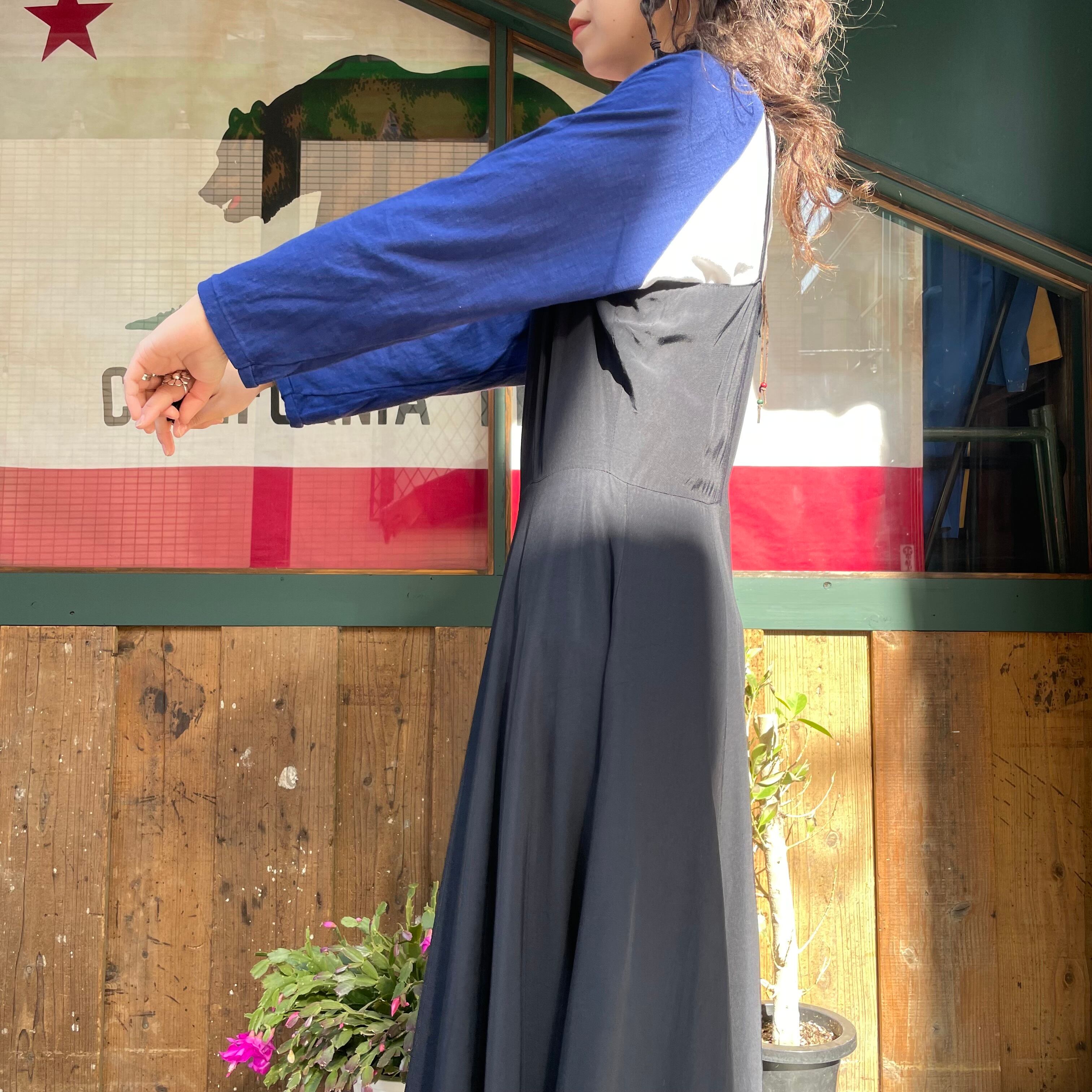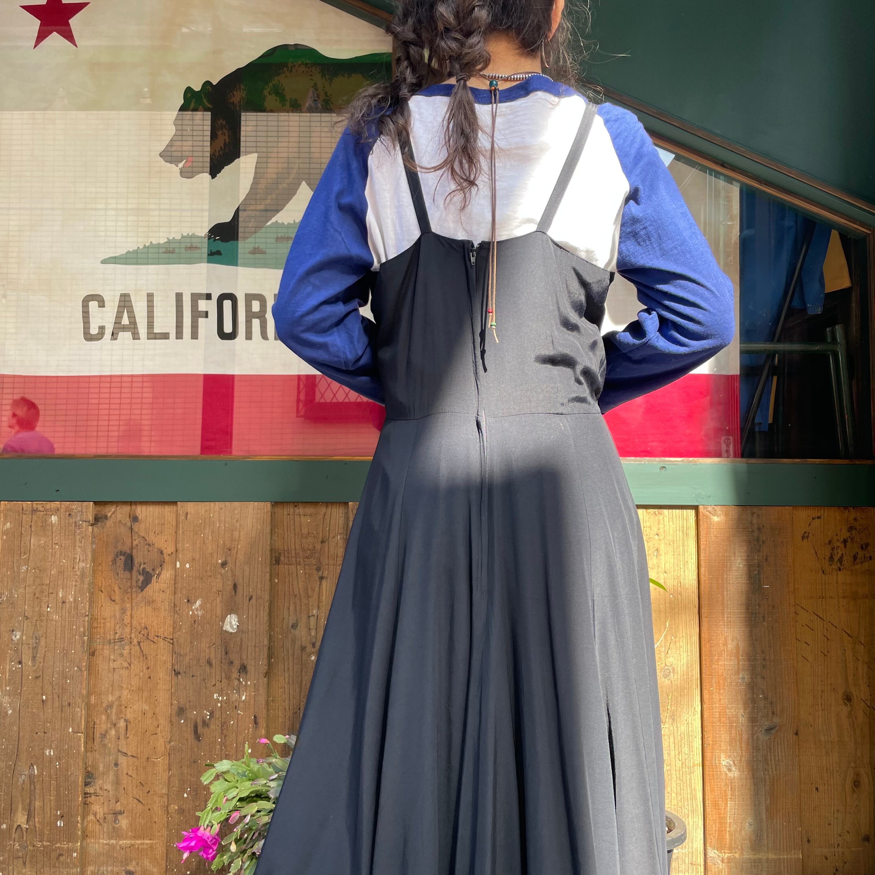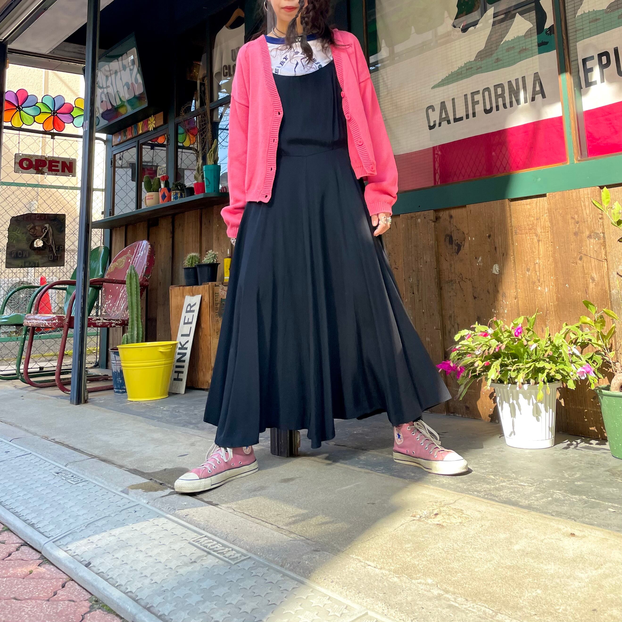 真っ黒なキャミソールタイプのワンピースです。中に合わせるアイテム次第でがらりと印象の変わる楽しい一着です。