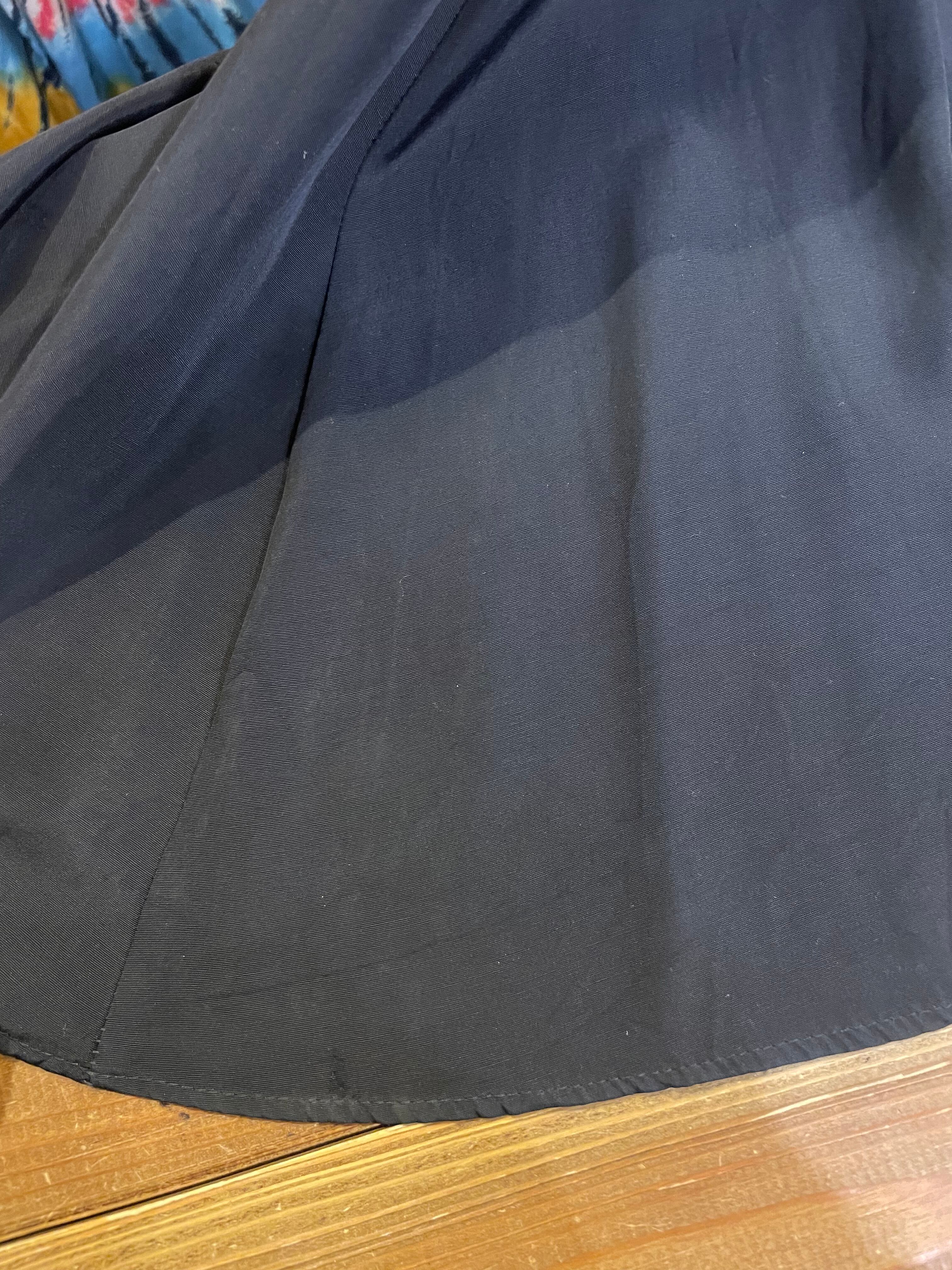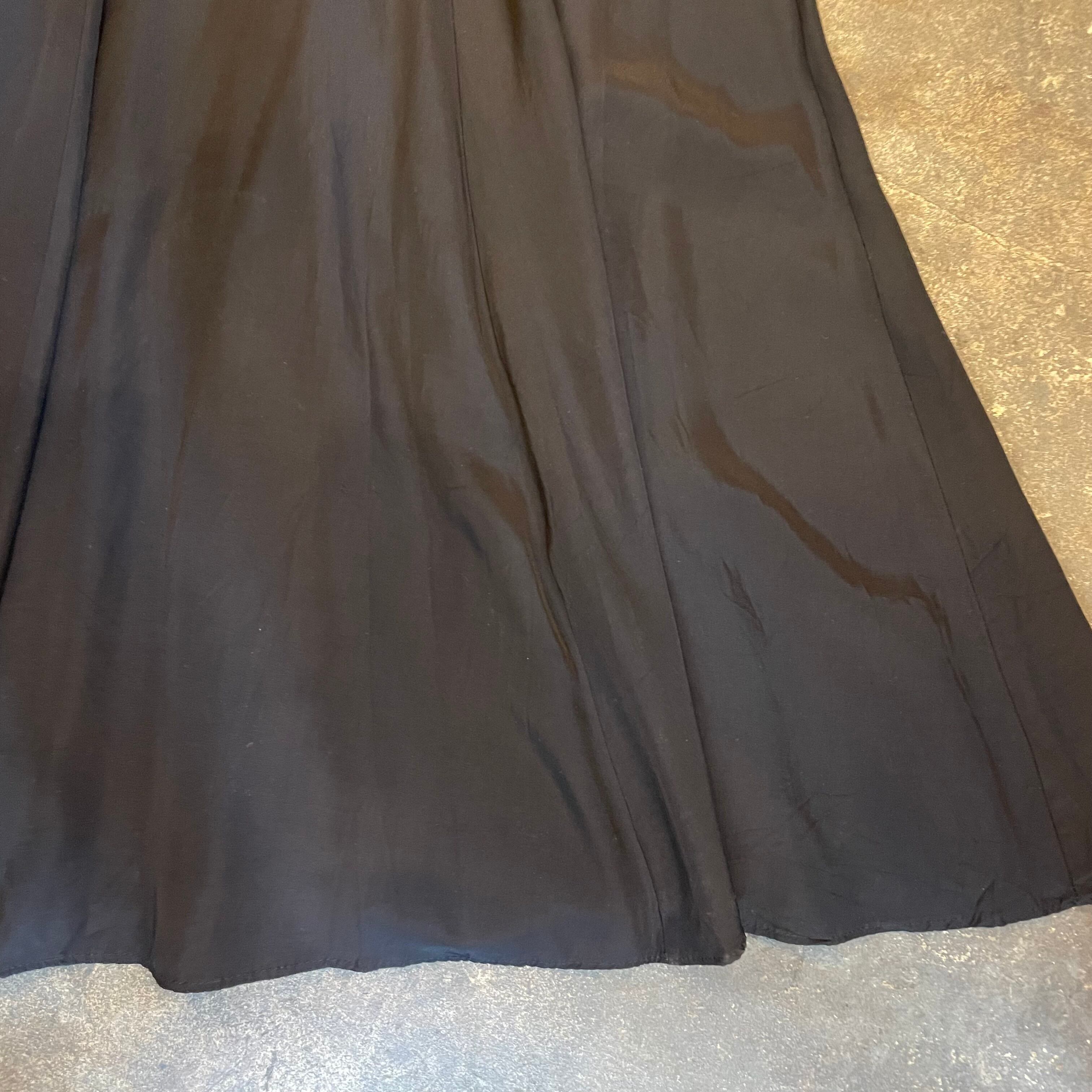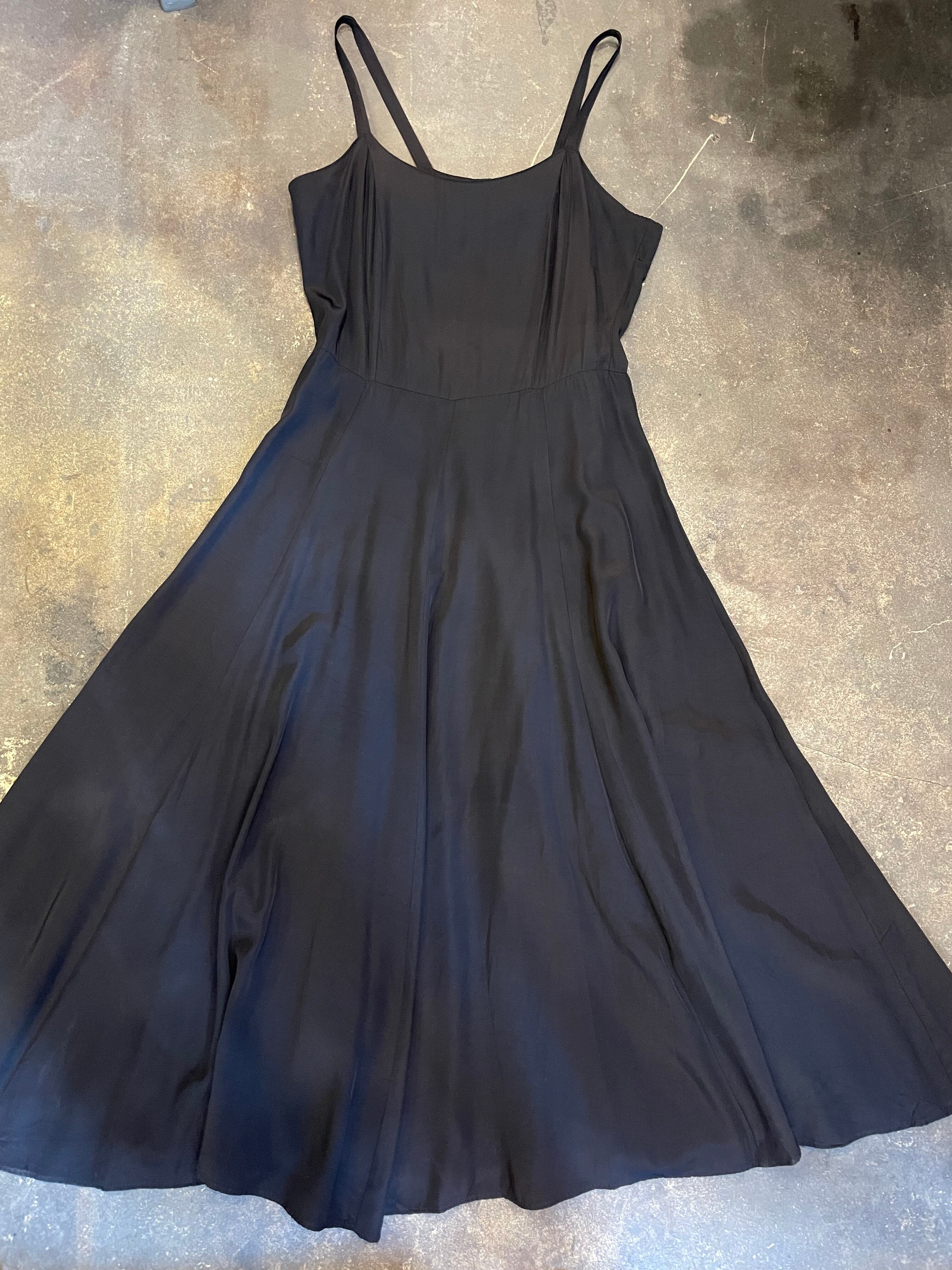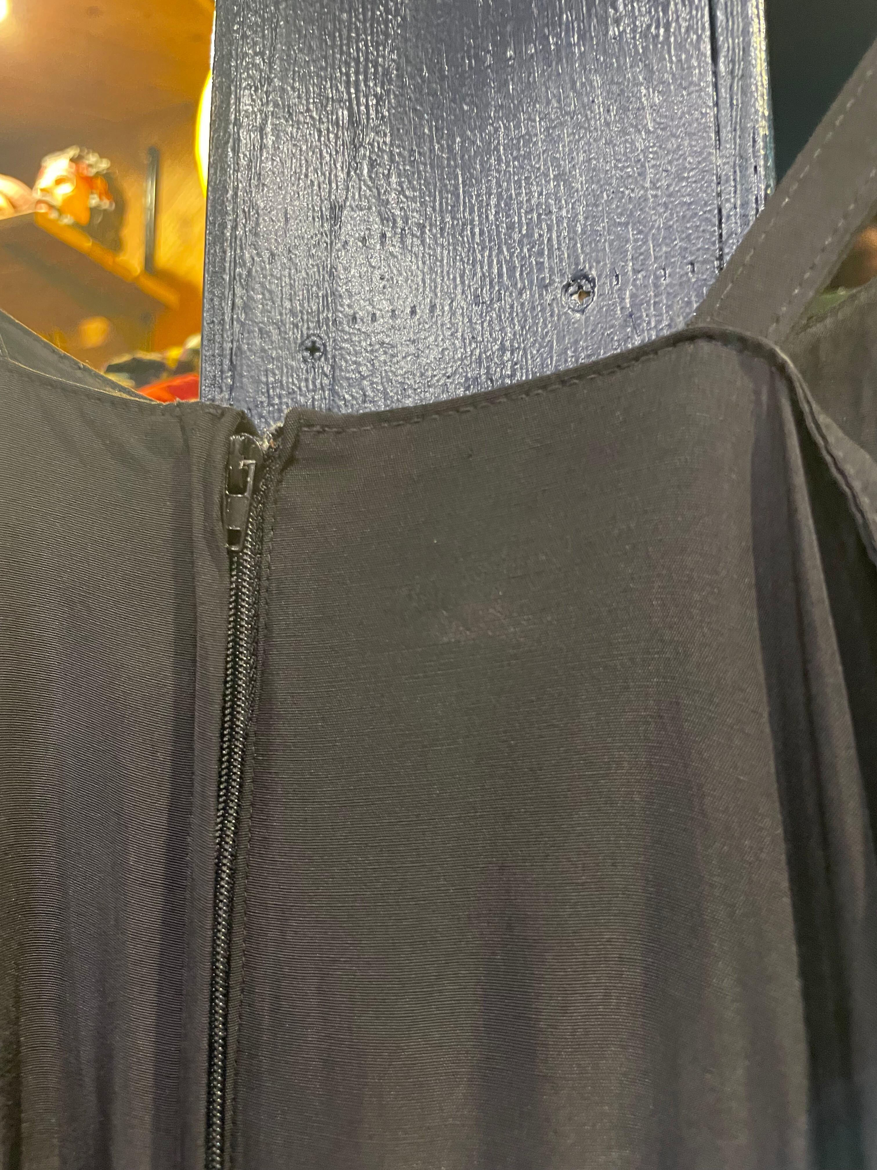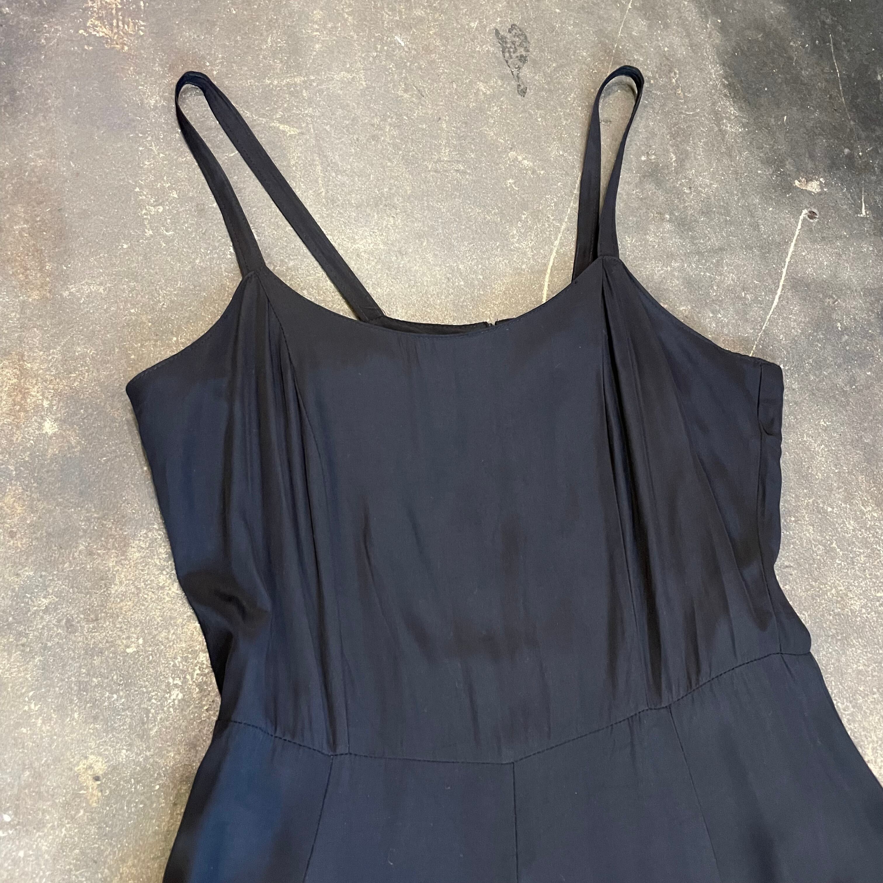 真っ黒なキャミソールタイプのワンピースです。中に合わせるアイテム次第でがらりと印象の変わる楽しい一着です。