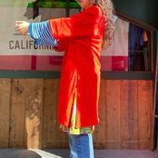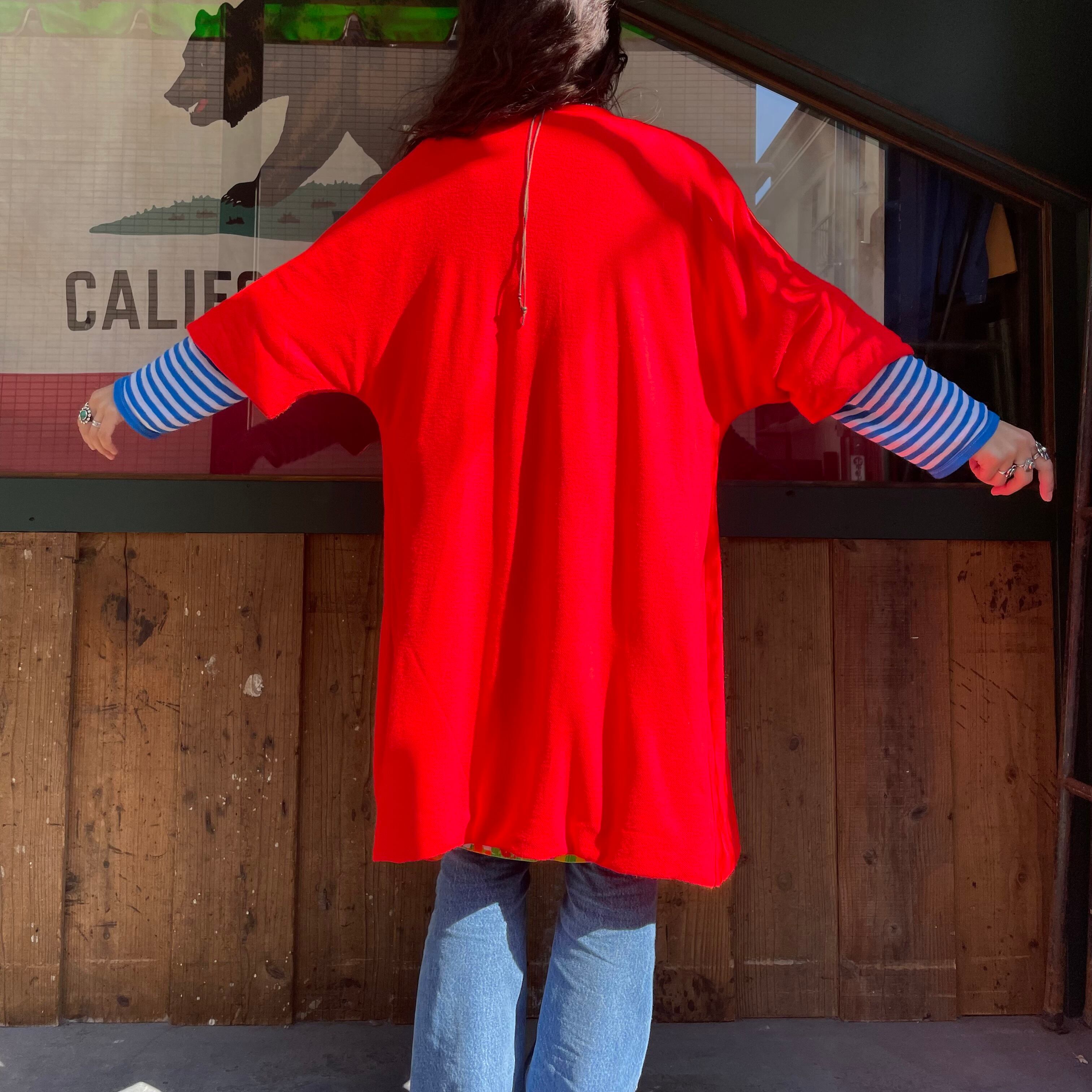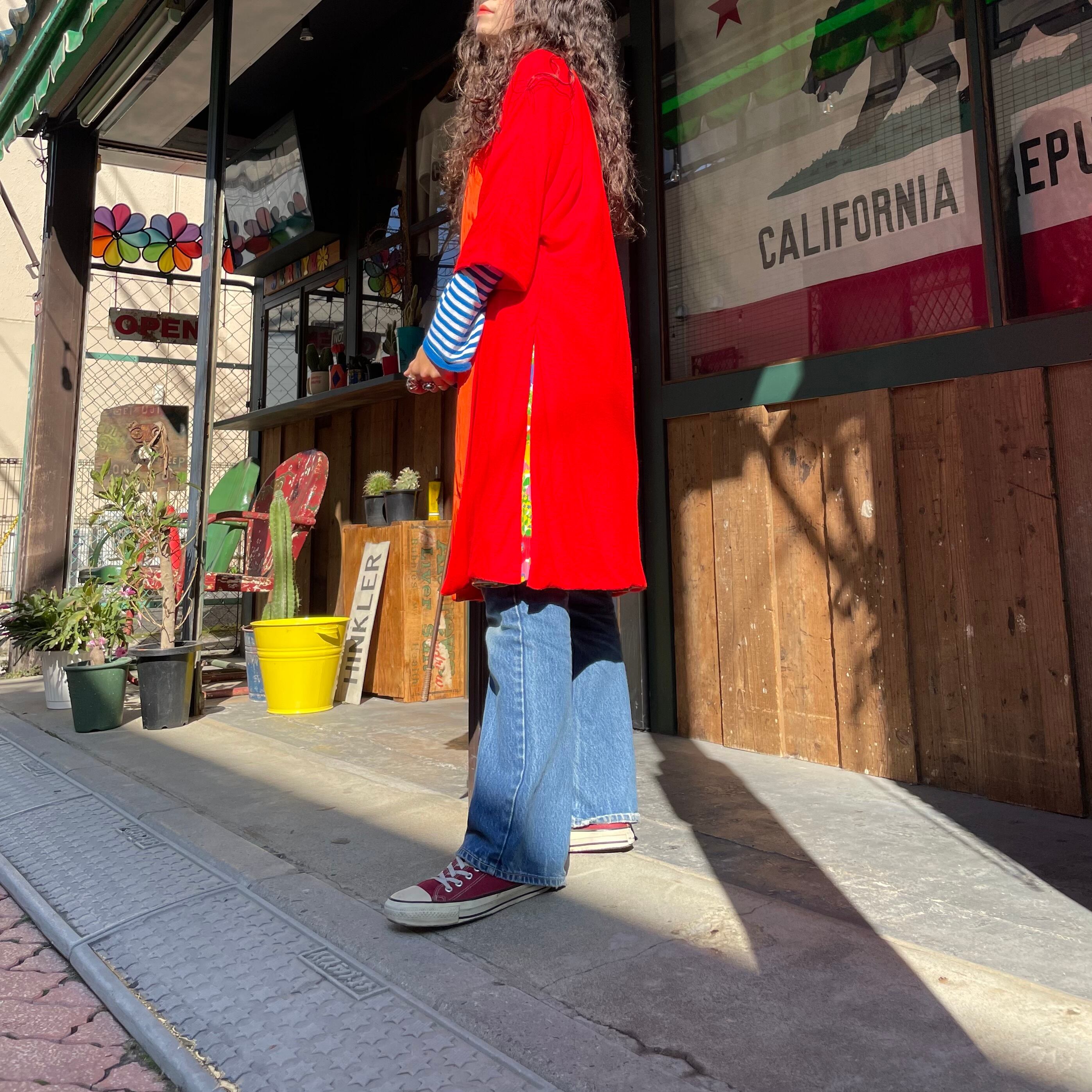 5〜6分丈くらいの袖で襟も無く前も開けっぱなし、再度にスリットのある少し不思議な雰囲気が魅力的な一枚です。