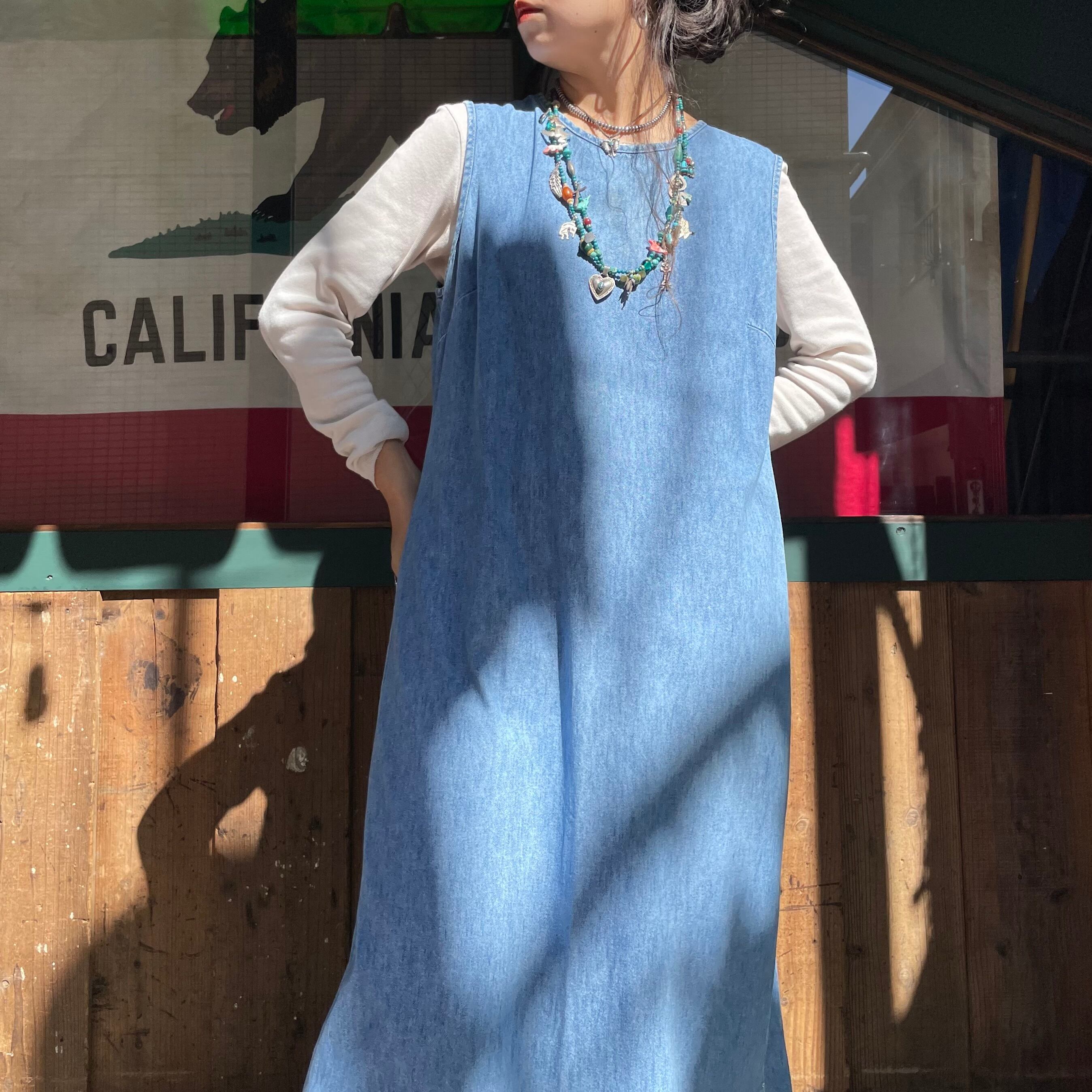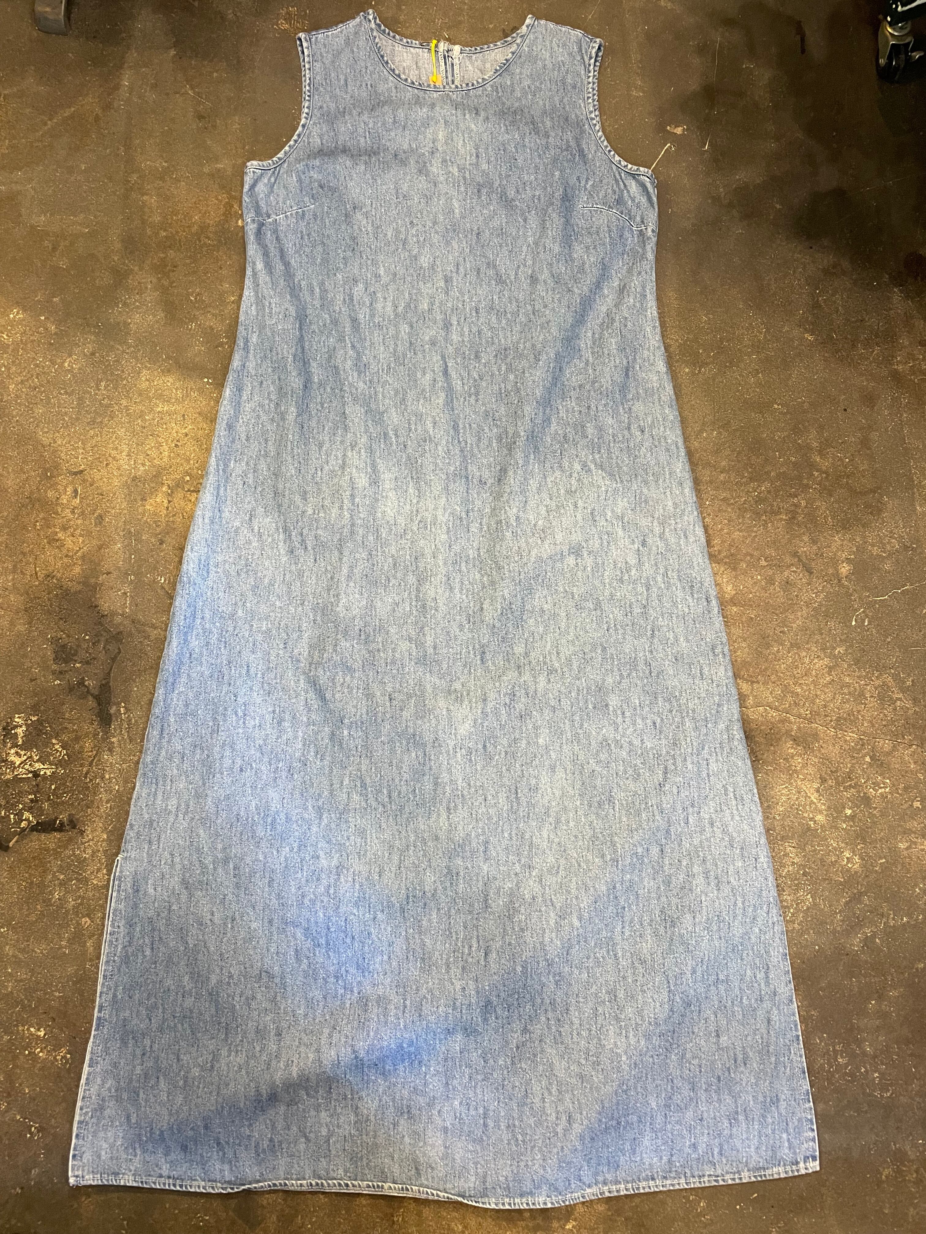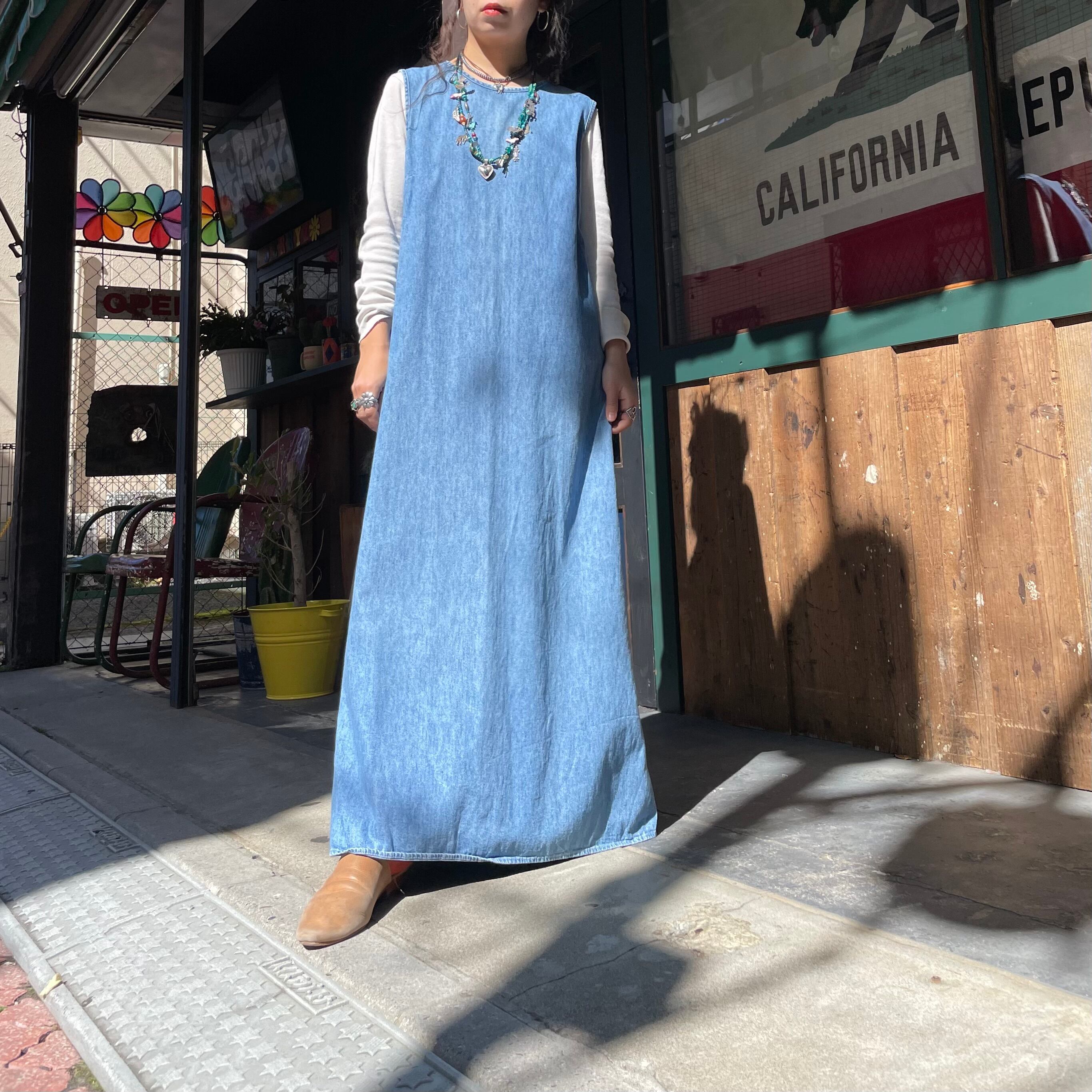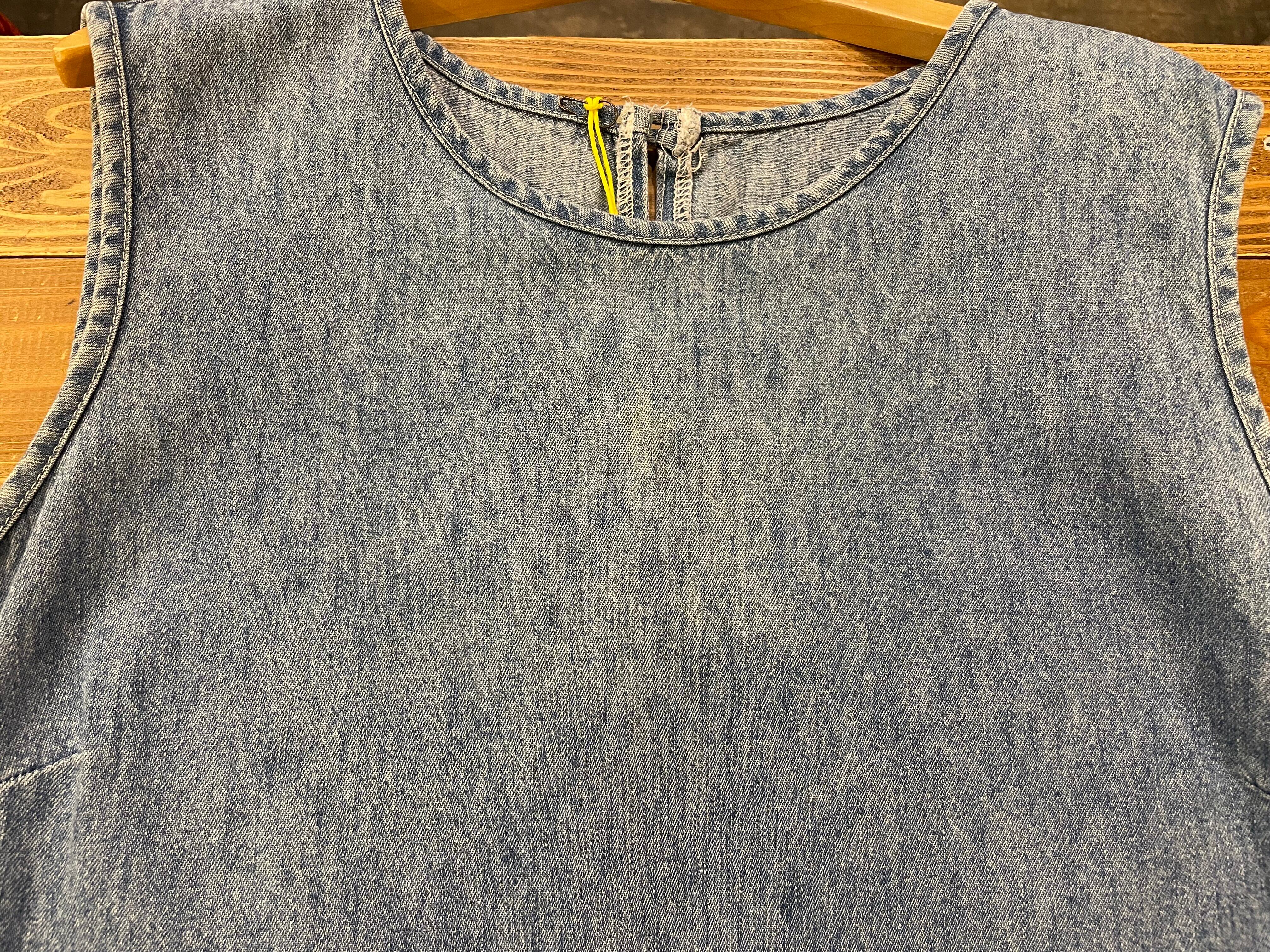 シンプルなデニムのノースリーブワンピースです。ここまでロングな丈感のものは珍しいのではないかと思います。