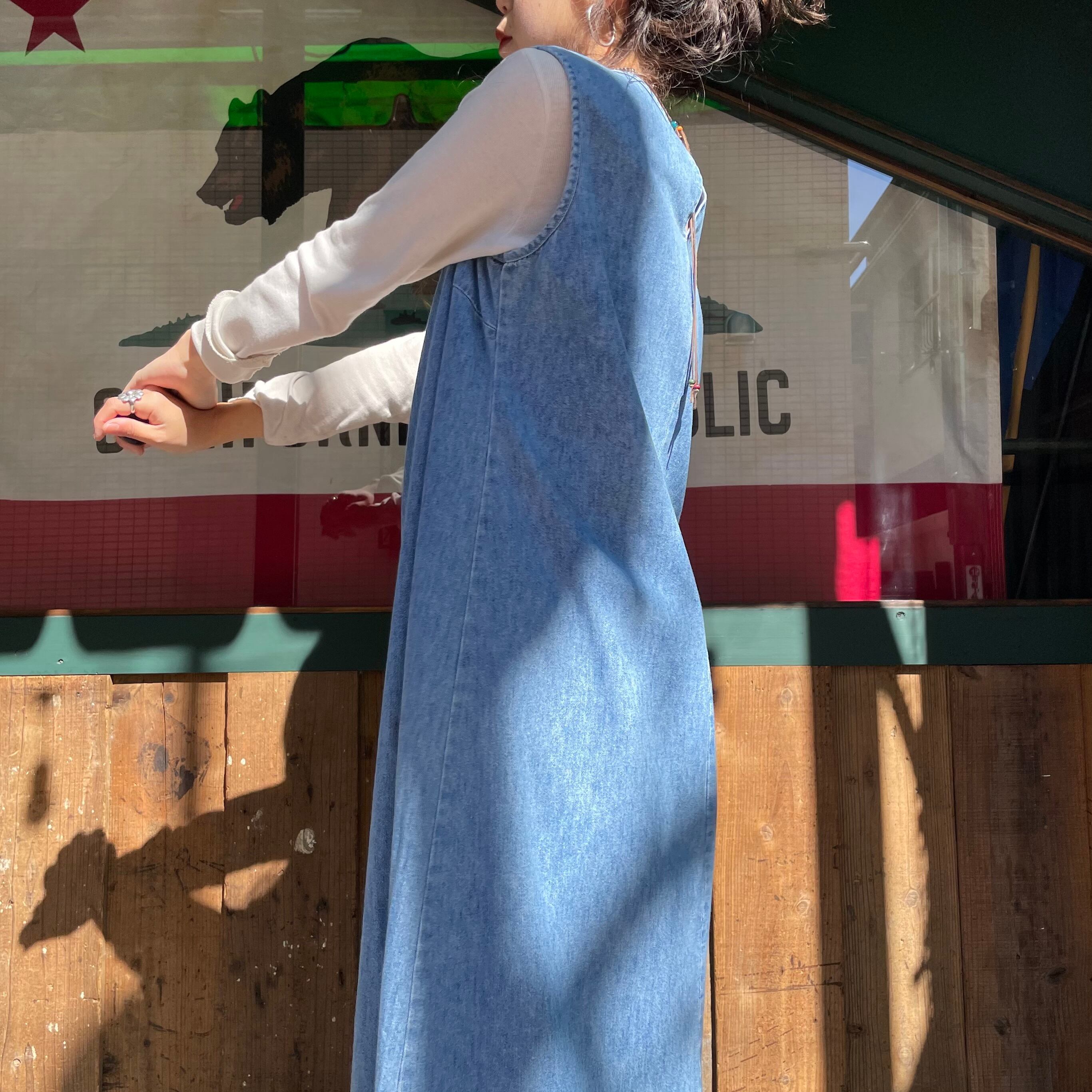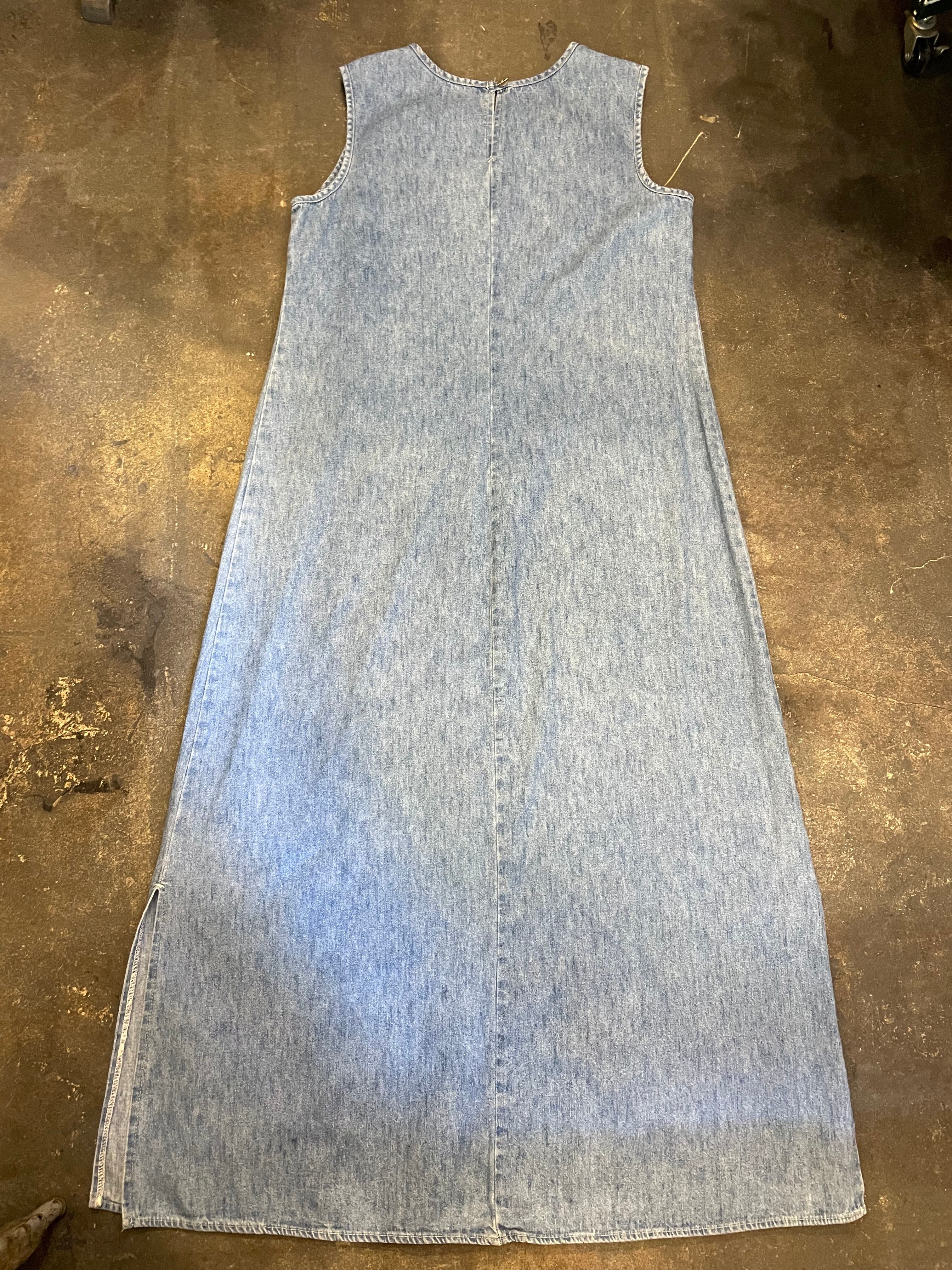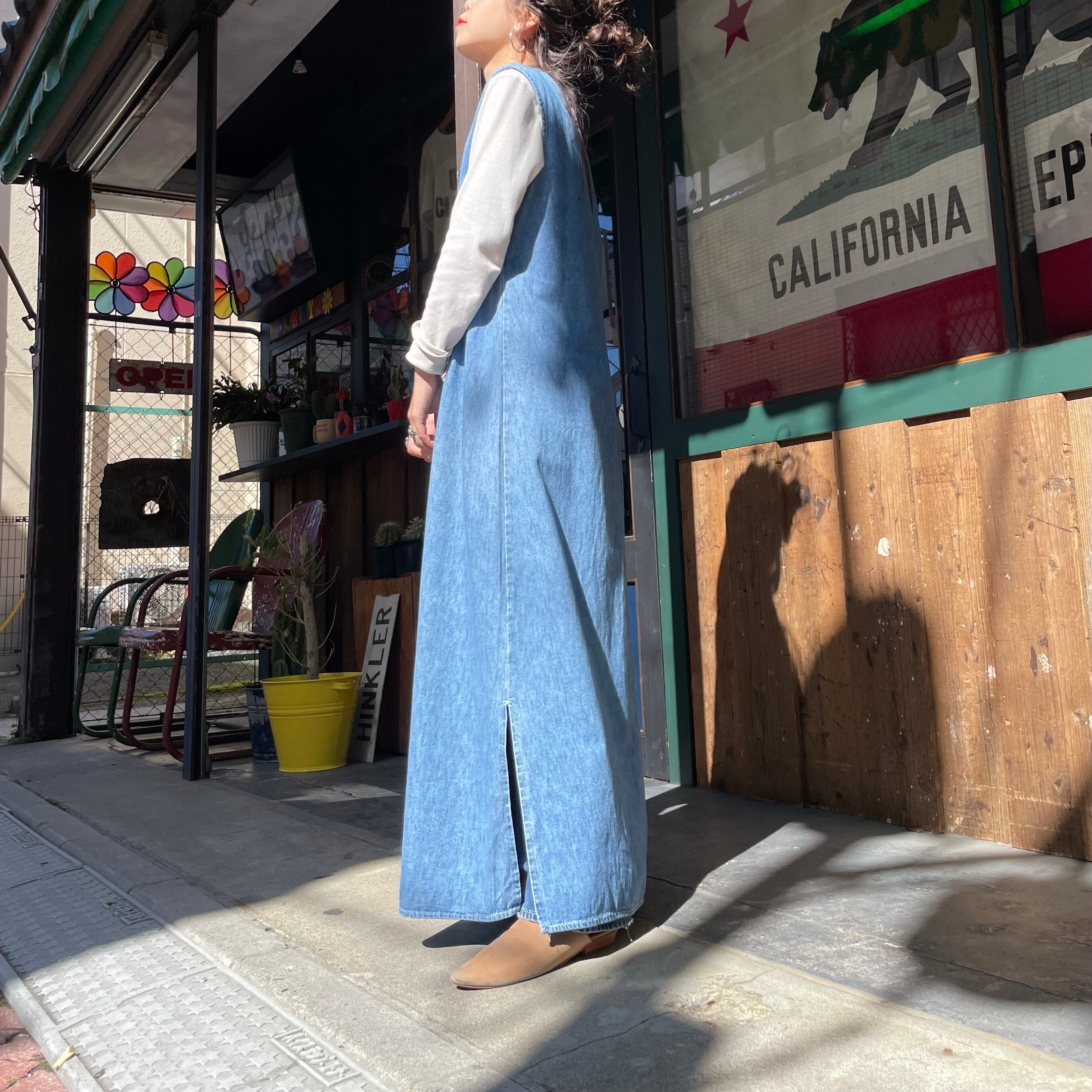 シンプルなデニムのノースリーブワンピースです。ここまでロングな丈感のものは珍しいのではないかと思います。