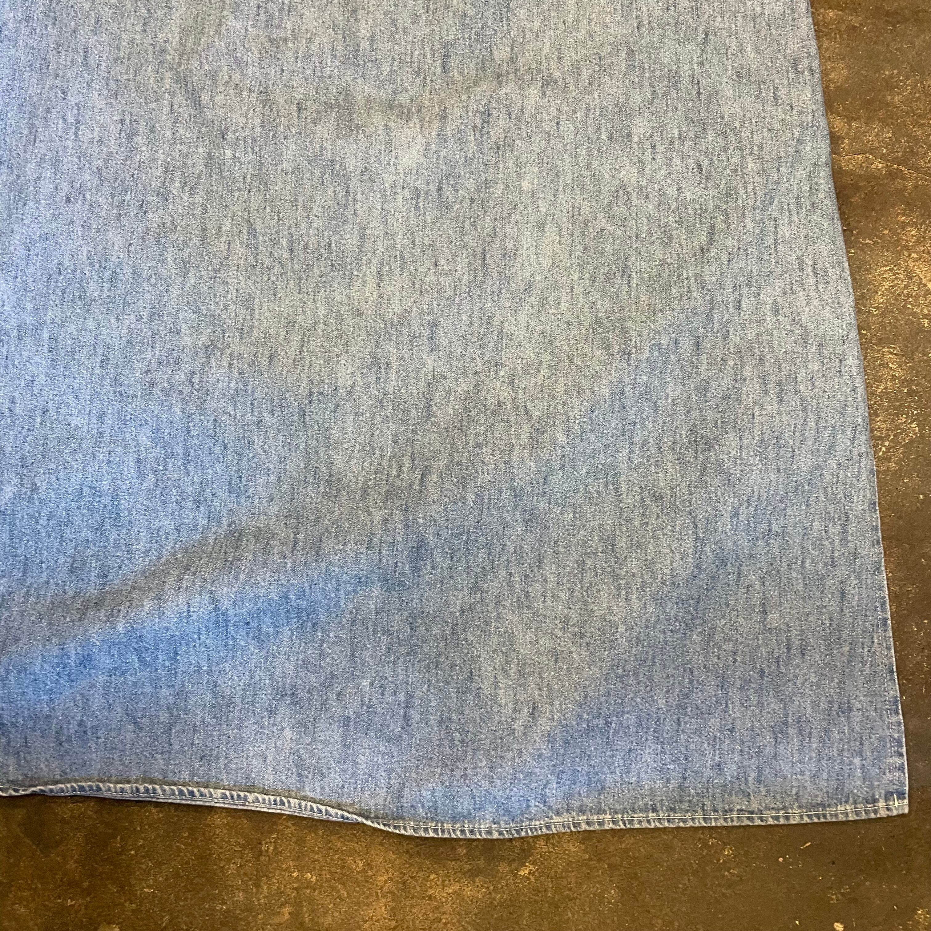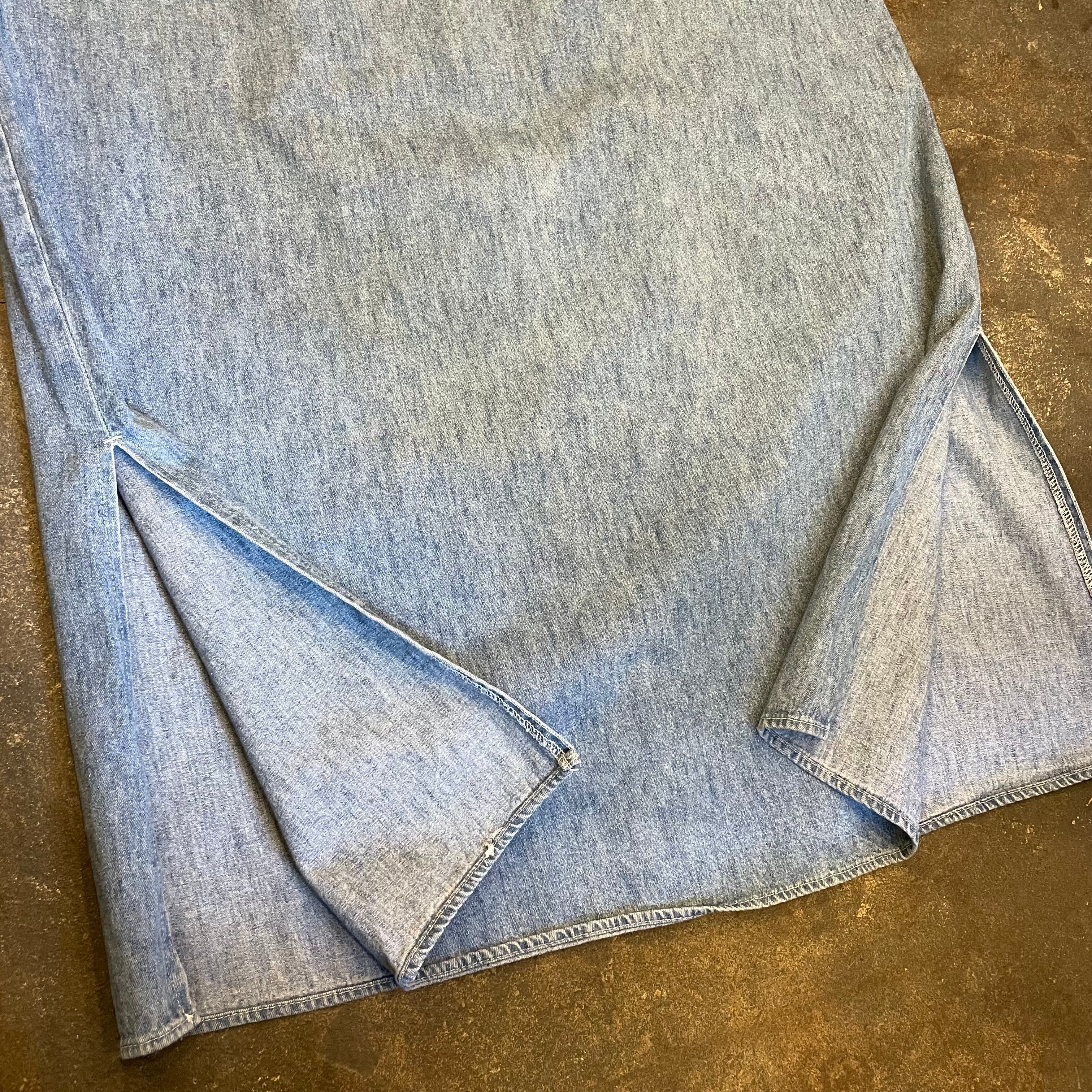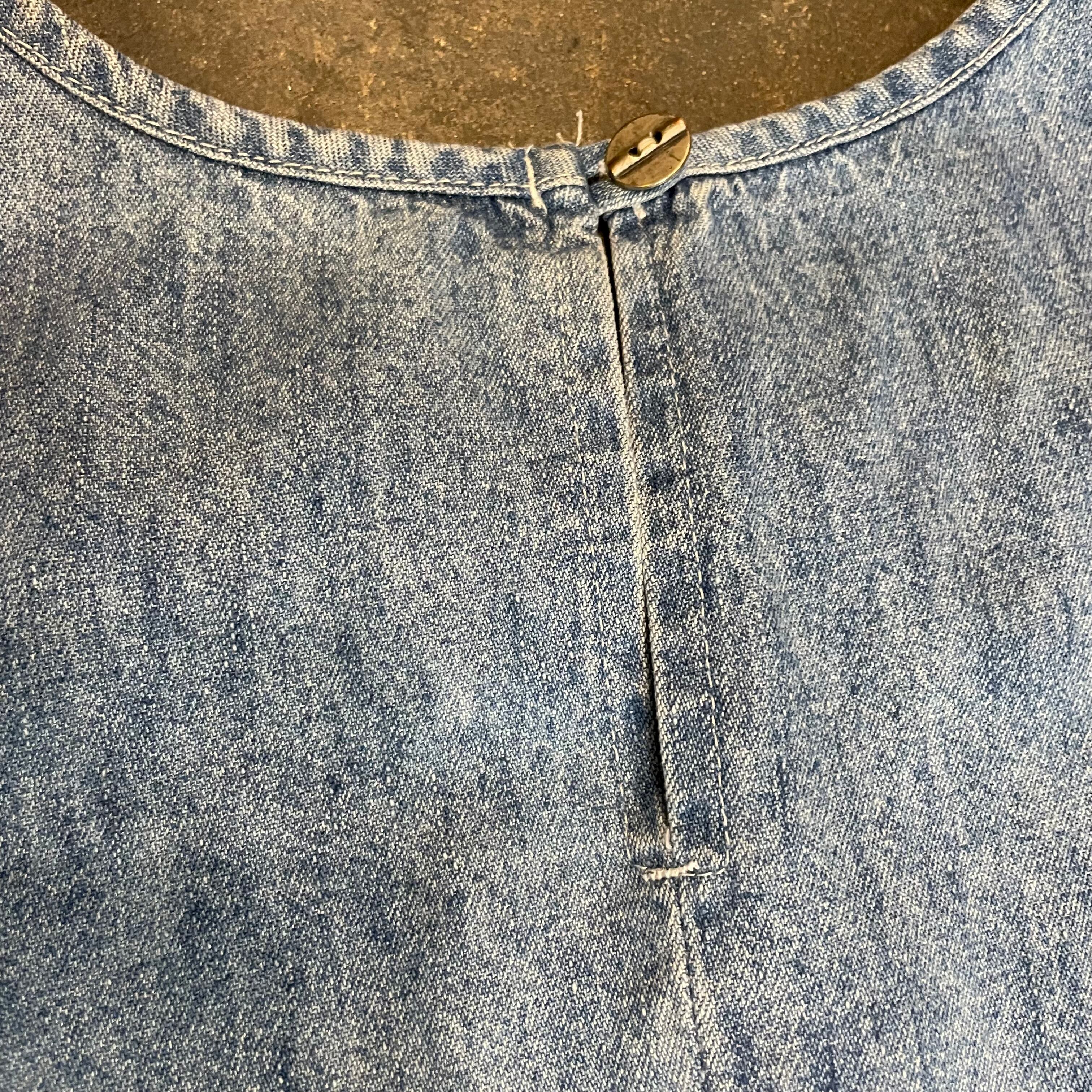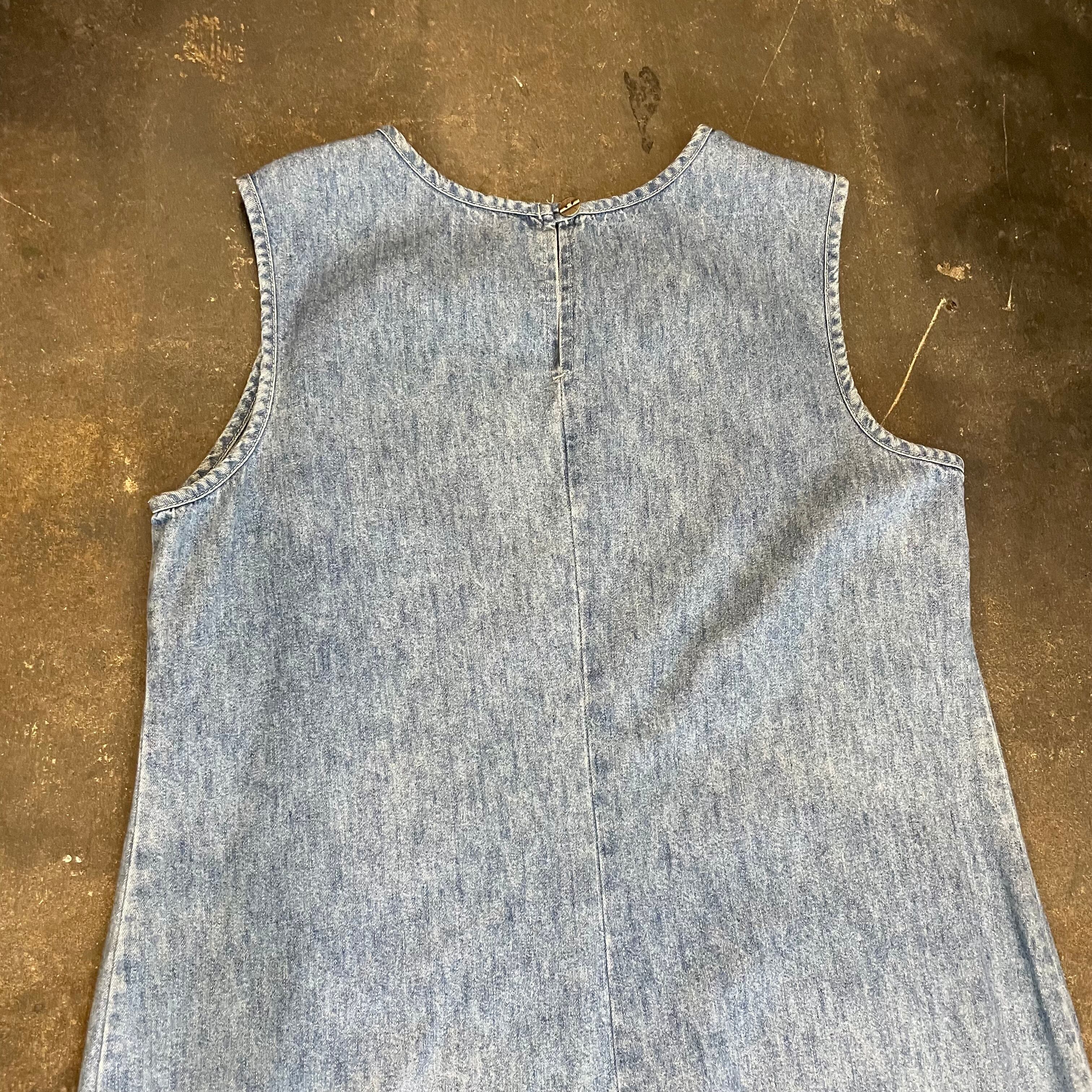 シンプルなデニムのノースリーブワンピースです。ここまでロングな丈感のものは珍しいのではないかと思います。