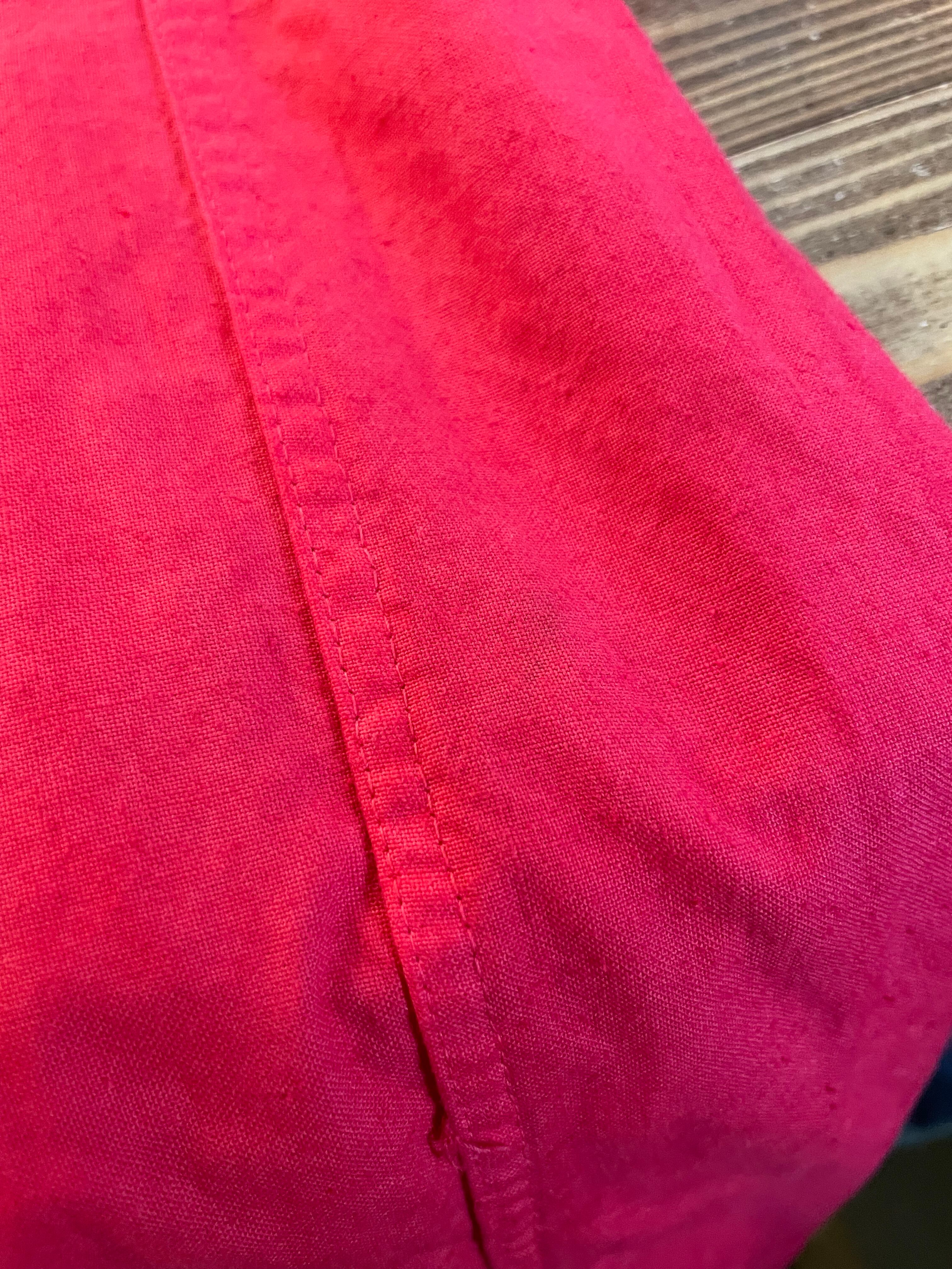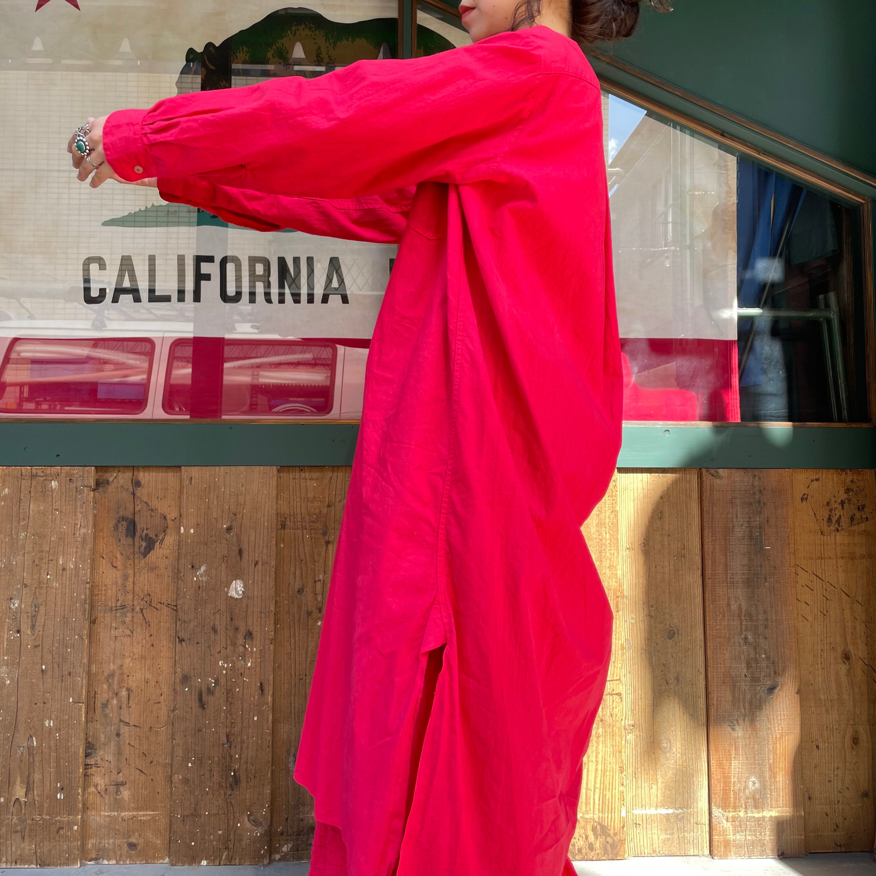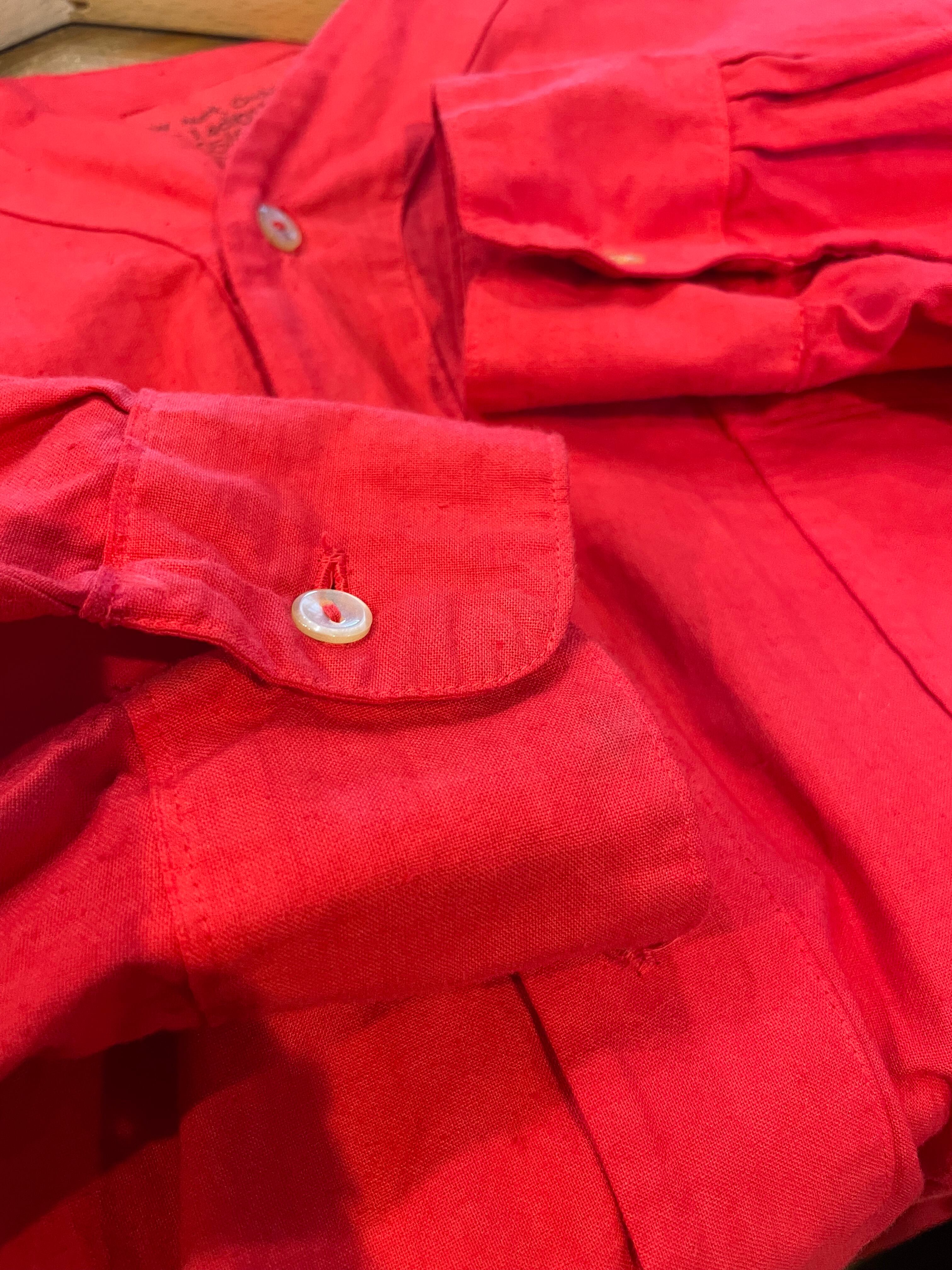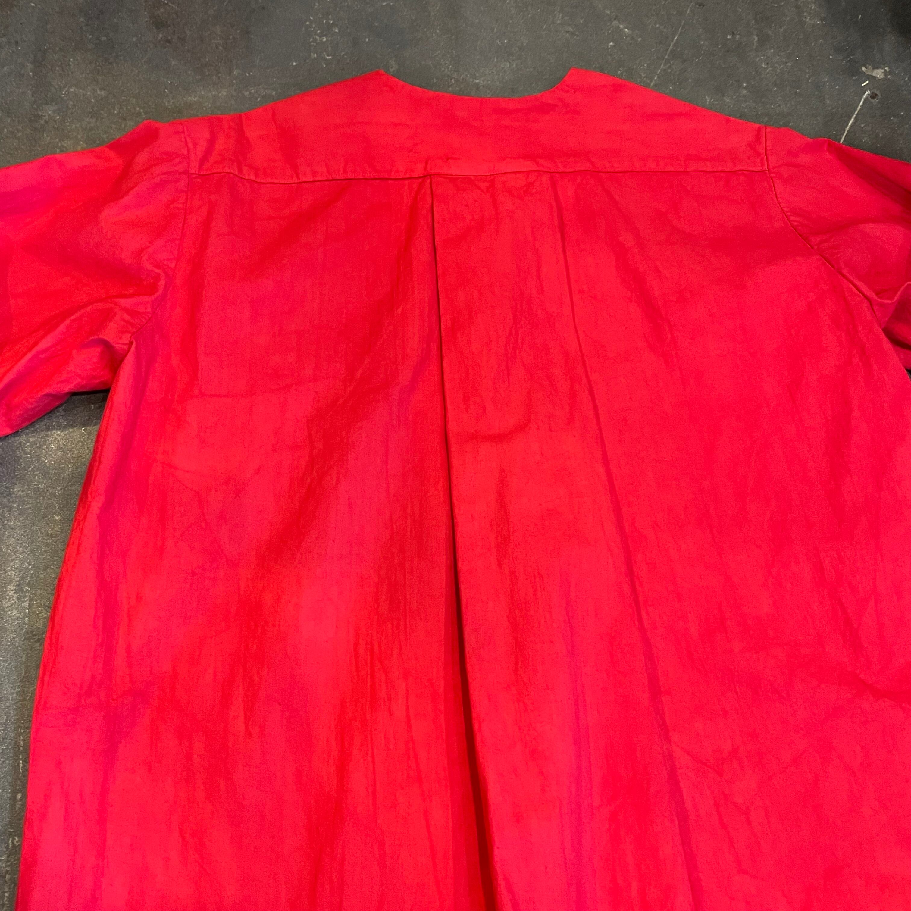 チューリップのような春らしいピンク色がかわいい後染めのグランパシャツです。
