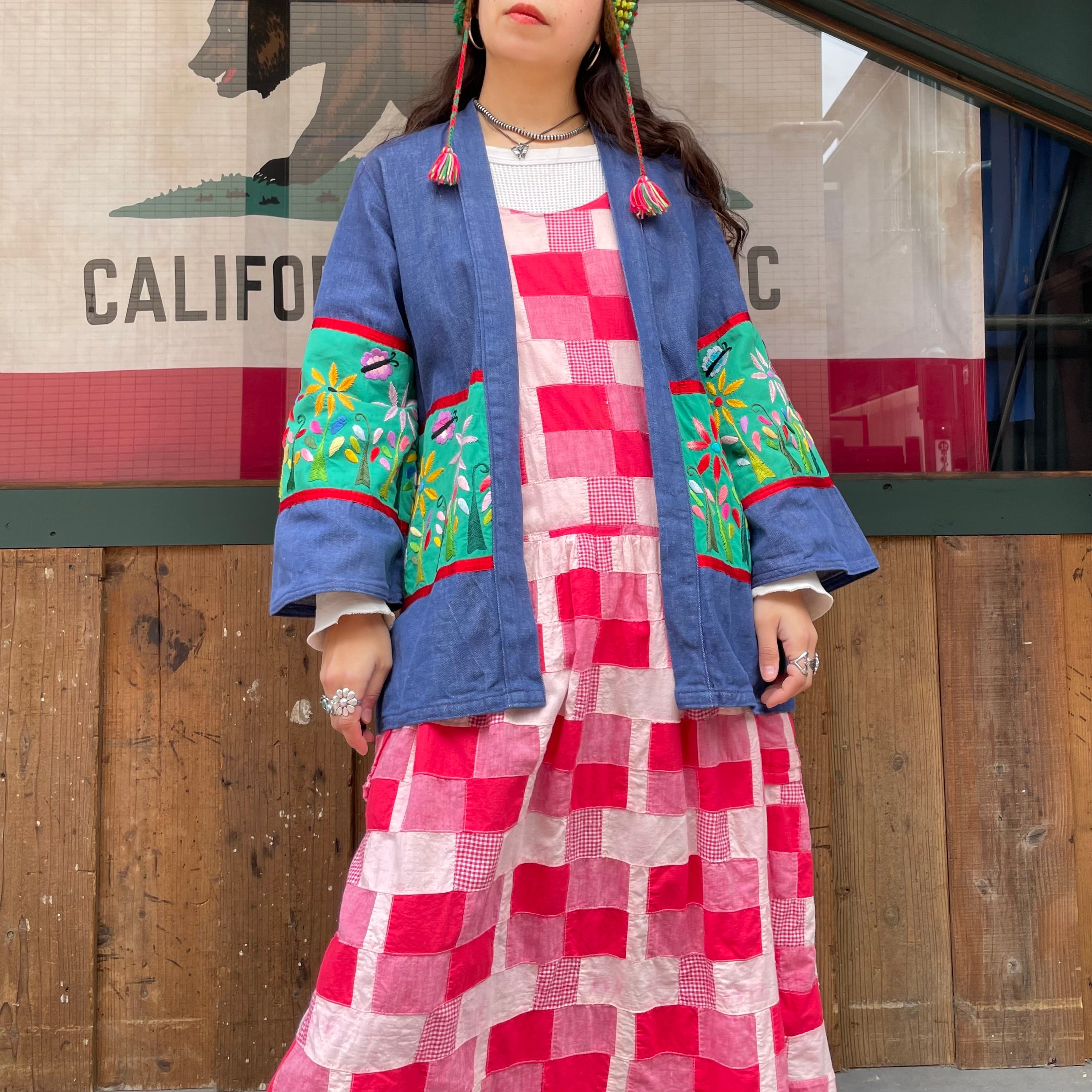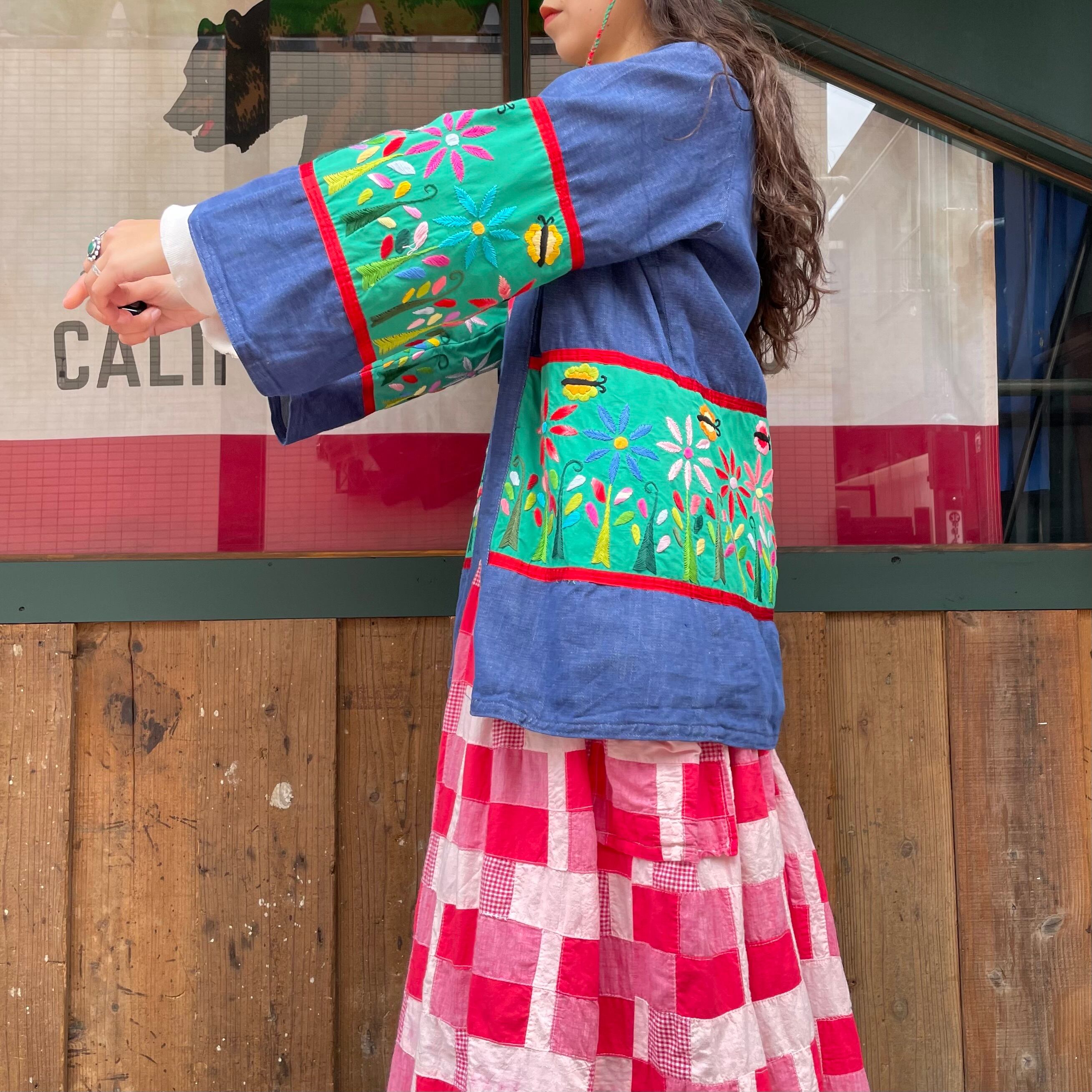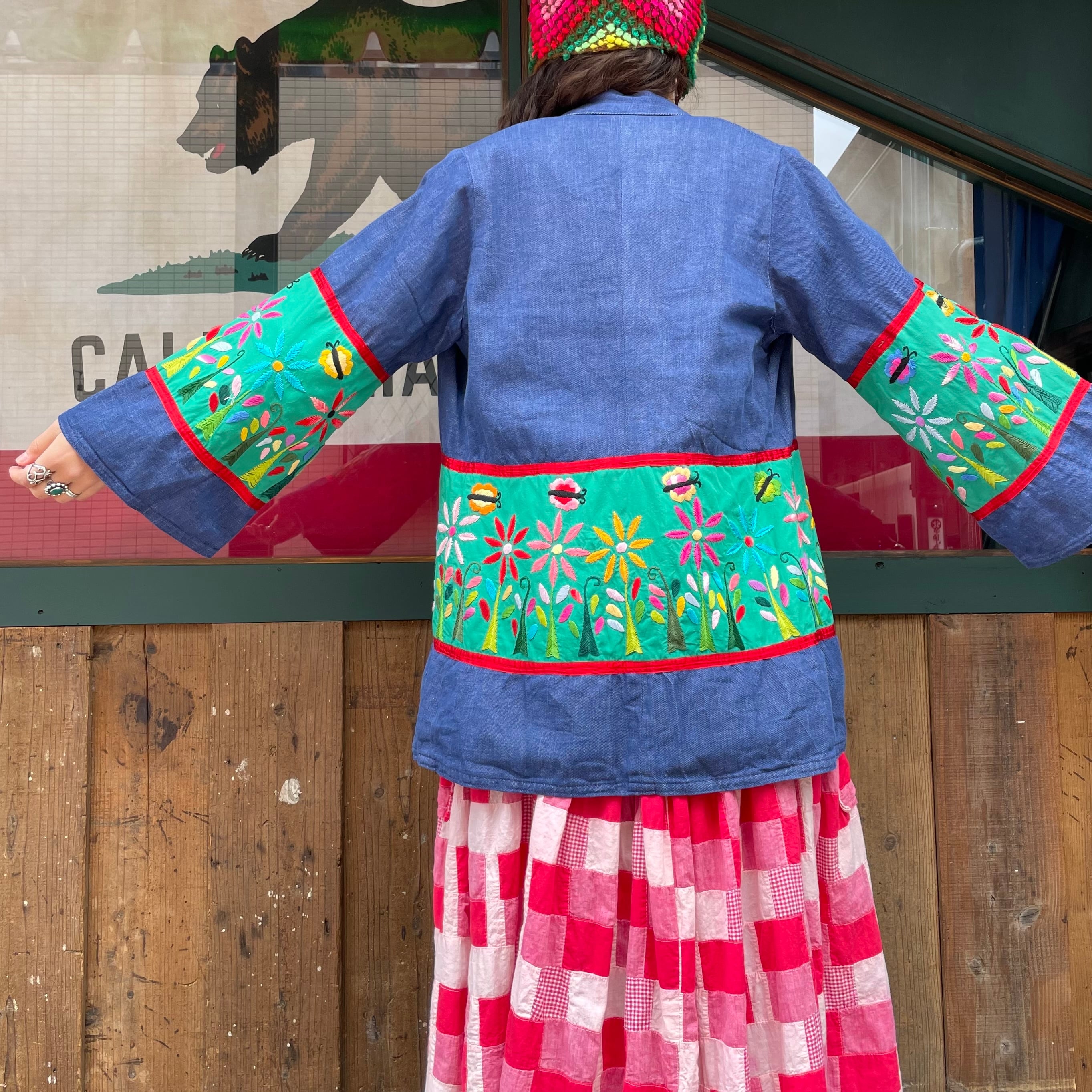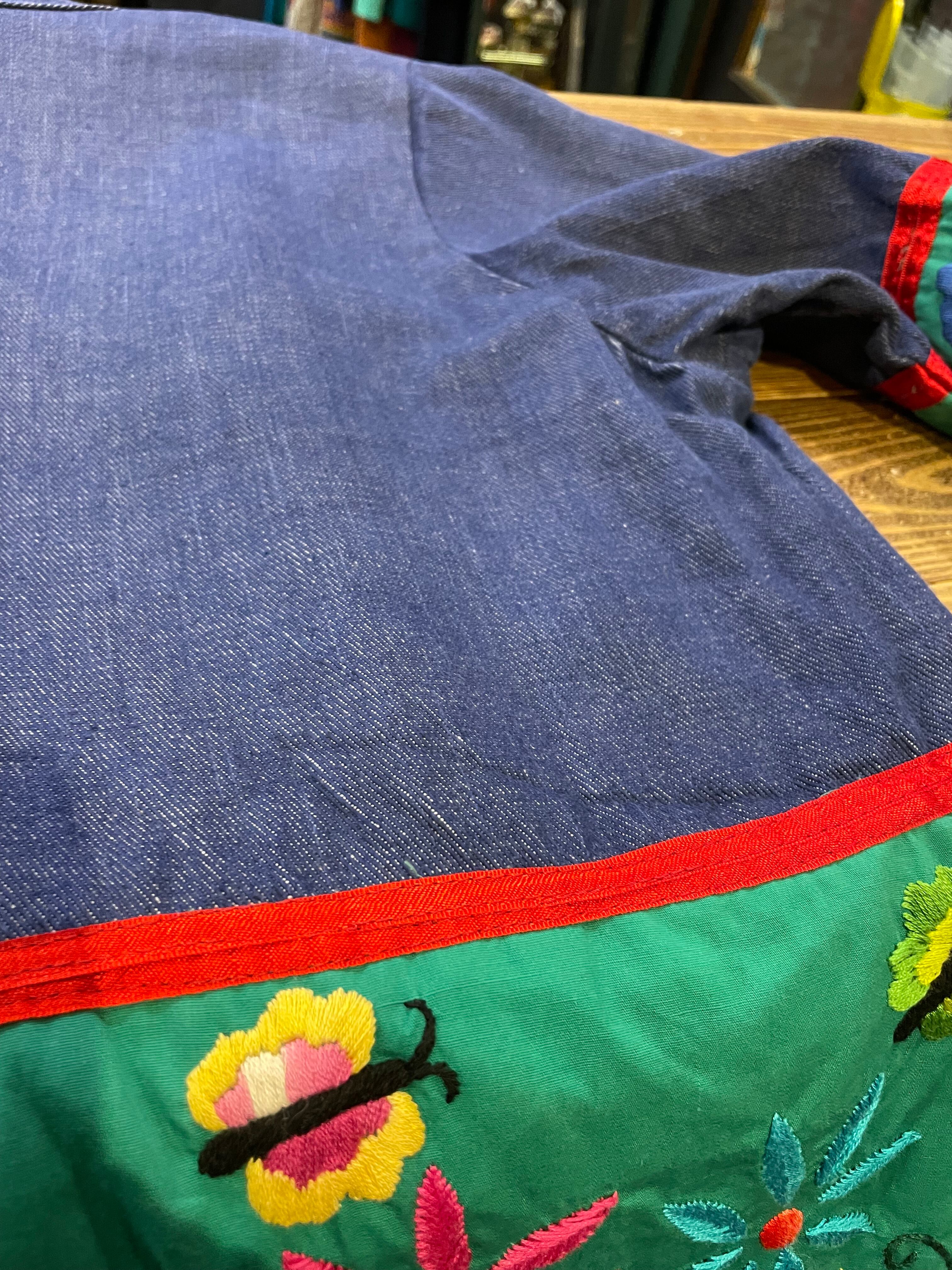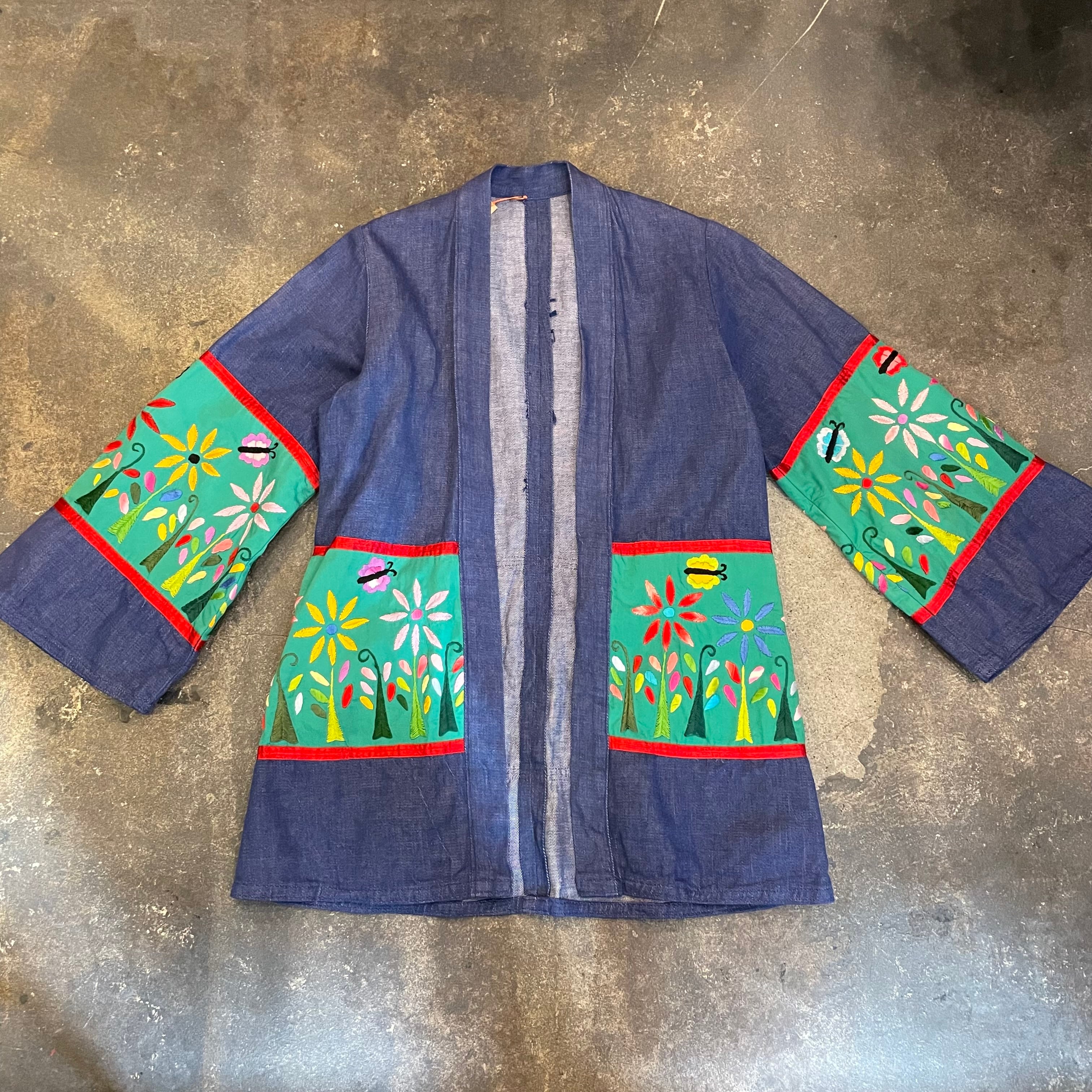 デニムの羽織に手刺繍の生地を切り替えで付けてある誰かの力作であろうジャケットです。
