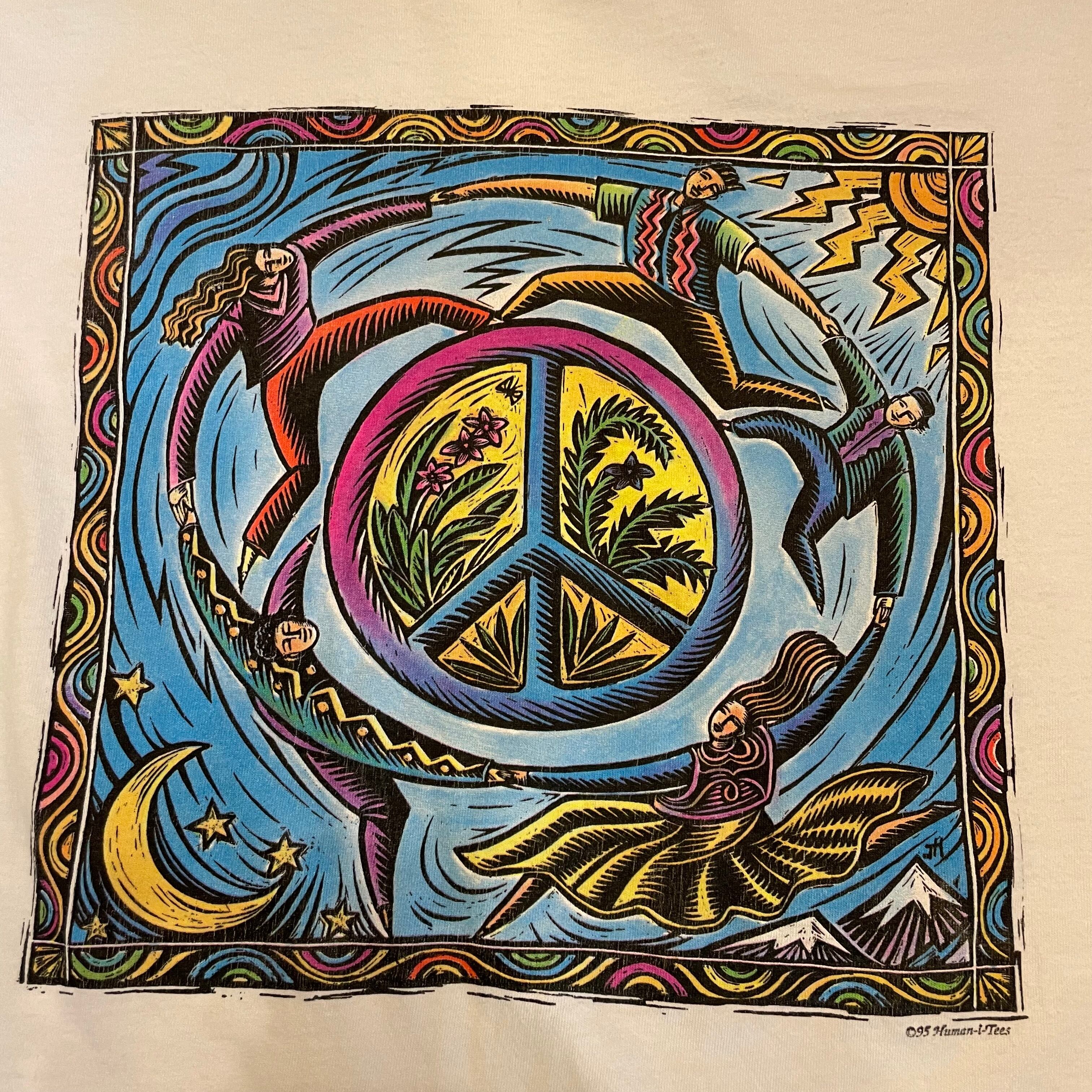 ピースマークにお花、蝶々、月と太陽、手を繋いで輪になる人たち、そしてカラフルな色合いで、とてもハッピーなイラストがかわいいですね。