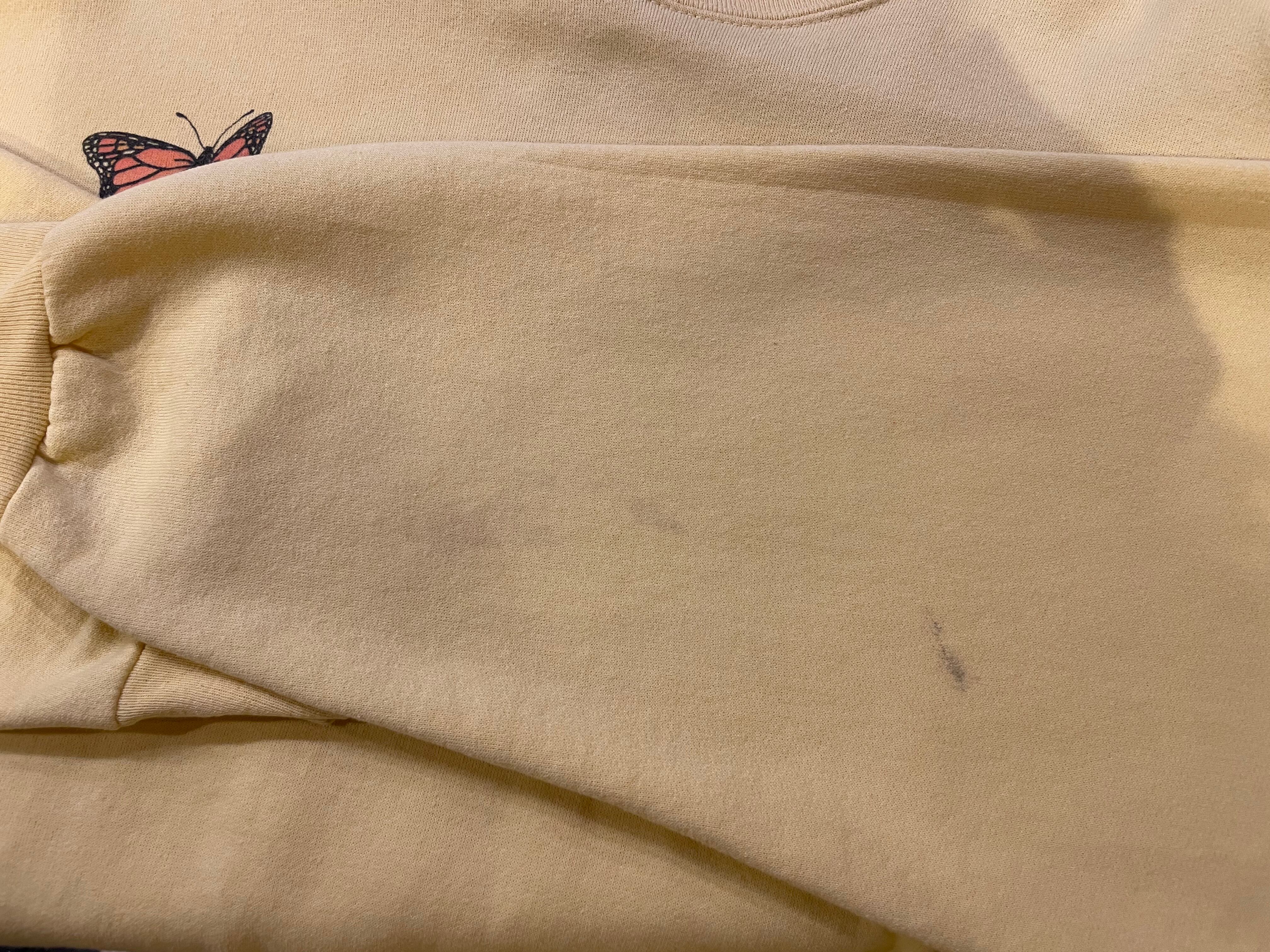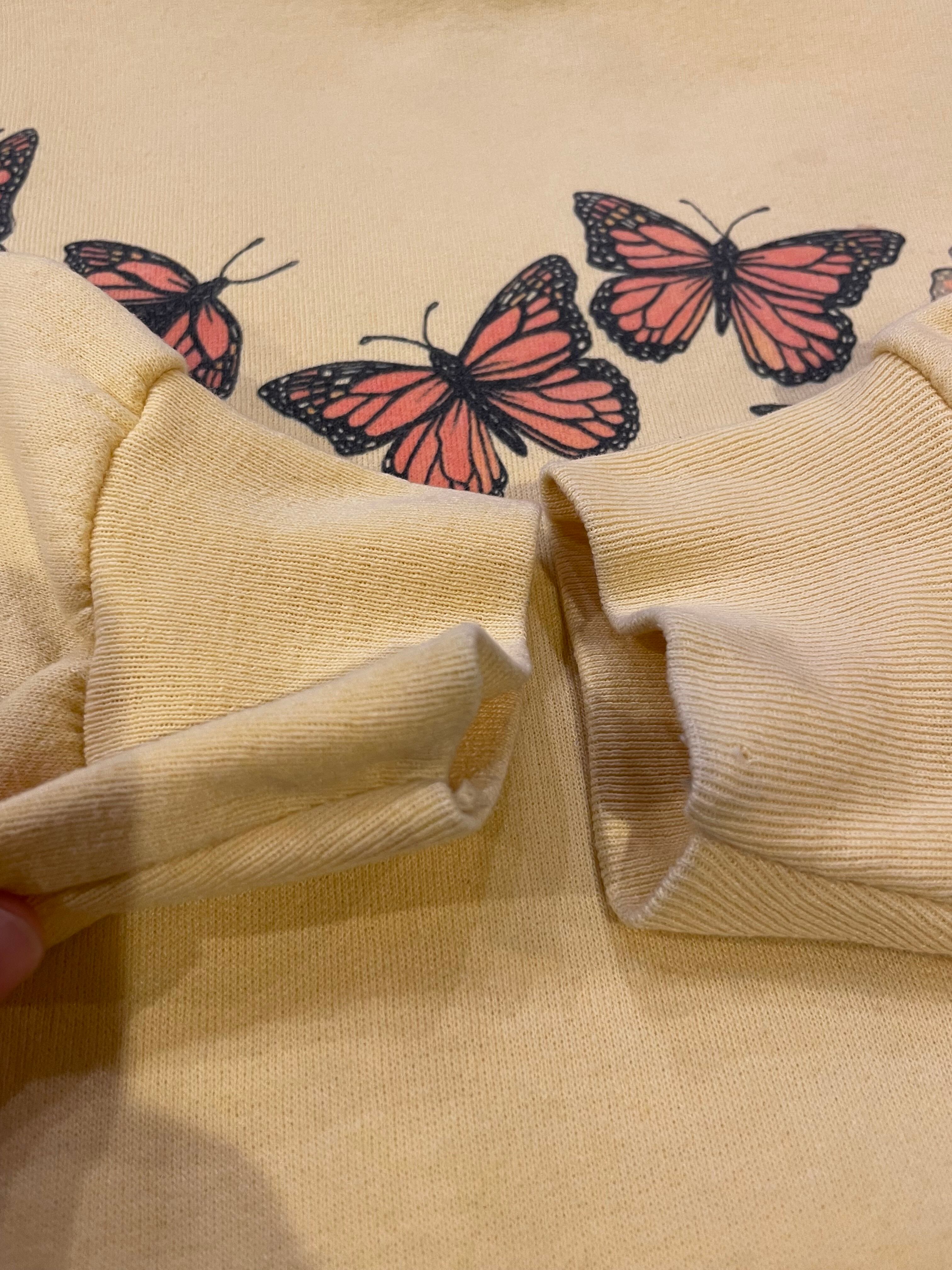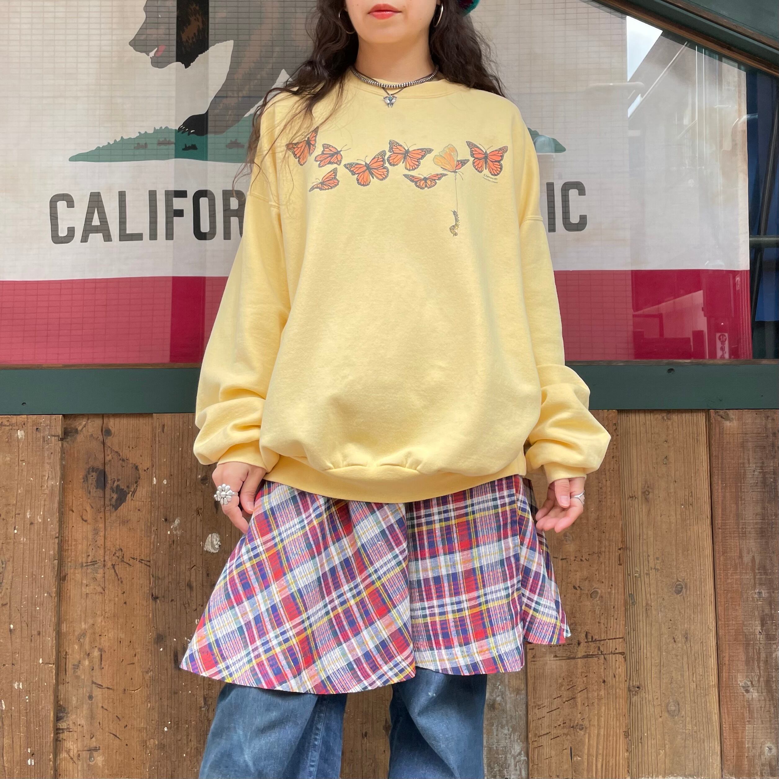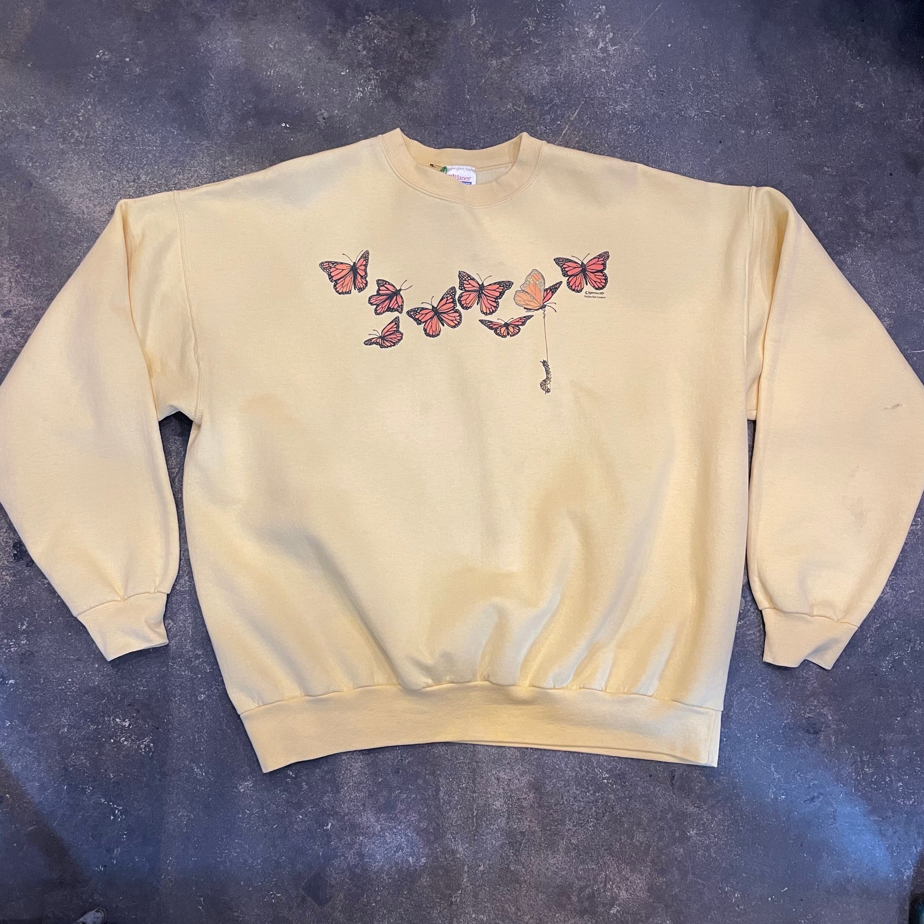 胸元に蝶々蝶々たちがたくさんいてかわいいスウェットです。幼虫がいたり、飛んでる様子などリアルめなタッチのイラストがかっこいいですね。