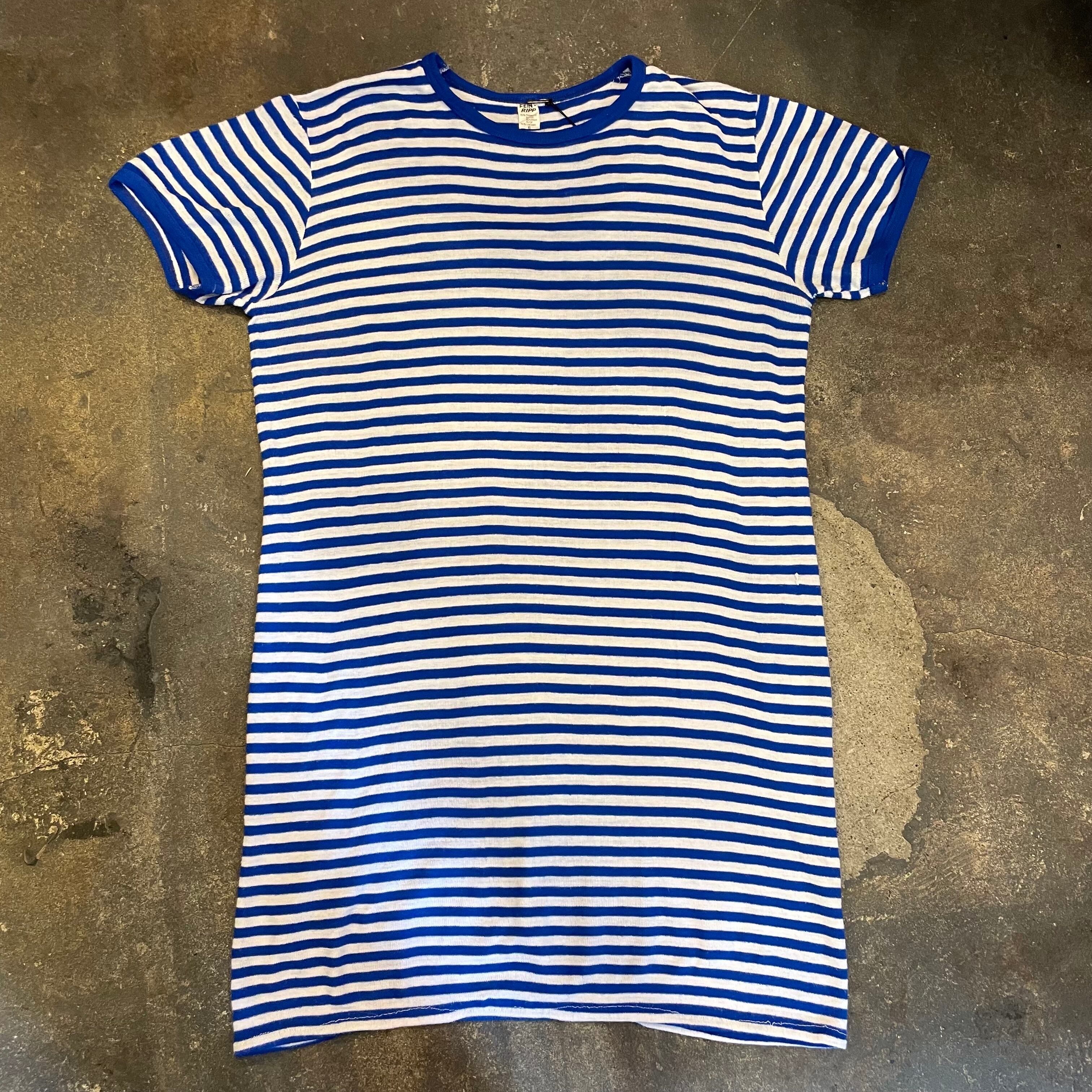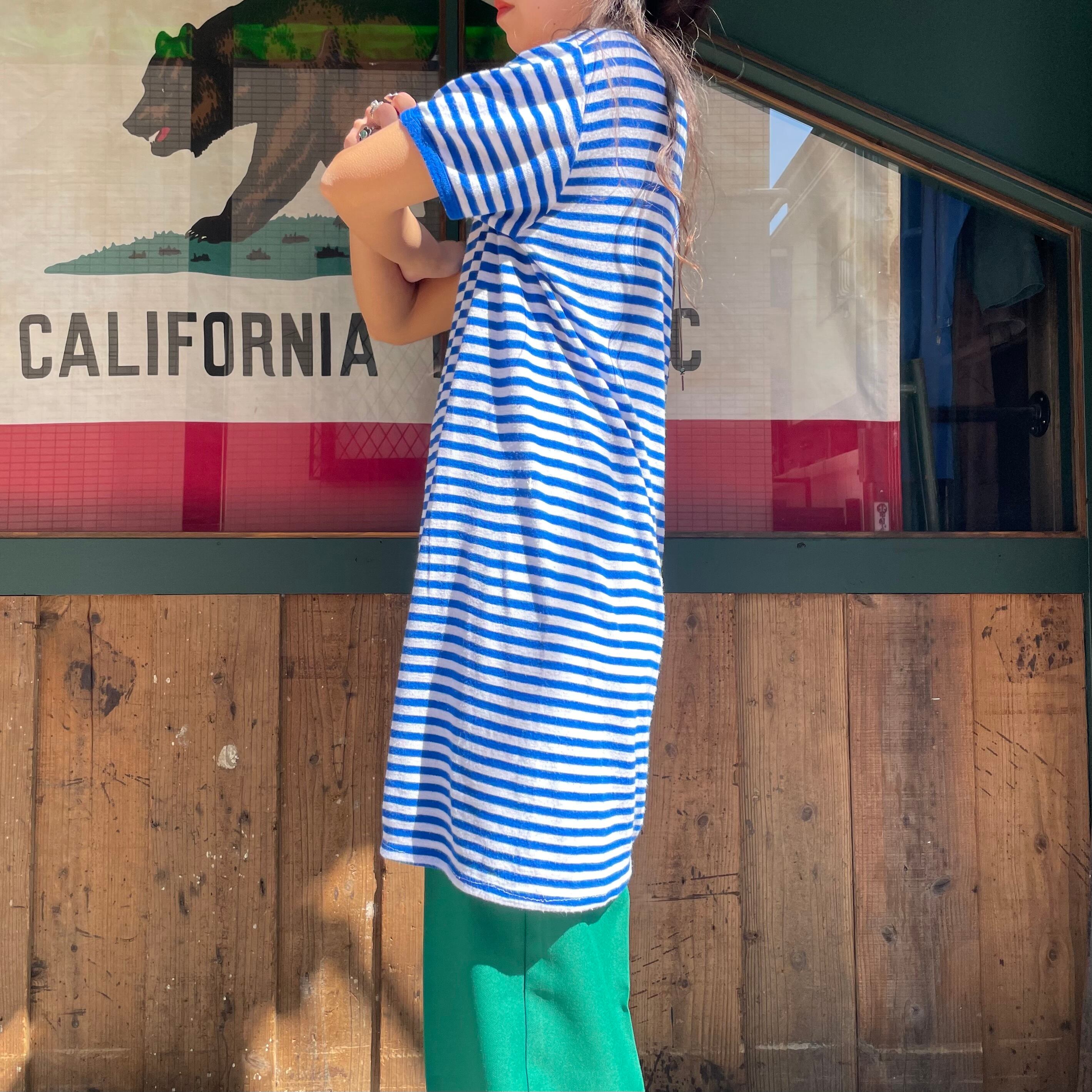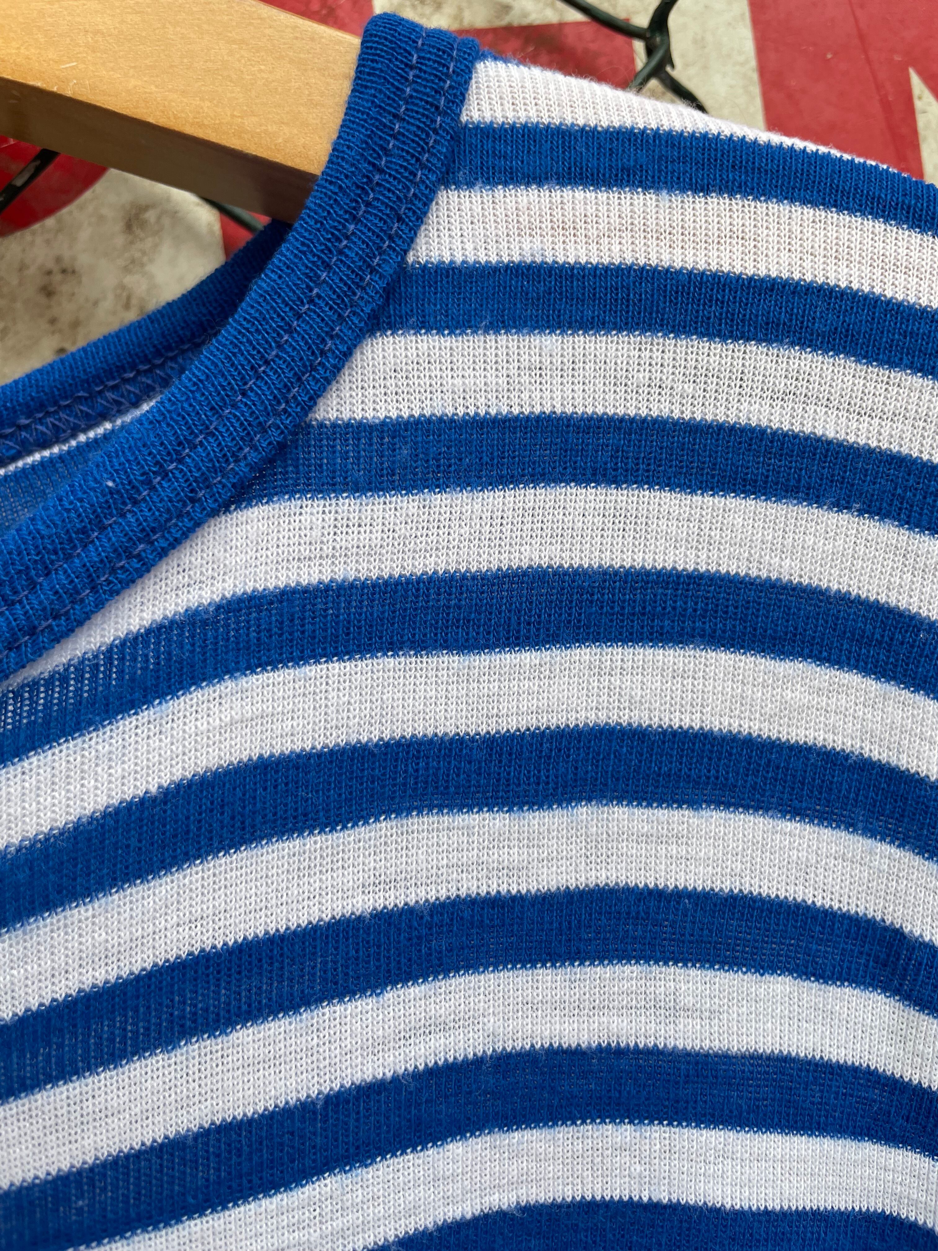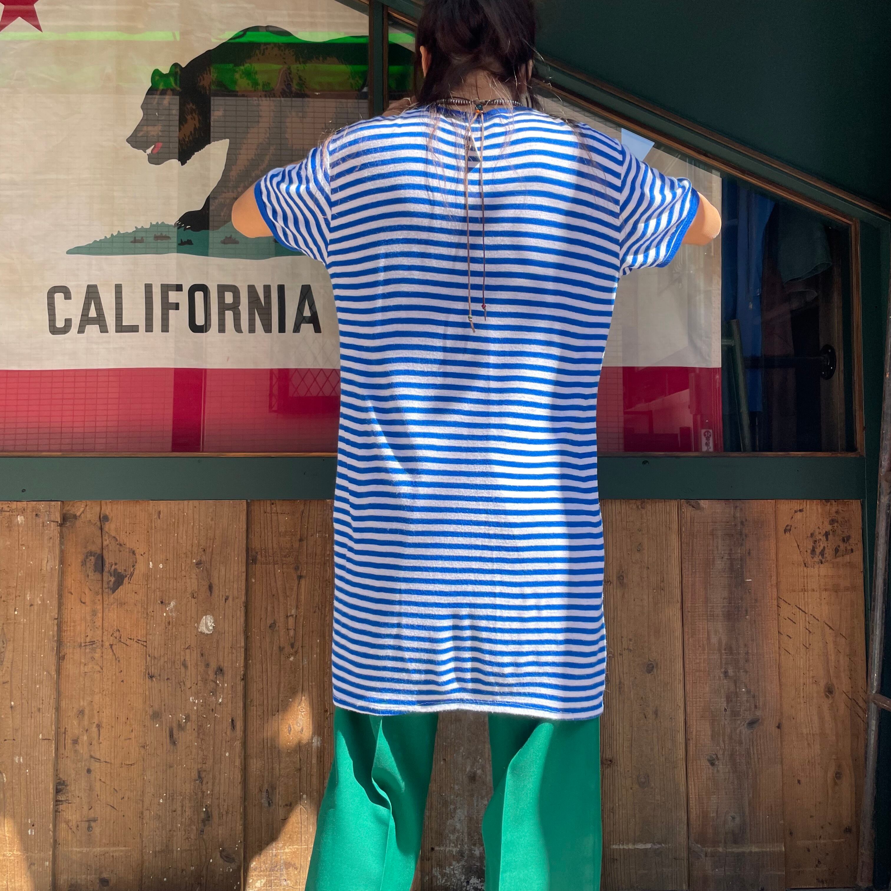 細かめの青×白のボーダーがとてもポップでかわいいですね。上にTシャツを重ねたりしてチラッと見せるだけでもコーディネートの雰囲気が変わってくれたり、夏はショートパンツを合わせて一枚でウエストバッグなどと合わせてもかわいいと思います!主役でも脇役でも使えておすすめです。