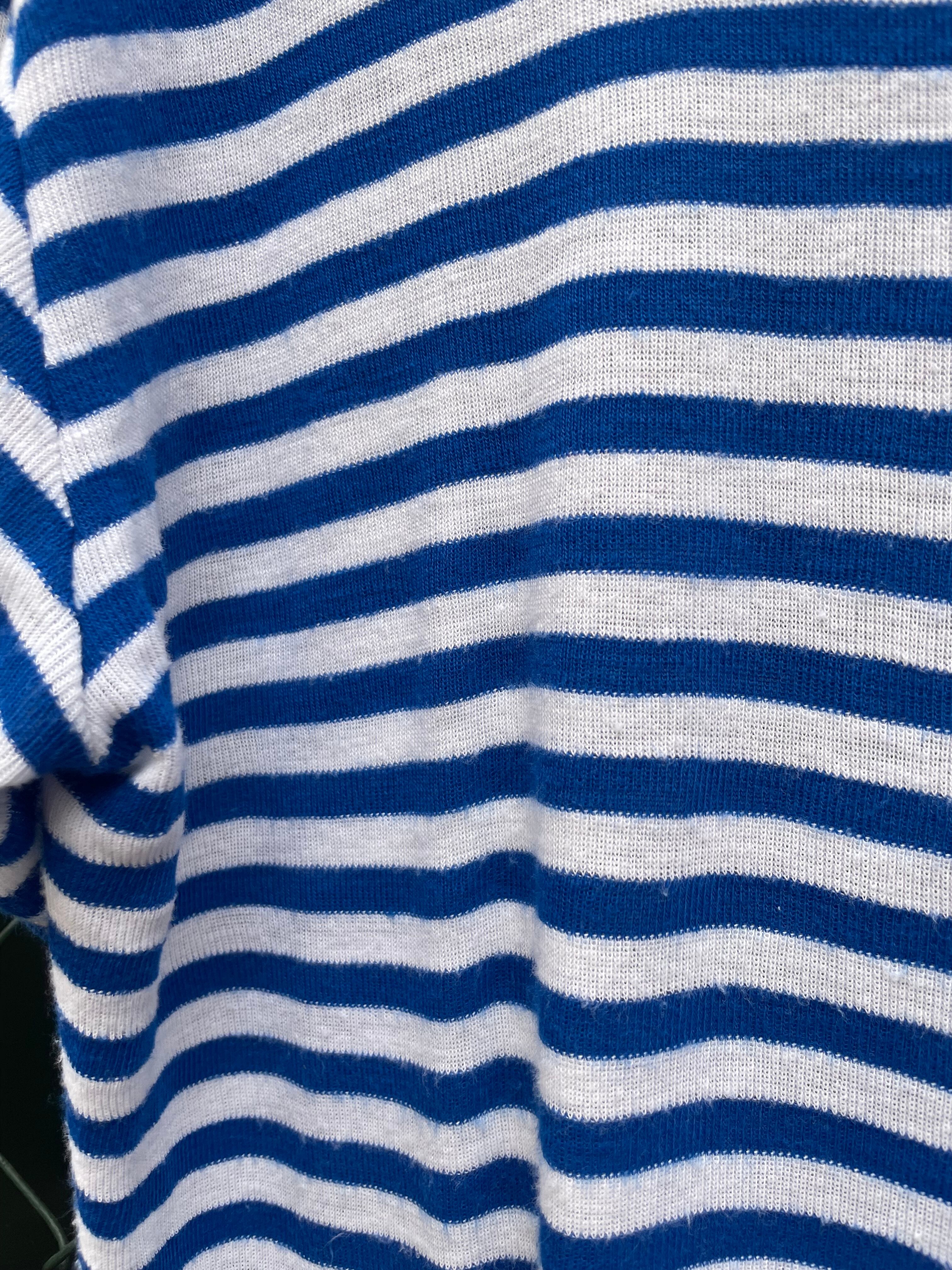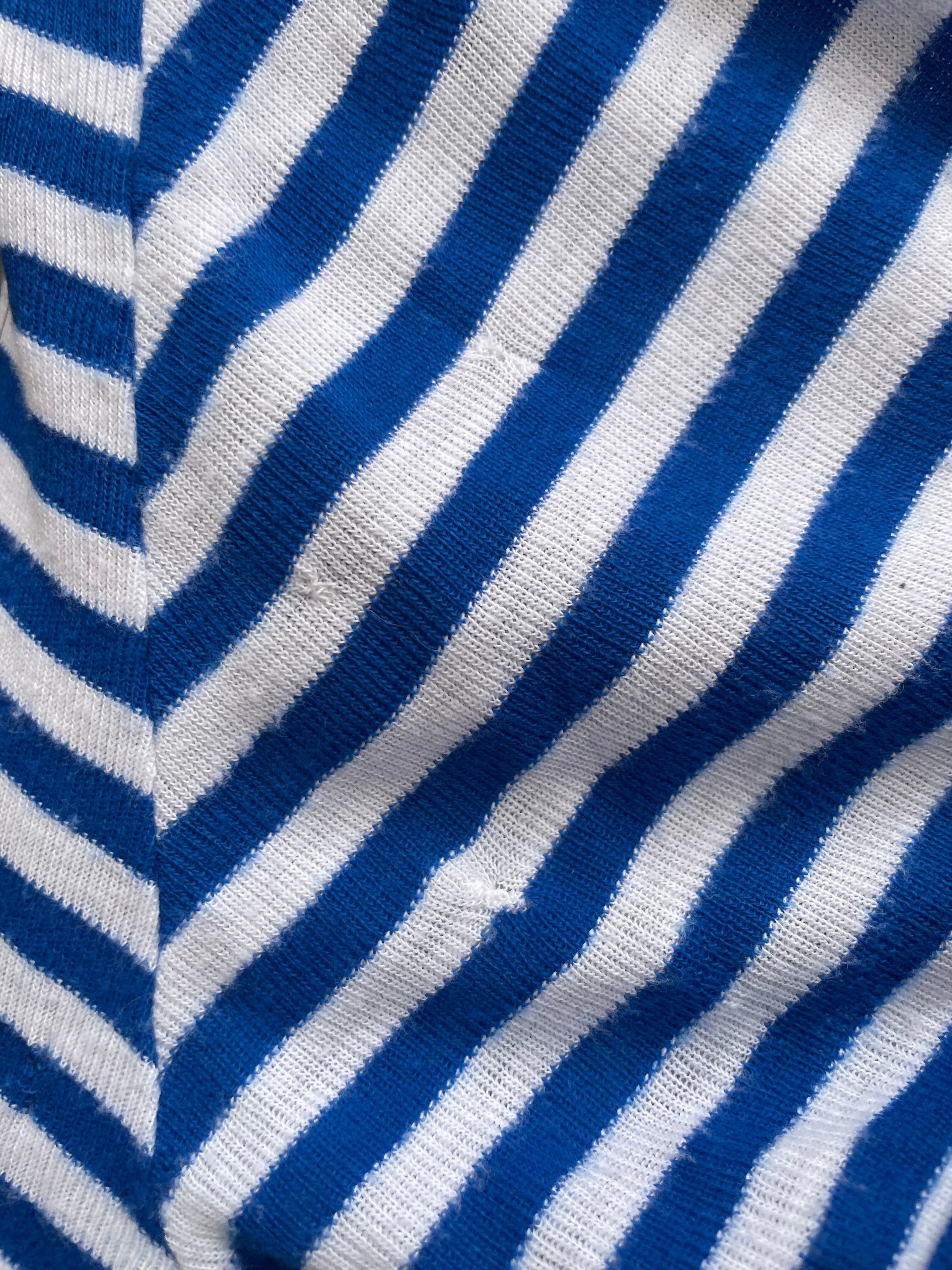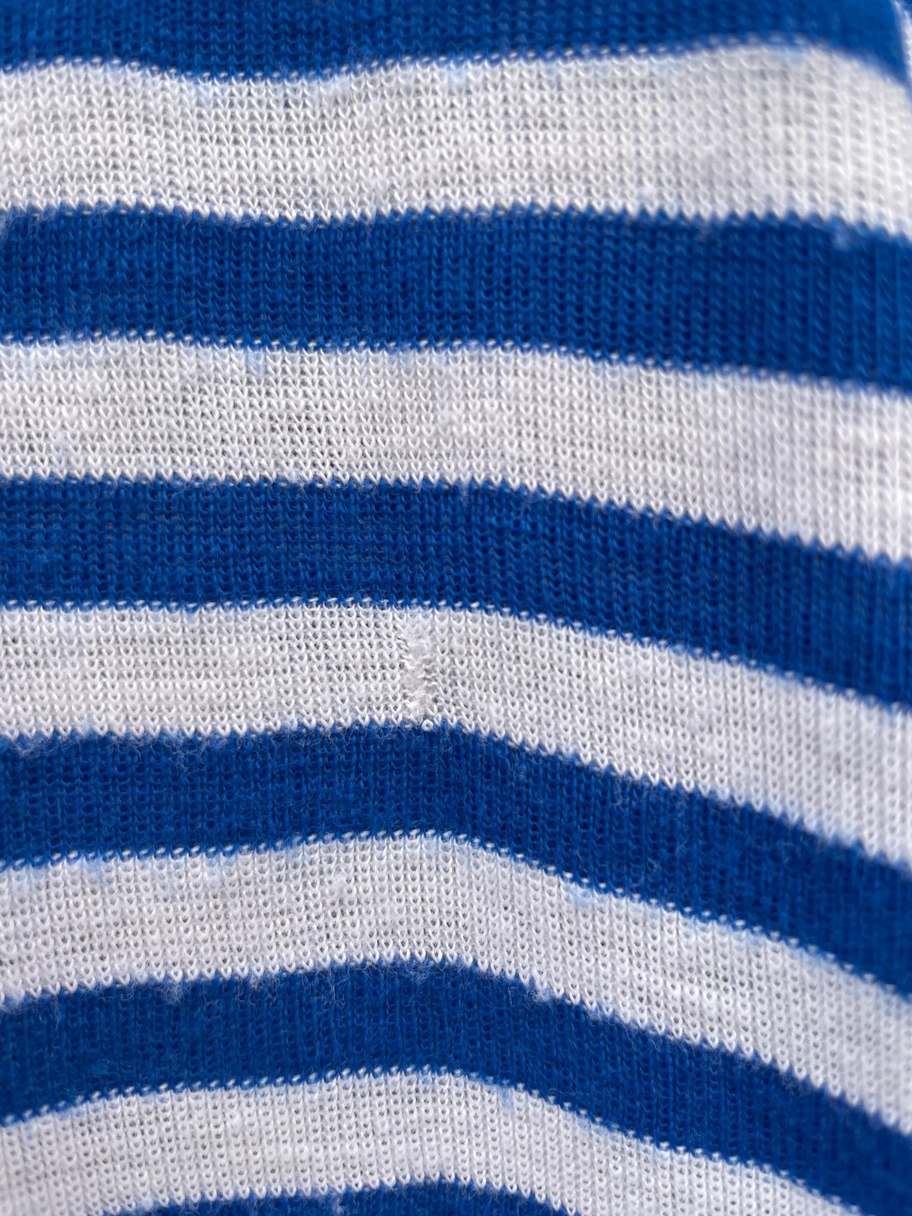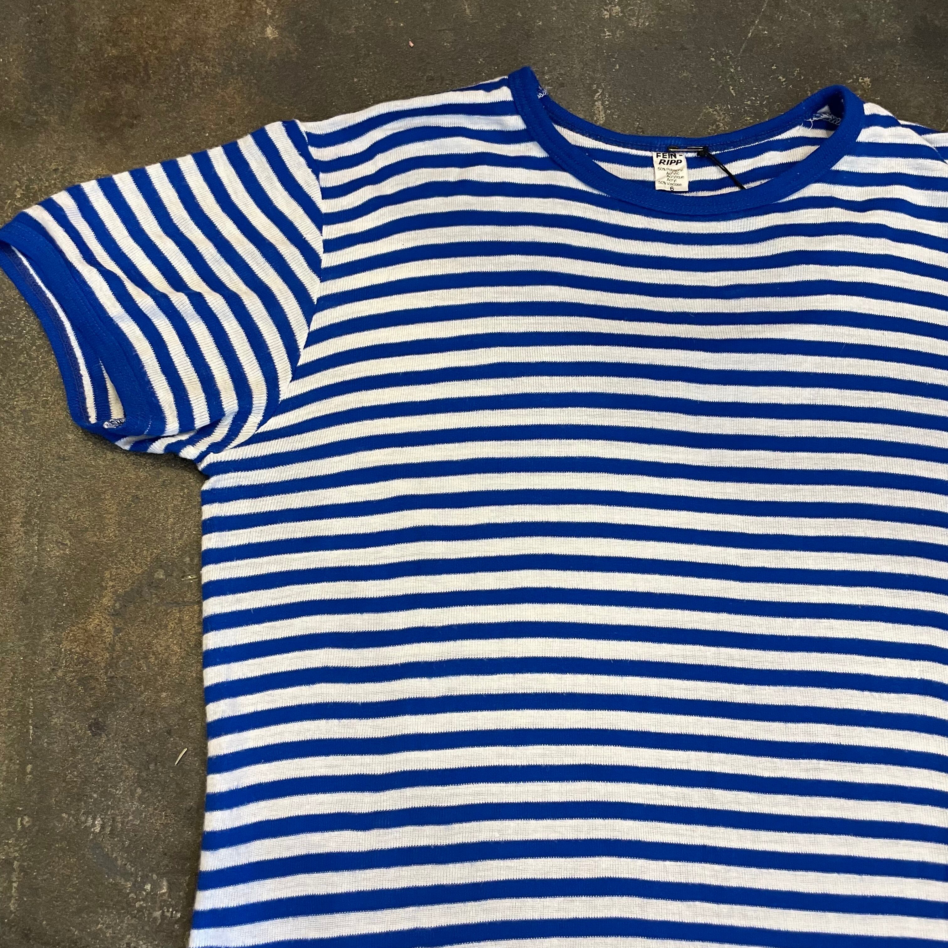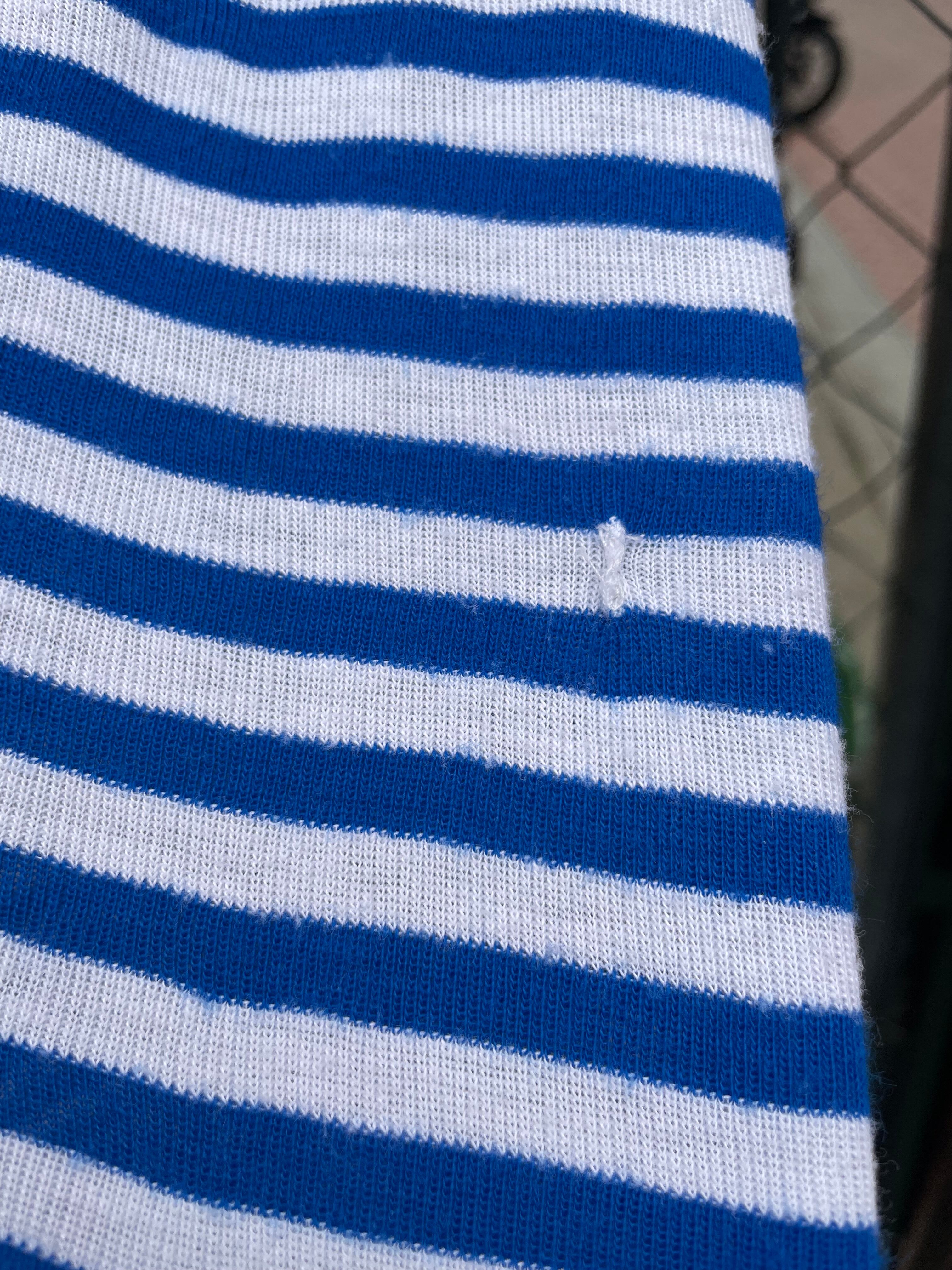 細かめの青×白のボーダーがとてもポップでかわいいですね。上にTシャツを重ねたりしてチラッと見せるだけでもコーディネートの雰囲気が変わってくれたり、夏はショートパンツを合わせて一枚でウエストバッグなどと合わせてもかわいいと思います!主役でも脇役でも使えておすすめです。