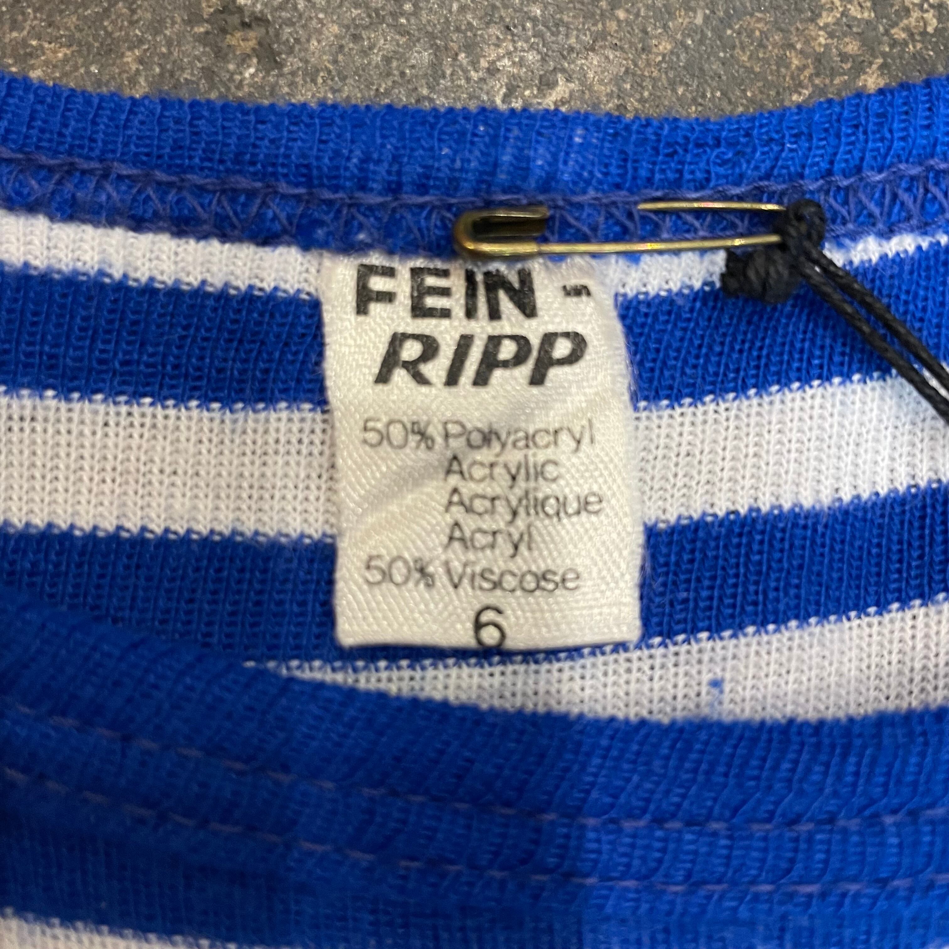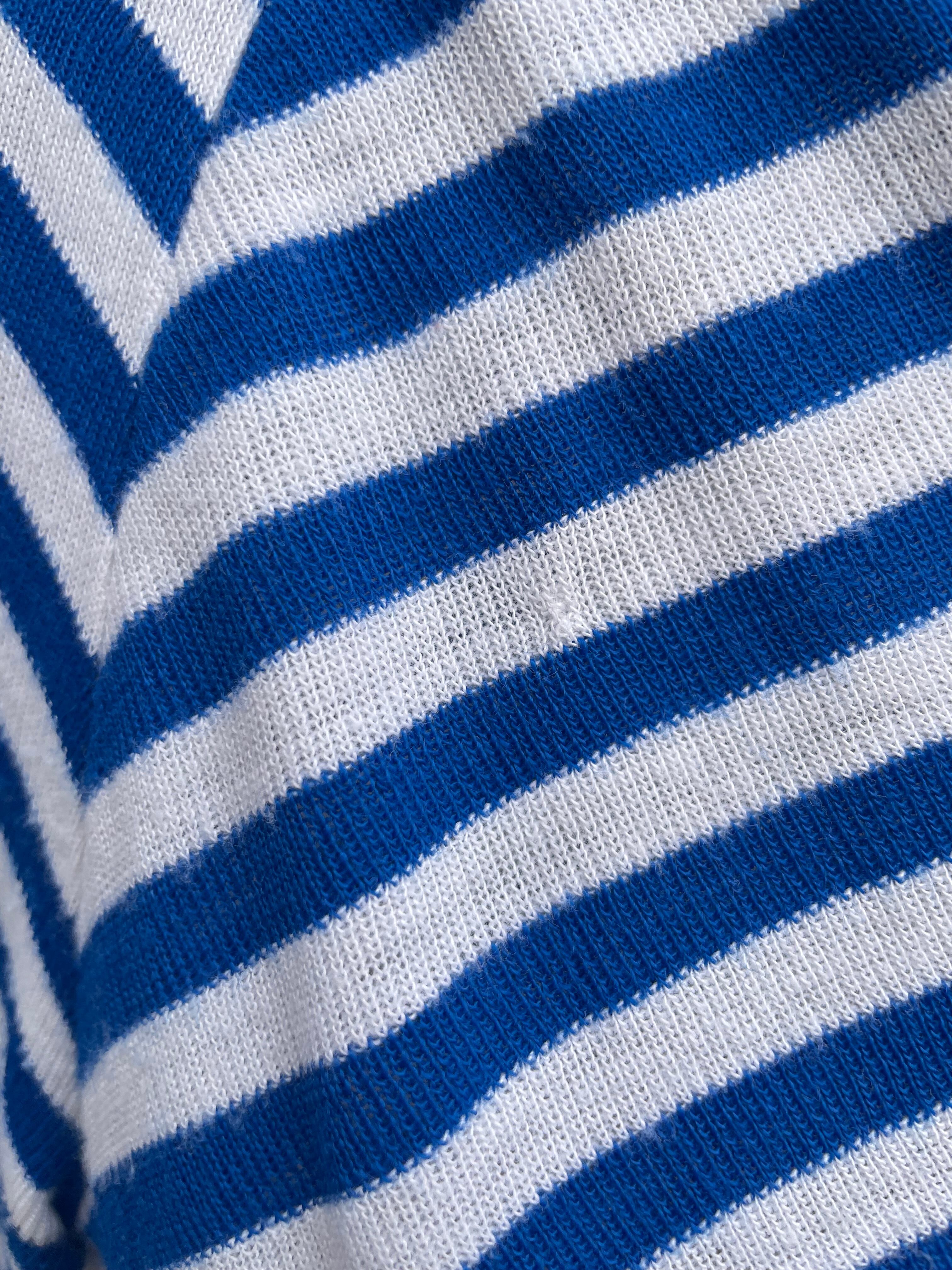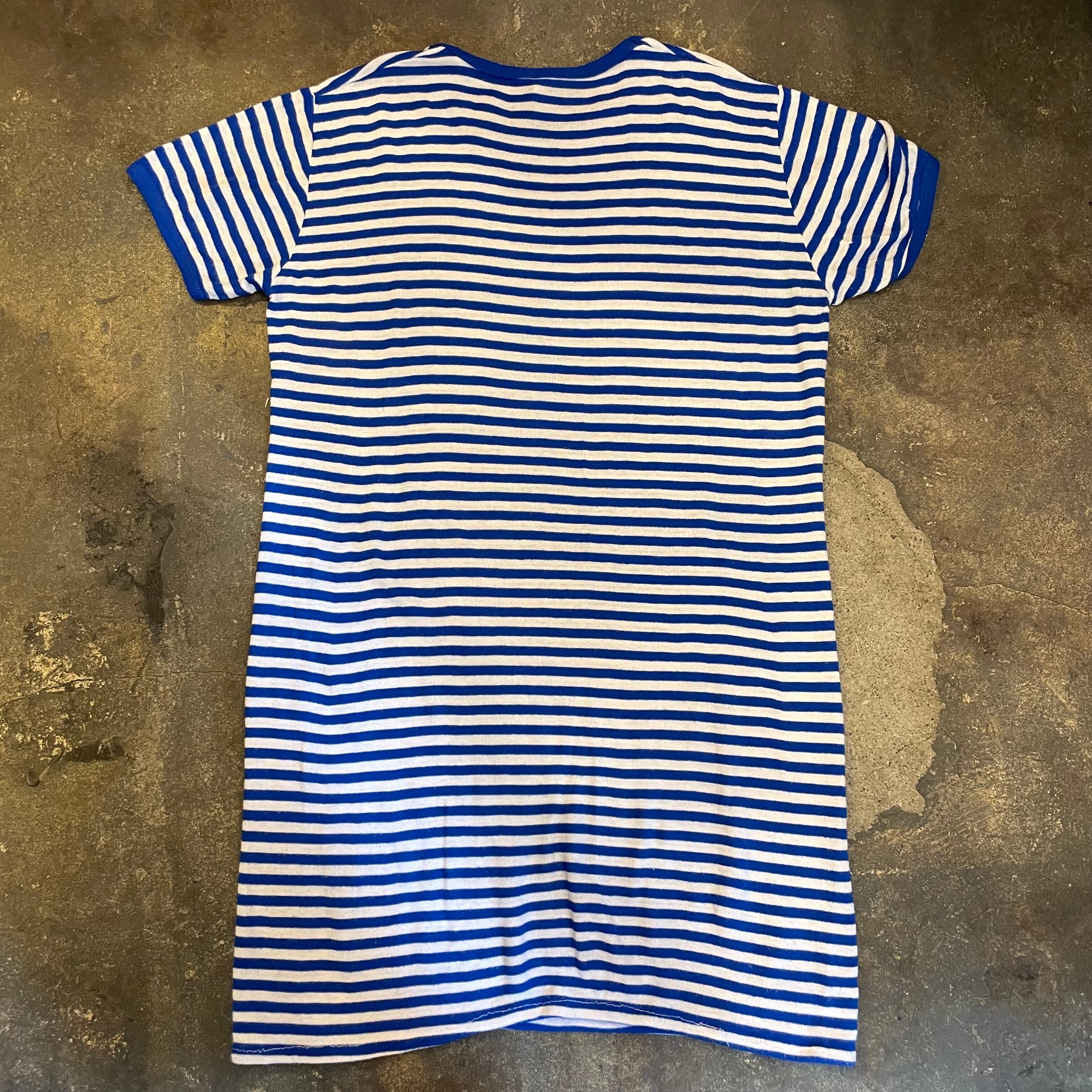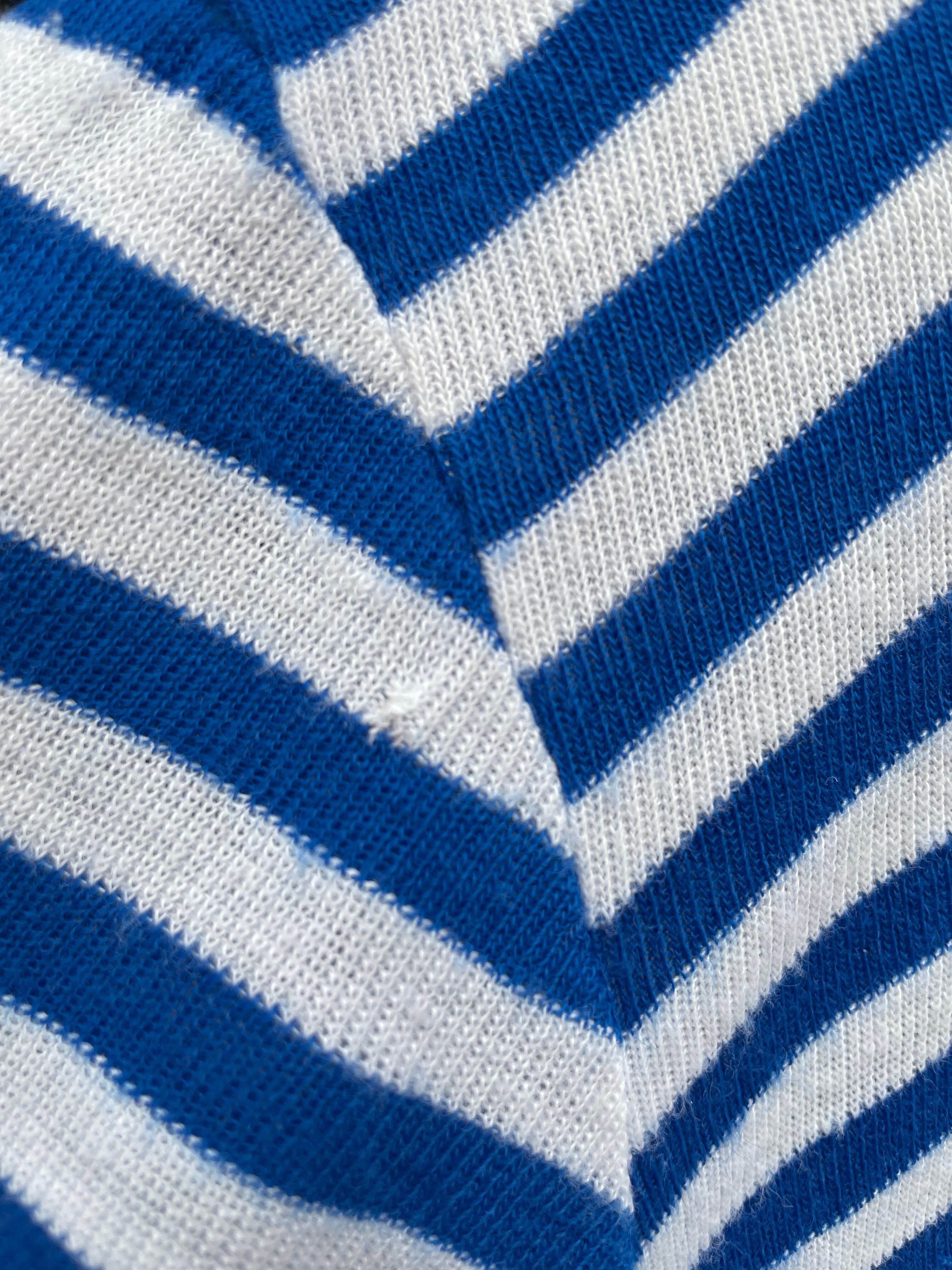 細かめの青×白のボーダーがとてもポップでかわいいですね。上にTシャツを重ねたりしてチラッと見せるだけでもコーディネートの雰囲気が変わってくれたり、夏はショートパンツを合わせて一枚でウエストバッグなどと合わせてもかわいいと思います!主役でも脇役でも使えておすすめです。