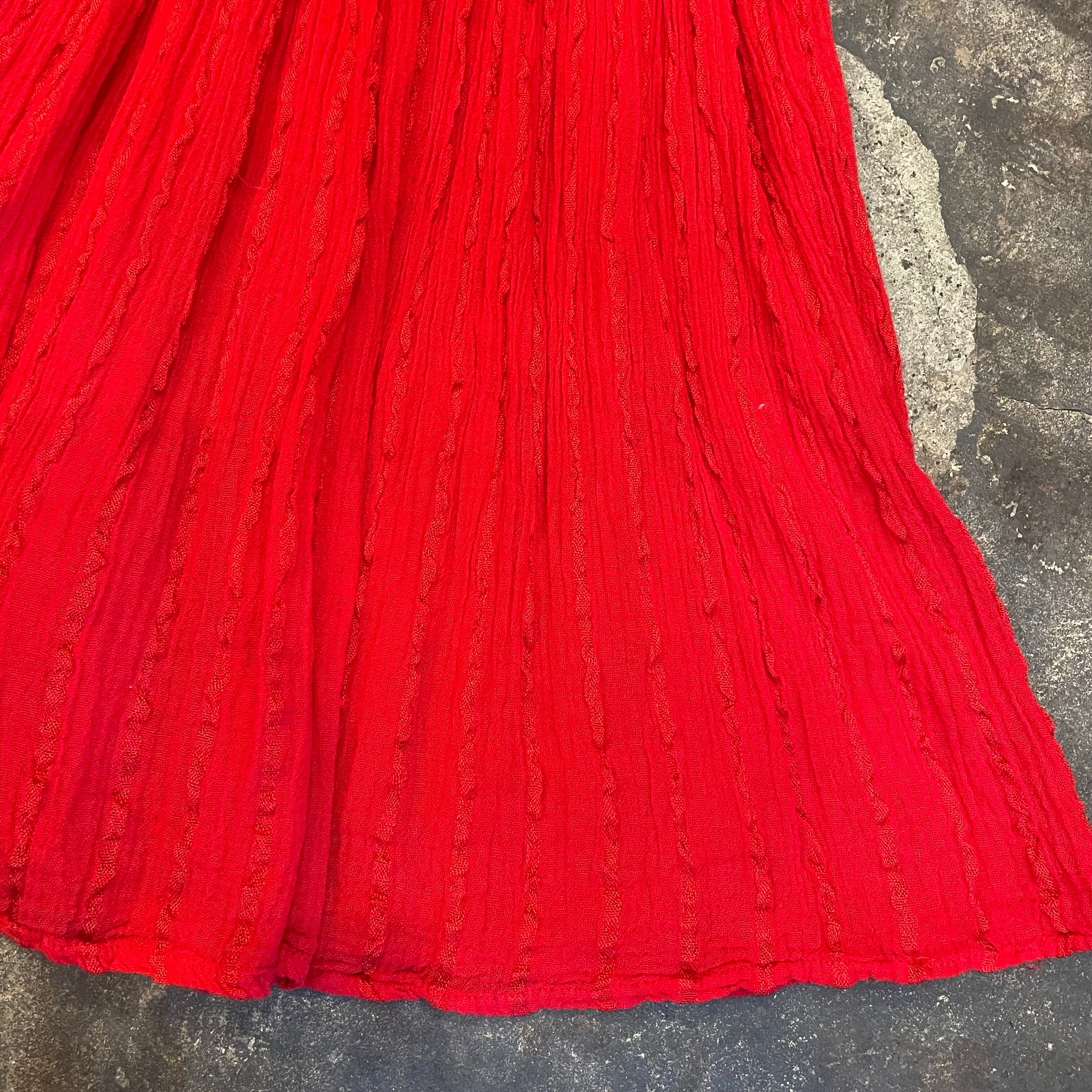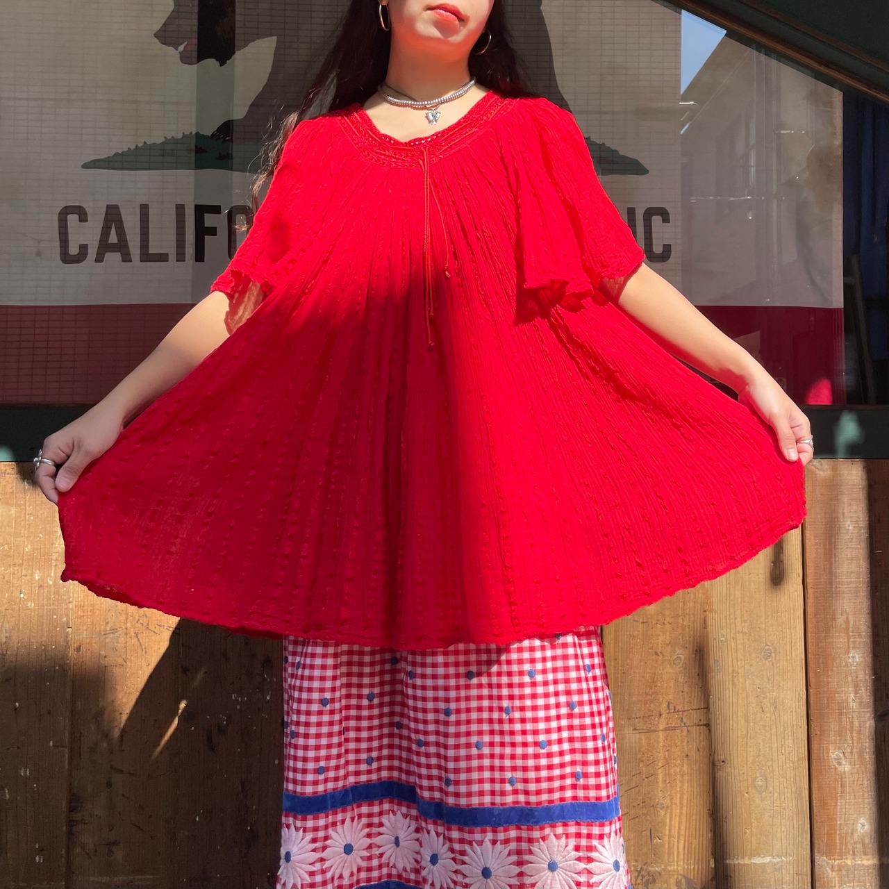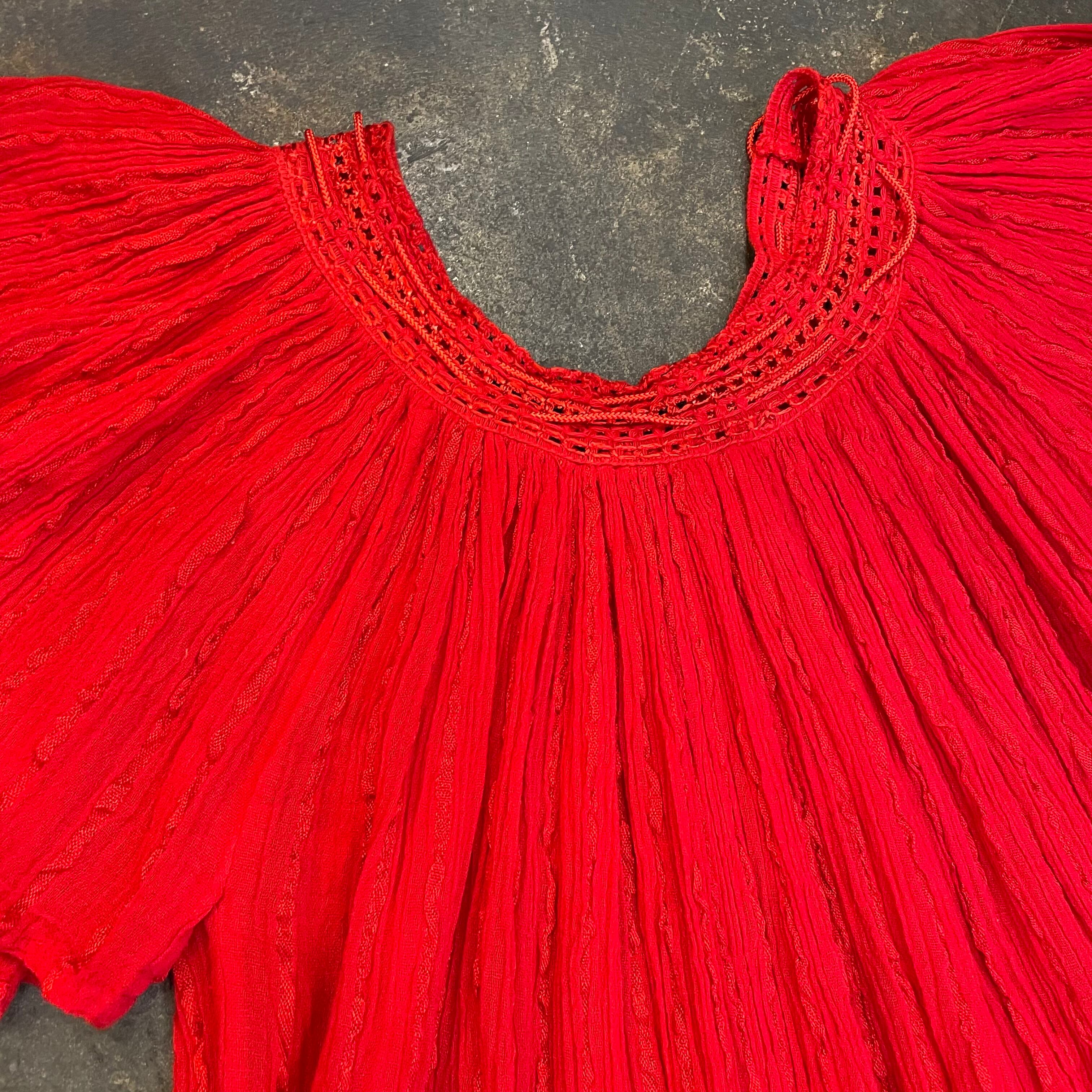 コットンレーヨンの軽やかでさらっとした生地感が素敵なチュニックです。潔く真っ赤なところもかわいいポイントですね。