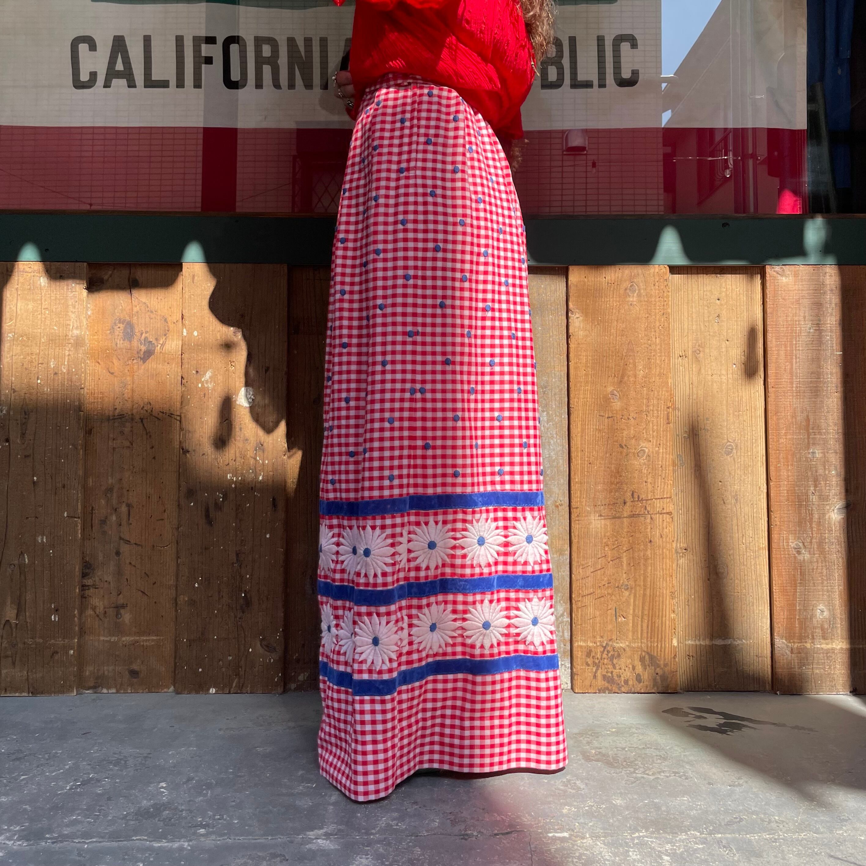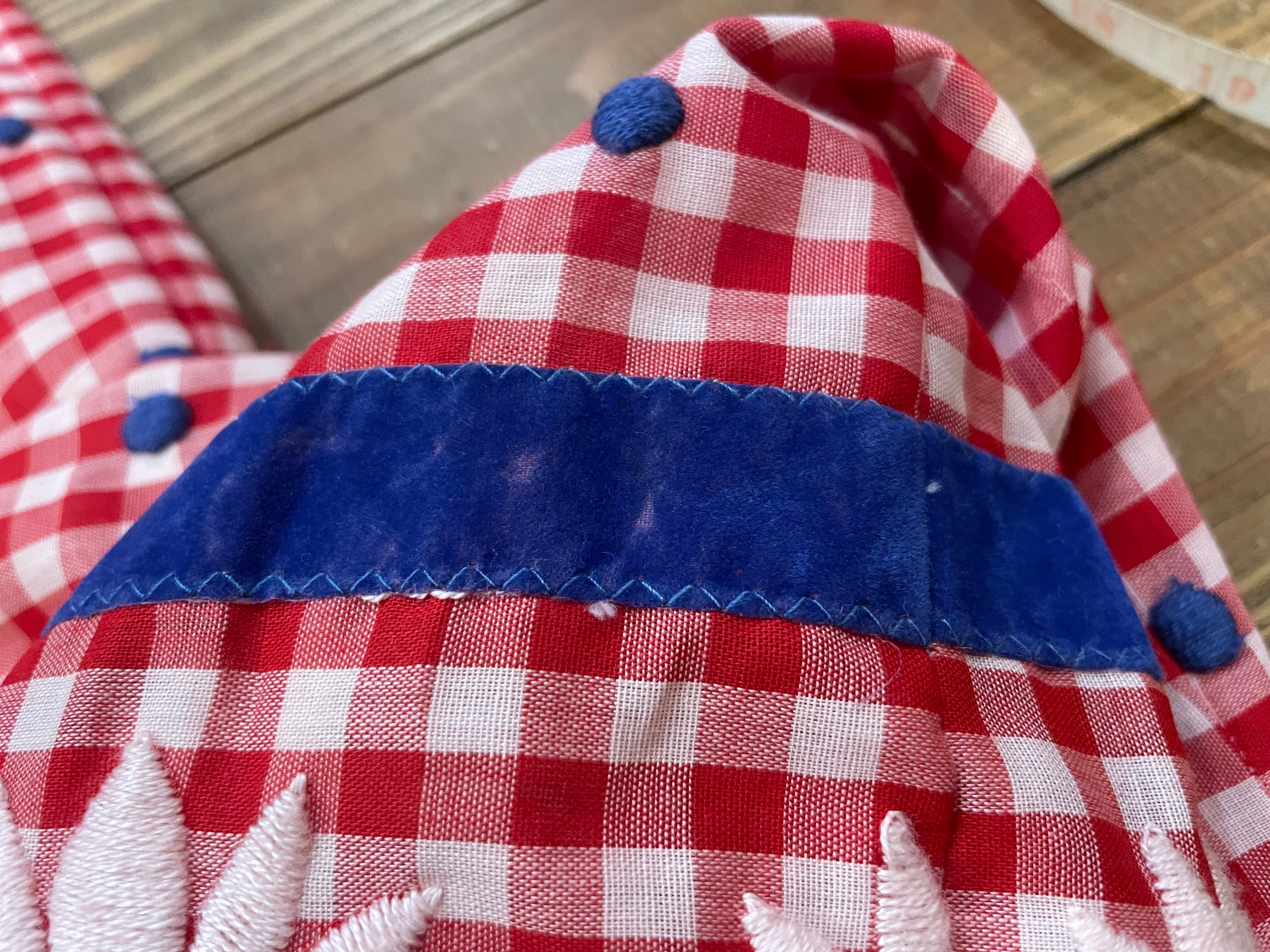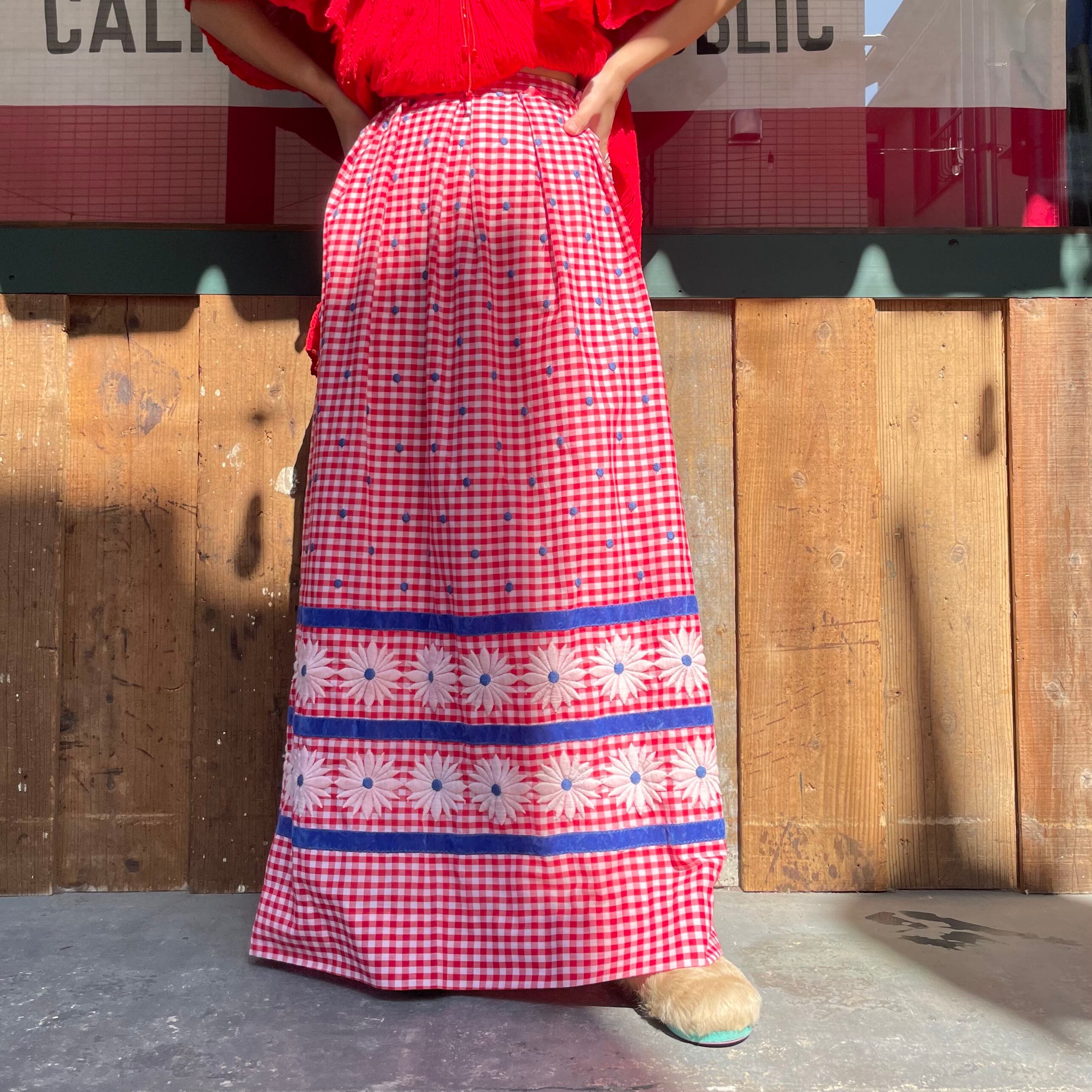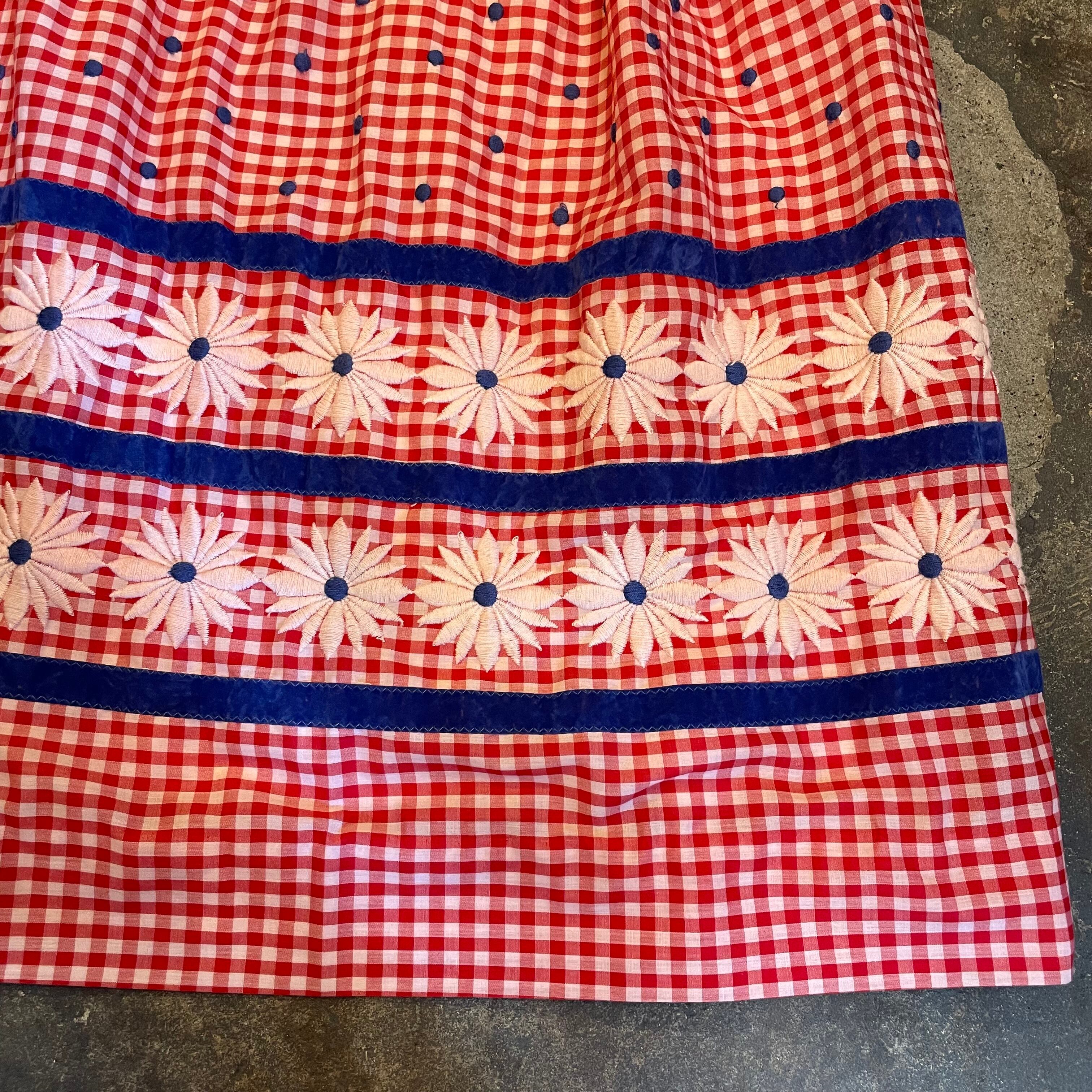 春らしい赤白ギンガムチェックに青のドットの刺繍と白いお花の刺繍、さらには青いベロアテープが付けてあり、色味やバランスがとてもかわいいスカートです。