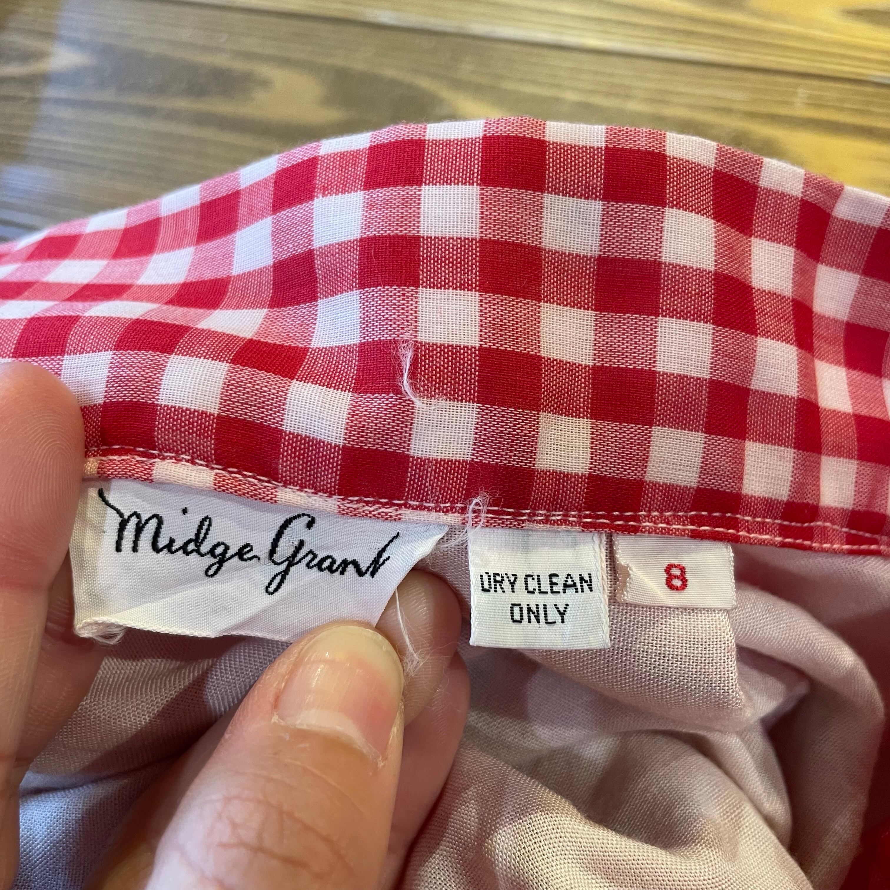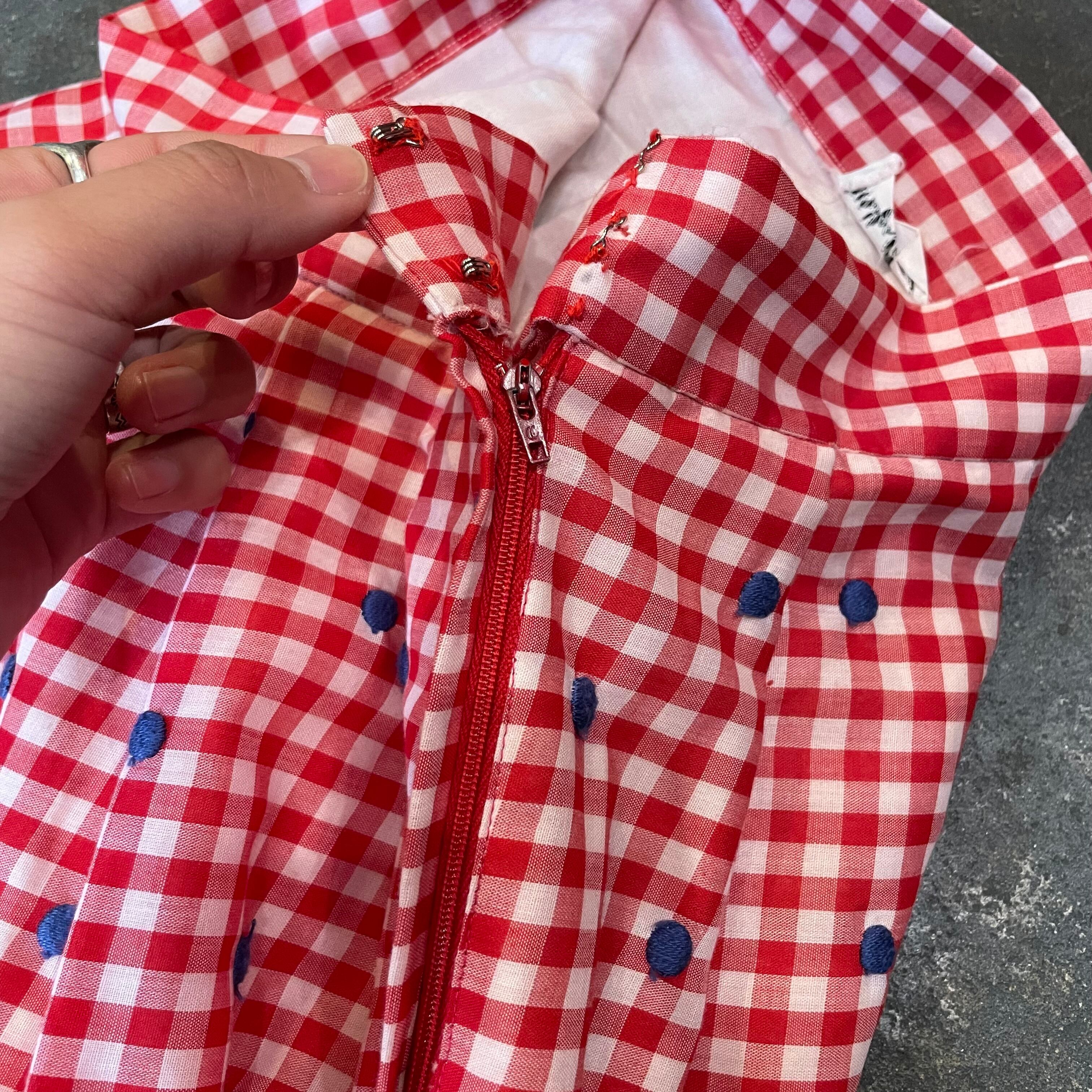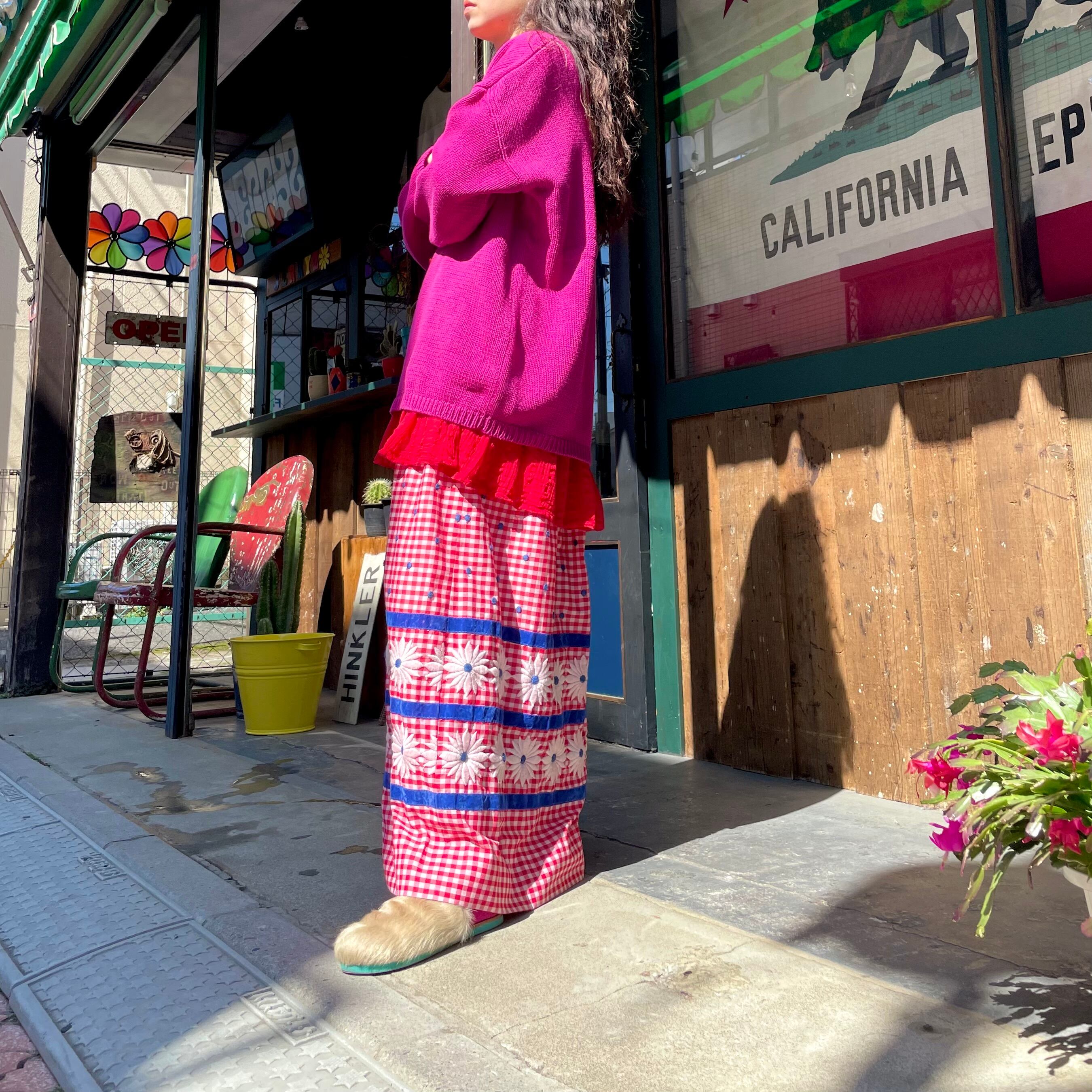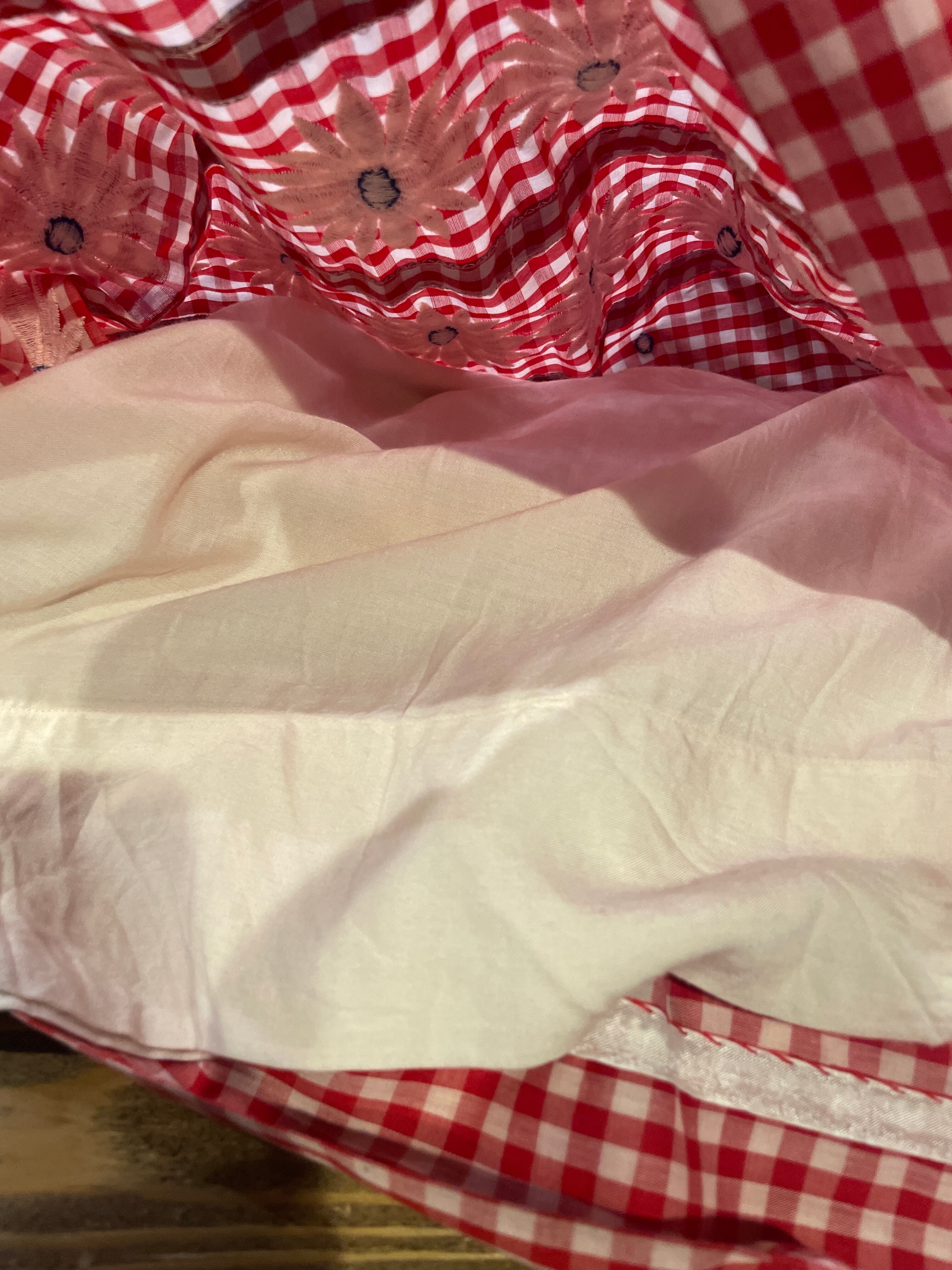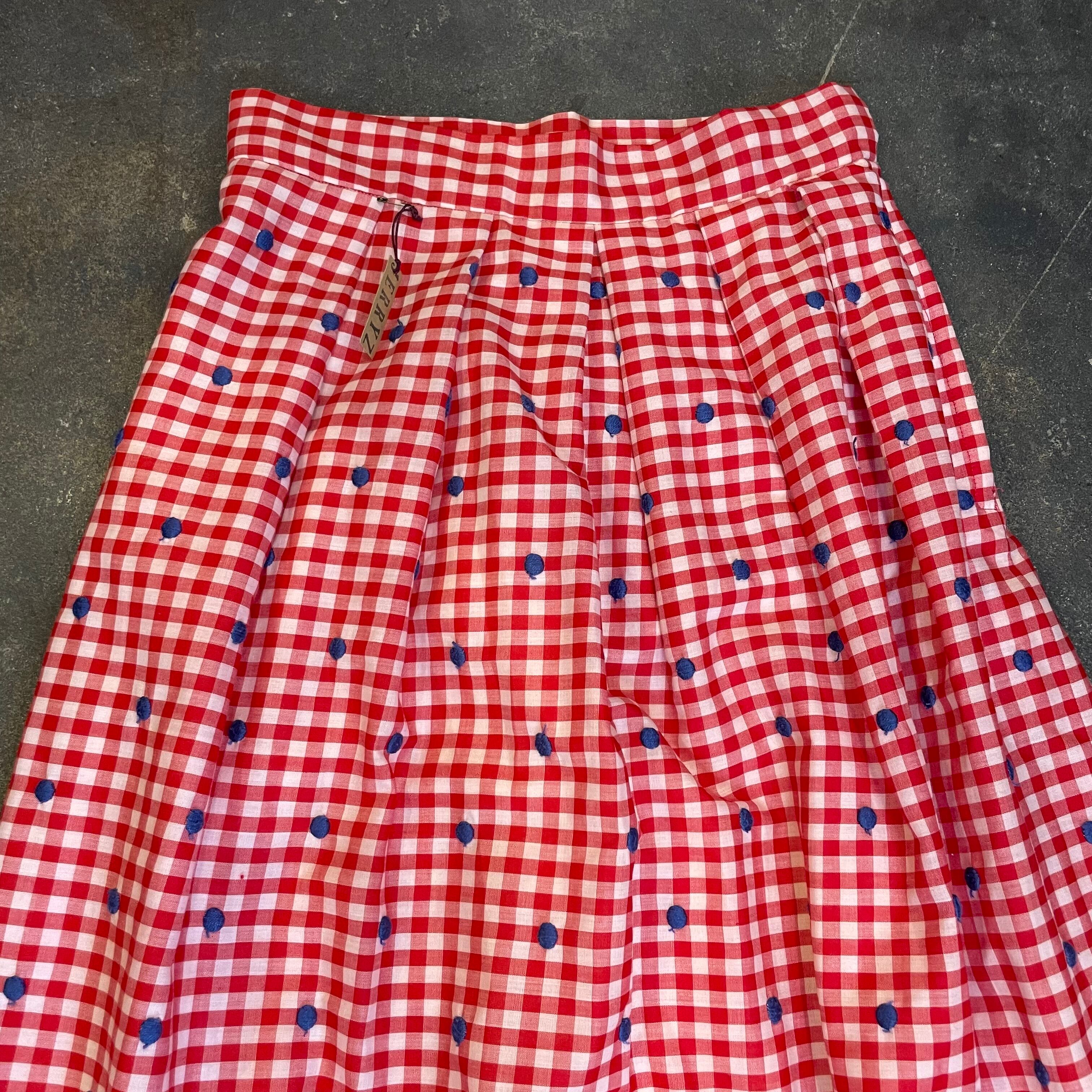 春らしい赤白ギンガムチェックに青のドットの刺繍と白いお花の刺繍、さらには青いベロアテープが付けてあり、色味やバランスがとてもかわいいスカートです。