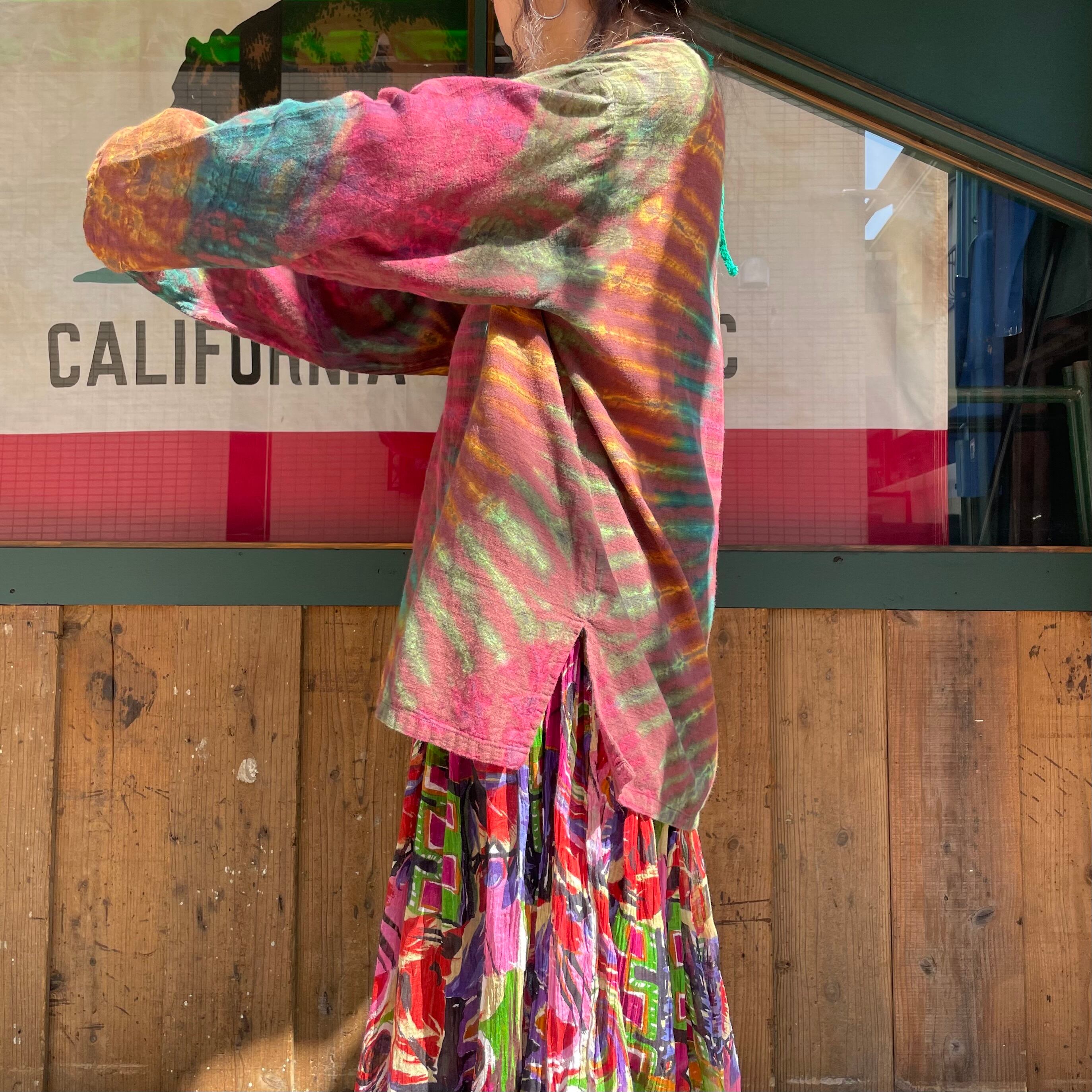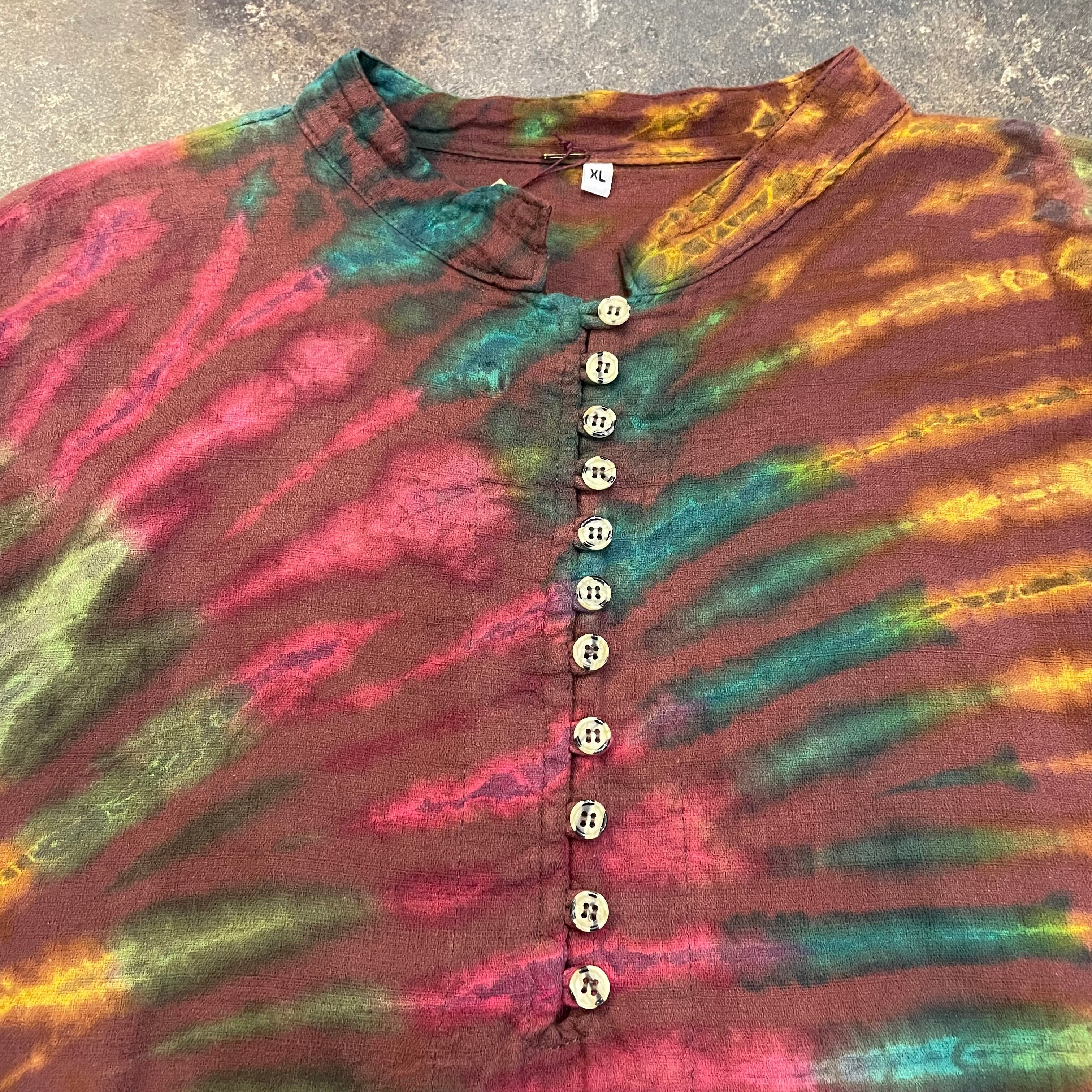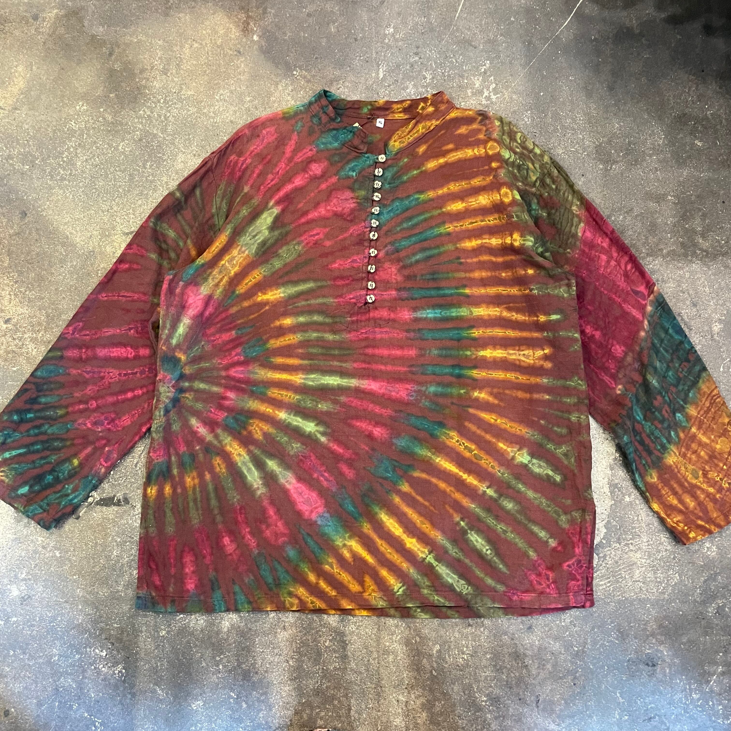 茶色ベースのタイダイがボヘミアンな雰囲気たっぷりでかわいいヘンリーネックタイプのプルオーバーシャツです。