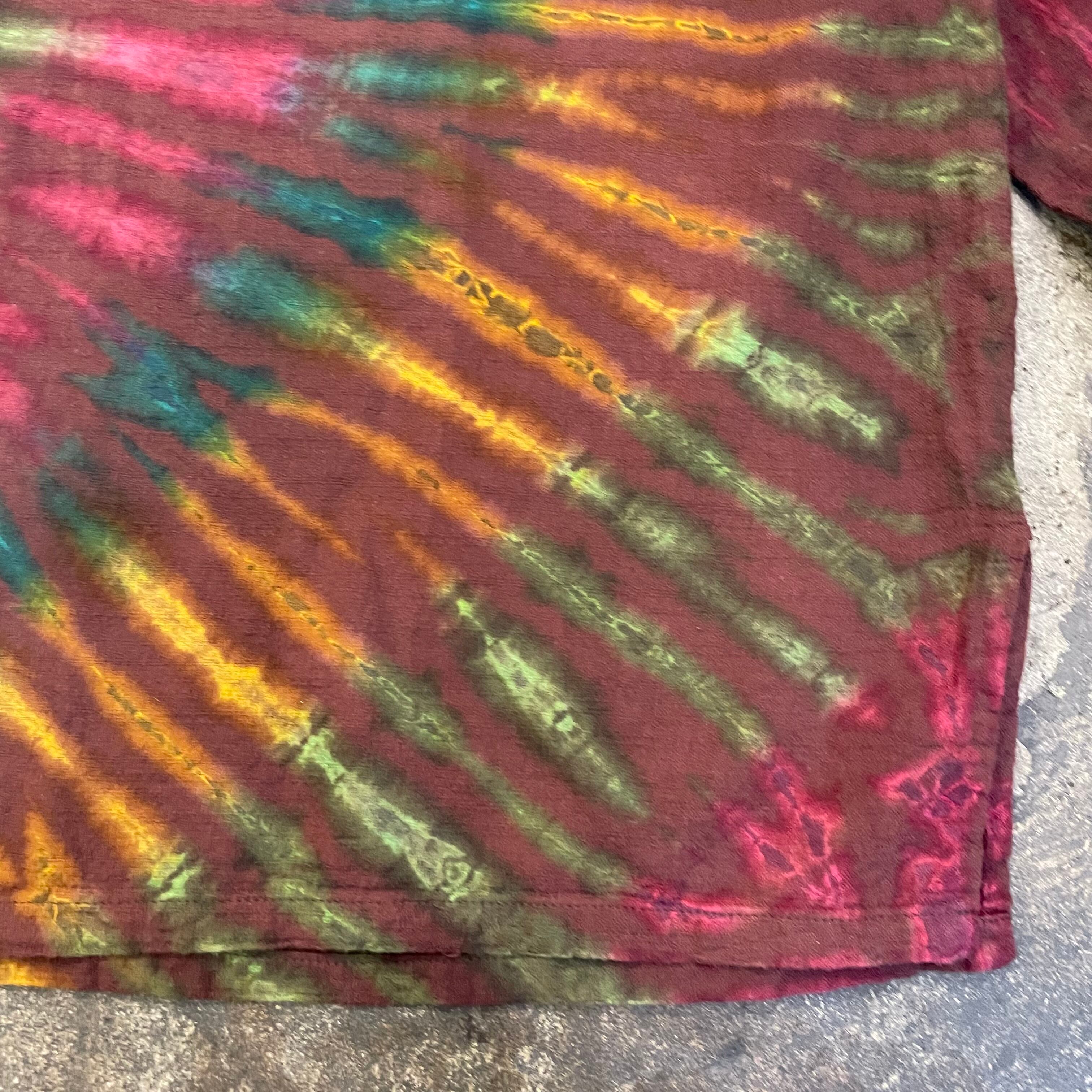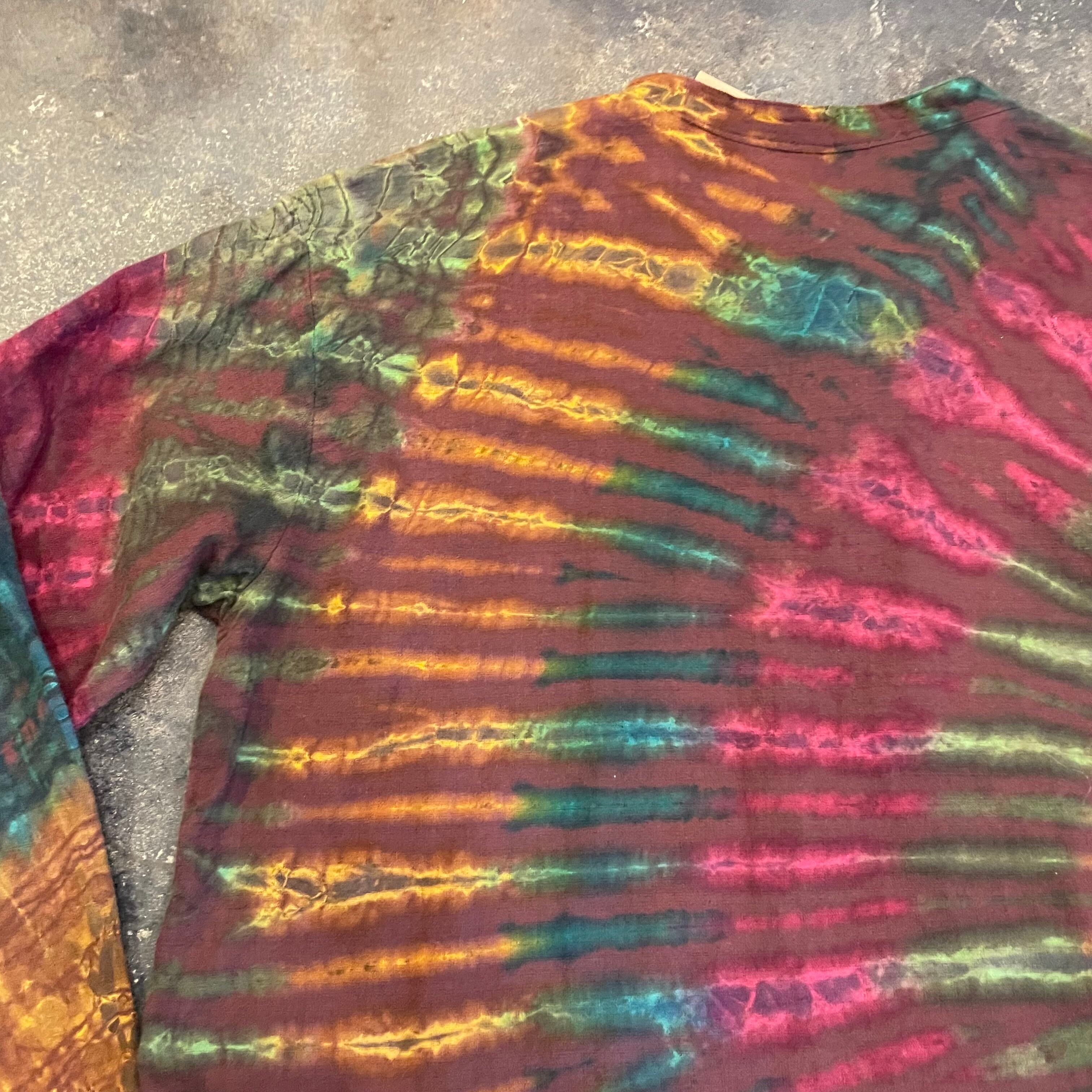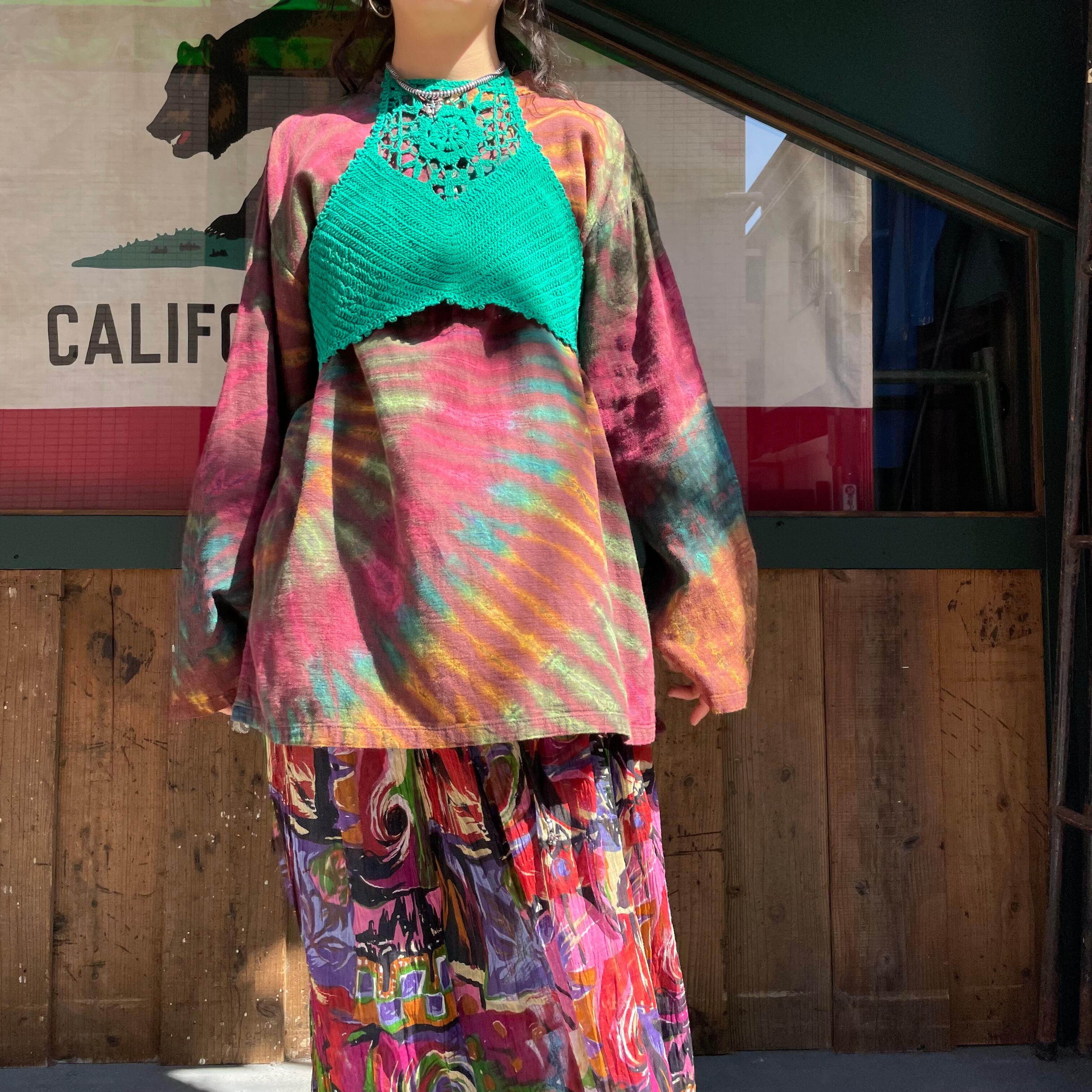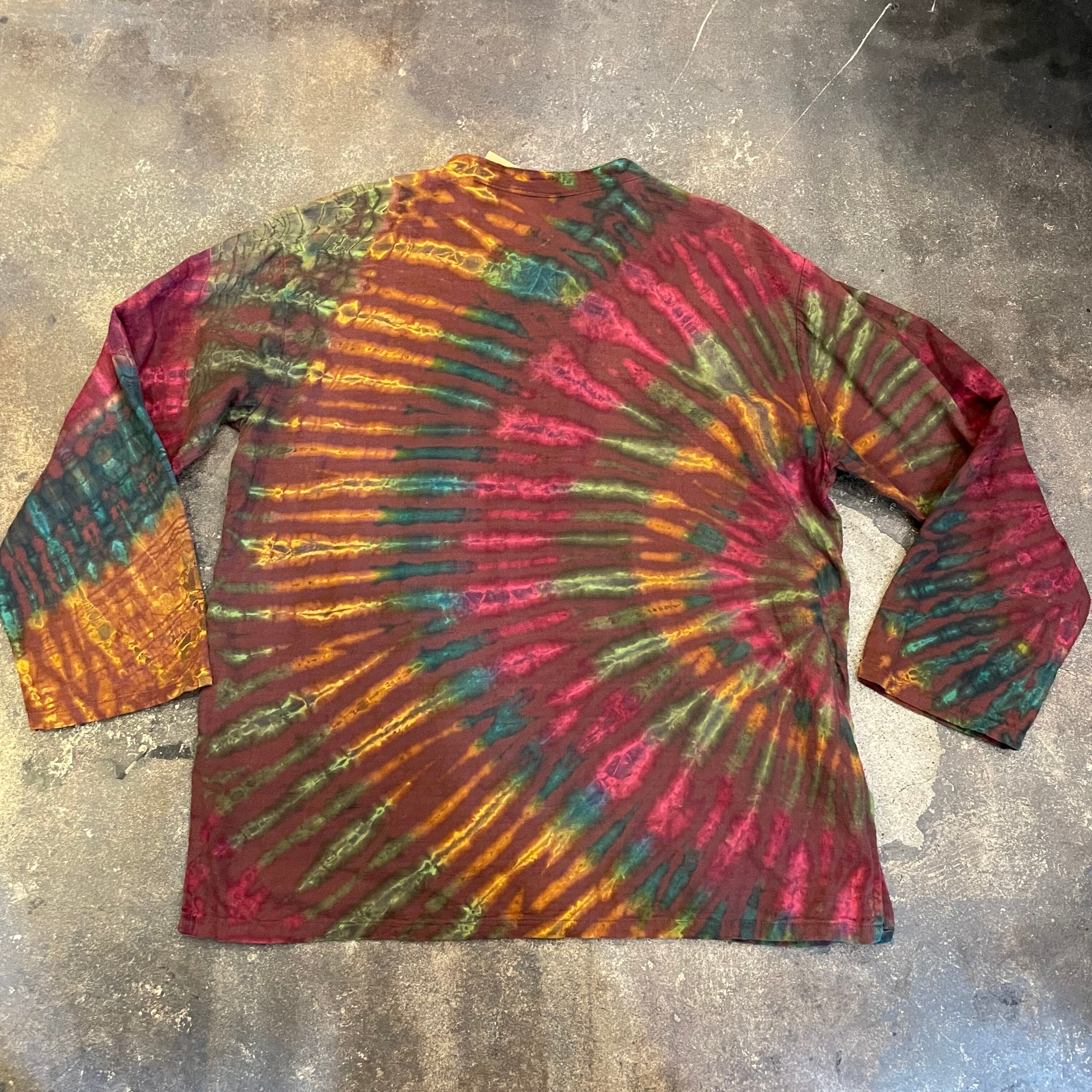 茶色ベースのタイダイがボヘミアンな雰囲気たっぷりでかわいいヘンリーネックタイプのプルオーバーシャツです。