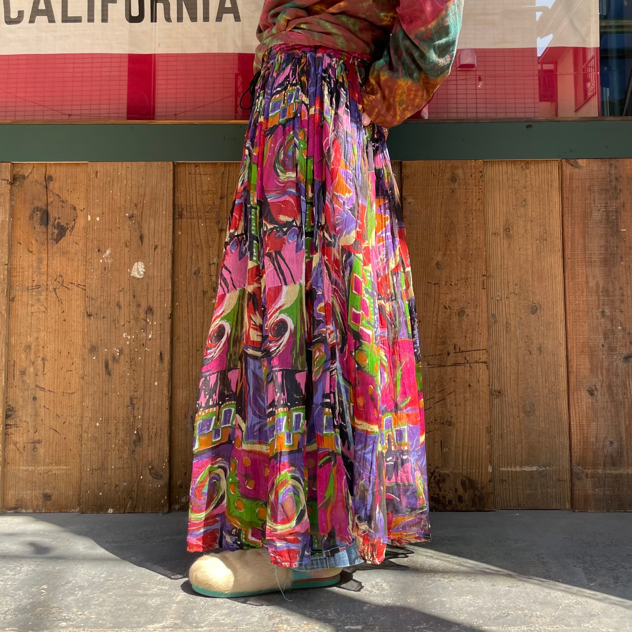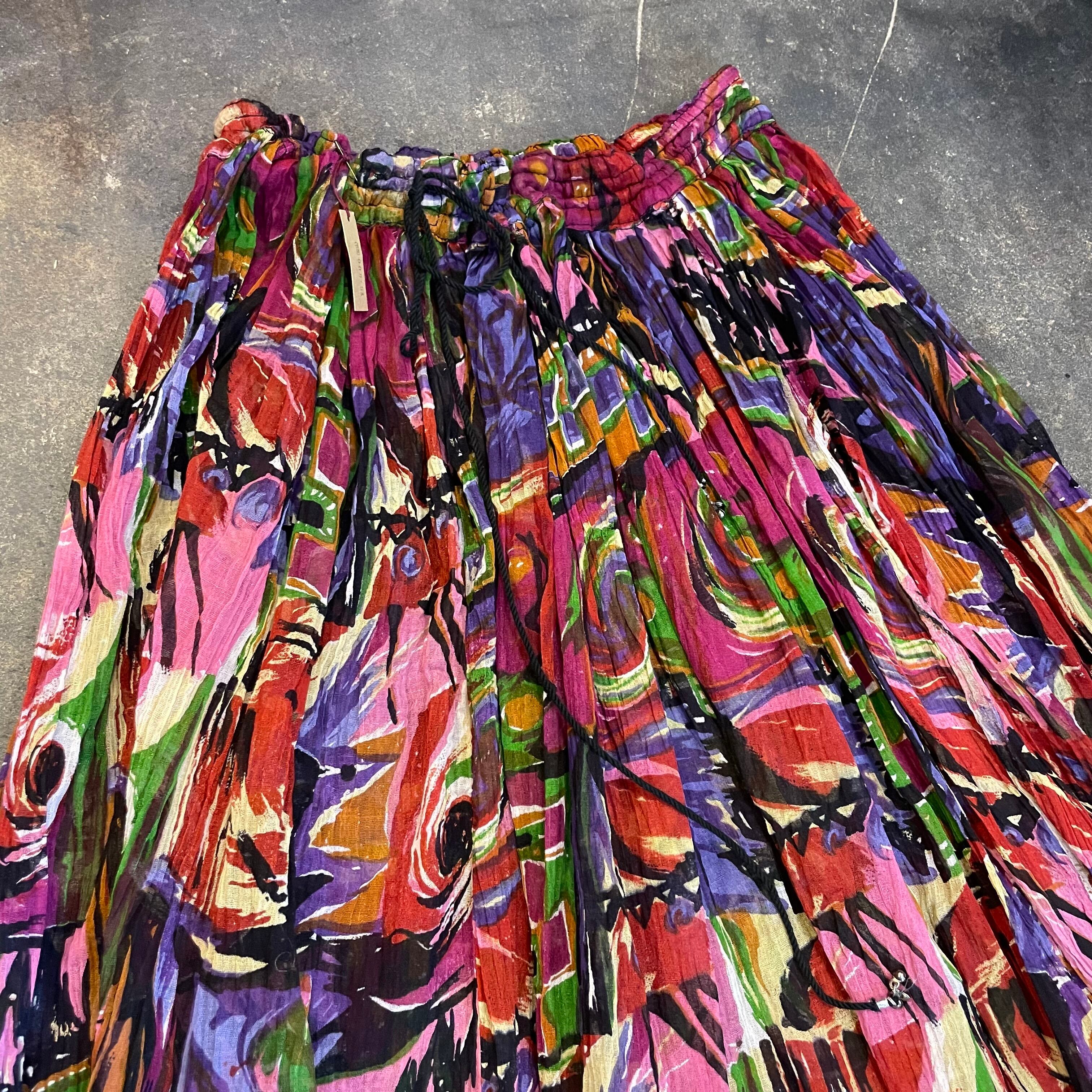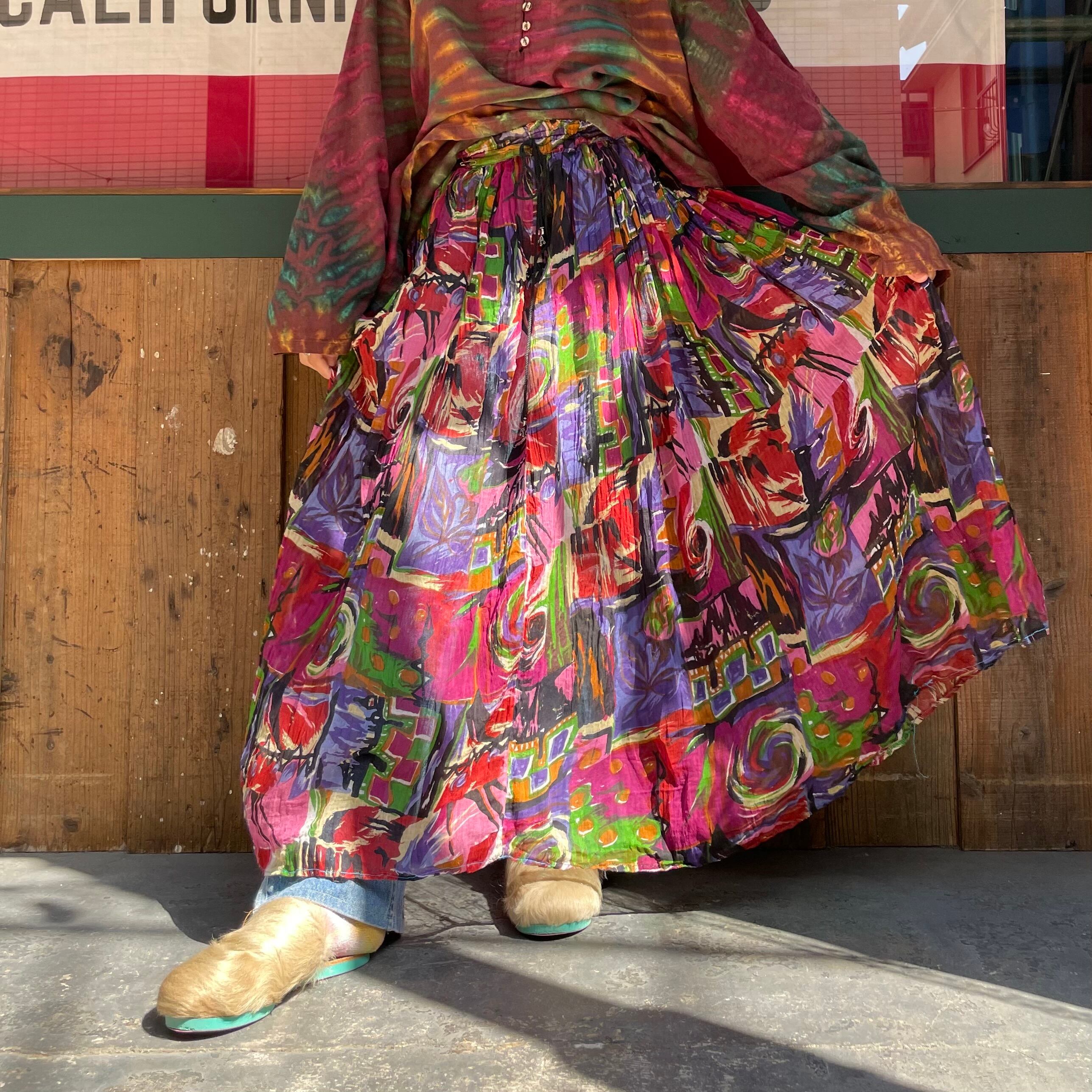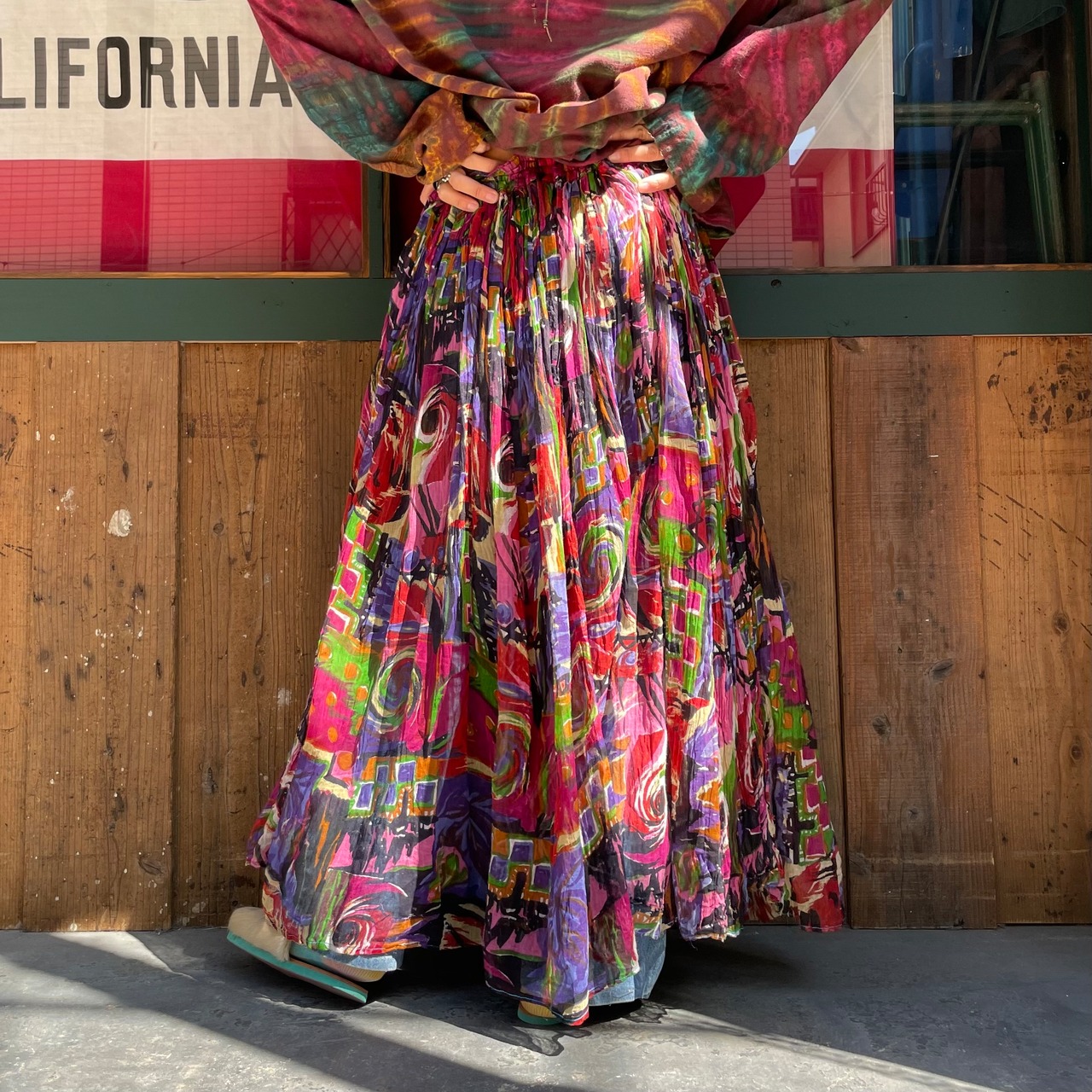 かなり薄手でシースルーな生地感が軽やかで春夏にぴったりな一枚です。いろんな色が使われていますが、全体的になんだか大人っぽい印象で、トップスをシンプルに黒いTシャツなどで合わせれば着やすいかと思います。夏はキャミソールにジャラジャラアクセサリーをつけてエスニックなコーディネートも良さそうですね!